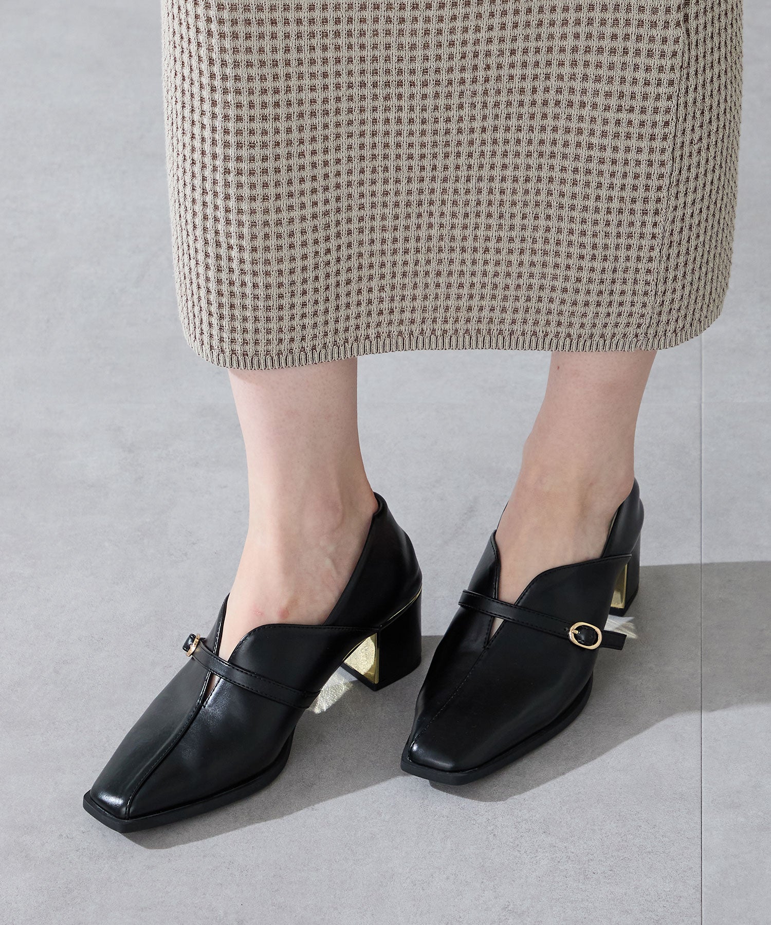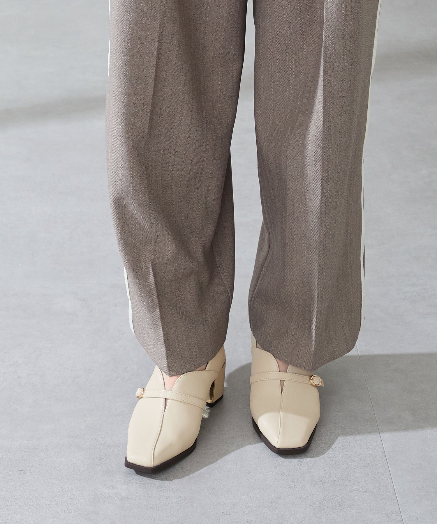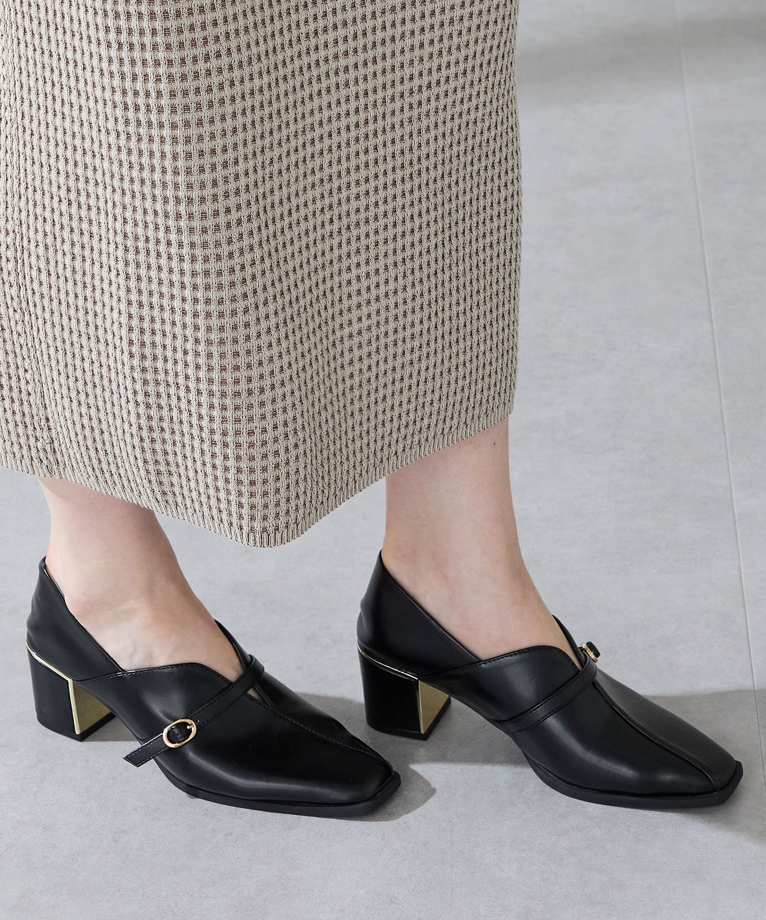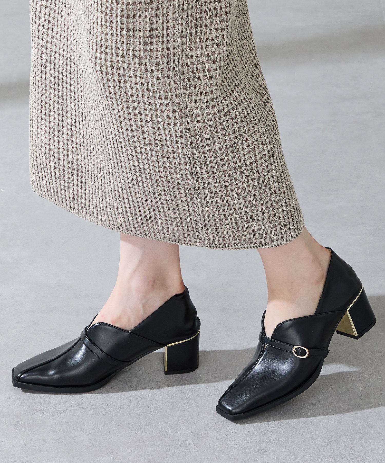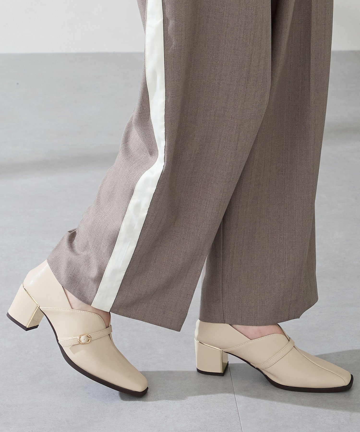 シャープなスクエアトゥと甲のカットラインが足元に抜け感を出し、ソールに付けたコバデザインでモードな雰囲気を纏った1足。太めのヒールで安定感もありつつ、ゴールドのメタリックラインがワンポイントになり、高級感を演出。脱ぎ履きが簡単な踵を踏んでも履けるバブーシュタイプで、2wayで使える優れもの。細めの甲ベルトが足元を引き締め、スタイルアップも◎。