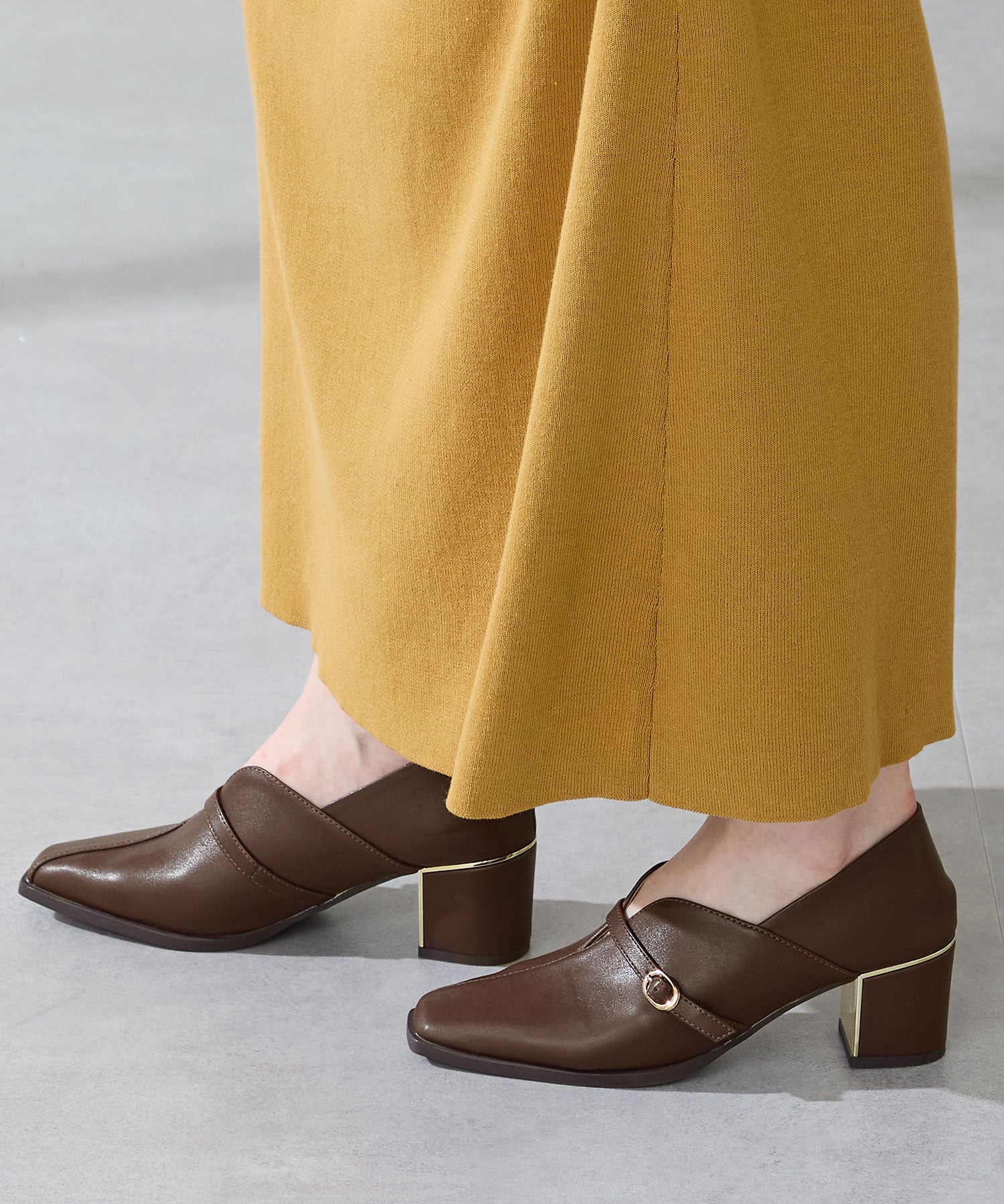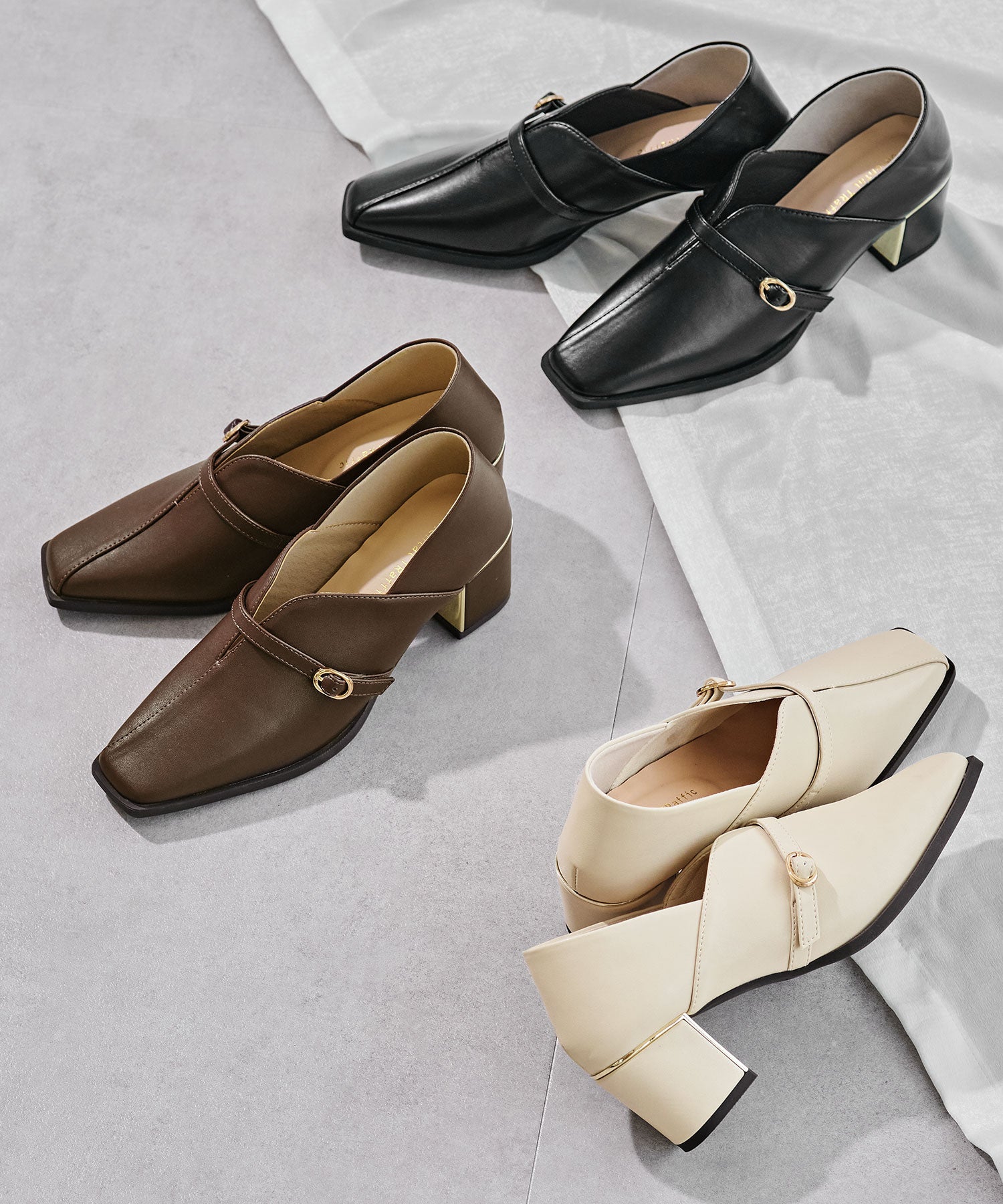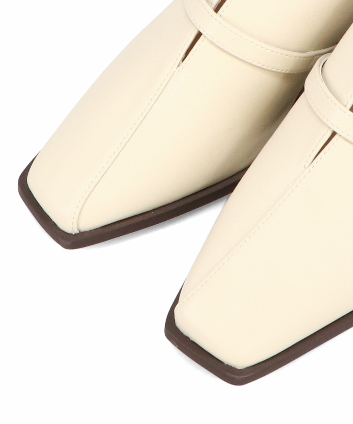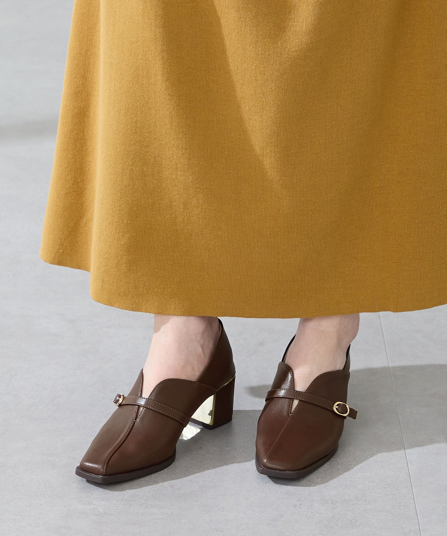 シャープなスクエアトゥと甲のカットラインが足元に抜け感を出し、ソールに付けたコバデザインでモードな雰囲気を纏った1足。太めのヒールで安定感もありつつ、ゴールドのメタリックラインがワンポイントになり、高級感を演出。脱ぎ履きが簡単な踵を踏んでも履けるバブーシュタイプで、2wayで使える優れもの。細めの甲ベルトが足元を引き締め、スタイルアップも◎。
