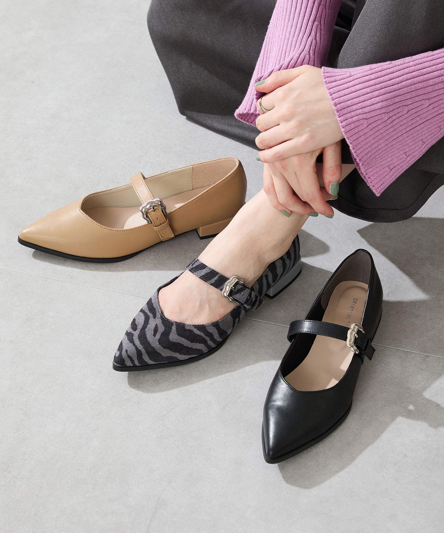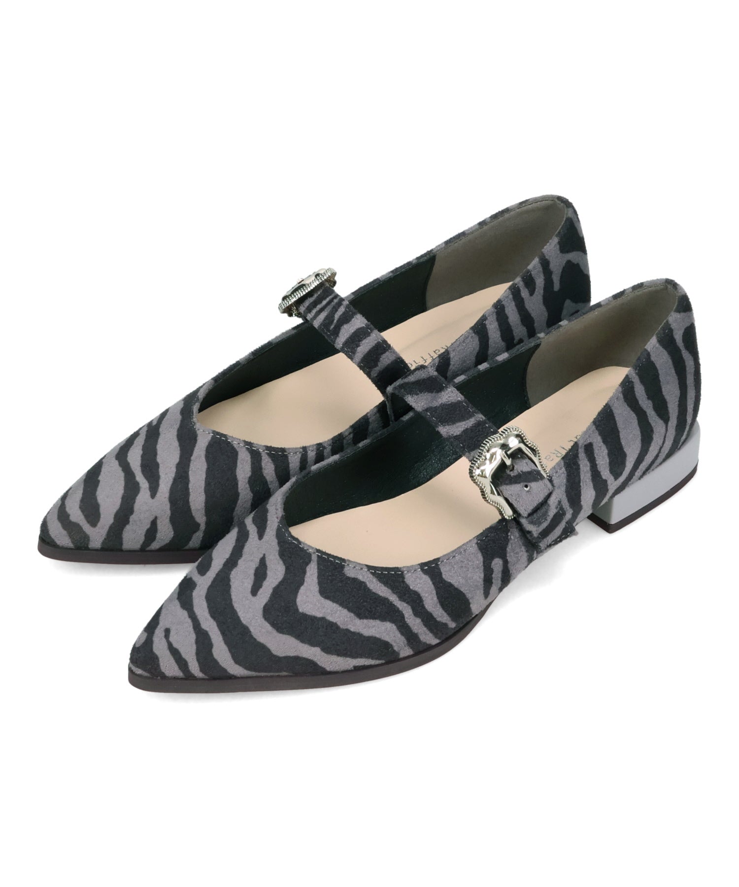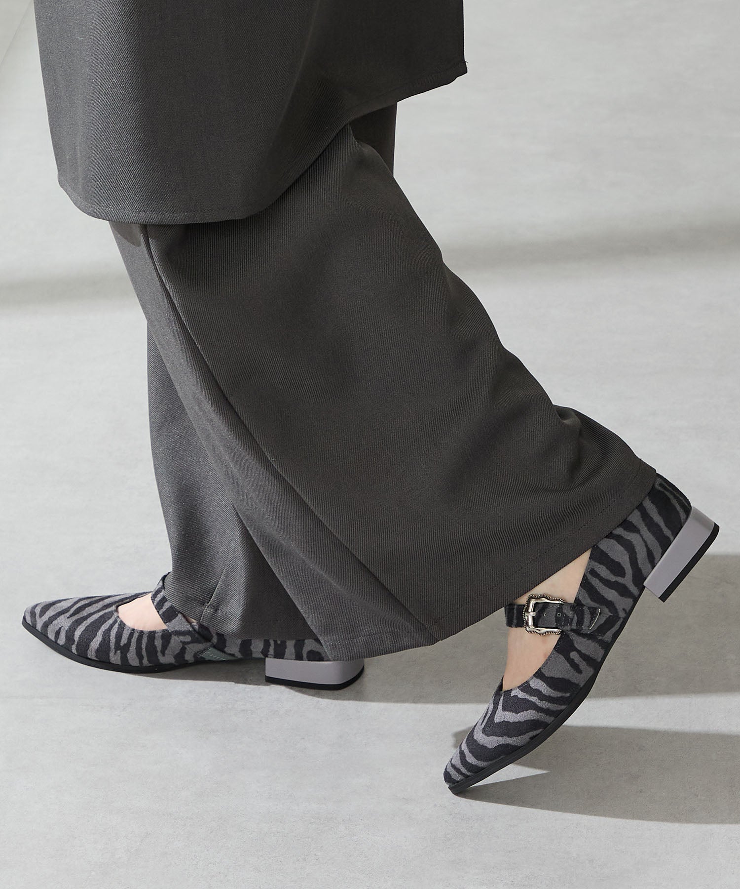 スパイスのあるメタルバックルが他にはないメリージェーンパンプス。ベルト内側はゴム仕様なのでベルトを外さずそのまま履けて足入れも楽ちん。オーバーヒールやブラックソールなど細かなディテールにこだわり、モードな雰囲気に。ポインテッドトゥに履き口はVカットにすることで、女性らしいすっきり見えも叶えてくれる。秋冬のコーデに馴染むグレーは、注目のゼブラ柄を施した唯一無二の1足。