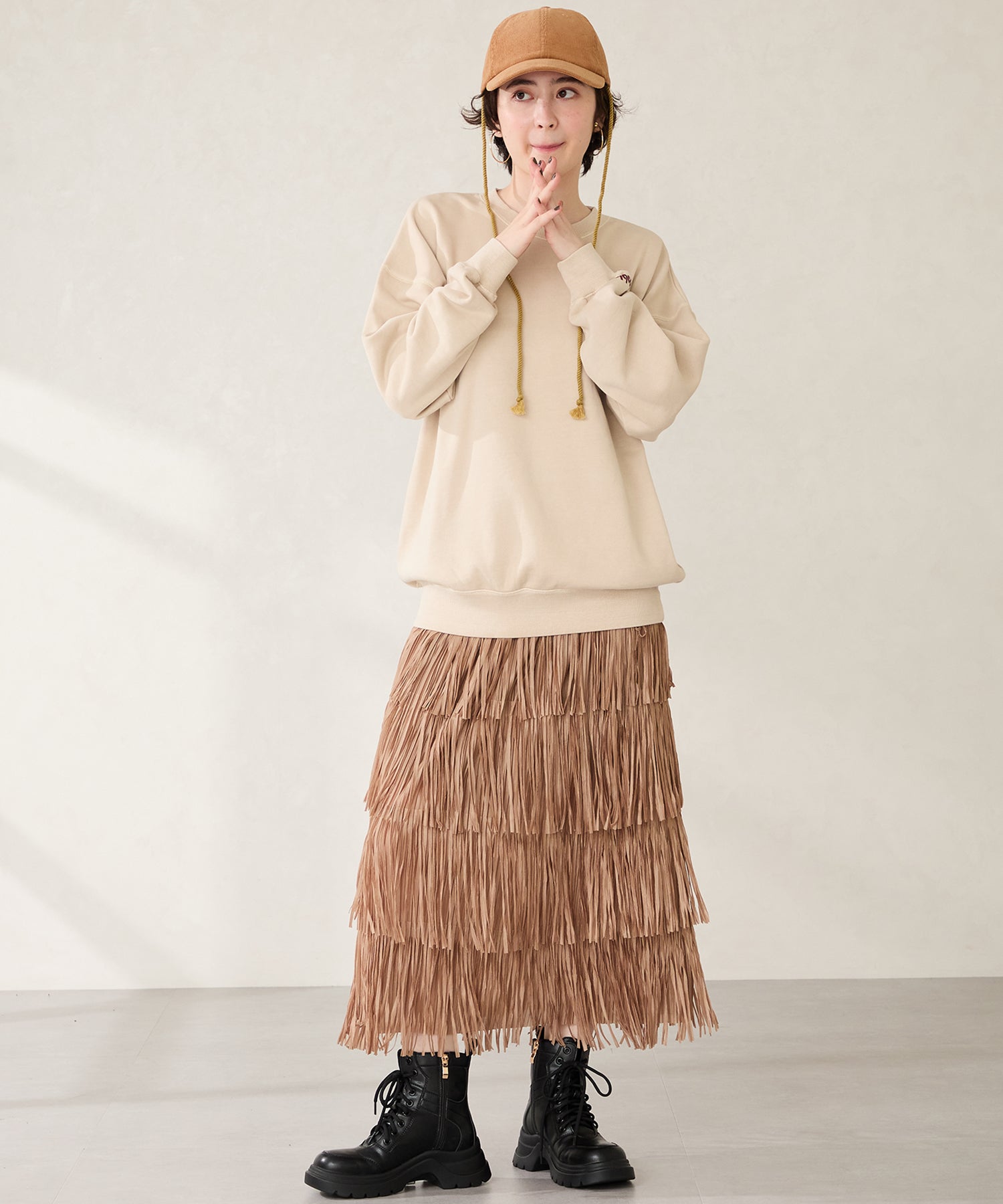 凹凸のある特徴的なソールでエッジを効かせたレースアップブーツは、太さのある丸紐でとことん存在感たっぷりに仕上げた1足。ミニ丈ともバランスが取りやすいハイカットにタイトめな筒まわりでスタイルアップ効果も抜群。内側ファスナーには金具を付けることでさりげないアクセントに。いつものコーディネートに加えるだけで都会的な印象にワンランクアップ。
