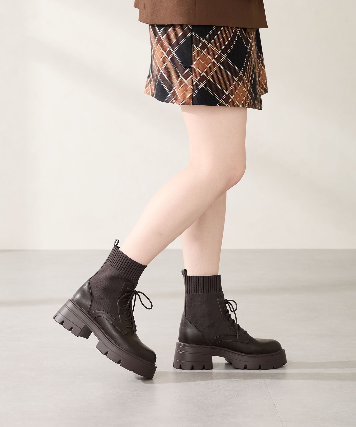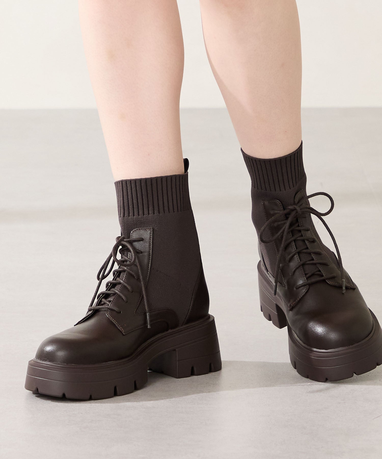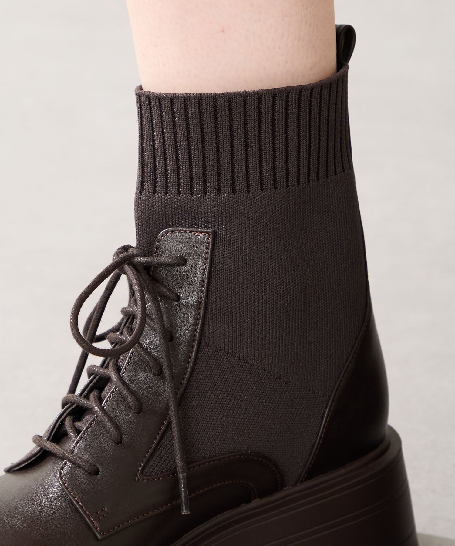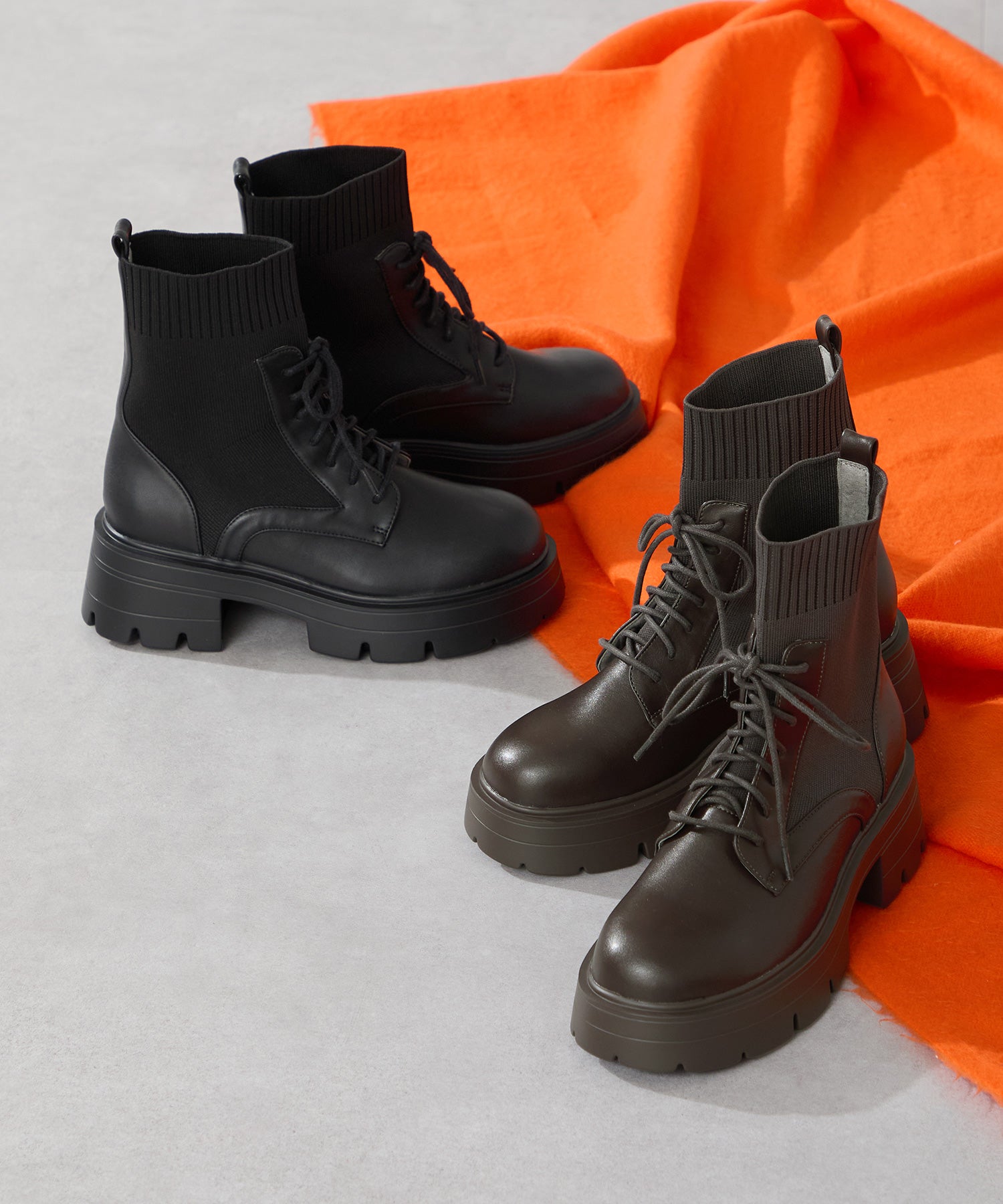 レースアップ×ニットでとことんカジュアルに仕上げたブーツ。厚みのあるソールが脚をすっきりと見せてくれ、筒まわりには伸縮性のあるリブニットを使用することで、着脱のしやすさと快適な履き心地をサポート。ボリュームのあるデザインながら見た目以上に軽く、コロンとしたラウンドトゥが幅広いスタイルに合わせやすいので、この冬重宝しそう。