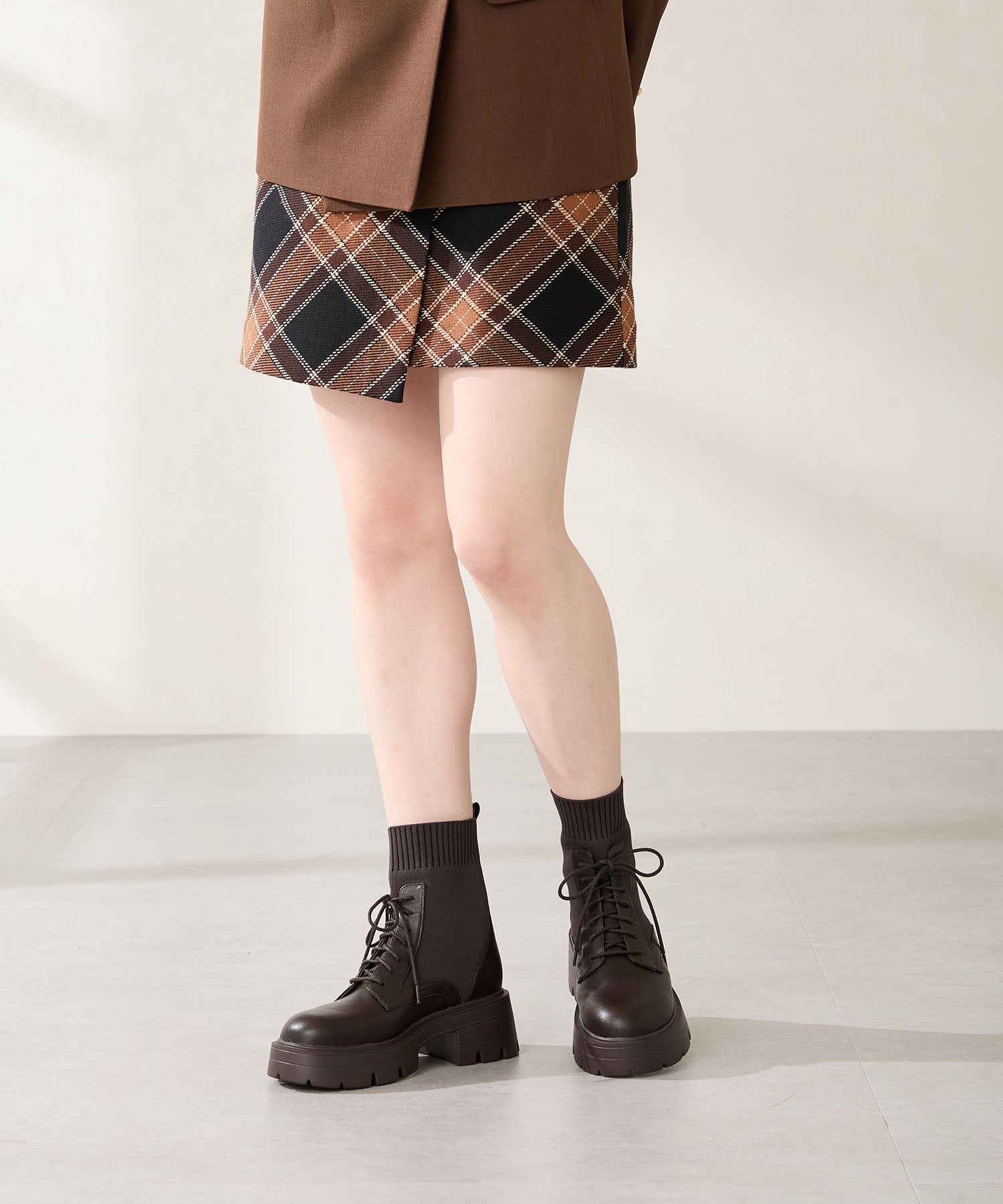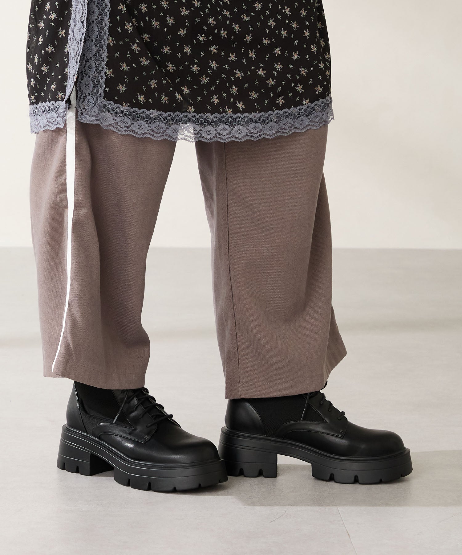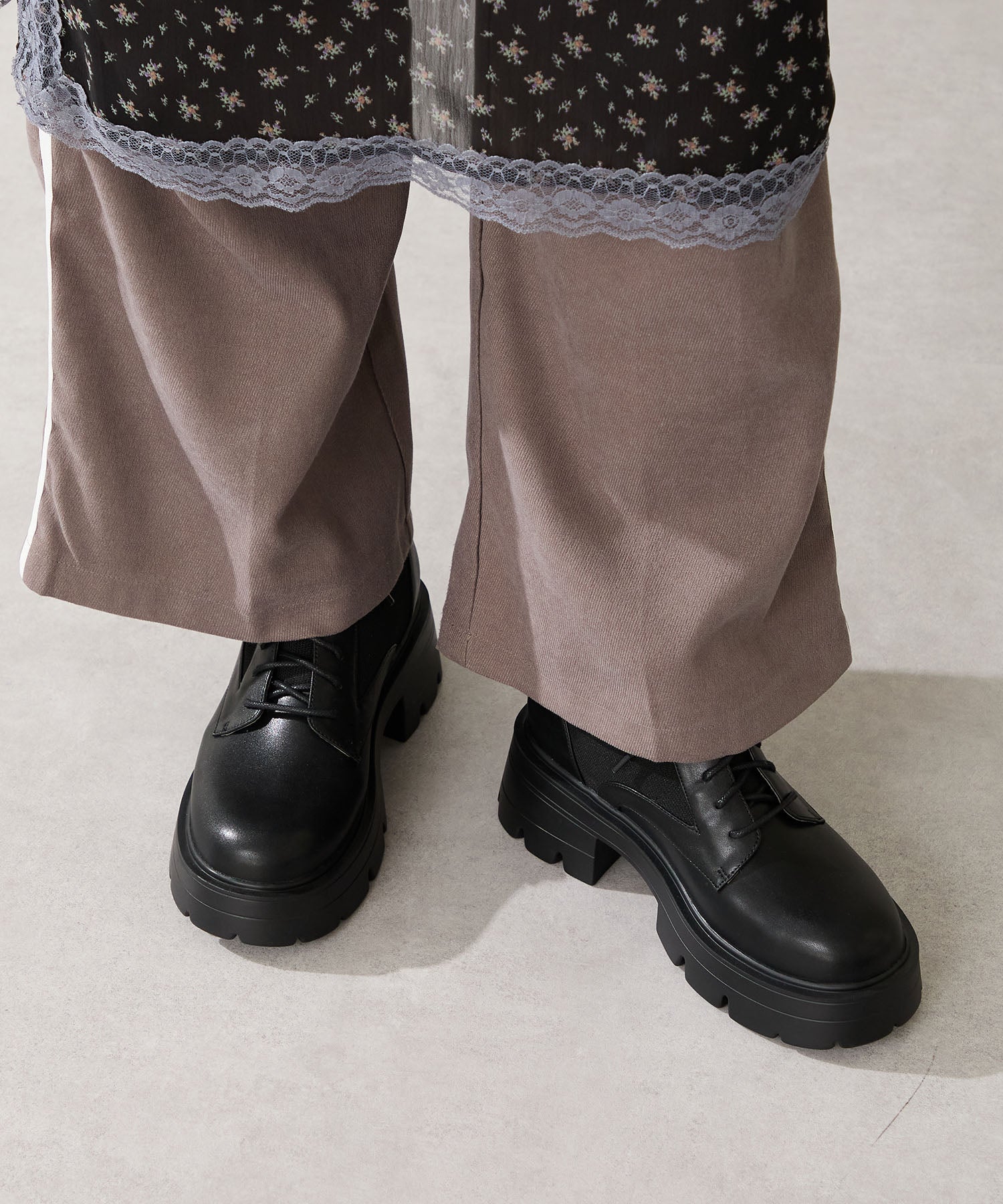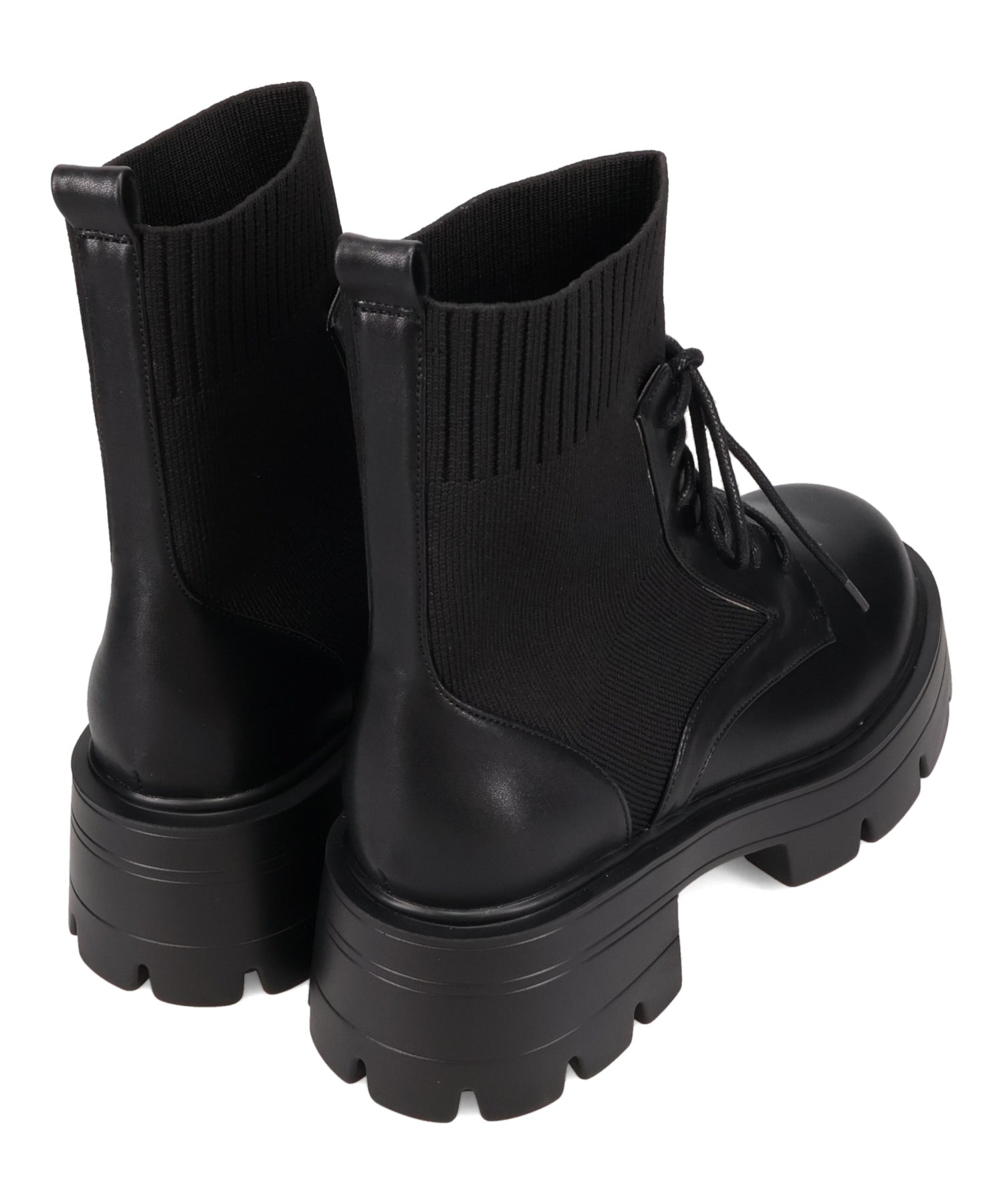 レースアップ×ニットでとことんカジュアルに仕上げたブーツ。厚みのあるソールが脚をすっきりと見せてくれ、筒まわりには伸縮性のあるリブニットを使用することで、着脱のしやすさと快適な履き心地をサポート。ボリュームのあるデザインながら見た目以上に軽く、コロンとしたラウンドトゥが幅広いスタイルに合わせやすいので、この冬重宝しそう。