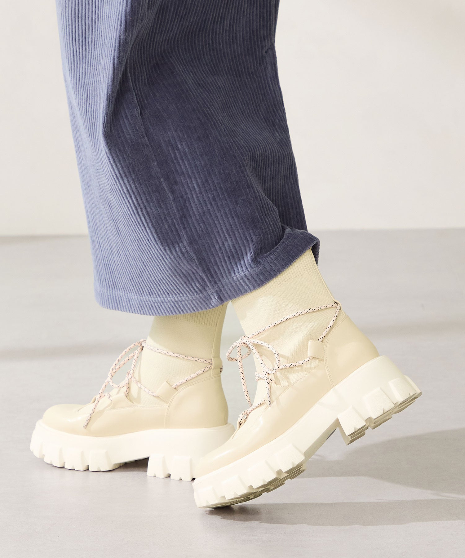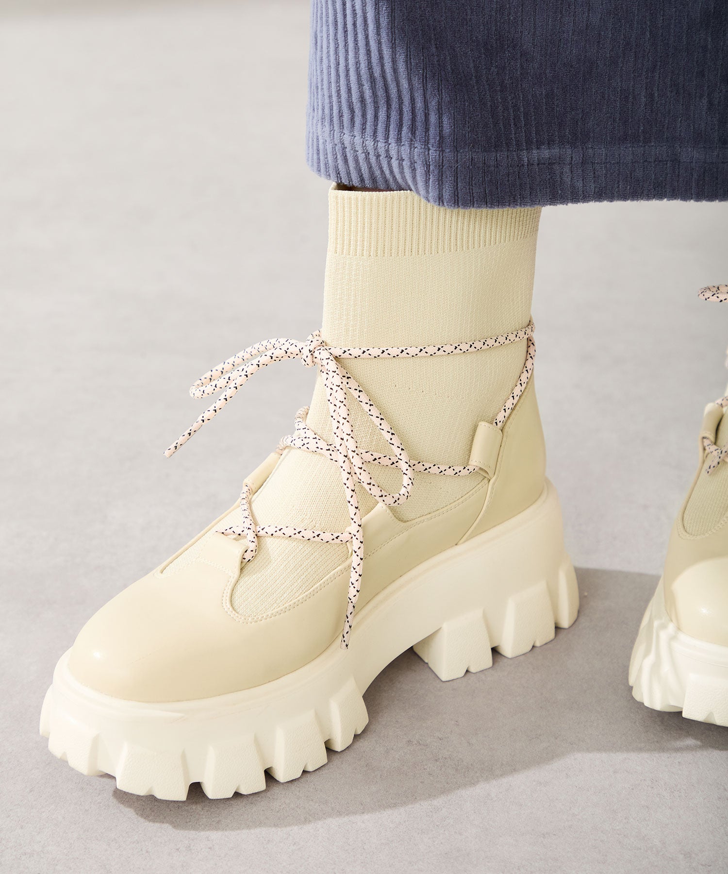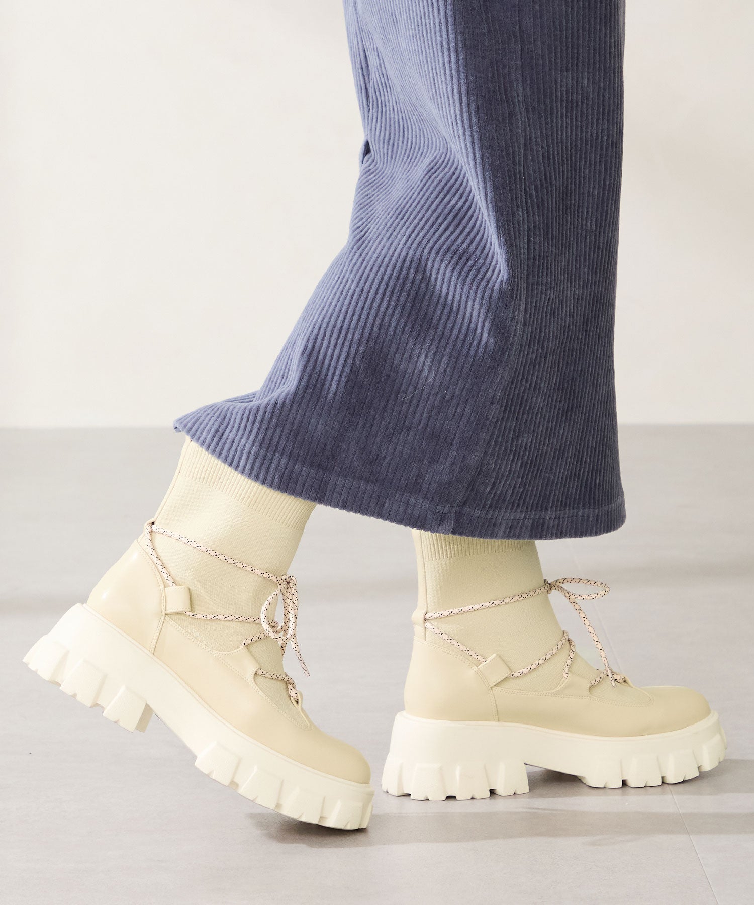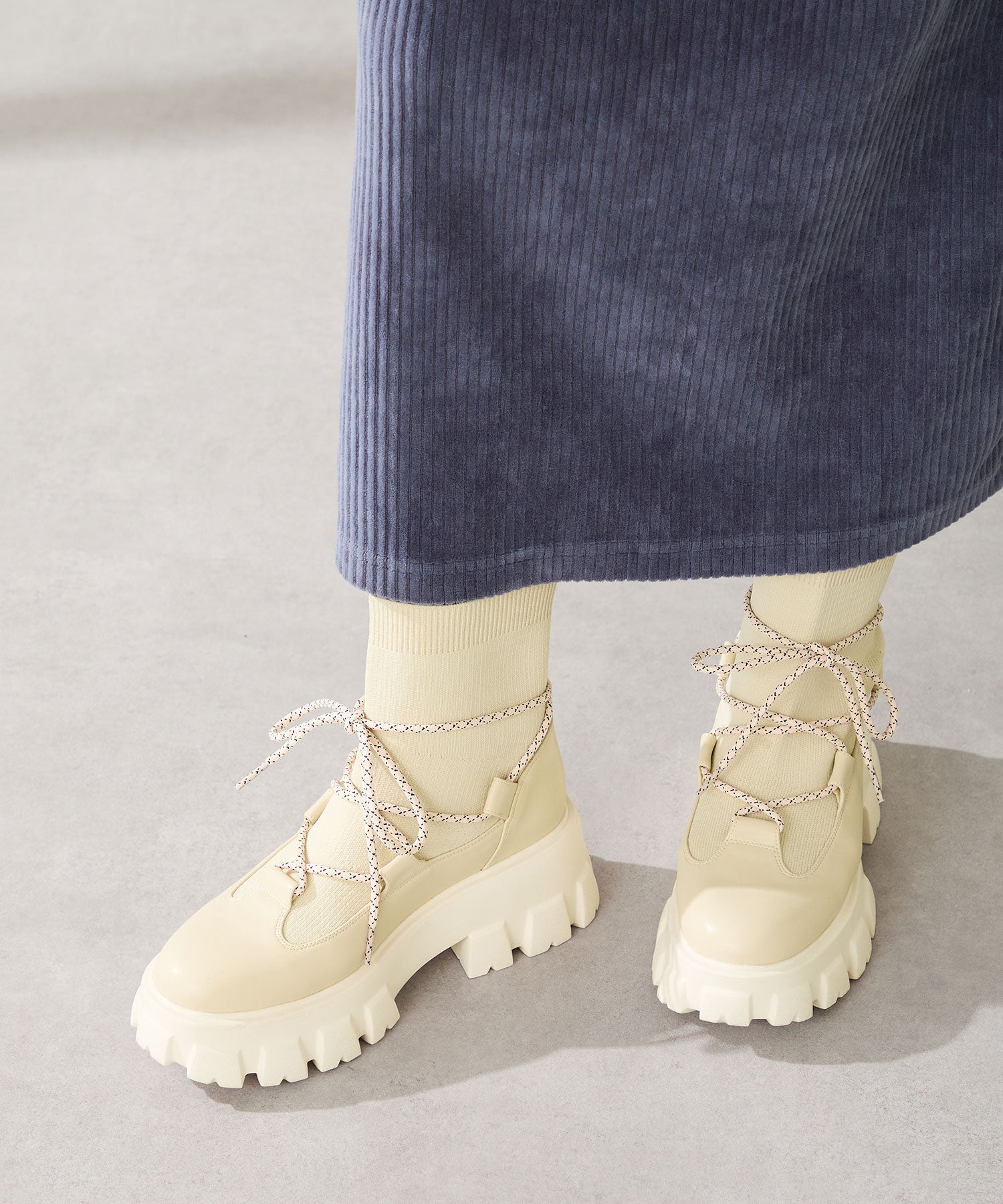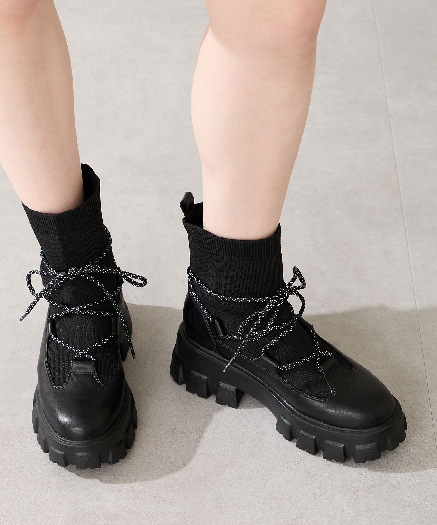 ごつごつとした凹凸のあるソールにストライプ柄のシューレース、柔らかなリブニットを掛け合わせることでスポーティーに仕上げたブーツ。伸縮性のあるニット素材と緩めの筒まわりで着脱がしやすく、肌触りも優しい快適な履き心地。足首を1周するレースアップデザインが足全体を細く見せてくれ、履くだけで旬な足元へアップデート。