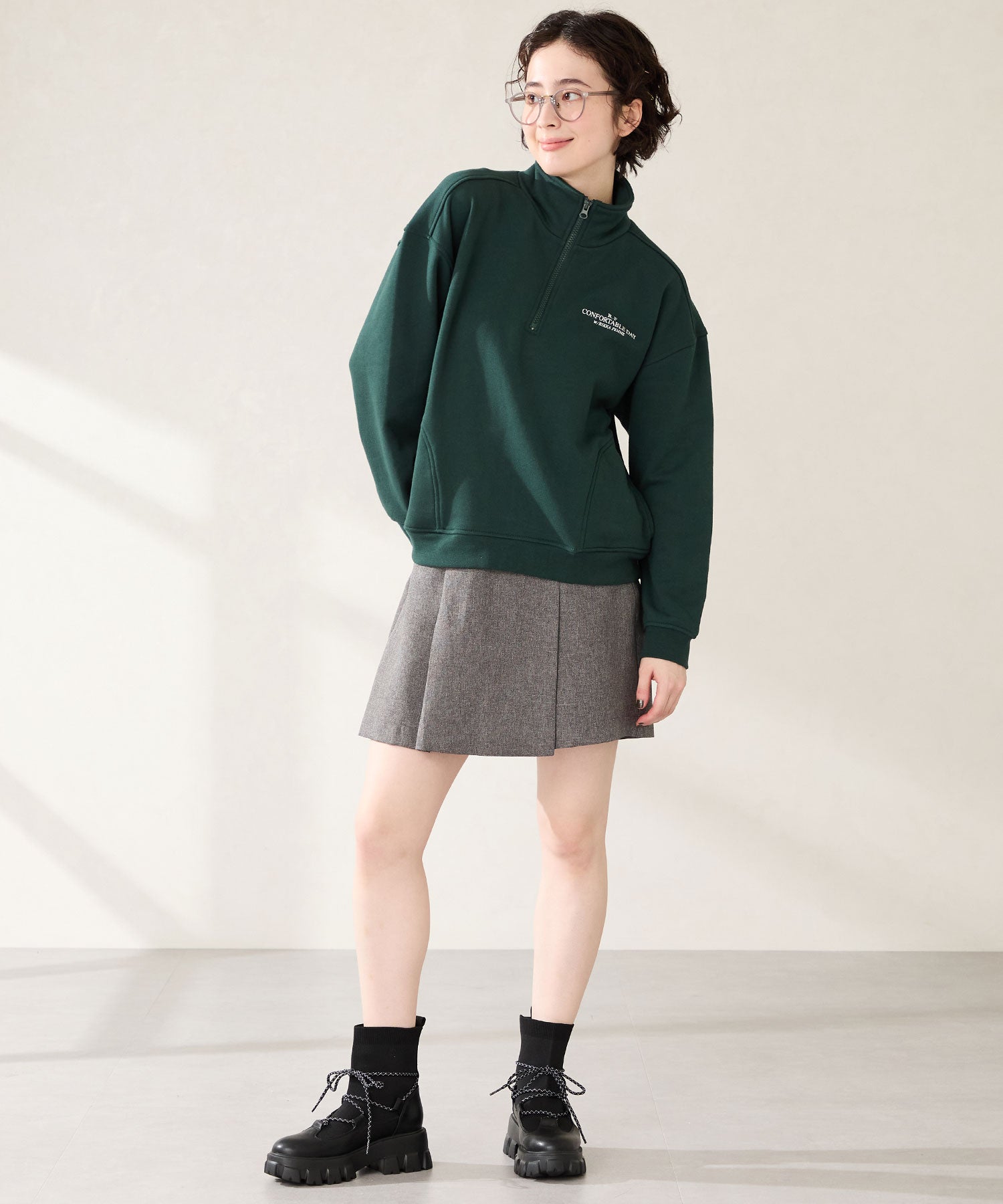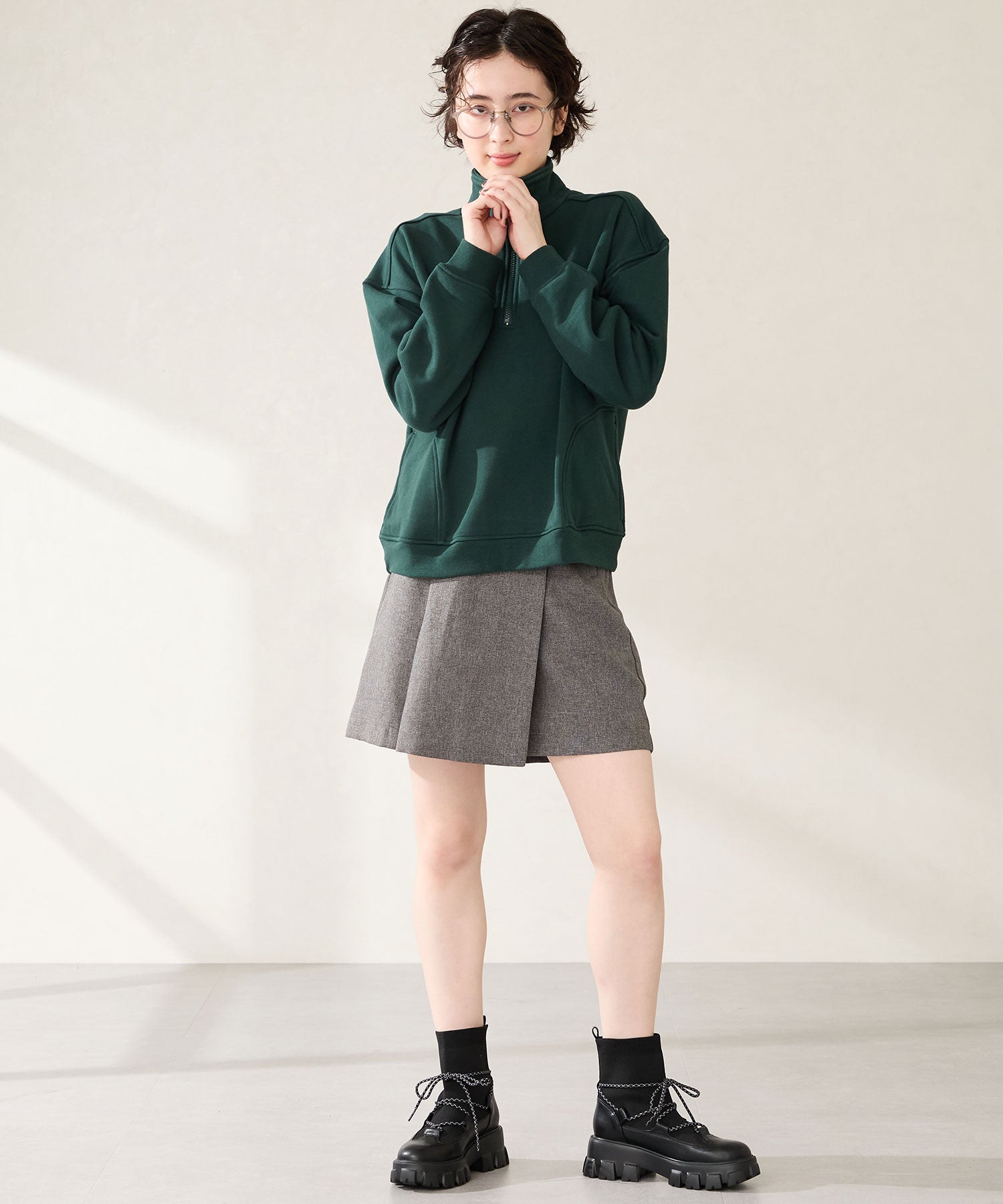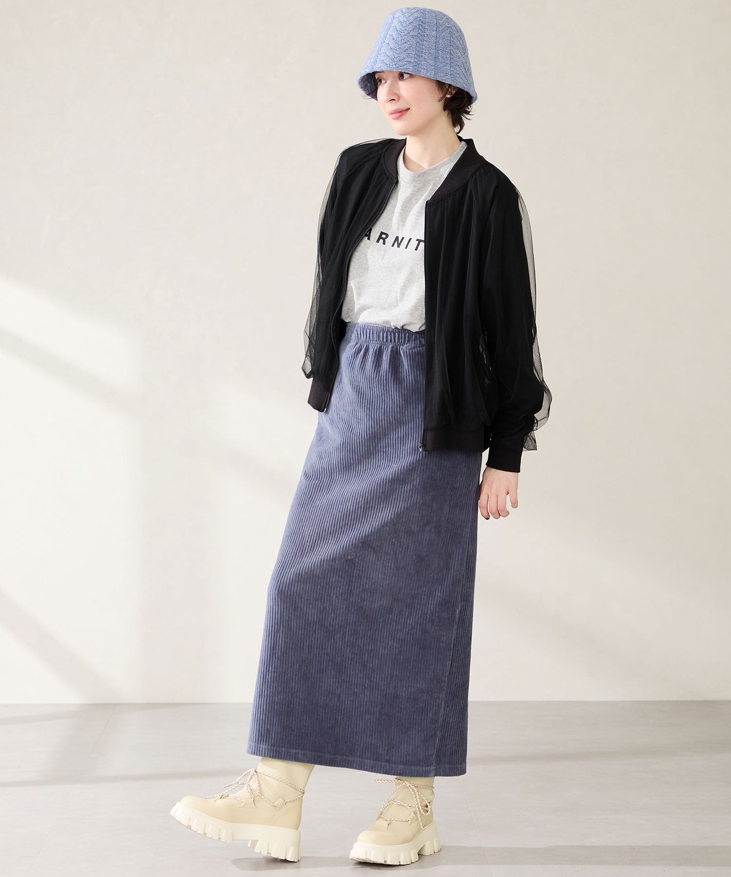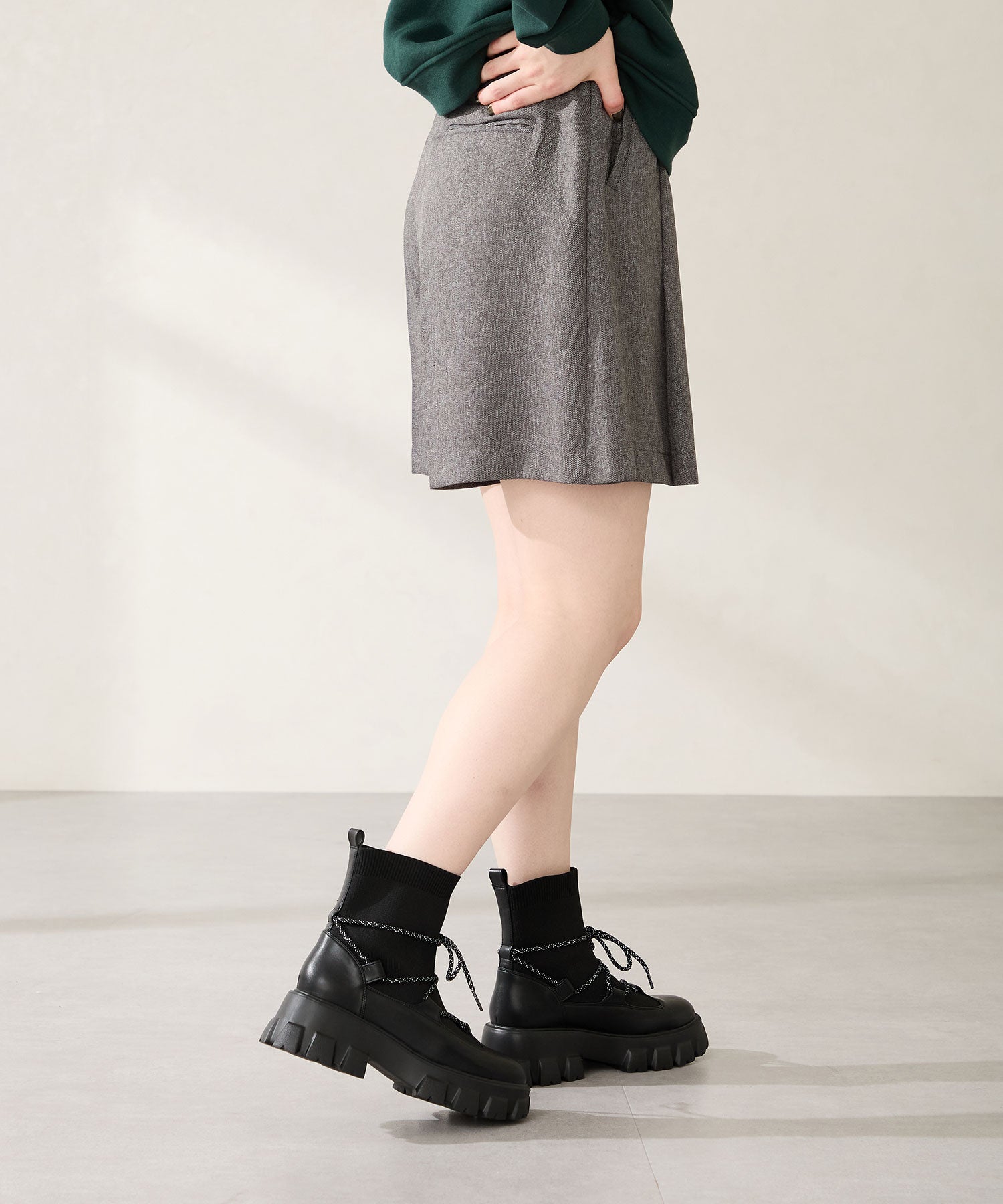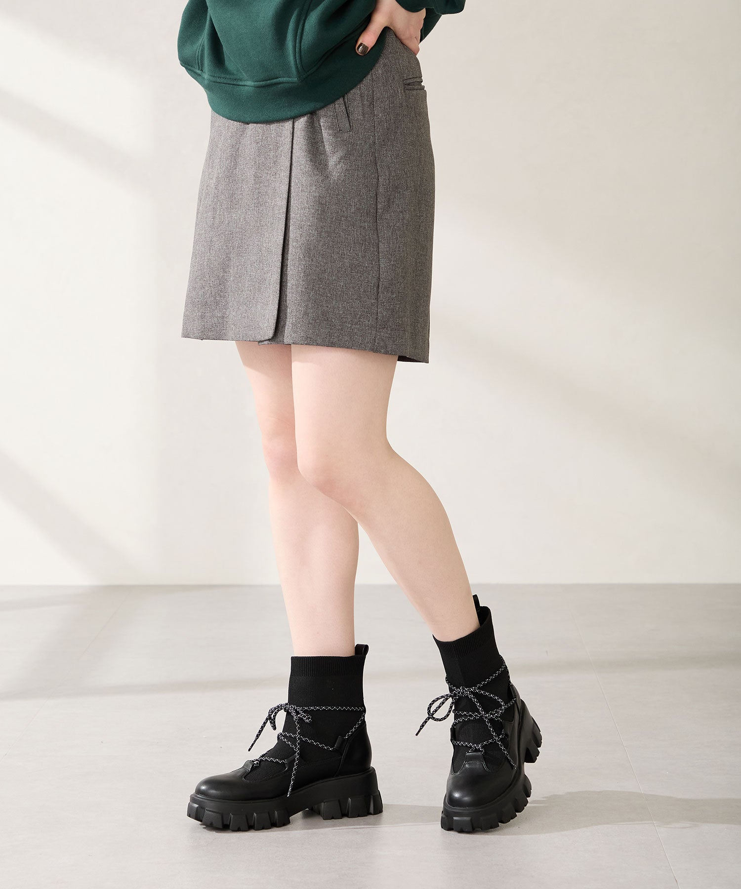 ごつごつとした凹凸のあるソールにストライプ柄のシューレース、柔らかなリブニットを掛け合わせることでスポーティーに仕上げたブーツ。伸縮性のあるニット素材と緩めの筒まわりで着脱がしやすく、肌触りも優しい快適な履き心地。足首を1周するレースアップデザインが足全体を細く見せてくれ、履くだけで旬な足元へアップデート。