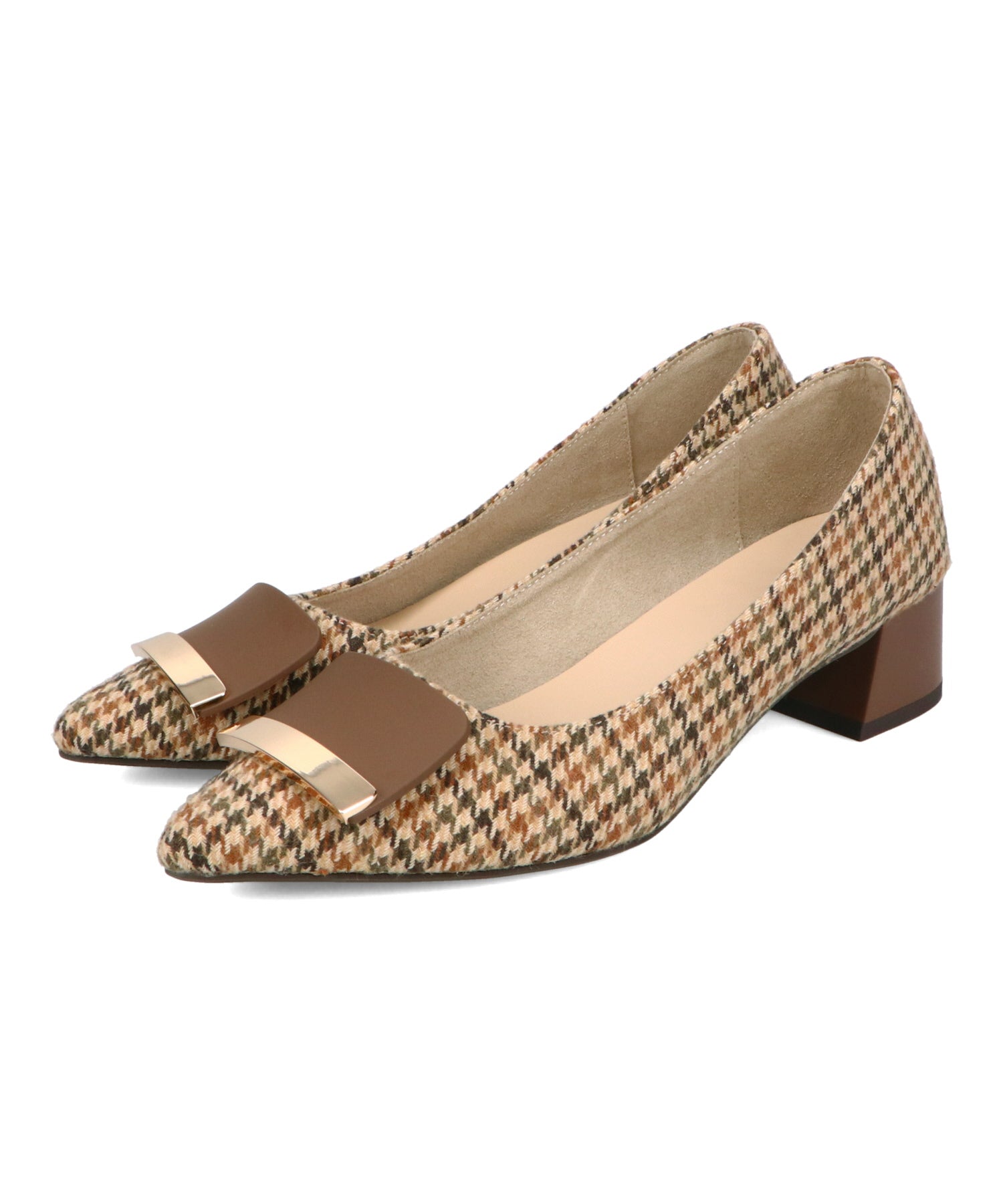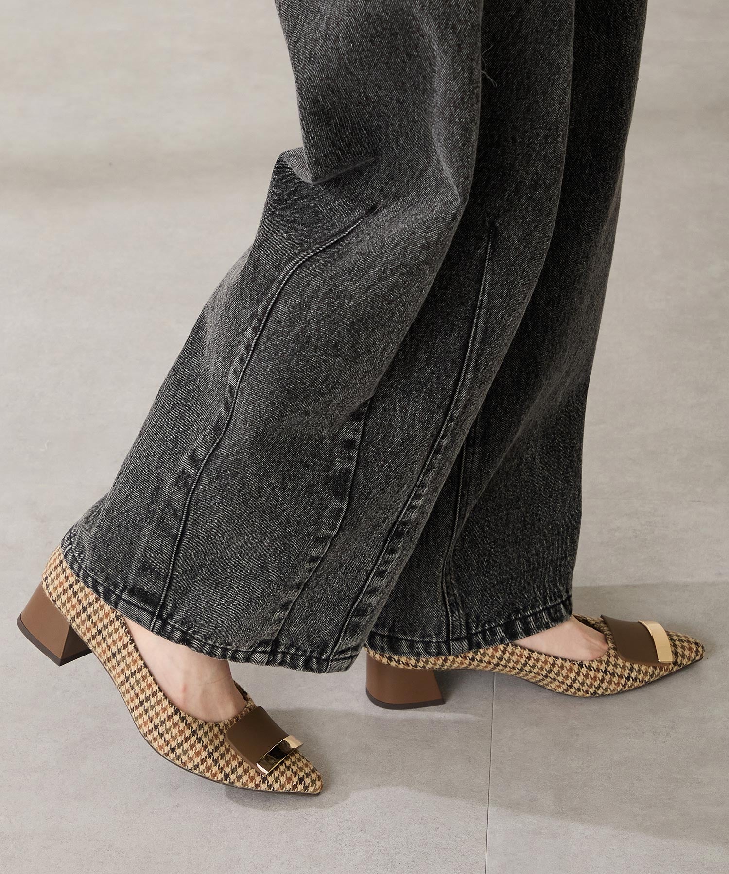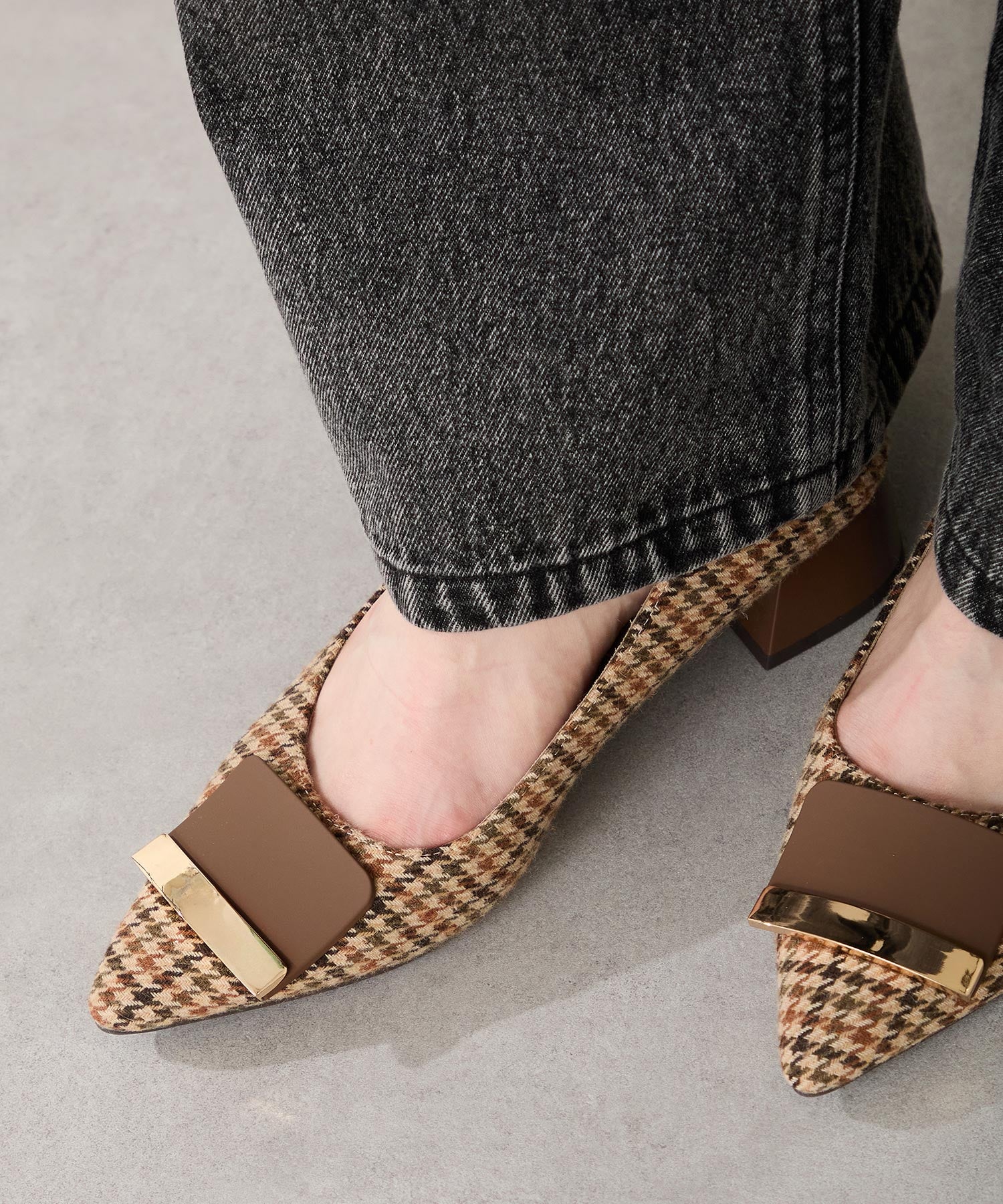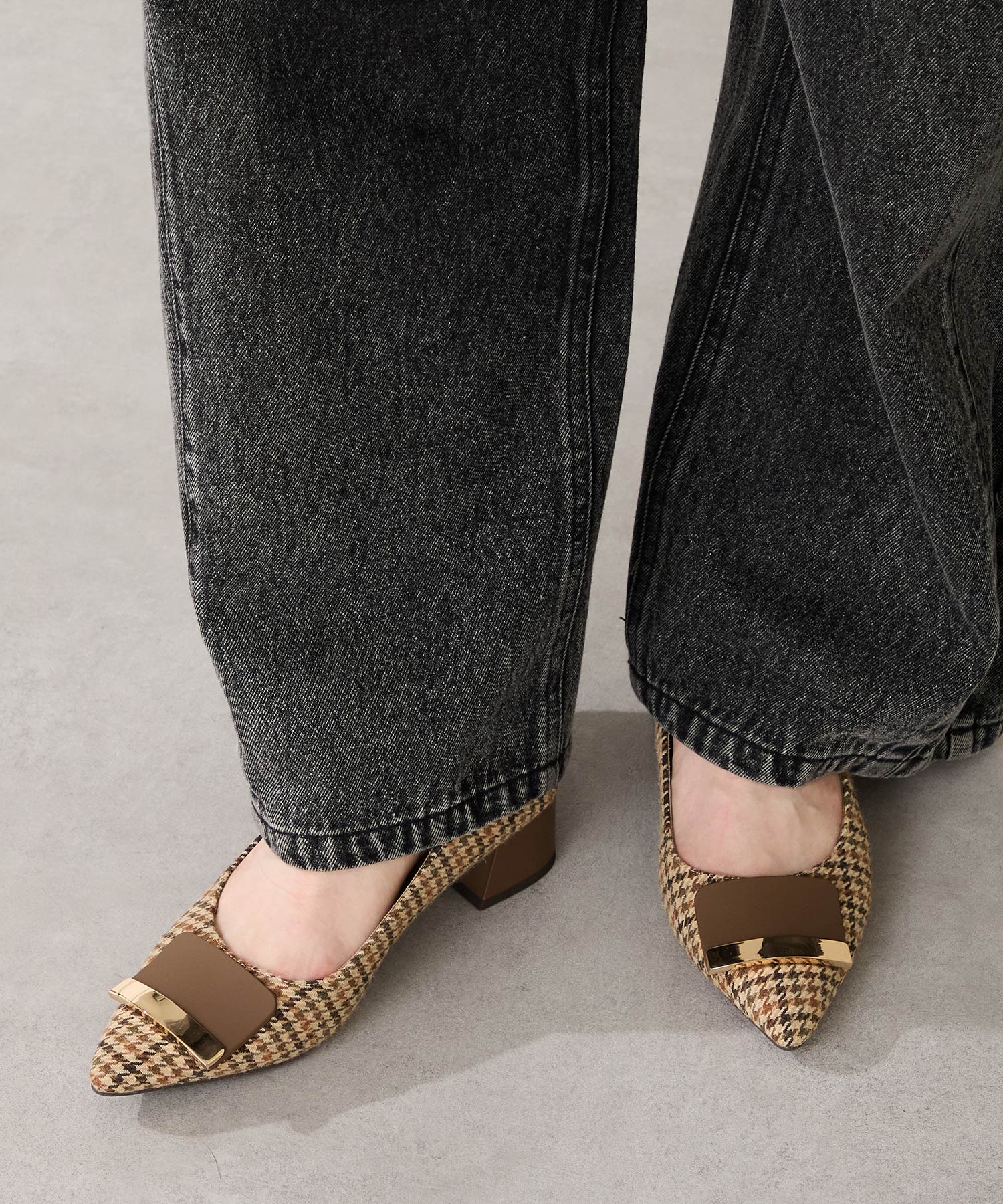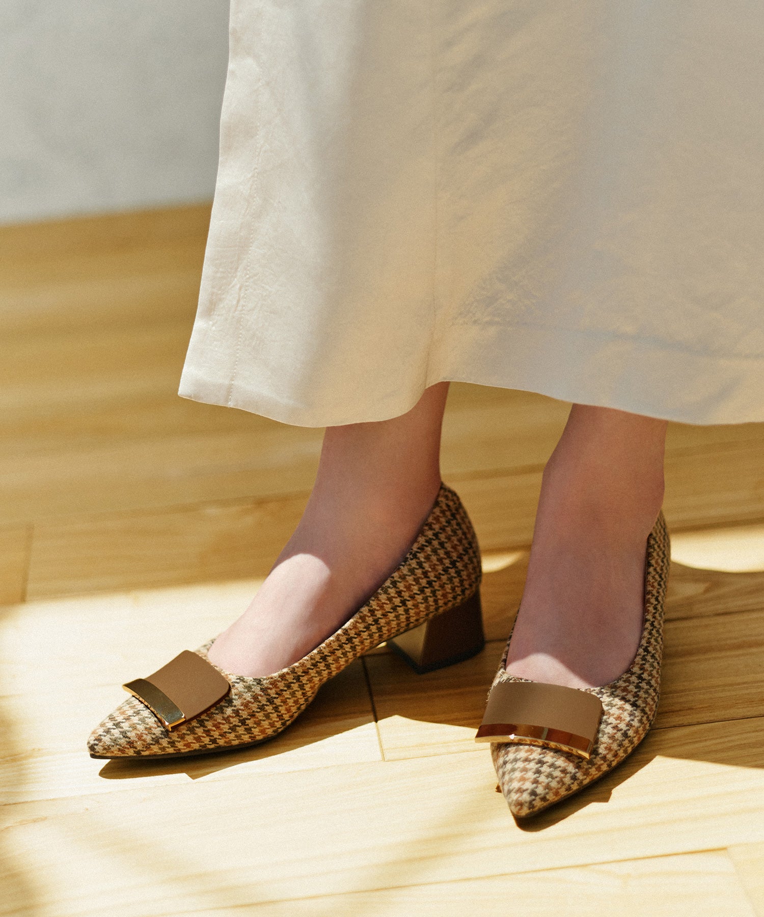 存在感たっぷりの大きなスクエアモチーフにゴールドのプレートがこなれ感をより演出するパンプス。ポインテッドトゥで足元を綺麗に見せながら、安定感のある太めの台形ヒールに、つま先や踵には柔らかな芯を採用することで見た目以上に履き心地面も考えられたアイテム。ツイード素材のブラウンは、落ち着きのあるカラーリングながらもスタイリングのアクセントになるカラー。