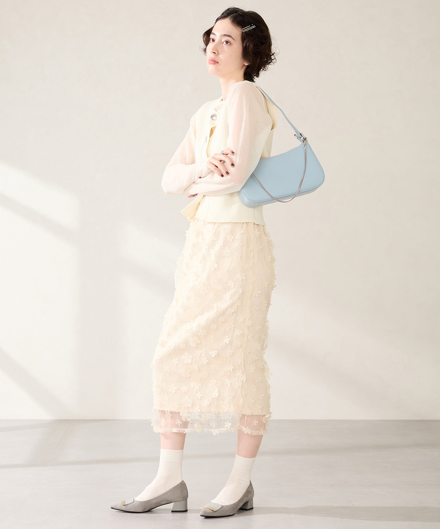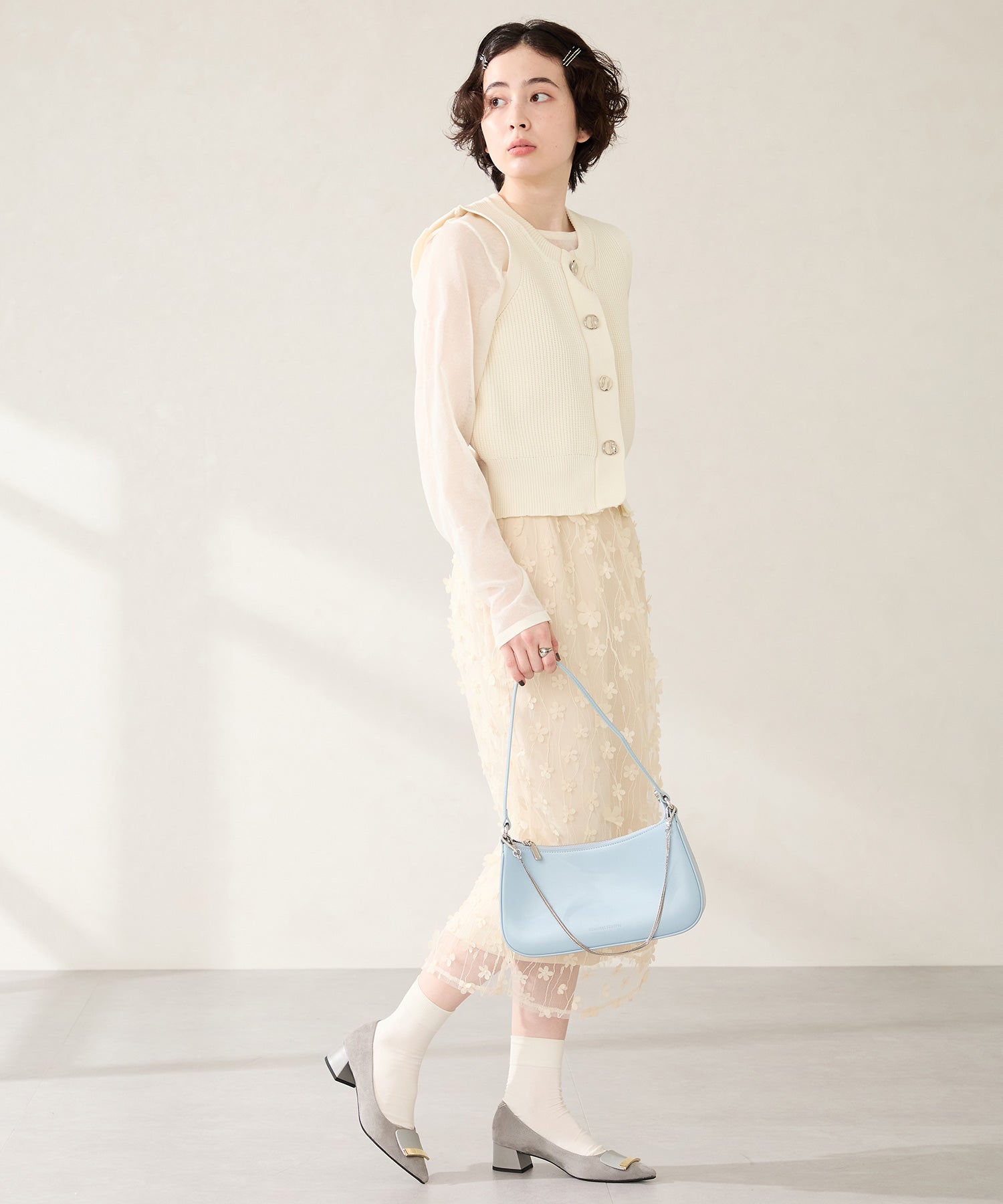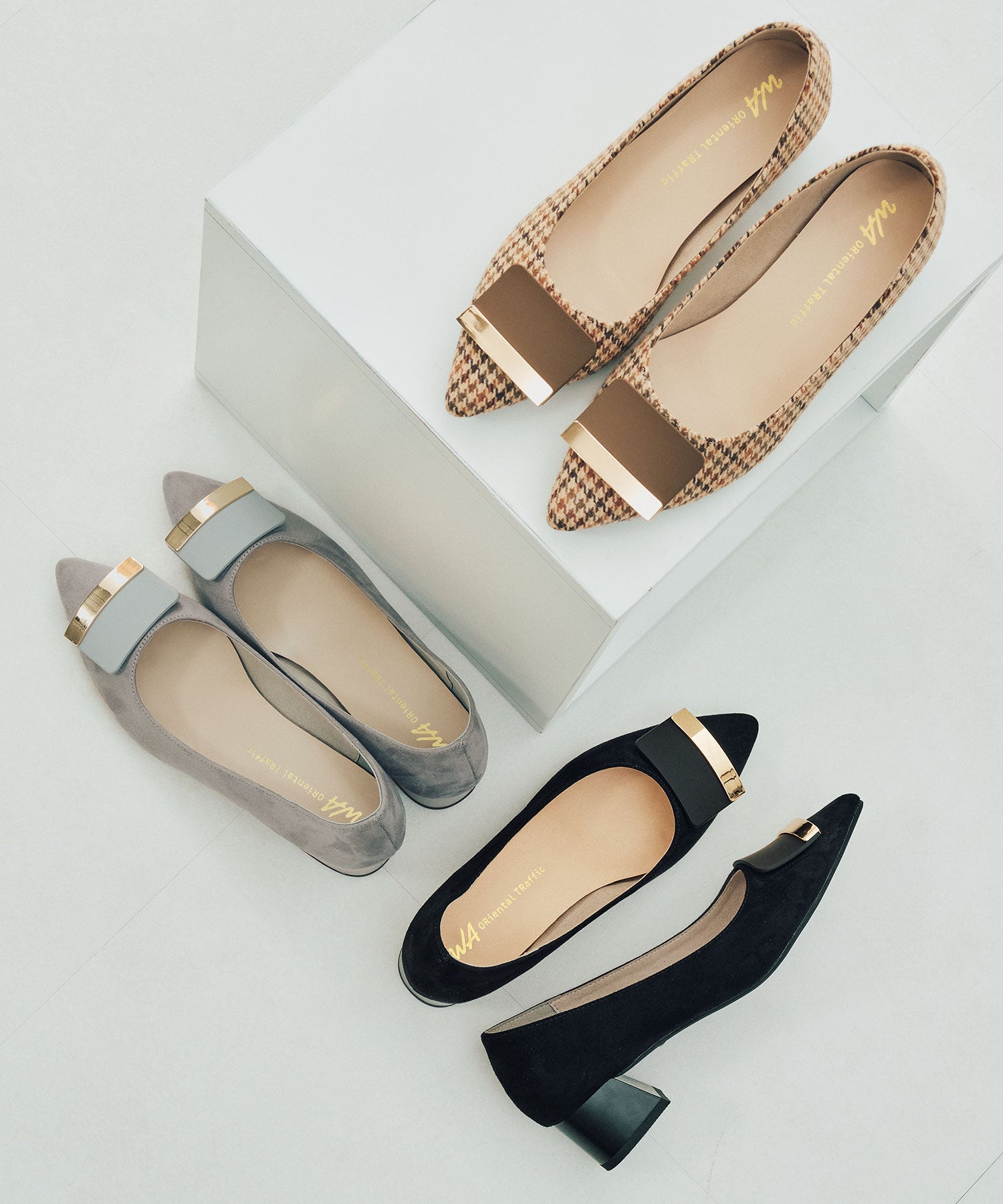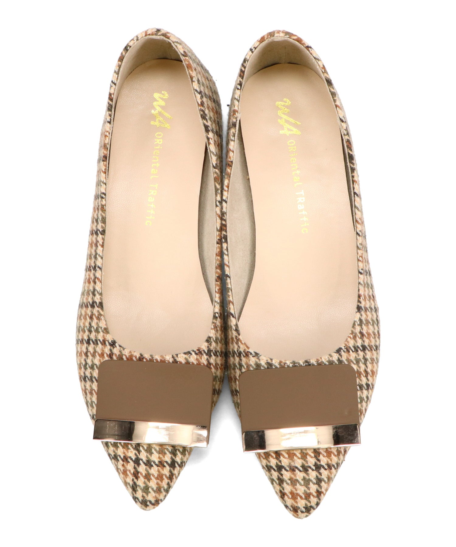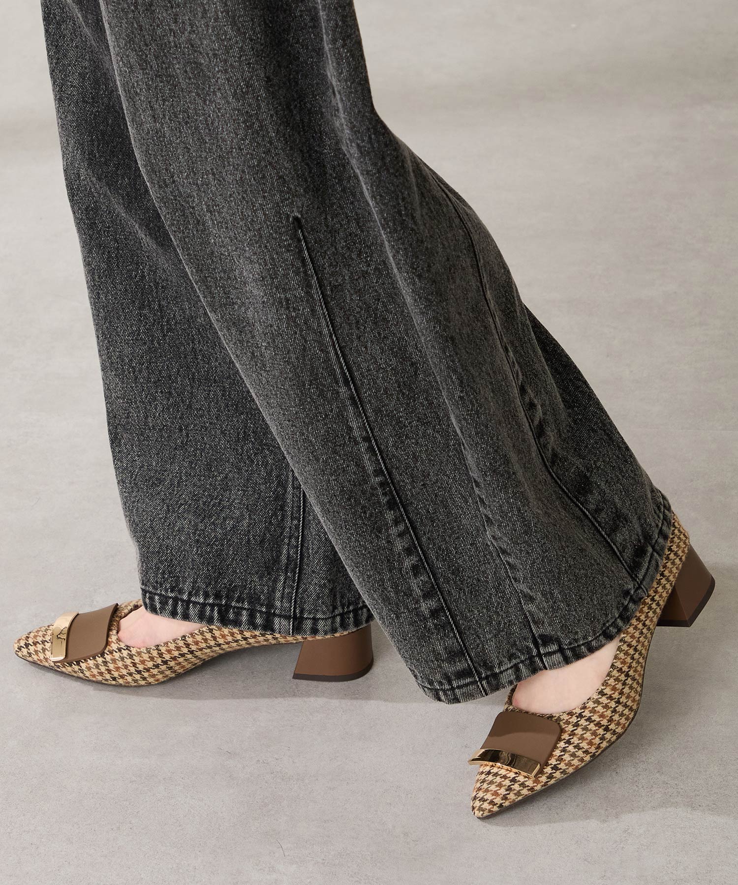 存在感たっぷりの大きなスクエアモチーフにゴールドのプレートがこなれ感をより演出するパンプス。ポインテッドトゥで足元を綺麗に見せながら、安定感のある太めの台形ヒールに、つま先や踵には柔らかな芯を採用することで見た目以上に履き心地面も考えられたアイテム。ツイード素材のブラウンは、落ち着きのあるカラーリングながらもスタイリングのアクセントになるカラー。