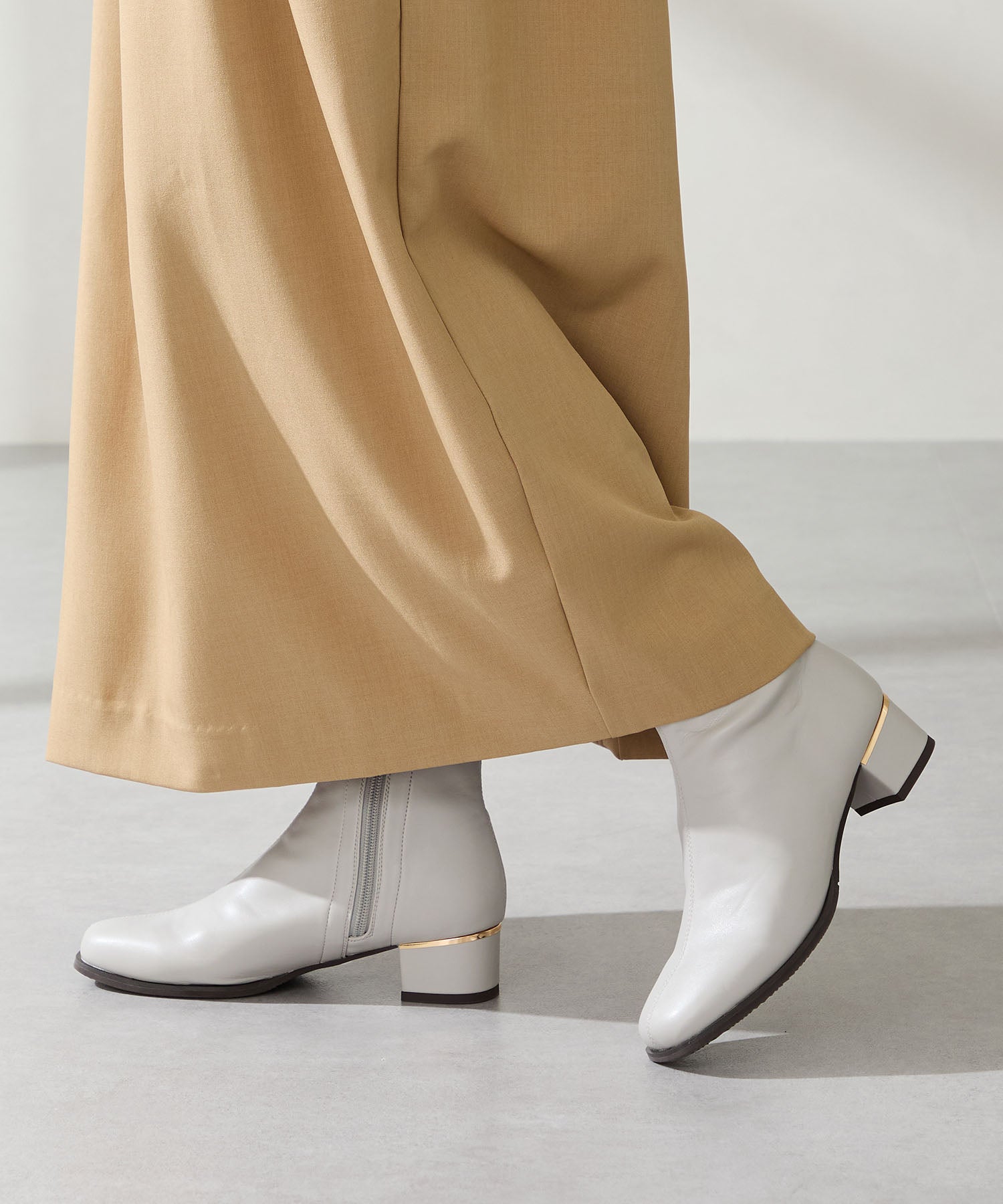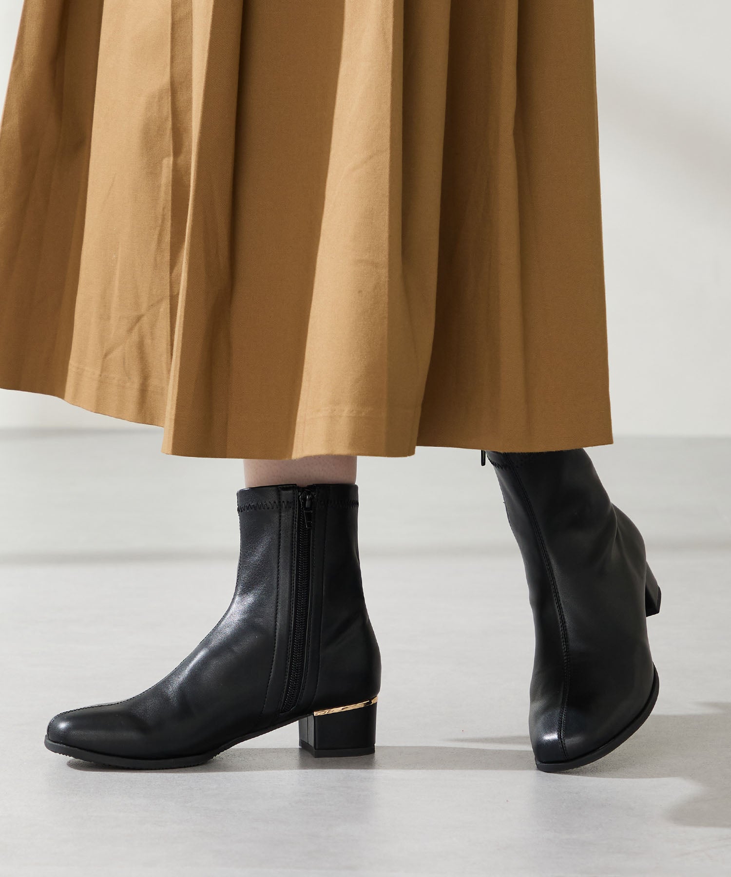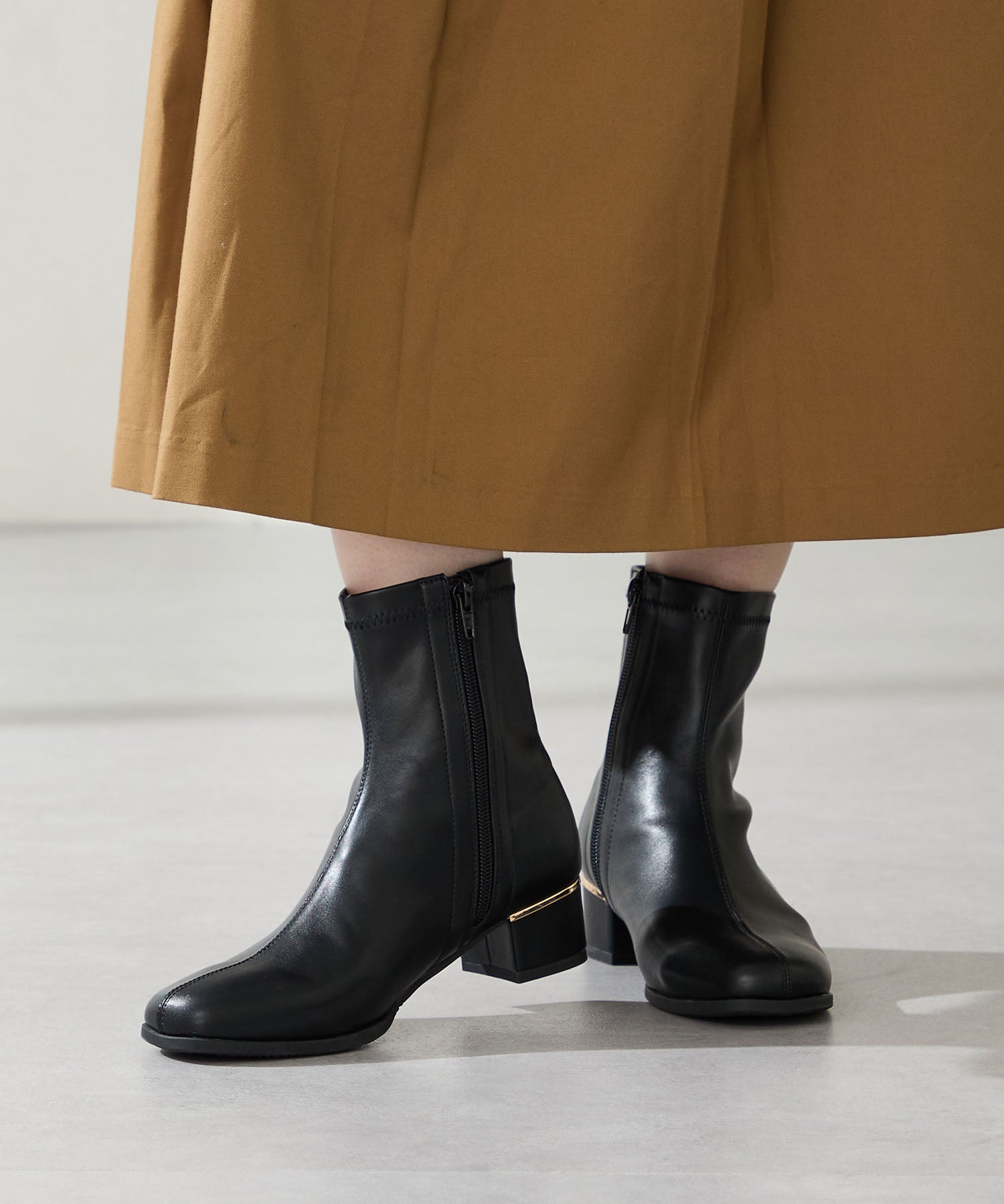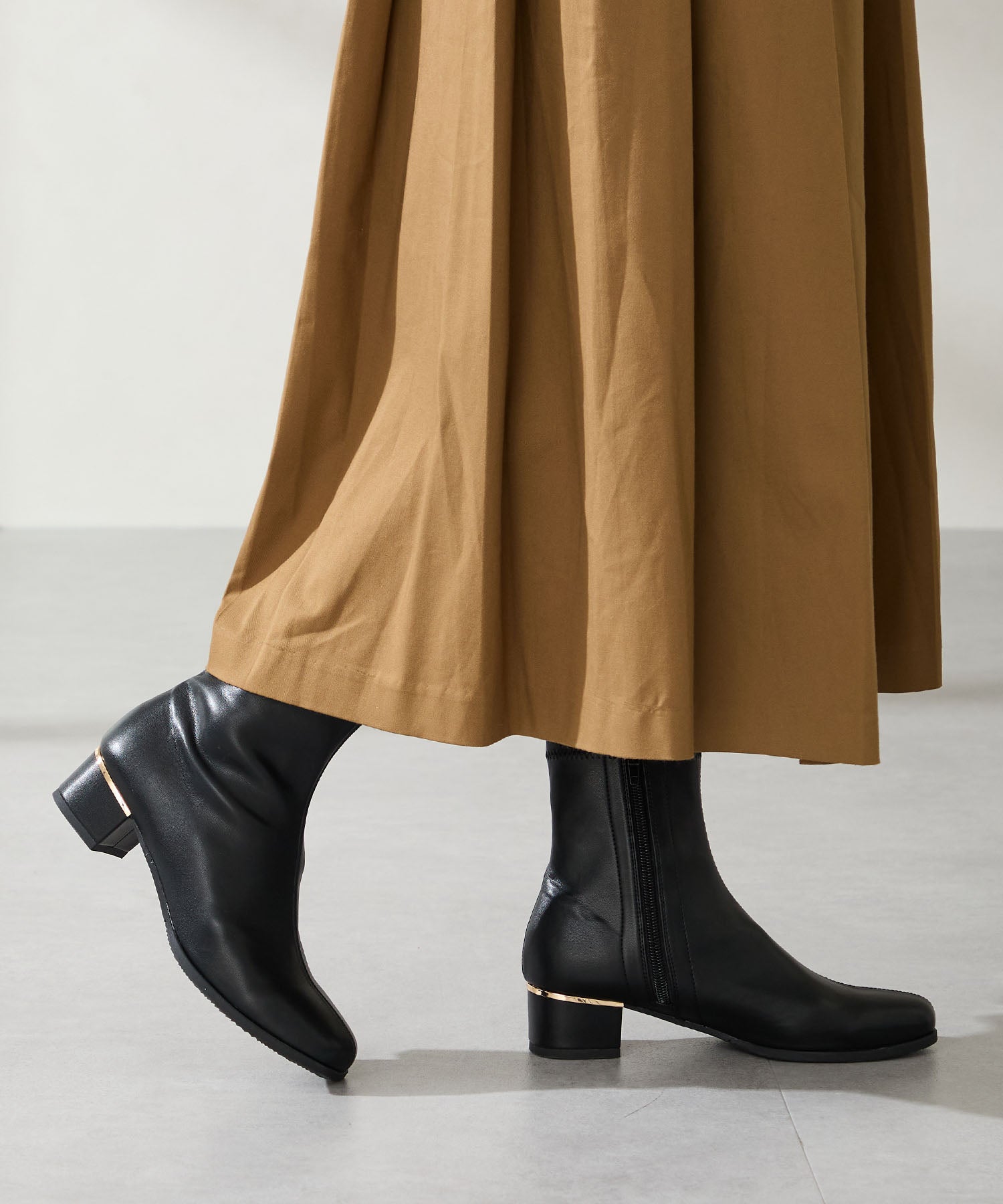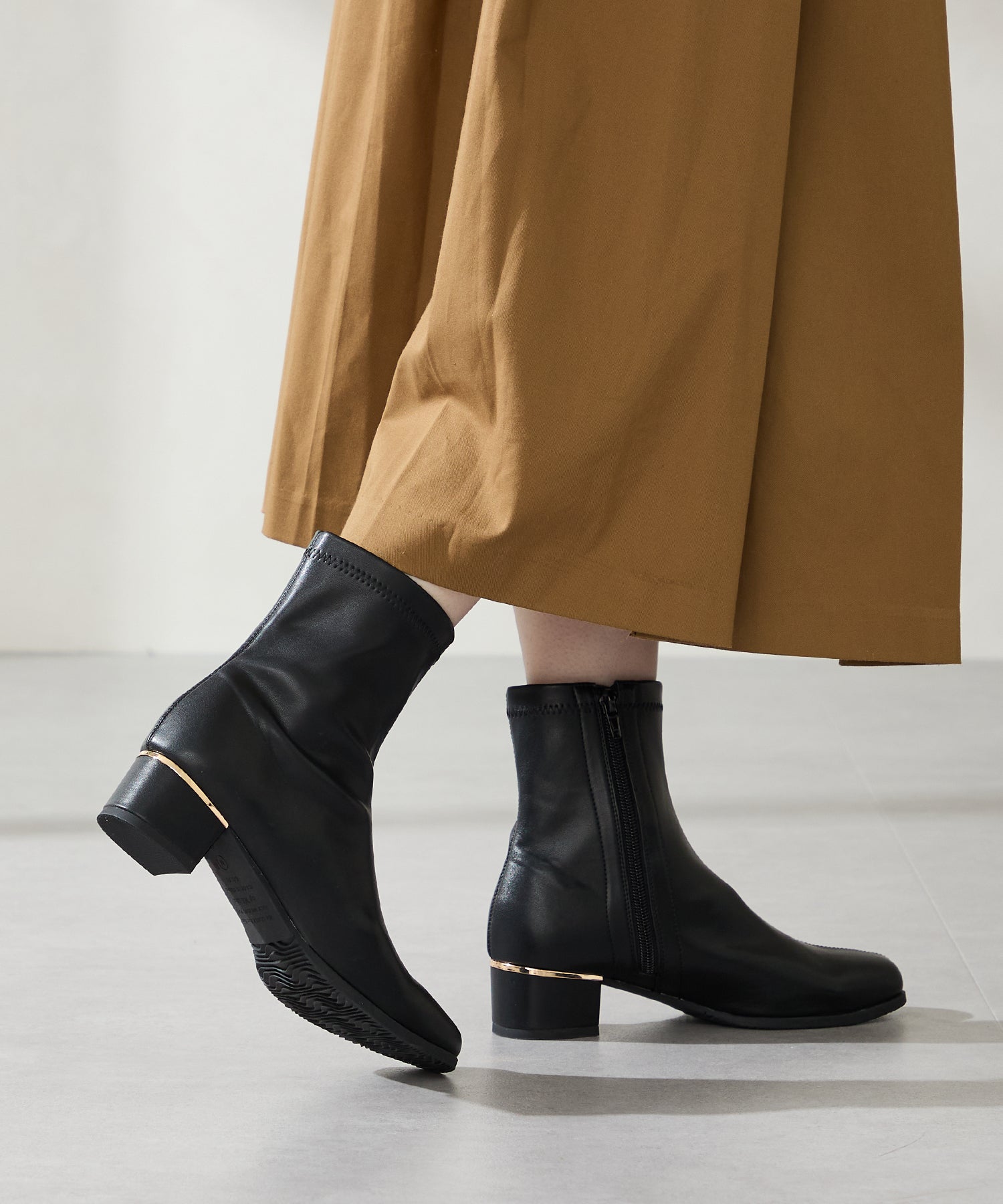 アッパー全体にストレッチの効いた素材を使用したブーツは、凹凸を付けたクッション入りのインソールで履き心地にとことんこだわった1足。低めのヒールにはゴールドのメタリックラインを施し、さりげない上品さをオン。縦のラインを強調するセンターシームのデザインに、足に沿うタイトめなシルエットで足元をすっきり見せながら、履くだけでスタイリングを引き締めてくれる。