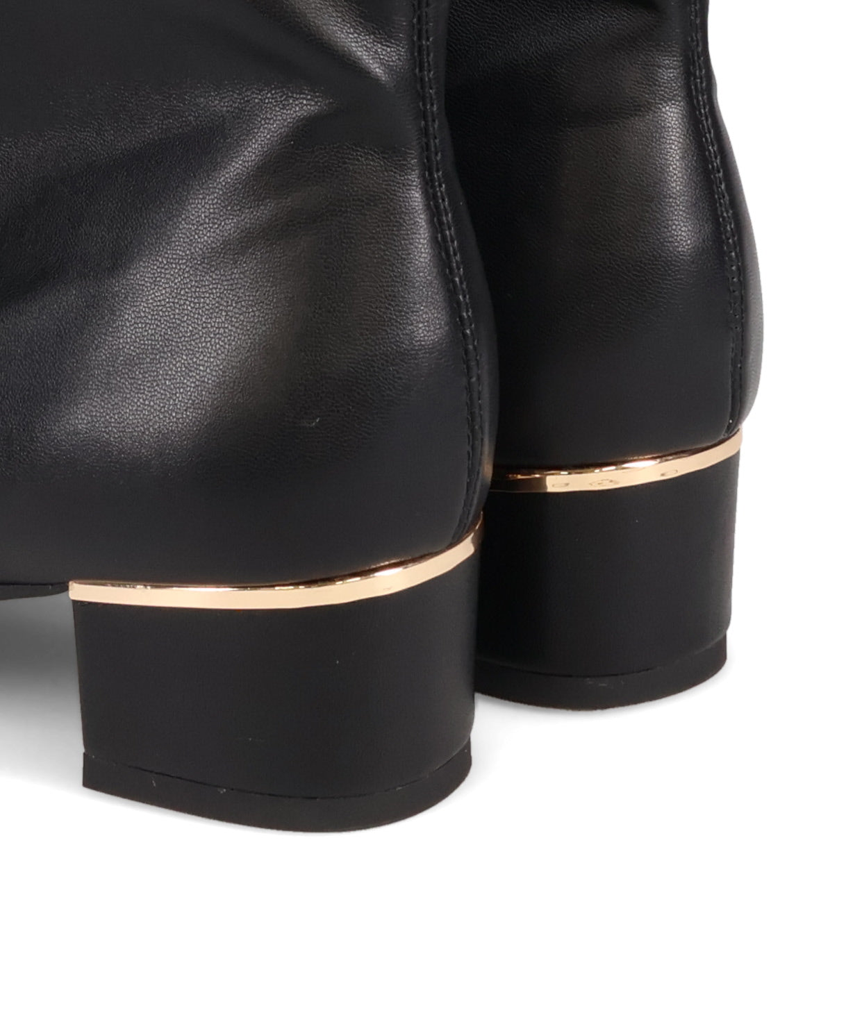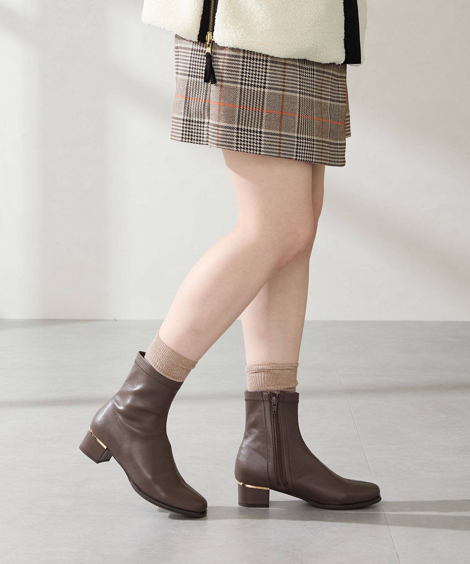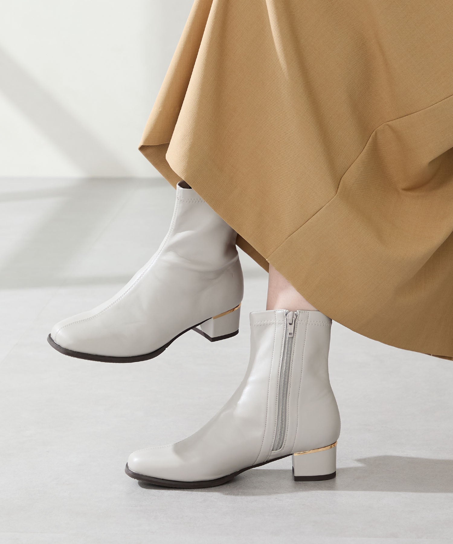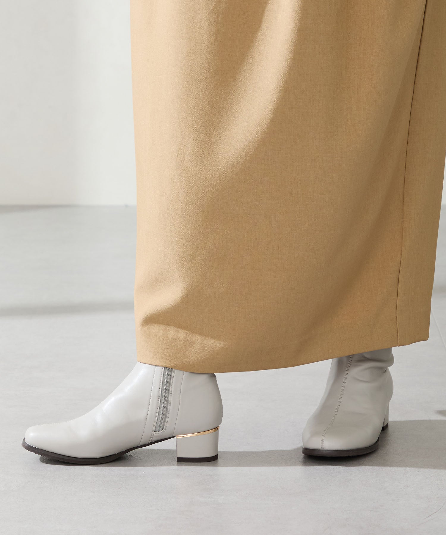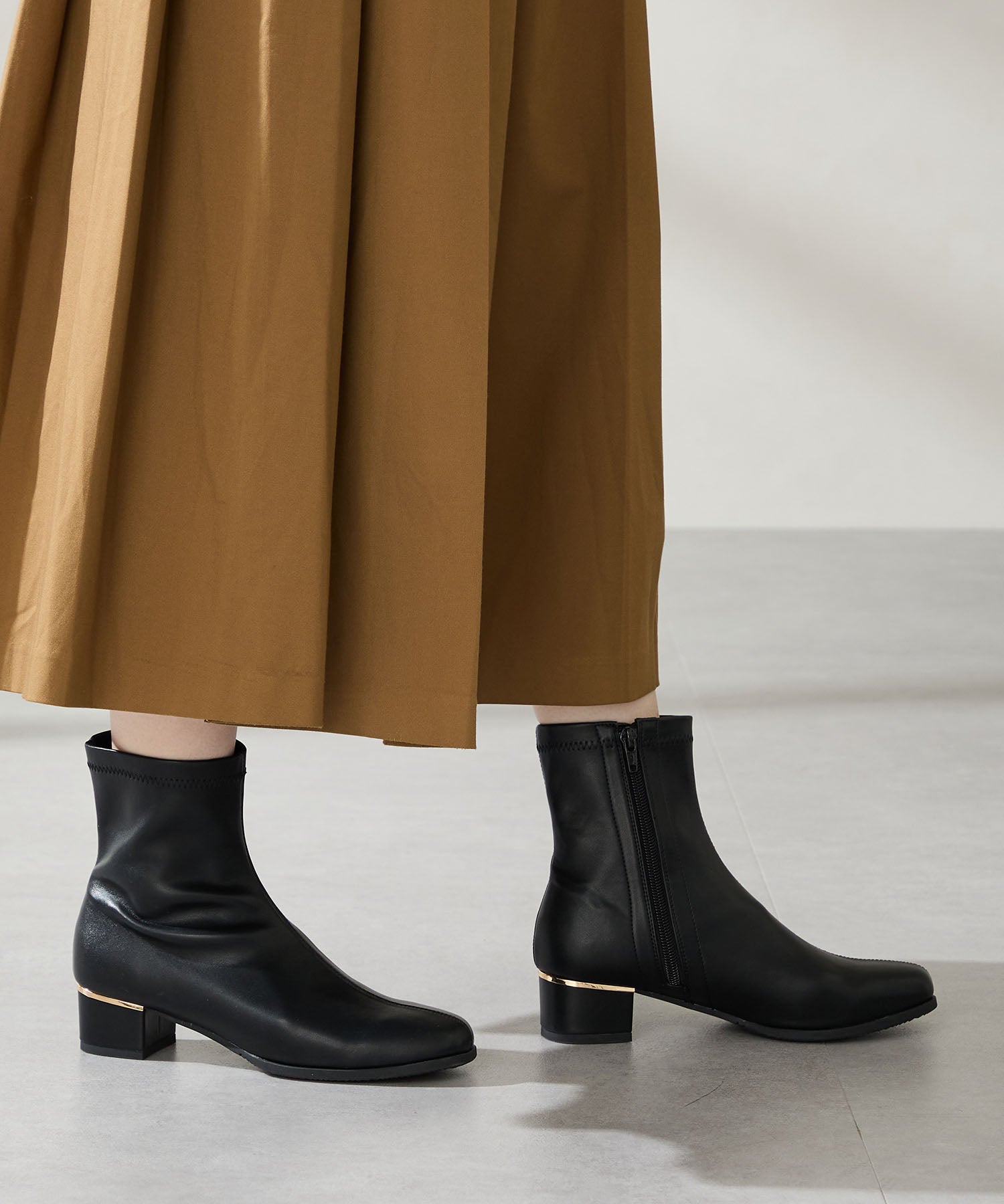 アッパー全体にストレッチの効いた素材を使用したブーツは、凹凸を付けたクッション入りのインソールで履き心地にとことんこだわった1足。低めのヒールにはゴールドのメタリックラインを施し、さりげない上品さをオン。縦のラインを強調するセンターシームのデザインに、足に沿うタイトめなシルエットで足元をすっきり見せながら、履くだけでスタイリングを引き締めてくれる。