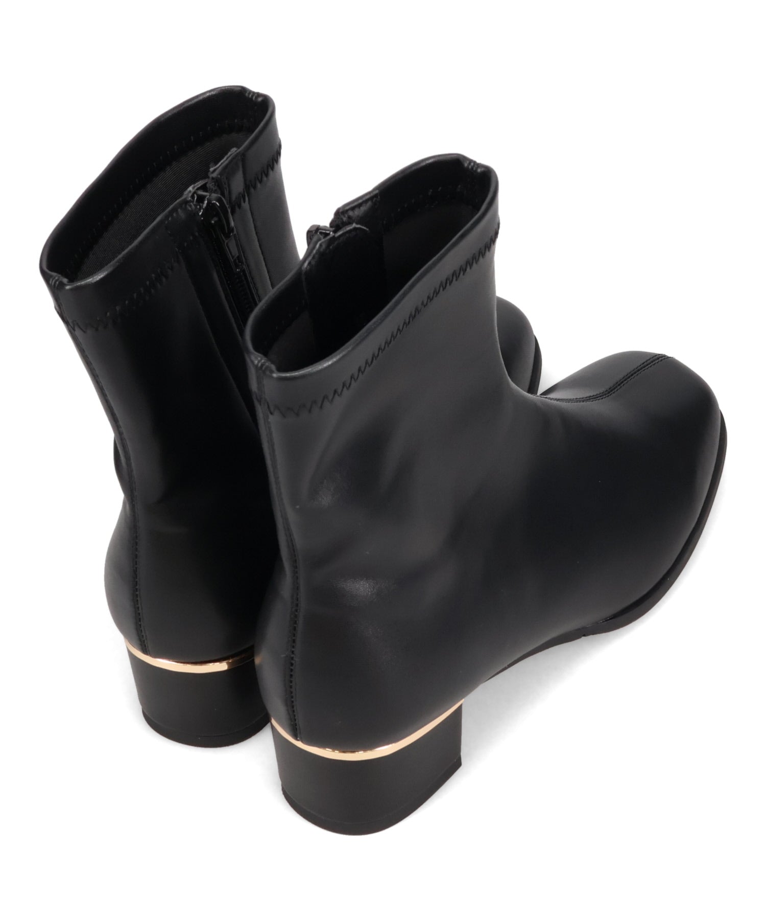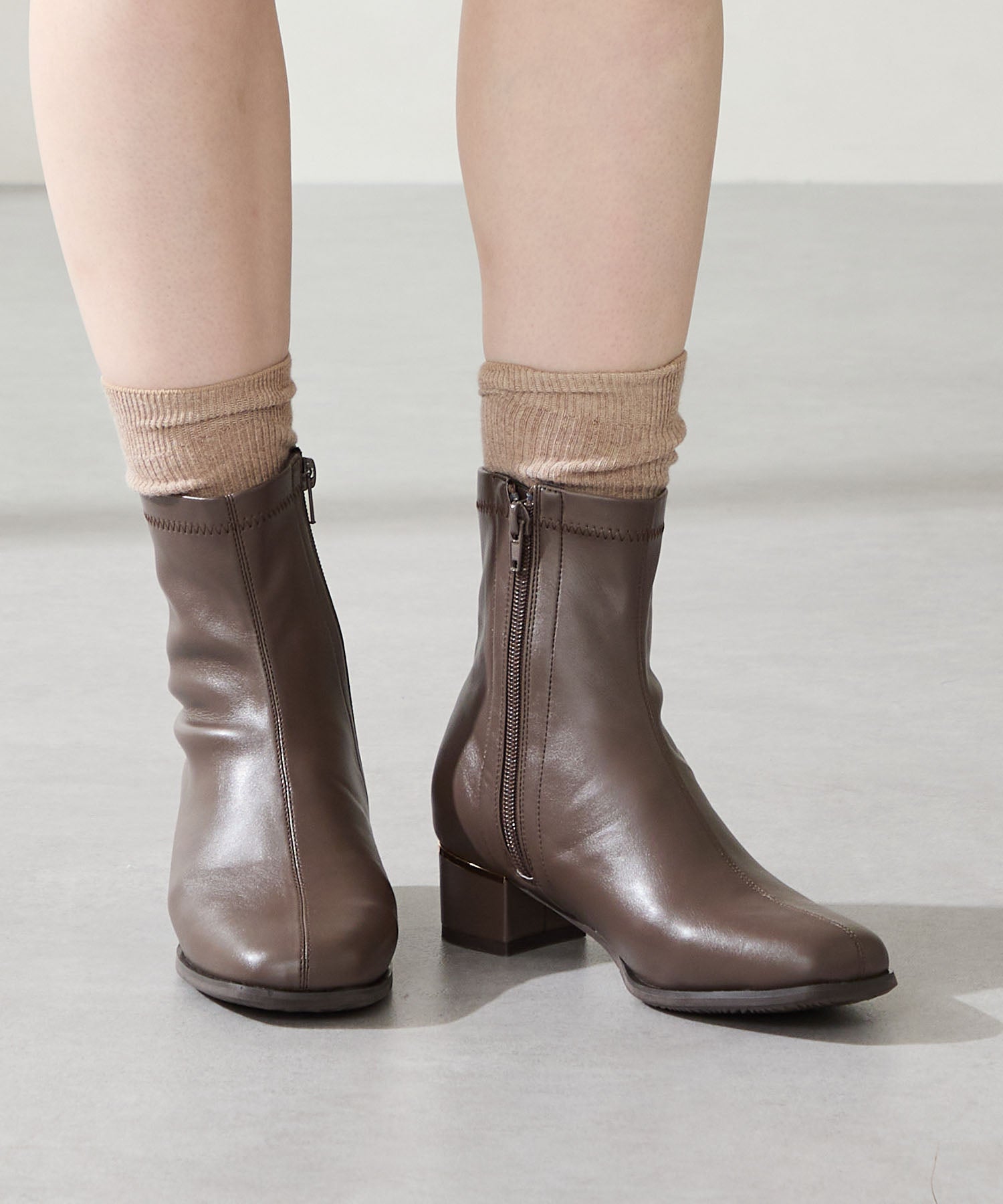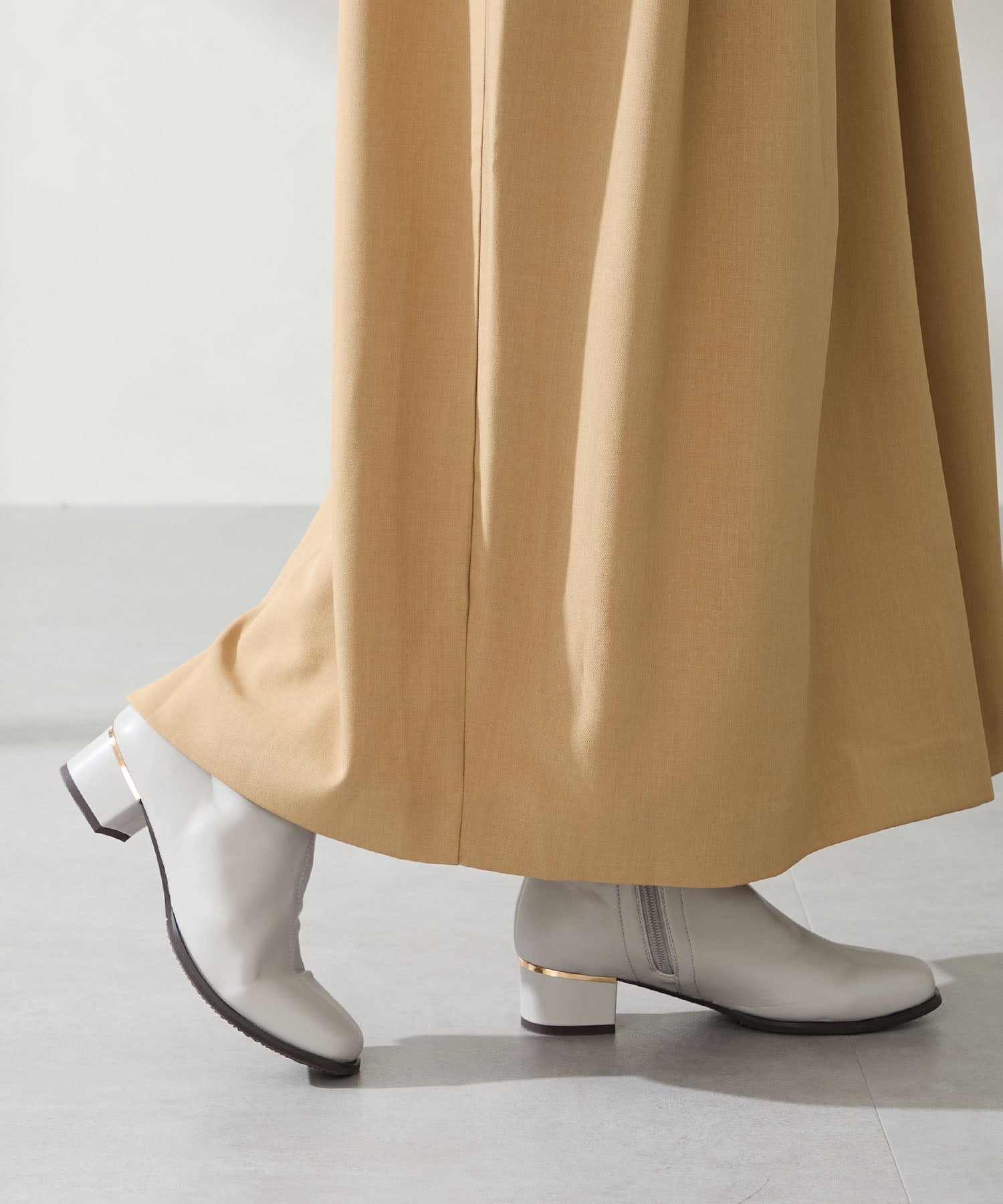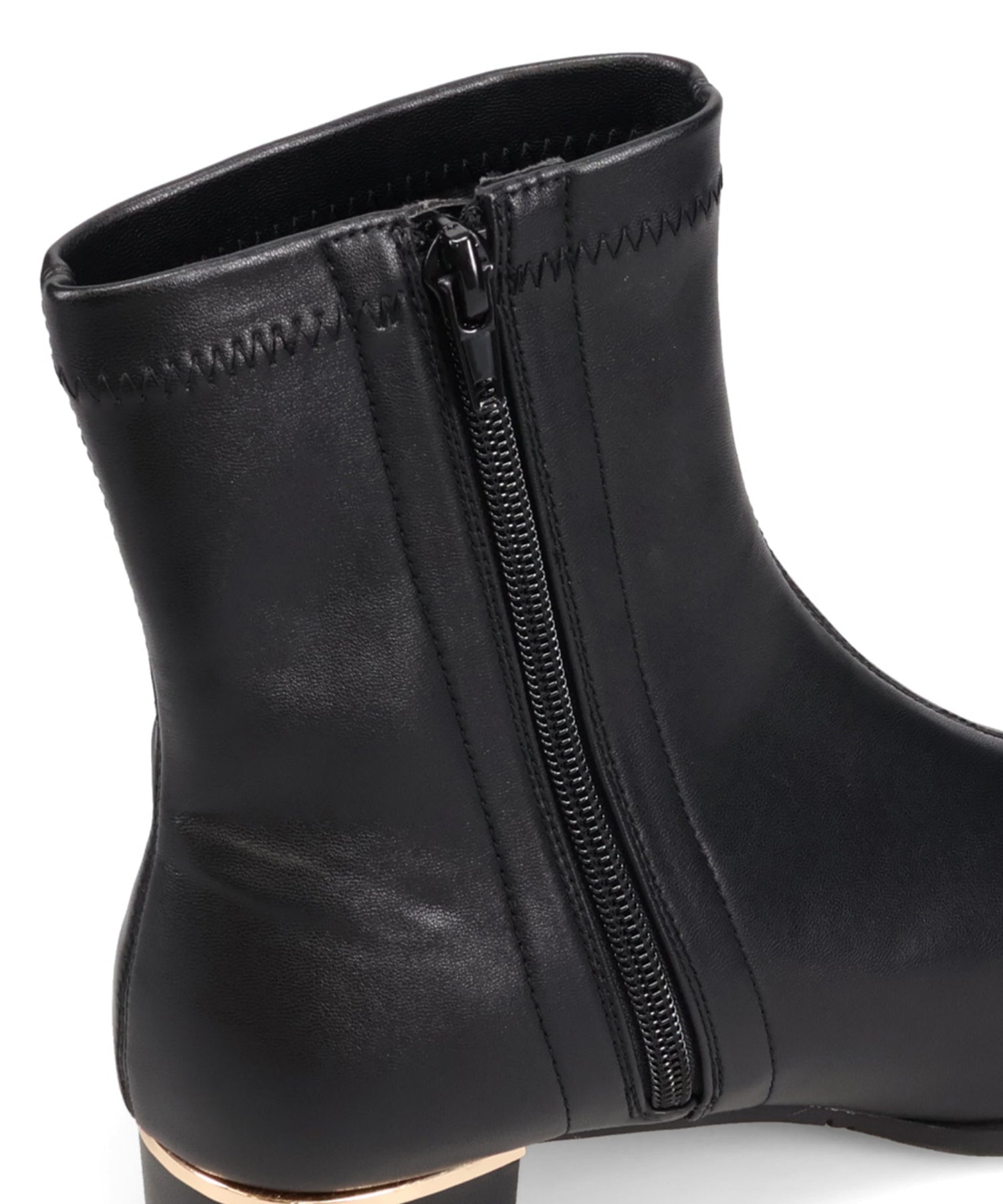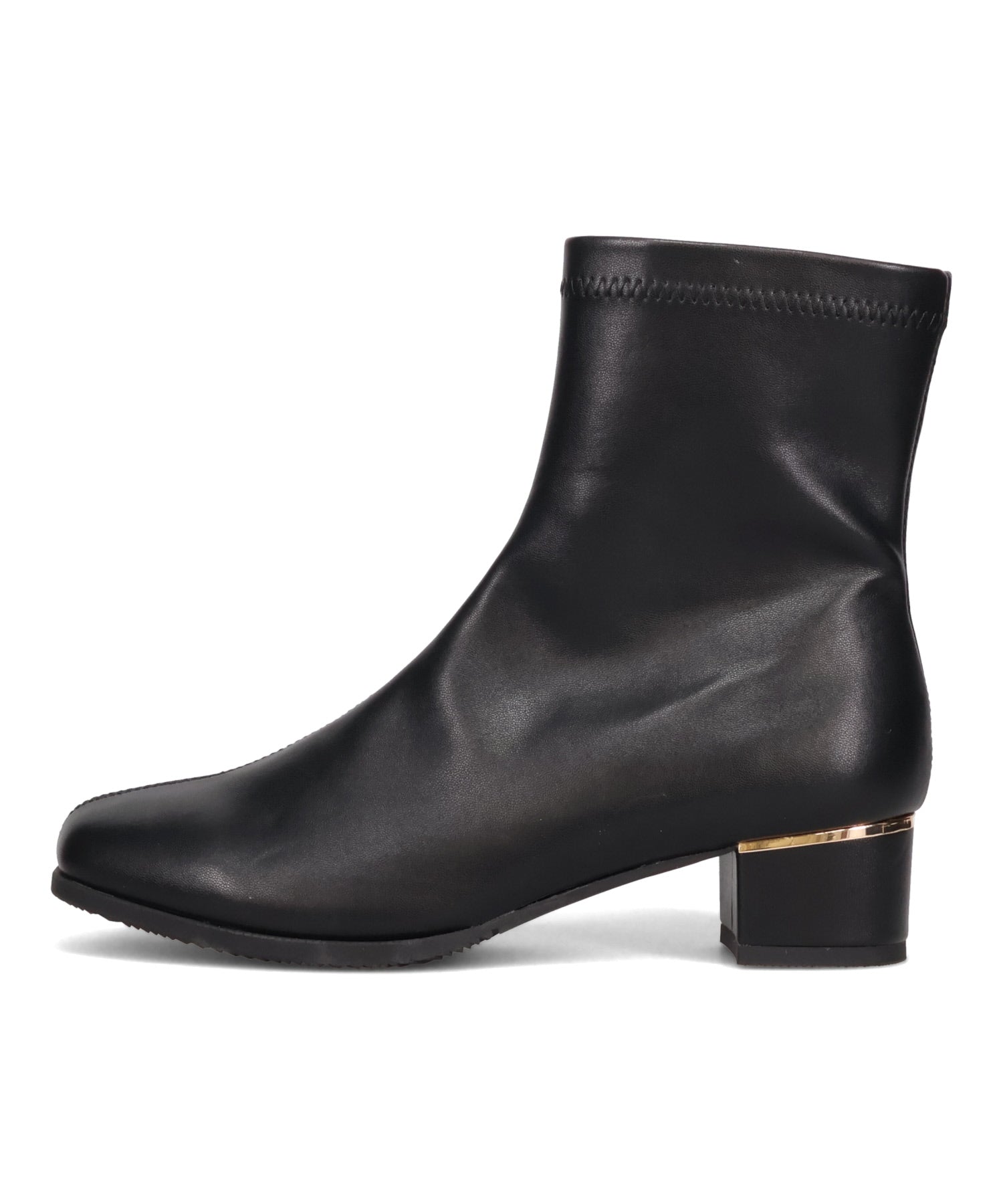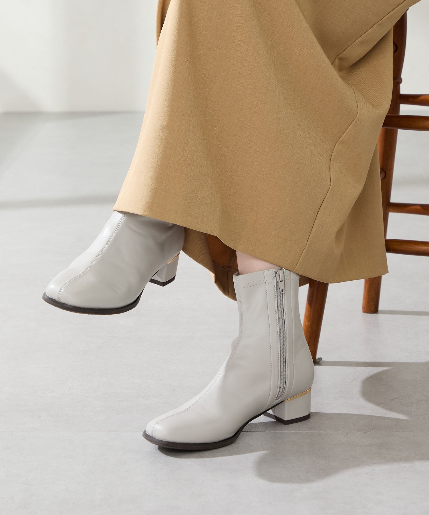 アッパー全体にストレッチの効いた素材を使用したブーツは、凹凸を付けたクッション入りのインソールで履き心地にとことんこだわった1足。低めのヒールにはゴールドのメタリックラインを施し、さりげない上品さをオン。縦のラインを強調するセンターシームのデザインに、足に沿うタイトめなシルエットで足元をすっきり見せながら、履くだけでスタイリングを引き締めてくれる。