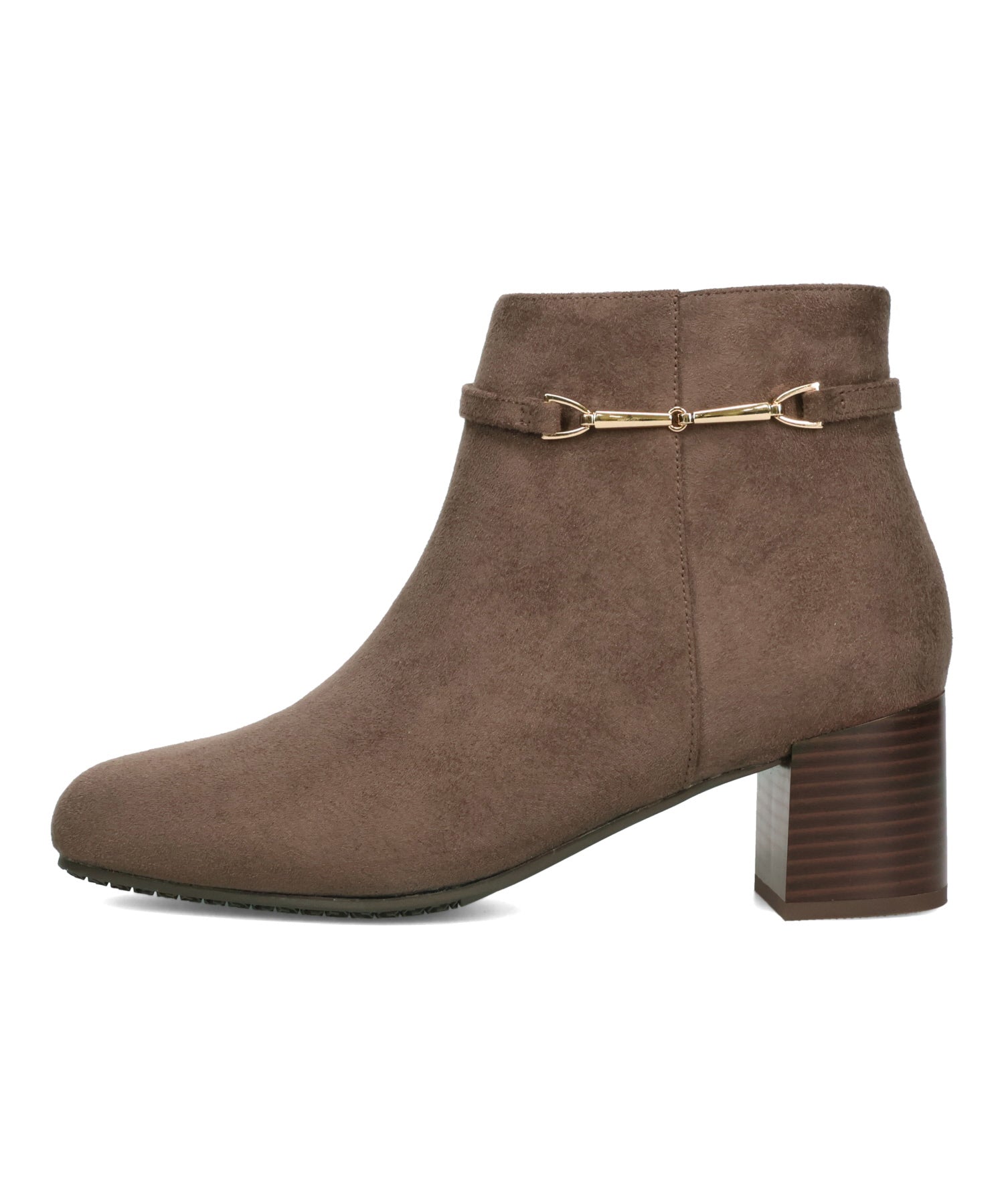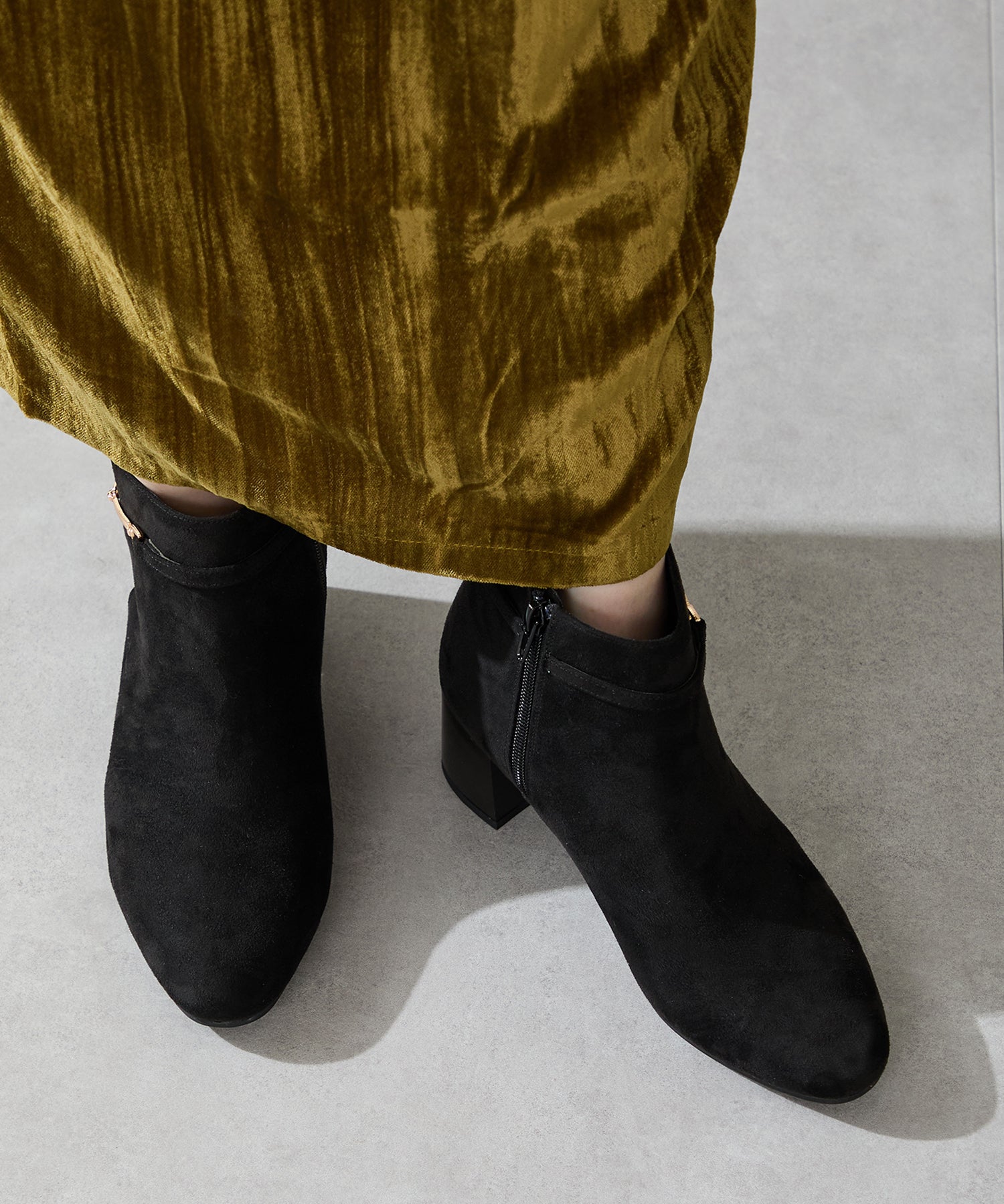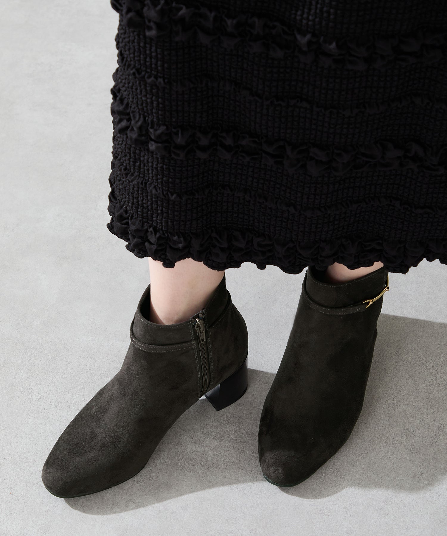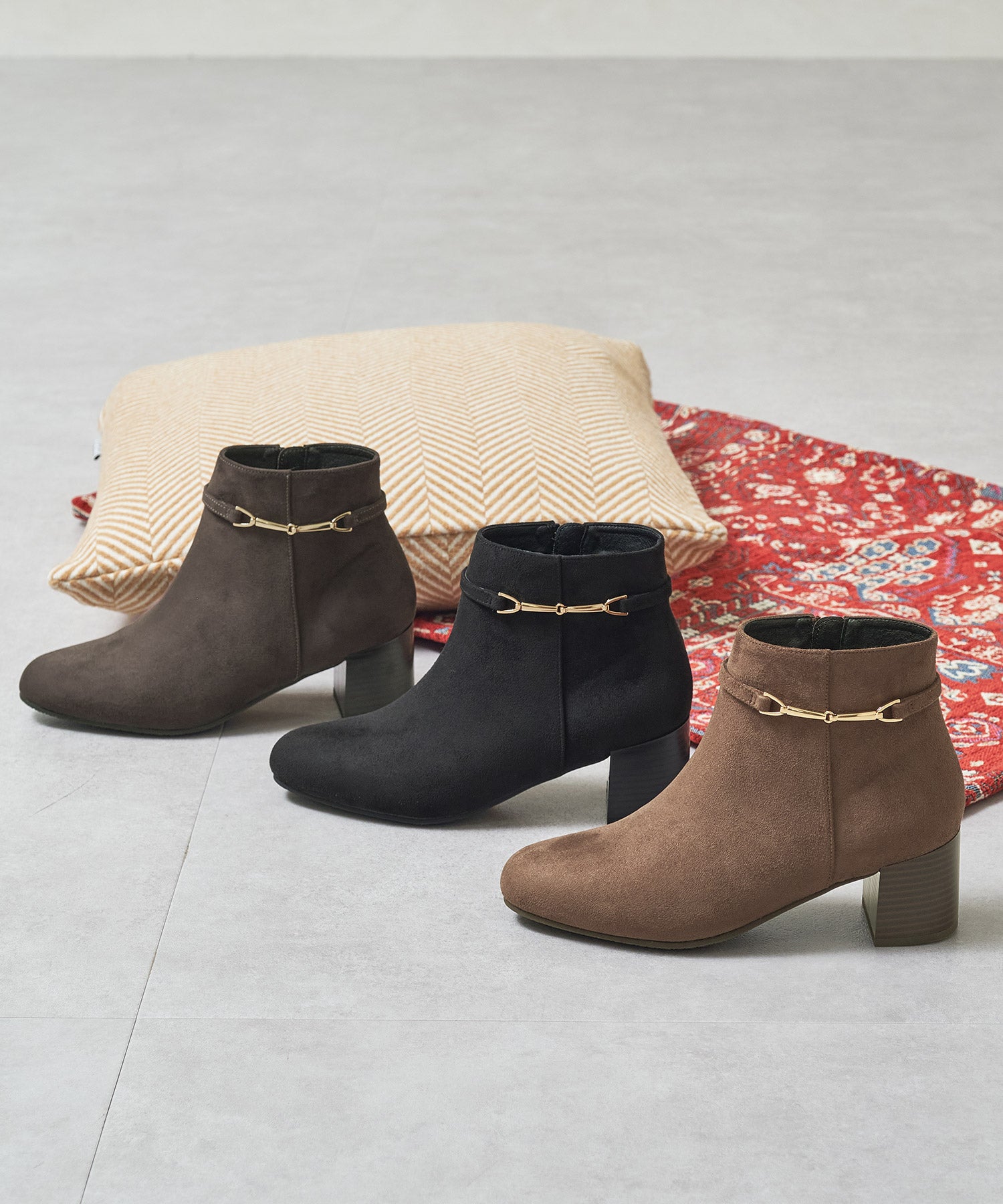 すっきりとした細身のシルエットに、ゴールドの華奢なビットモチーフをあしらったレディライクなショートブーツ。中敷には起毛のナイロン素材を使用することで、足当たりがソフトな優しい履き心地に。シーズンムード高まる暖かみのあるスエード素材で足馴染みが良く、足首が隠れる短めの丈感で、ボトムスを選ばないデイリーに使える1足。