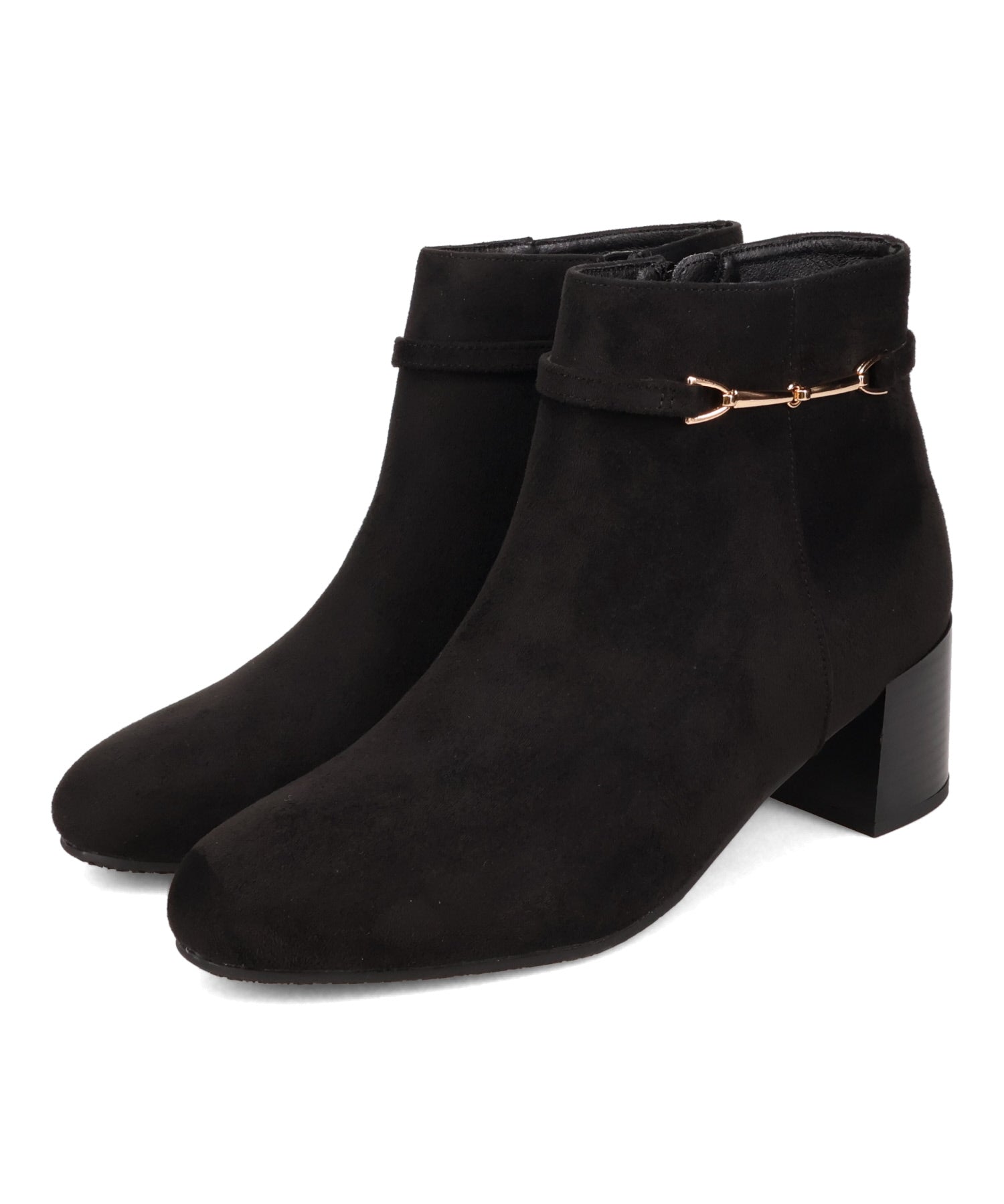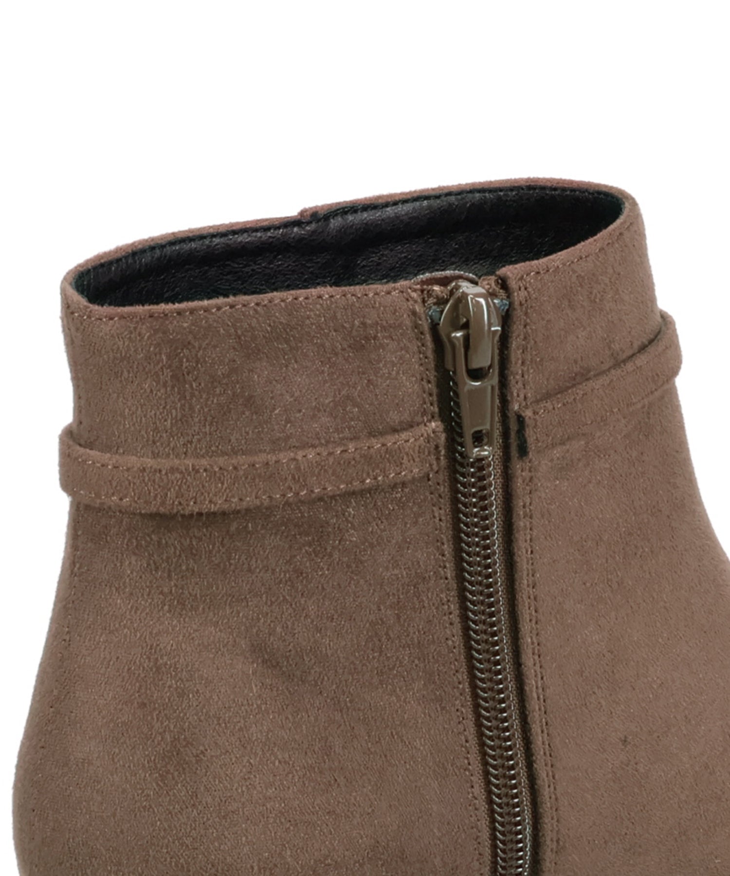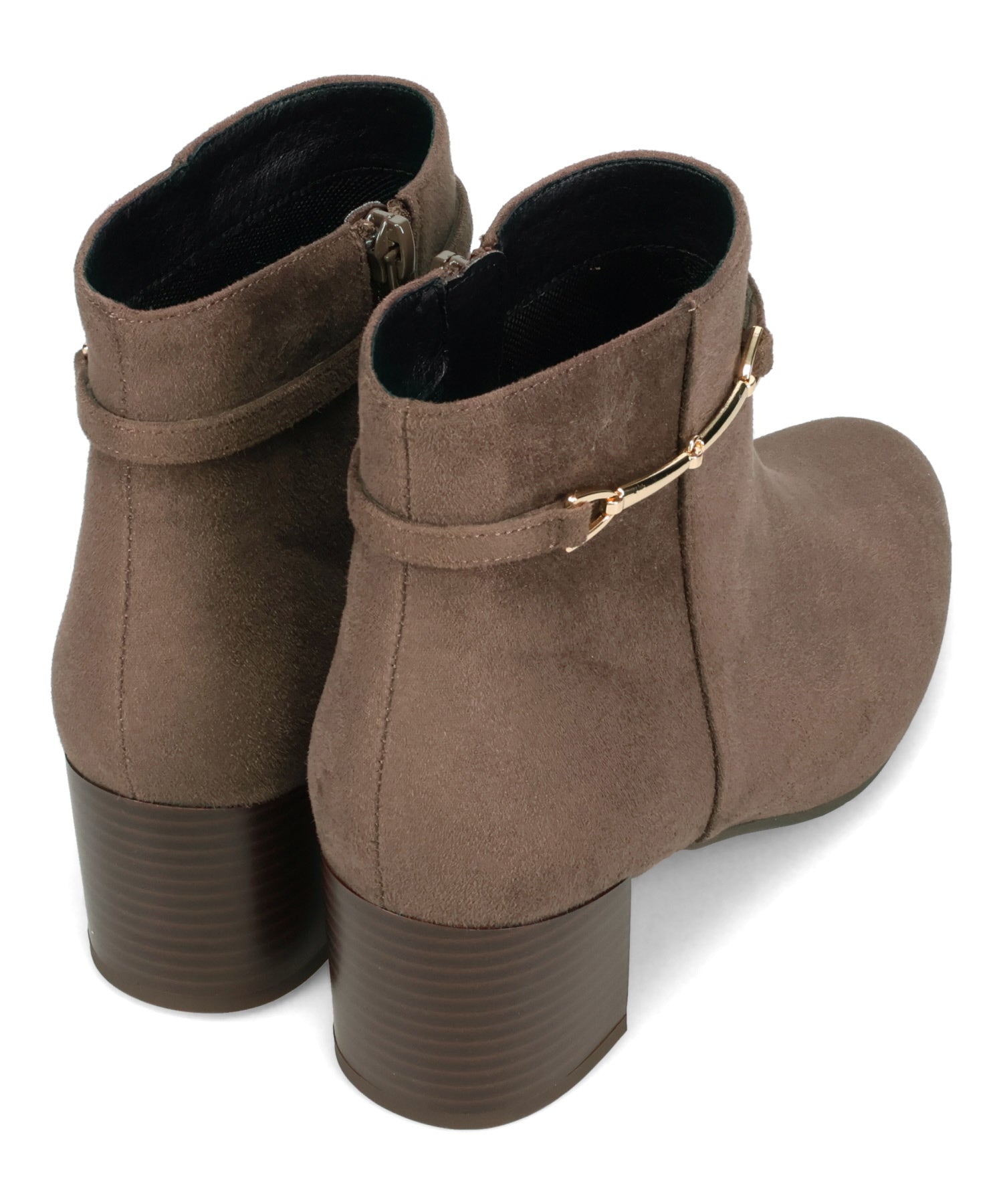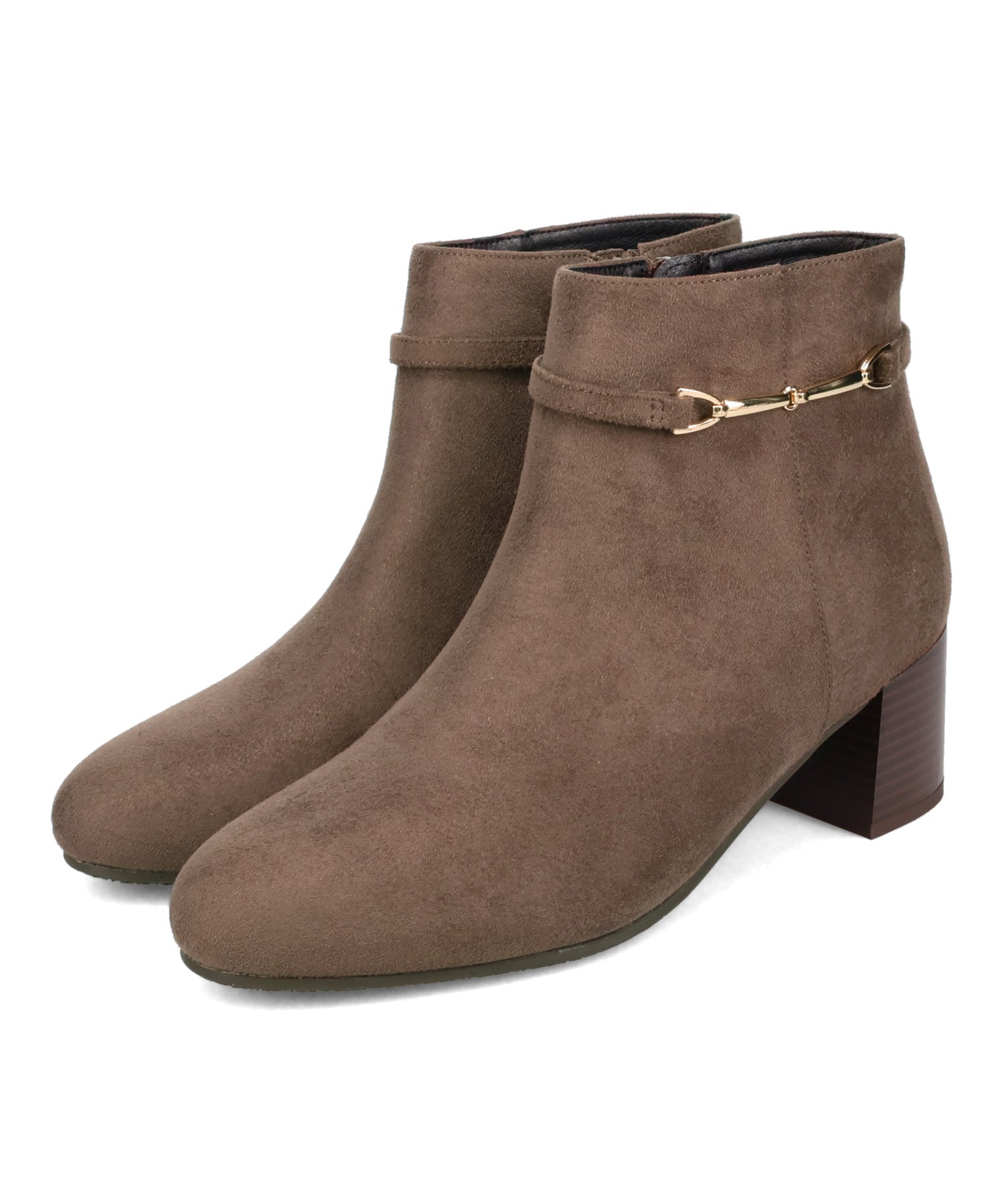 すっきりとした細身のシルエットに、ゴールドの華奢なビットモチーフをあしらったレディライクなショートブーツ。中敷には起毛のナイロン素材を使用することで、足当たりがソフトな優しい履き心地に。シーズンムード高まる暖かみのあるスエード素材で足馴染みが良く、足首が隠れる短めの丈感で、ボトムスを選ばないデイリーに使える1足。