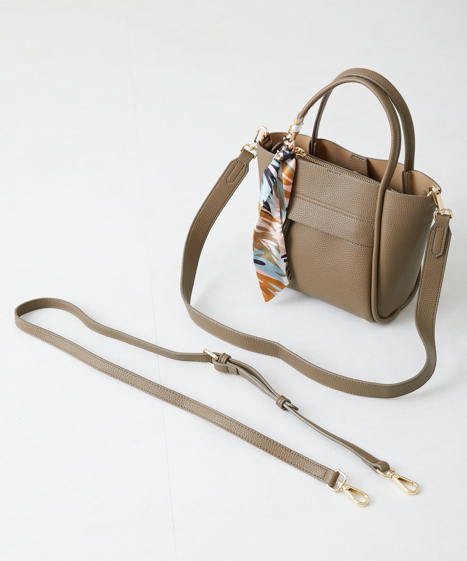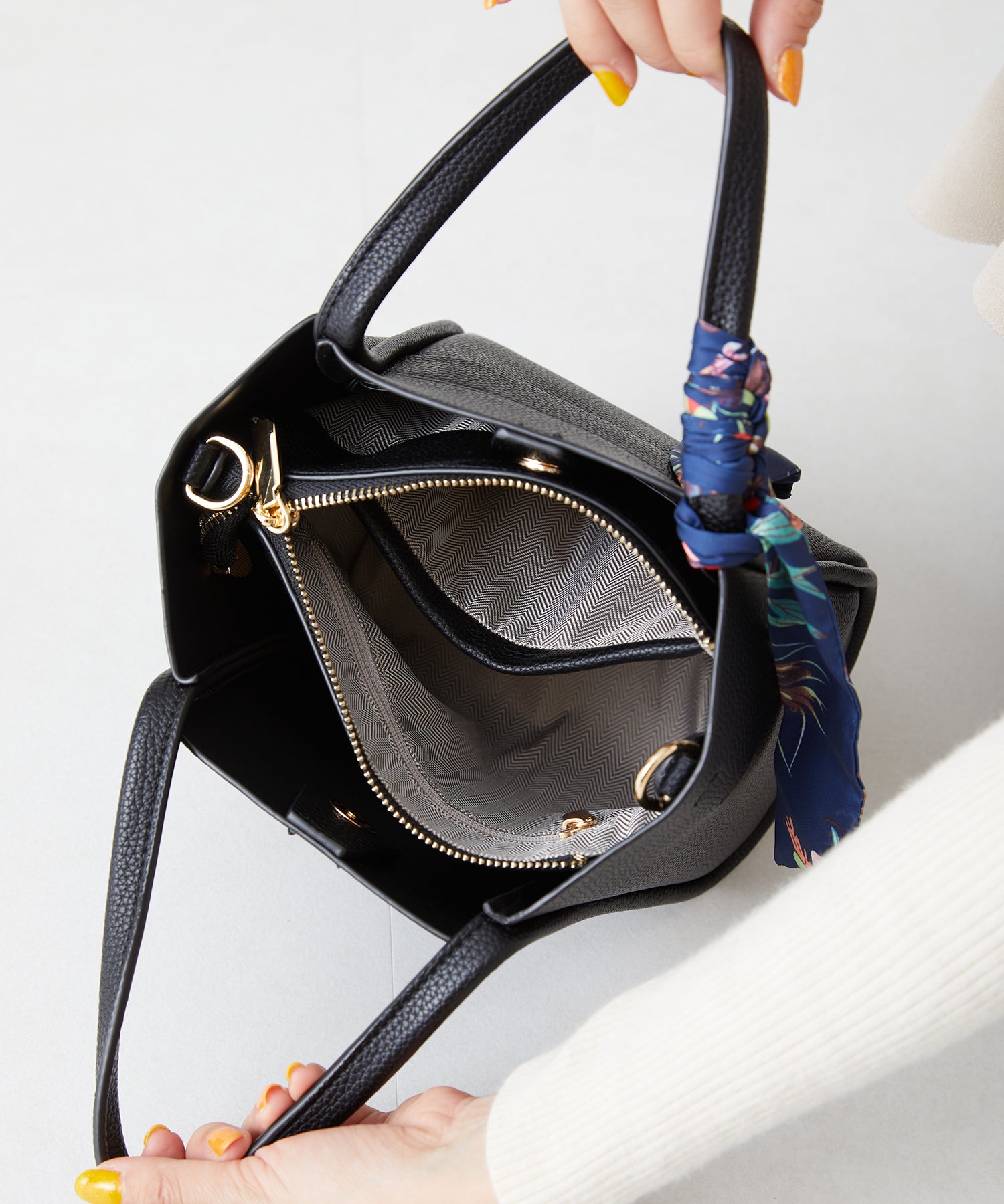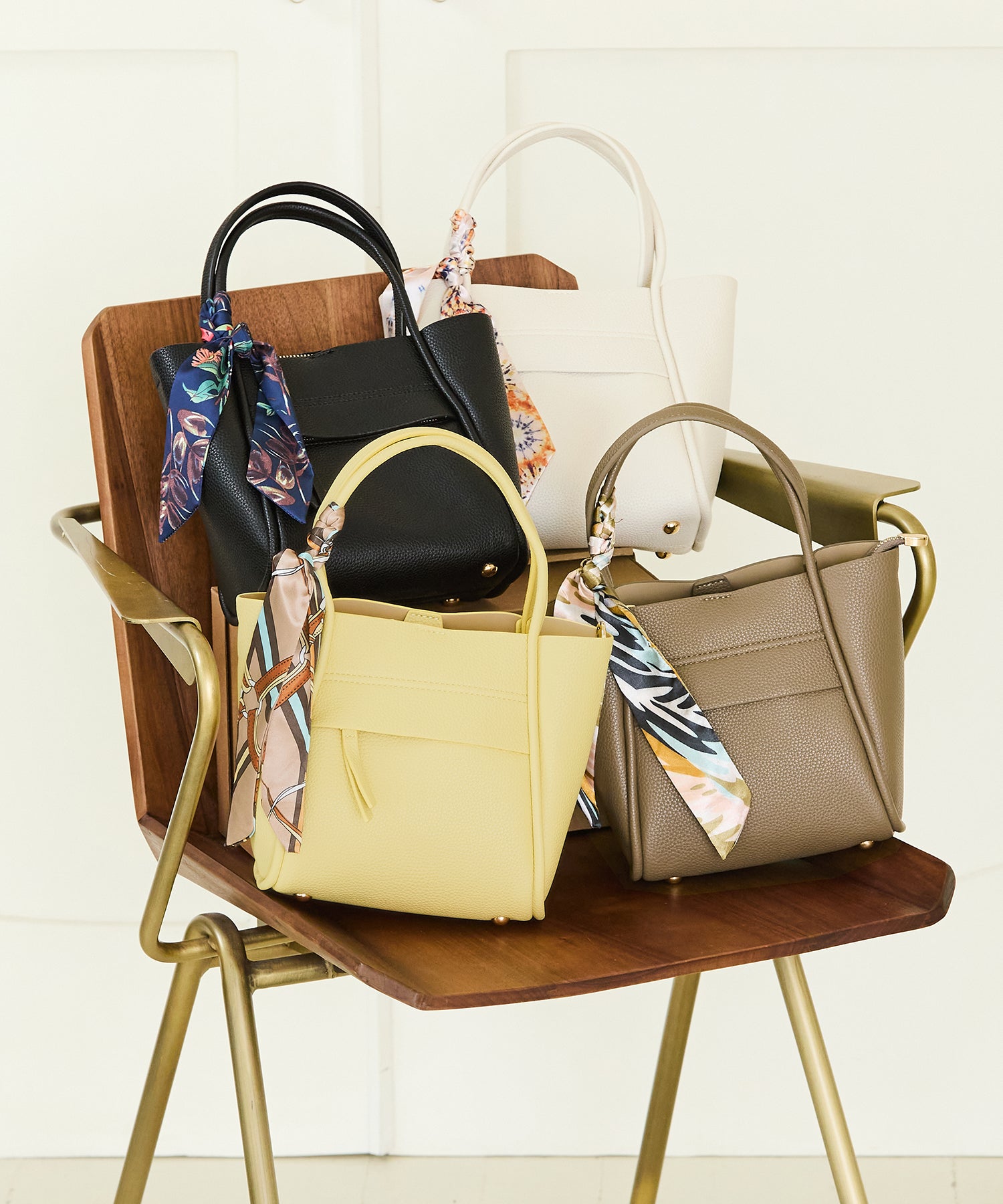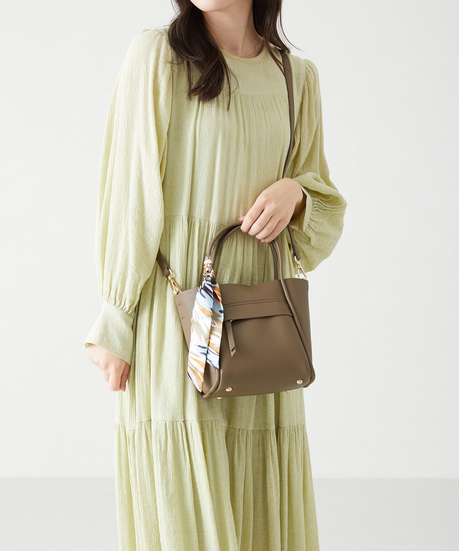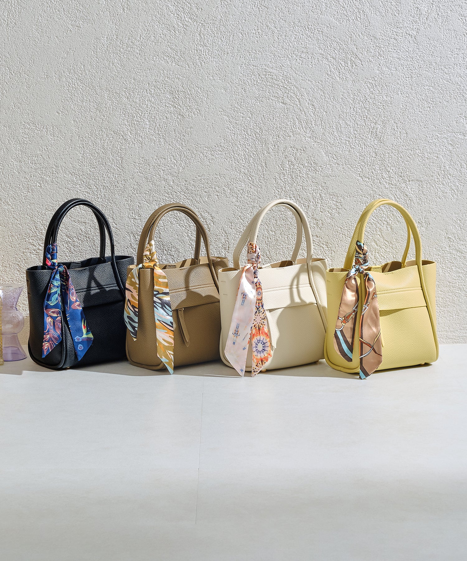 ハンドルに施したスカーフが上品な印象に格上げするハンドバッグ。コンパクトなサイズ感ながらもマチが広めなので見た目以上にしっかり荷物が入れられるのも魅力的。バッグインバッグは取り外しも可能なので、入れる物に合わせて調整もできる。太さの異なる2種類のショルダーストラップ付きで何通りも楽しめる優れもの。