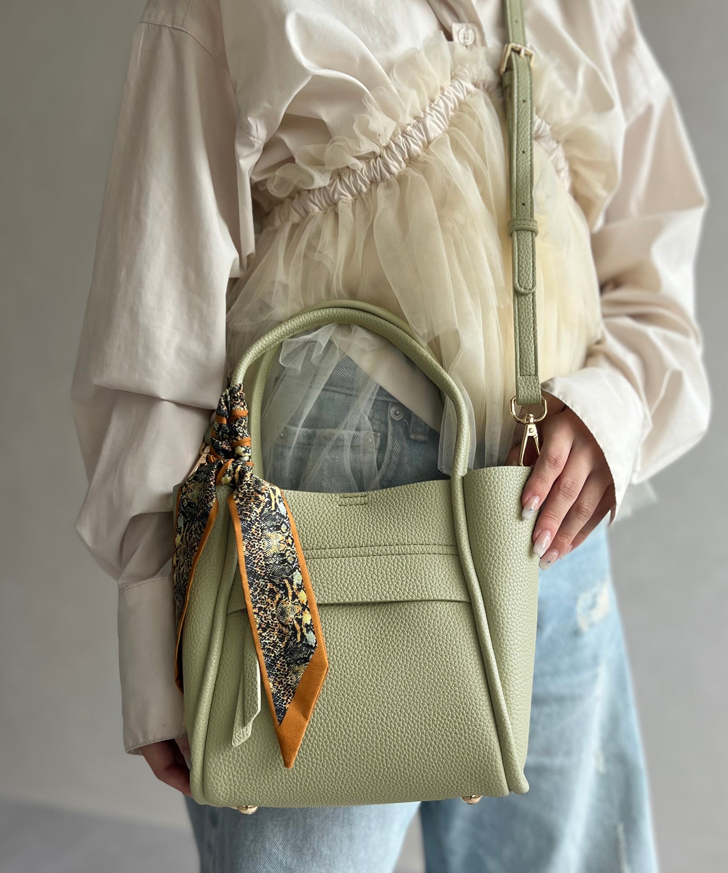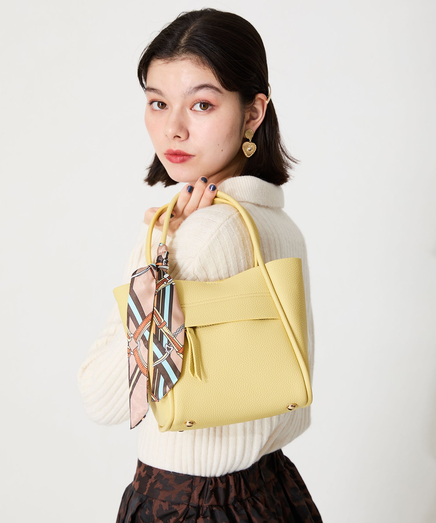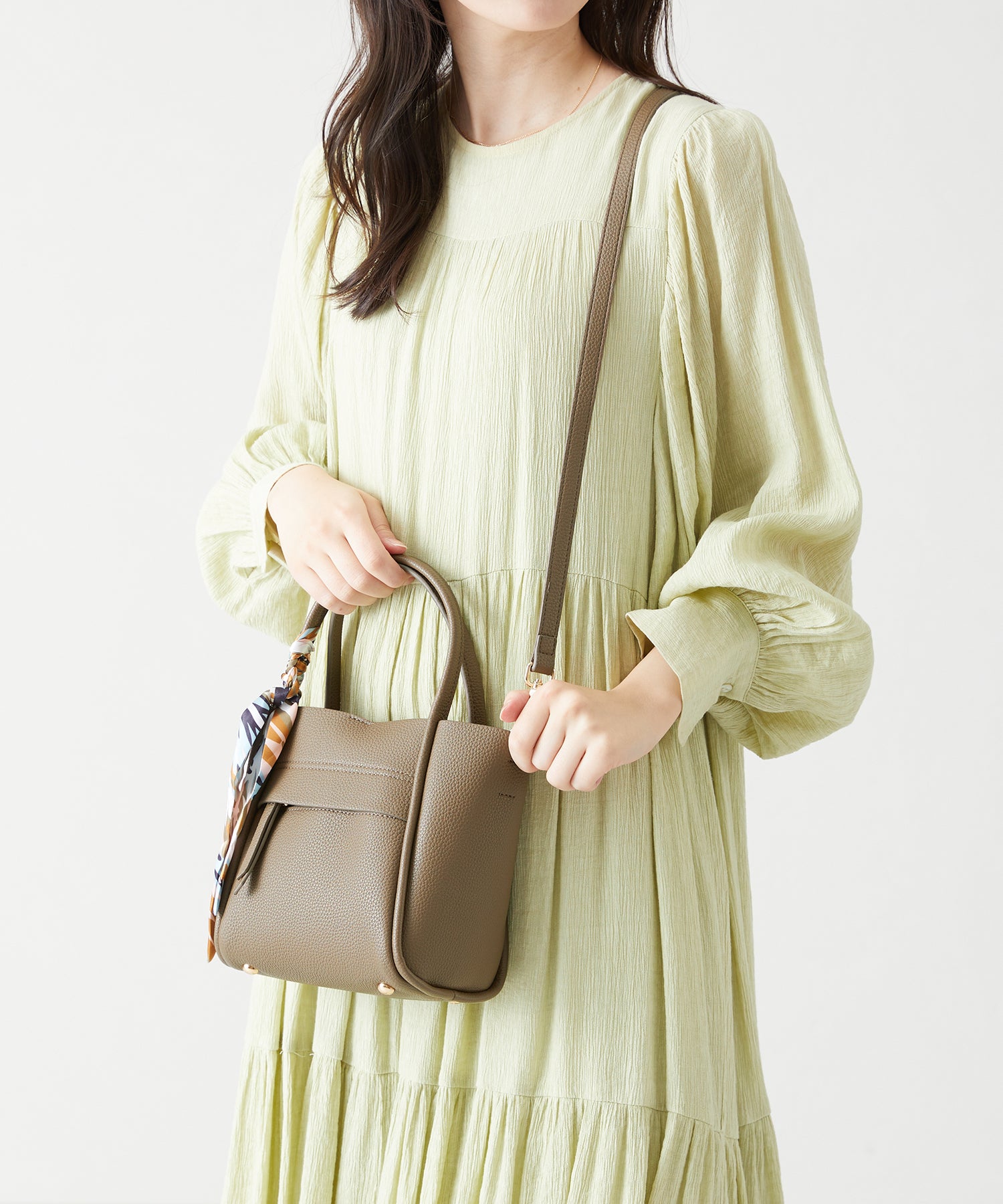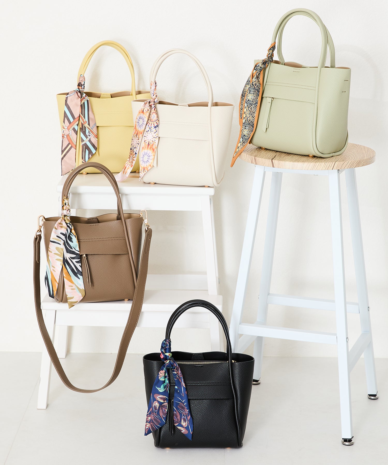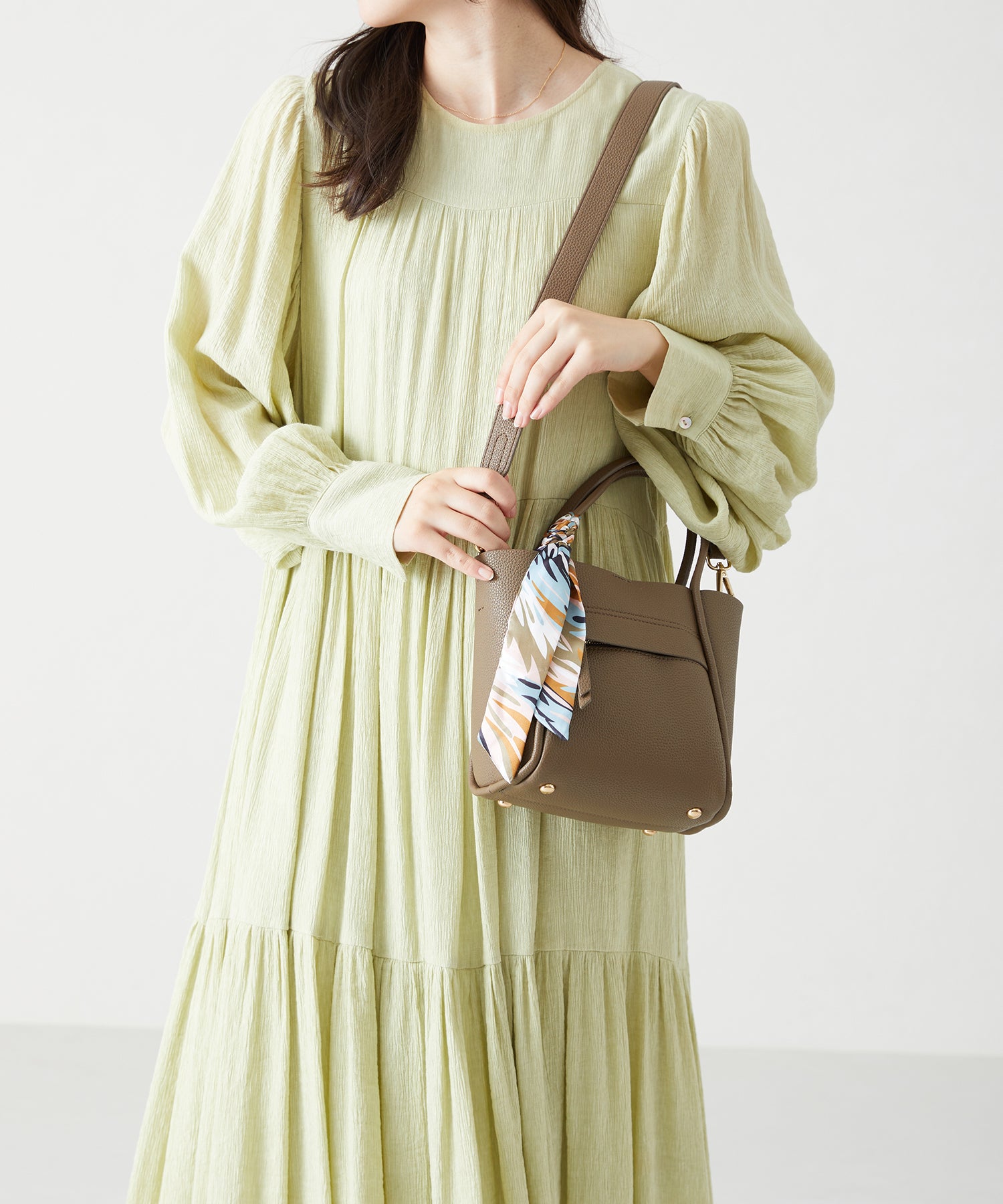 ハンドルに施したスカーフが上品な印象に格上げするハンドバッグ。コンパクトなサイズ感ながらもマチが広めなので見た目以上にしっかり荷物が入れられるのも魅力的。バッグインバッグは取り外しも可能なので、入れる物に合わせて調整もできる。太さの異なる2種類のショルダーストラップ付きで何通りも楽しめる優れもの。