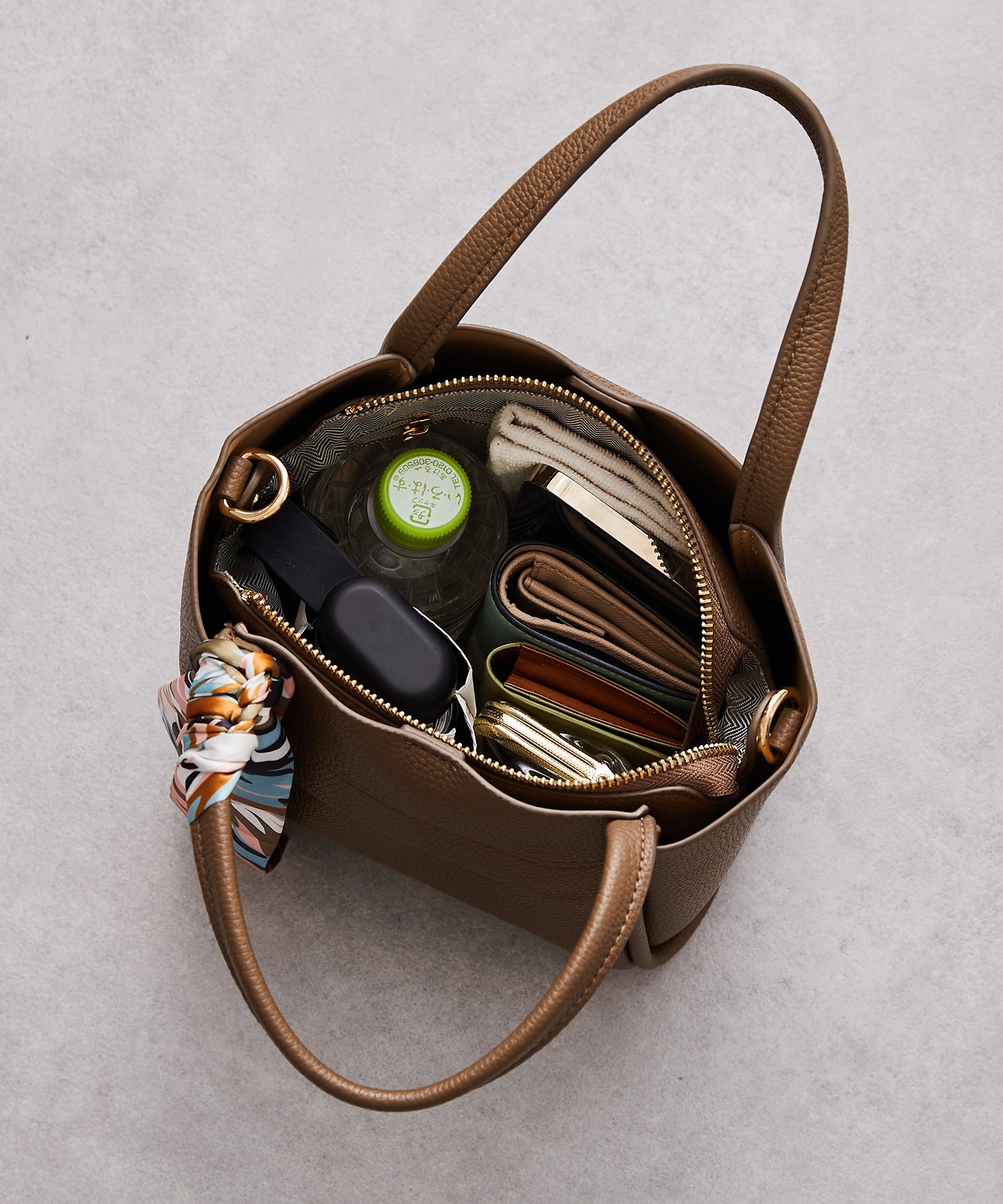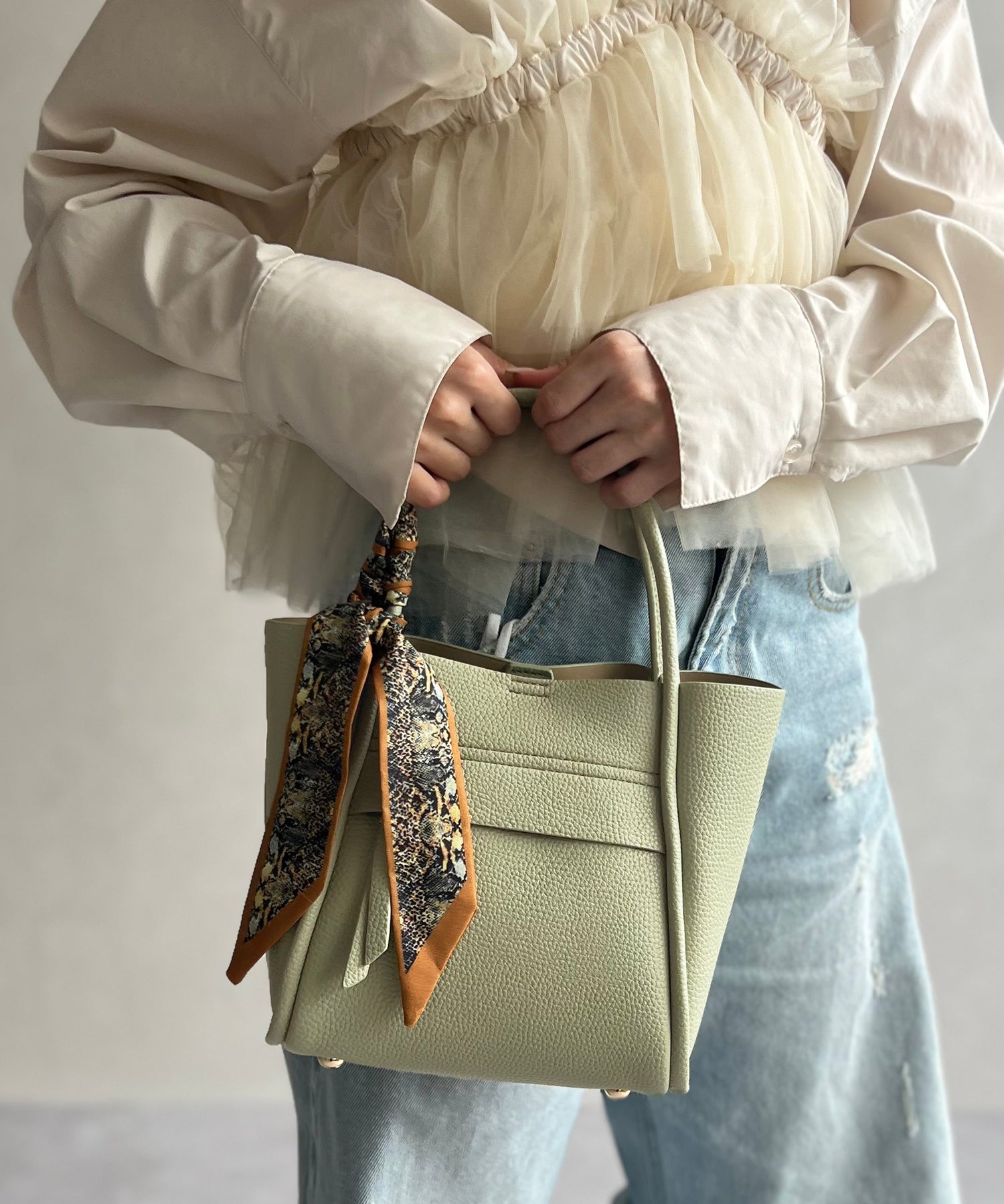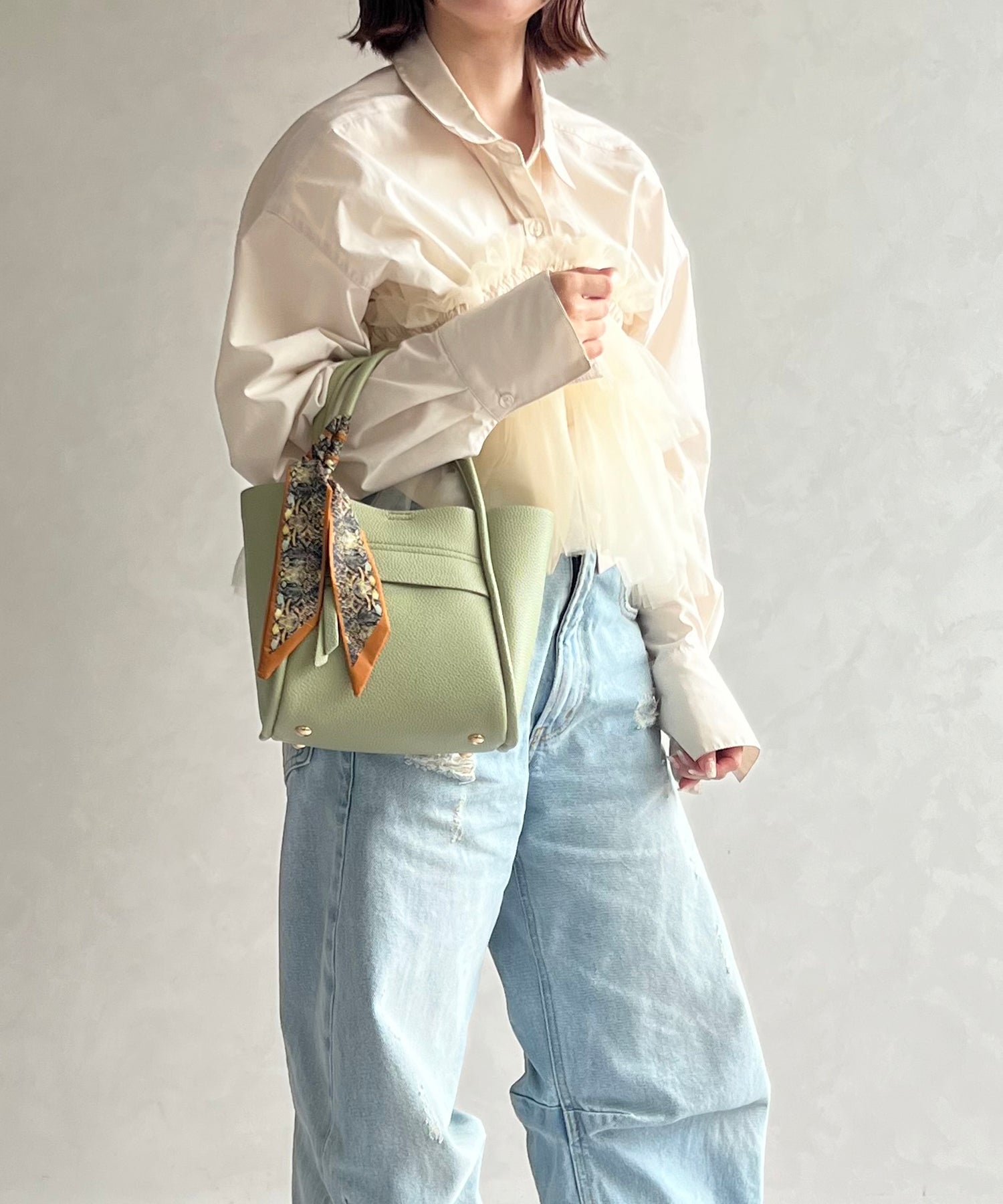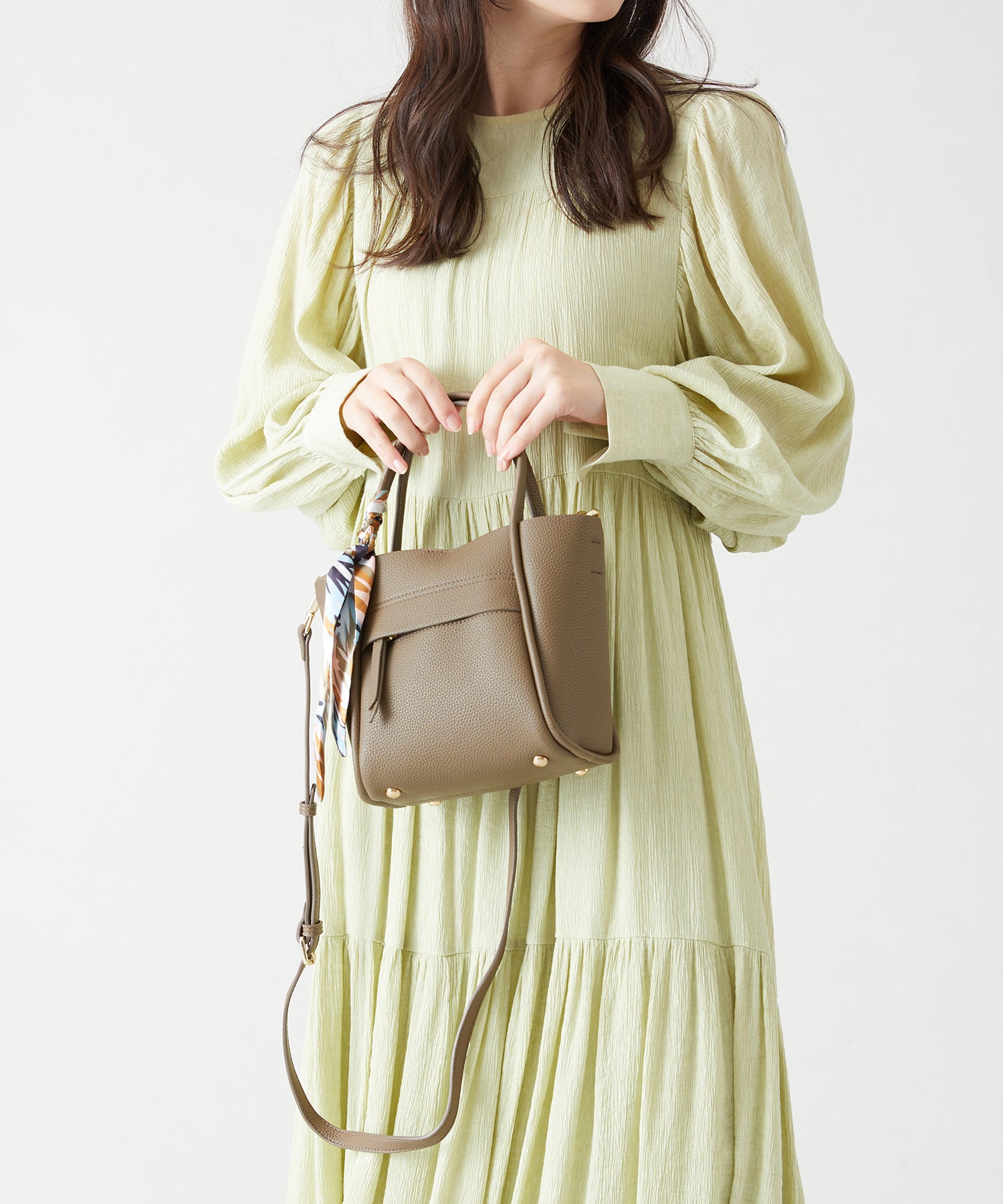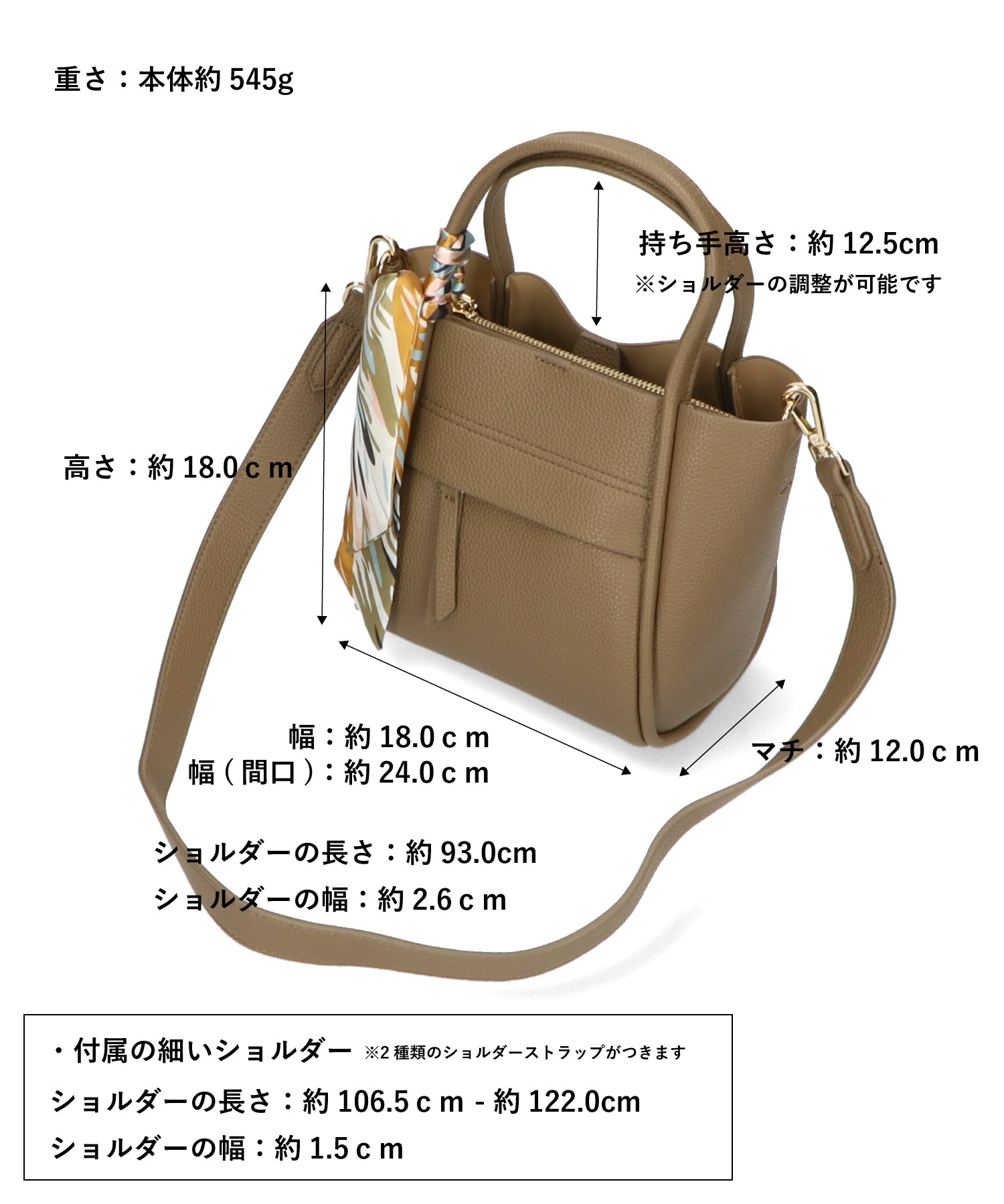 ハンドルに施したスカーフが上品な印象に格上げするハンドバッグ。コンパクトなサイズ感ながらもマチが広めなので見た目以上にしっかり荷物が入れられるのも魅力的。バッグインバッグは取り外しも可能なので、入れる物に合わせて調整もできる。太さの異なる2種類のショルダーストラップ付きで何通りも楽しめる優れもの。