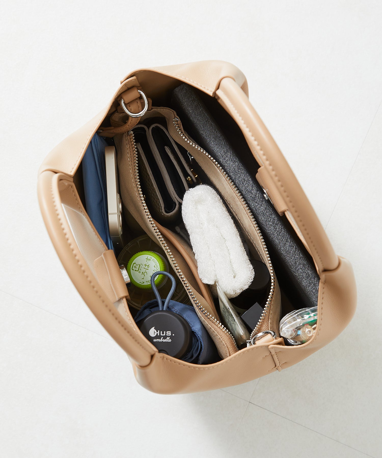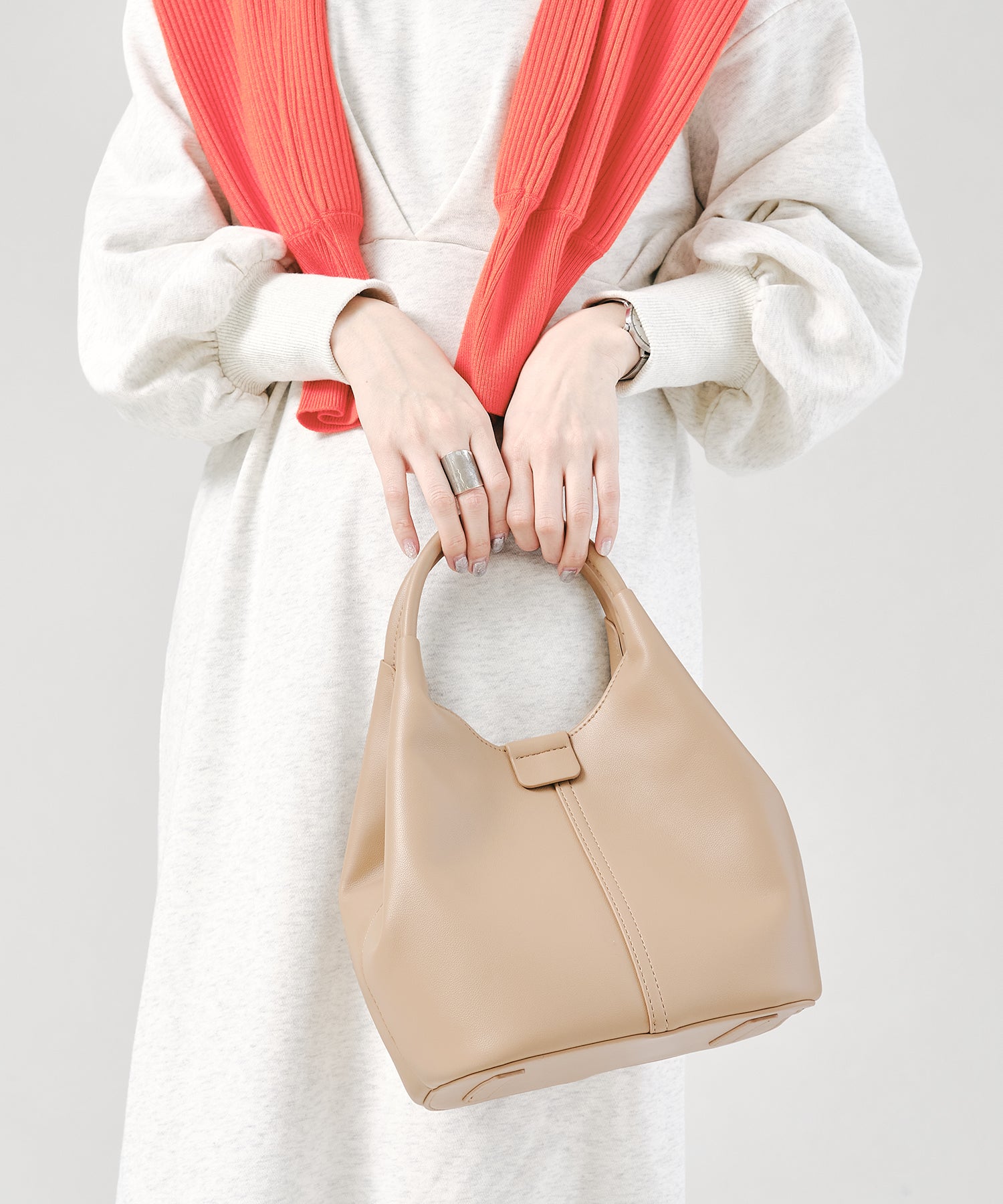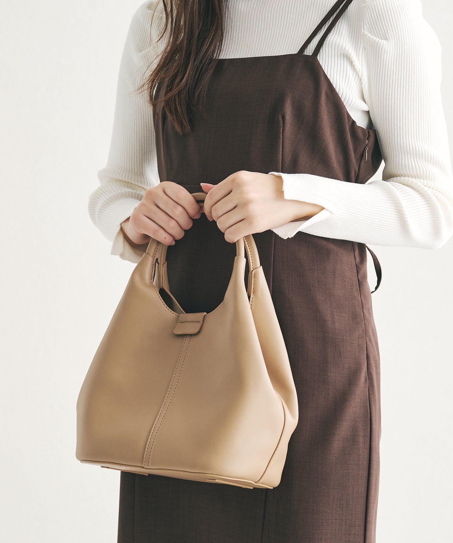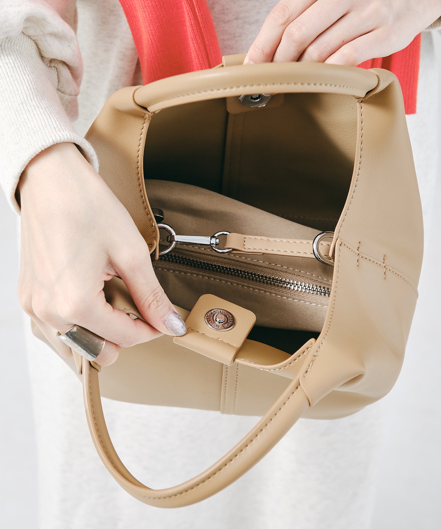 シンプルなディテールでカジュアルからフェミニンなど、スタイリングを選ばず使えるラウンドバッグ。間口をラウンドに仕上げることで腕を通しやすく、柔らかで女性らしい印象をプラスしてくれる。付属のストラップ付きでショルダータイプにもなり、インバッグも取り外しができる仕様で用途に合わせて使えるのもポイント。