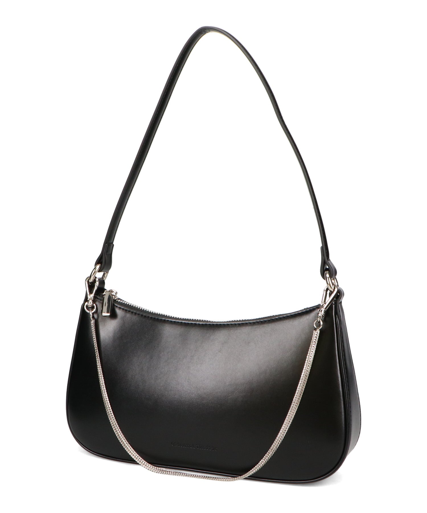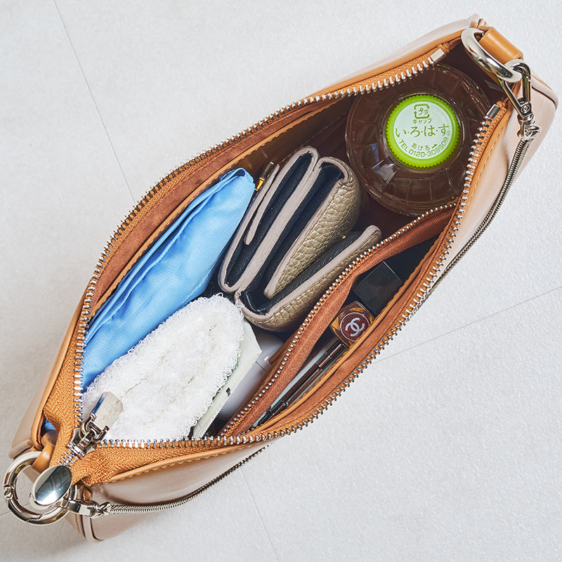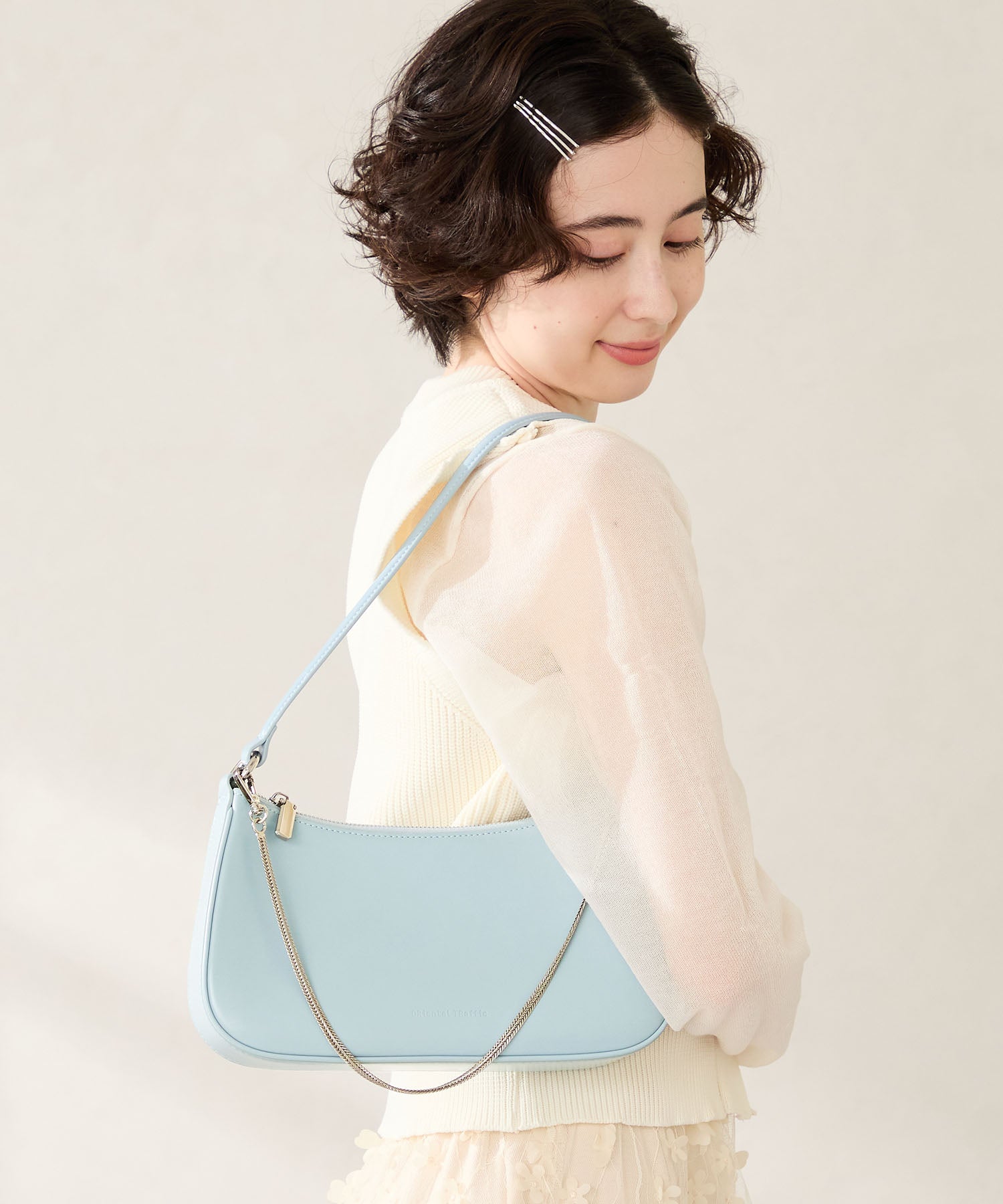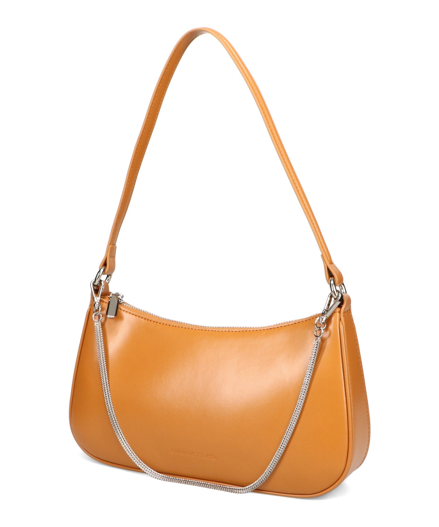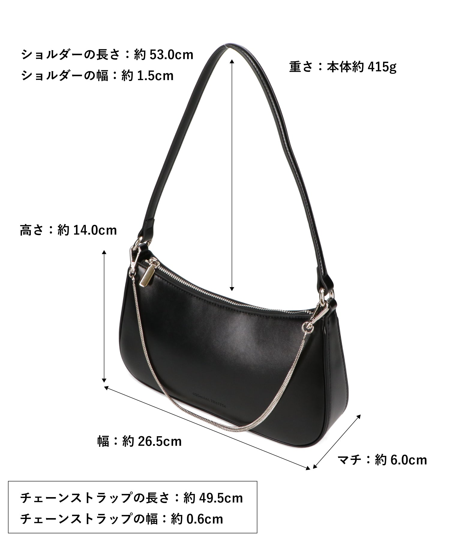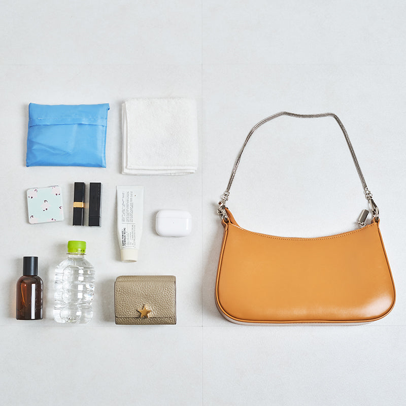 トレンドのハーフムーン型がシンプルながらも目を引くお洒落なバッグ。持ち手のストラップを合皮素材、チェーンと2種類付けているので日によってテイストを変えられるのがポイント。マチが6cmと薄めながらも横向きで500mlのペットボトルが入る収納力。きちんと見えするかっちりとした合皮素材を使用しているのでオケージョンシーンにもぴったり。