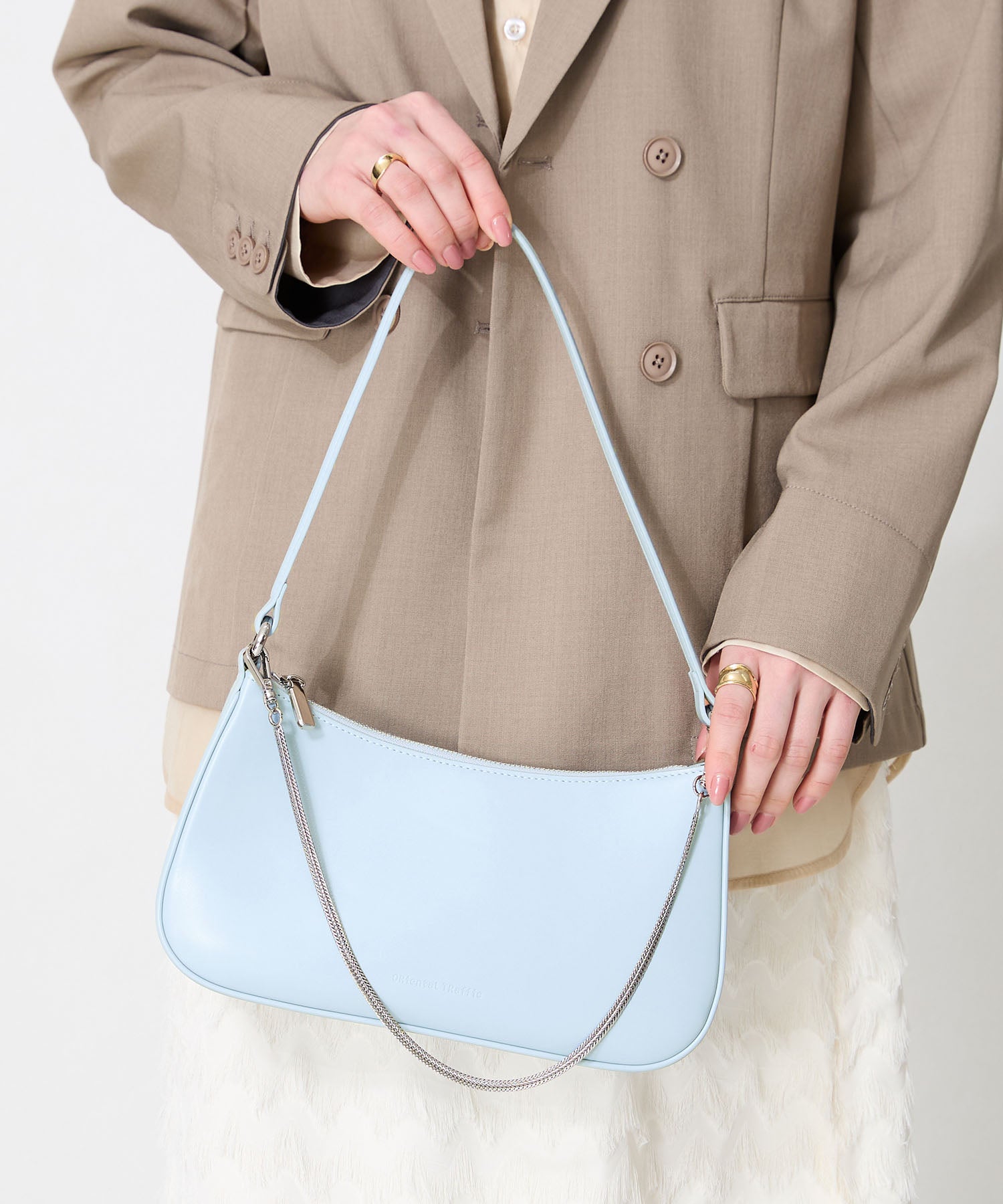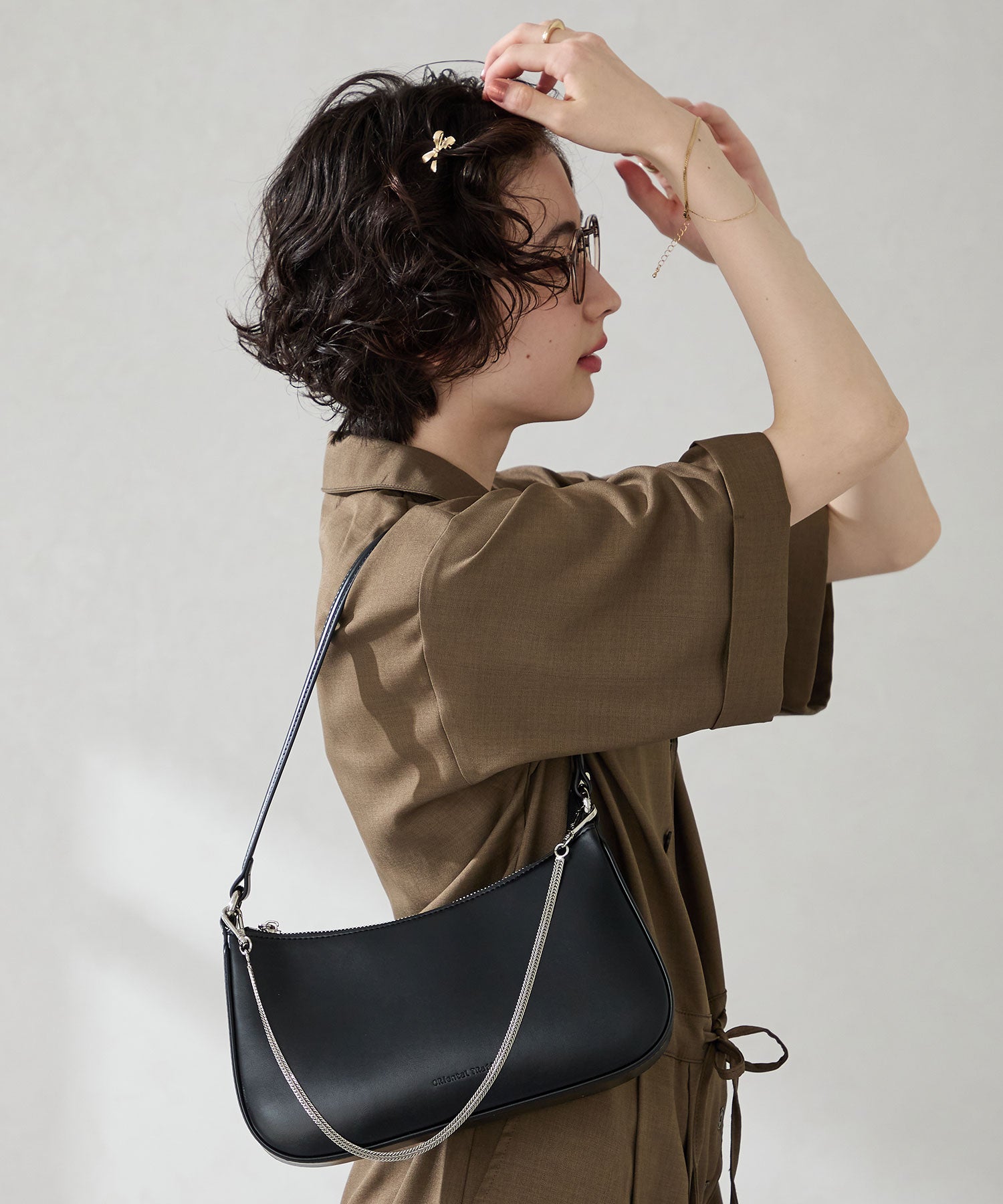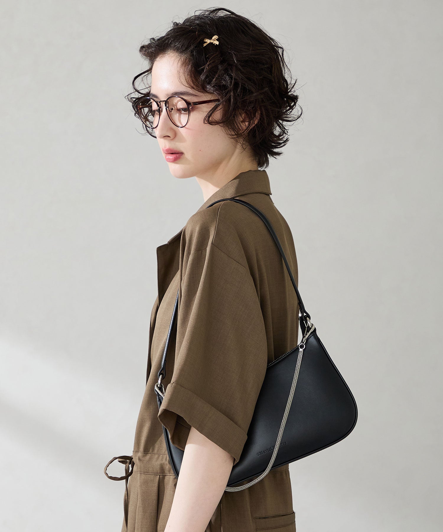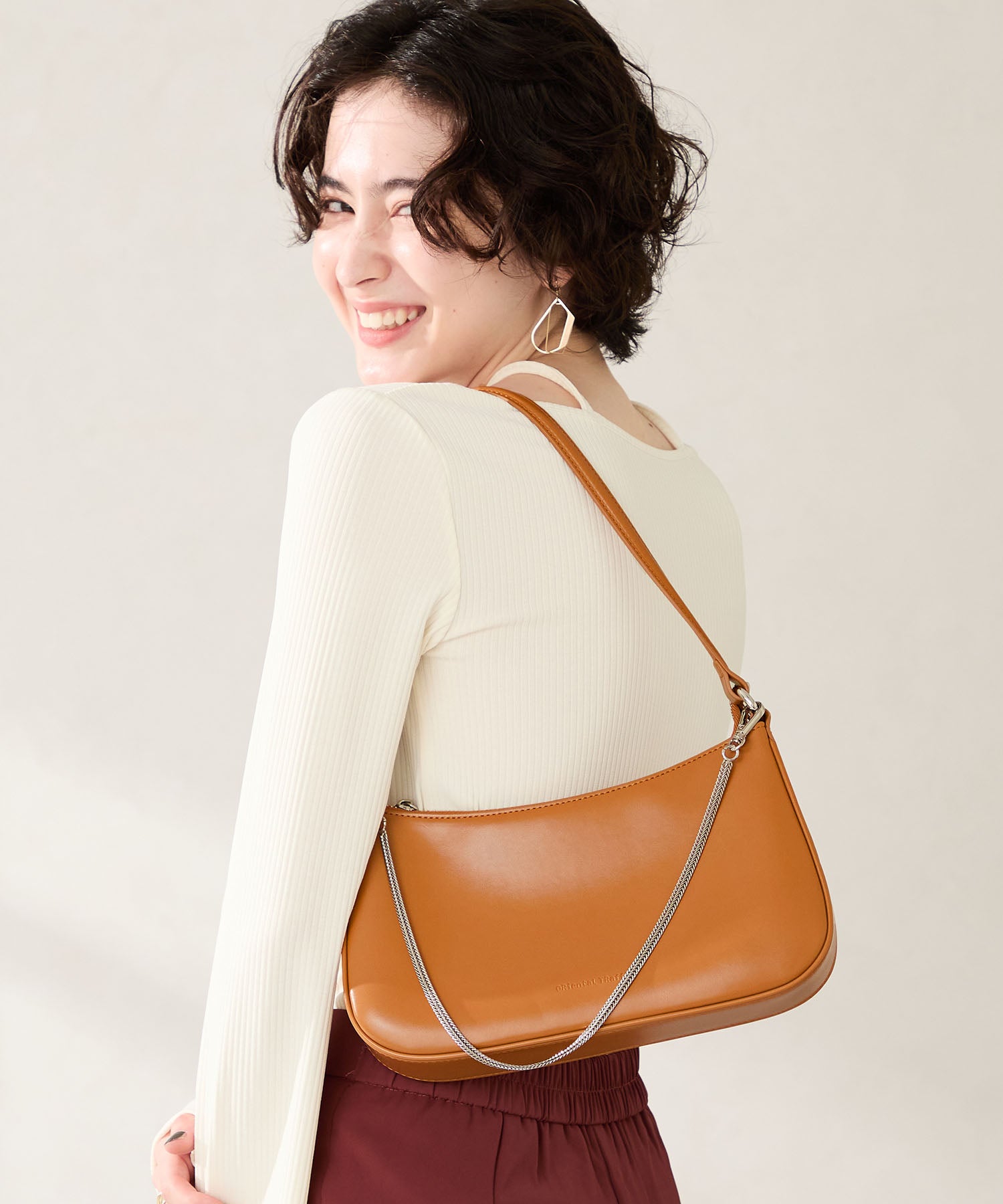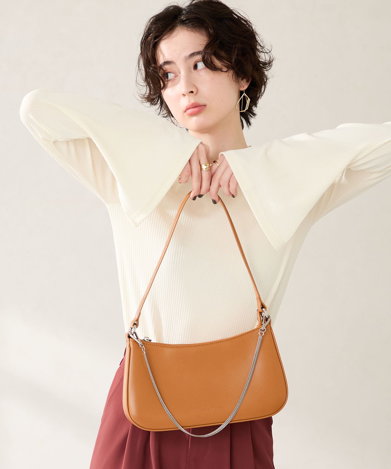 トレンドのハーフムーン型がシンプルながらも目を引くお洒落なバッグ。持ち手のストラップを合皮素材、チェーンと2種類付けているので日によってテイストを変えられるのがポイント。マチが6cmと薄めながらも横向きで500mlのペットボトルが入る収納力。きちんと見えするかっちりとした合皮素材を使用しているのでオケージョンシーンにもぴったり。