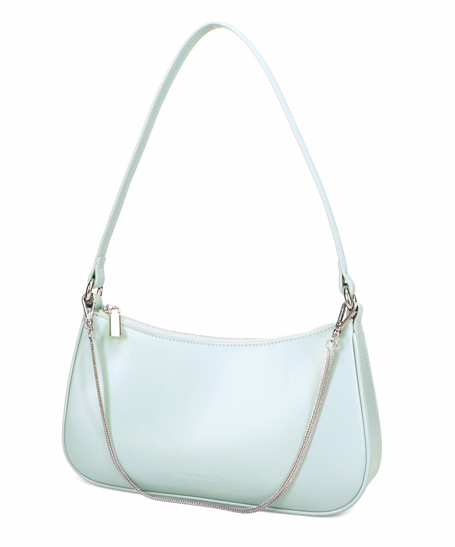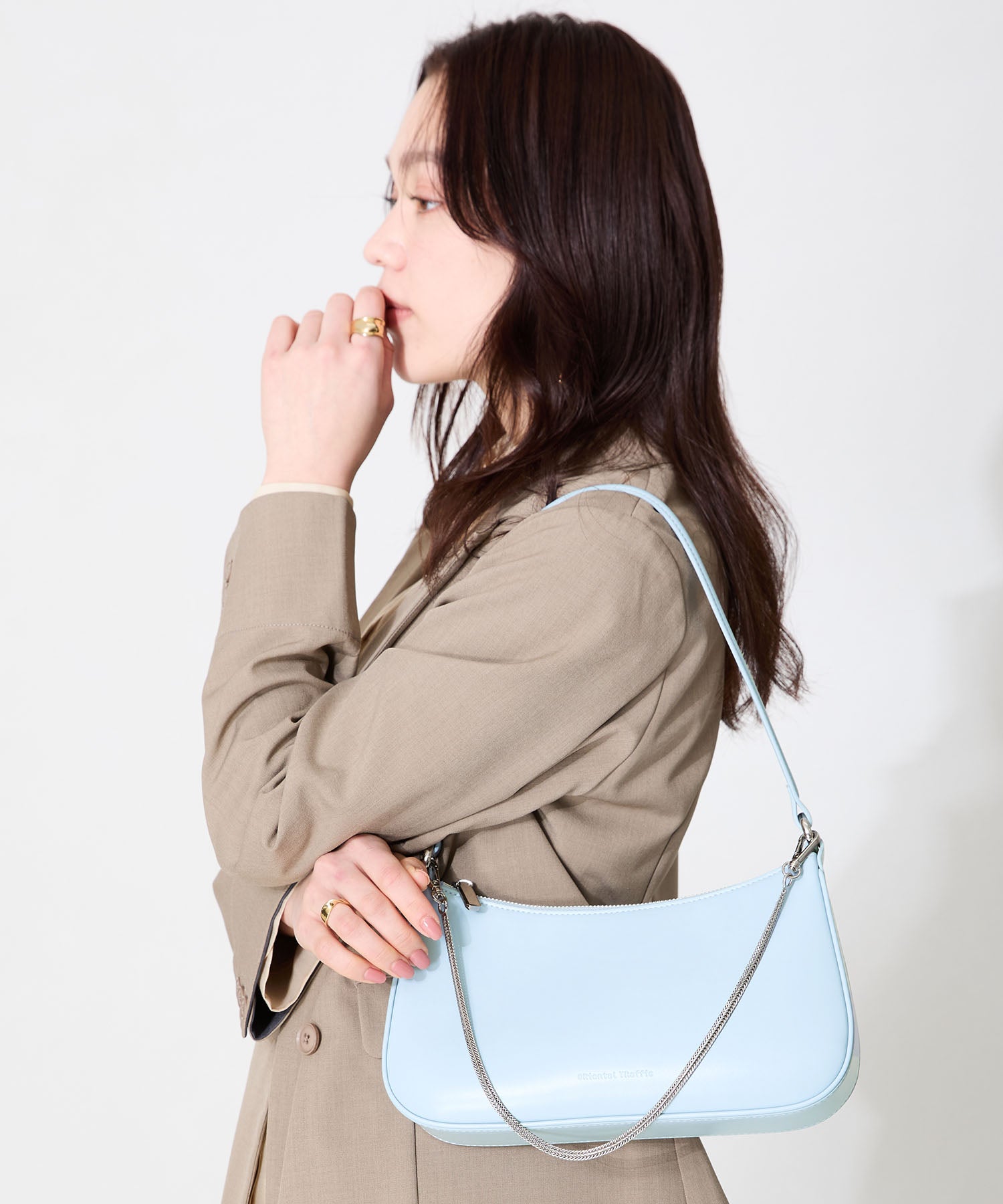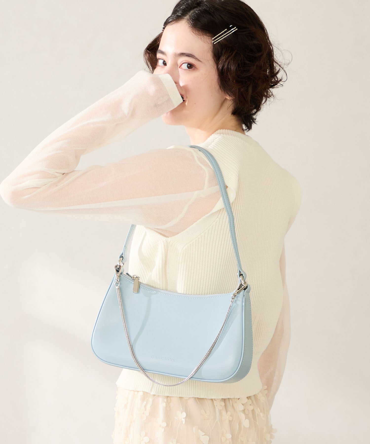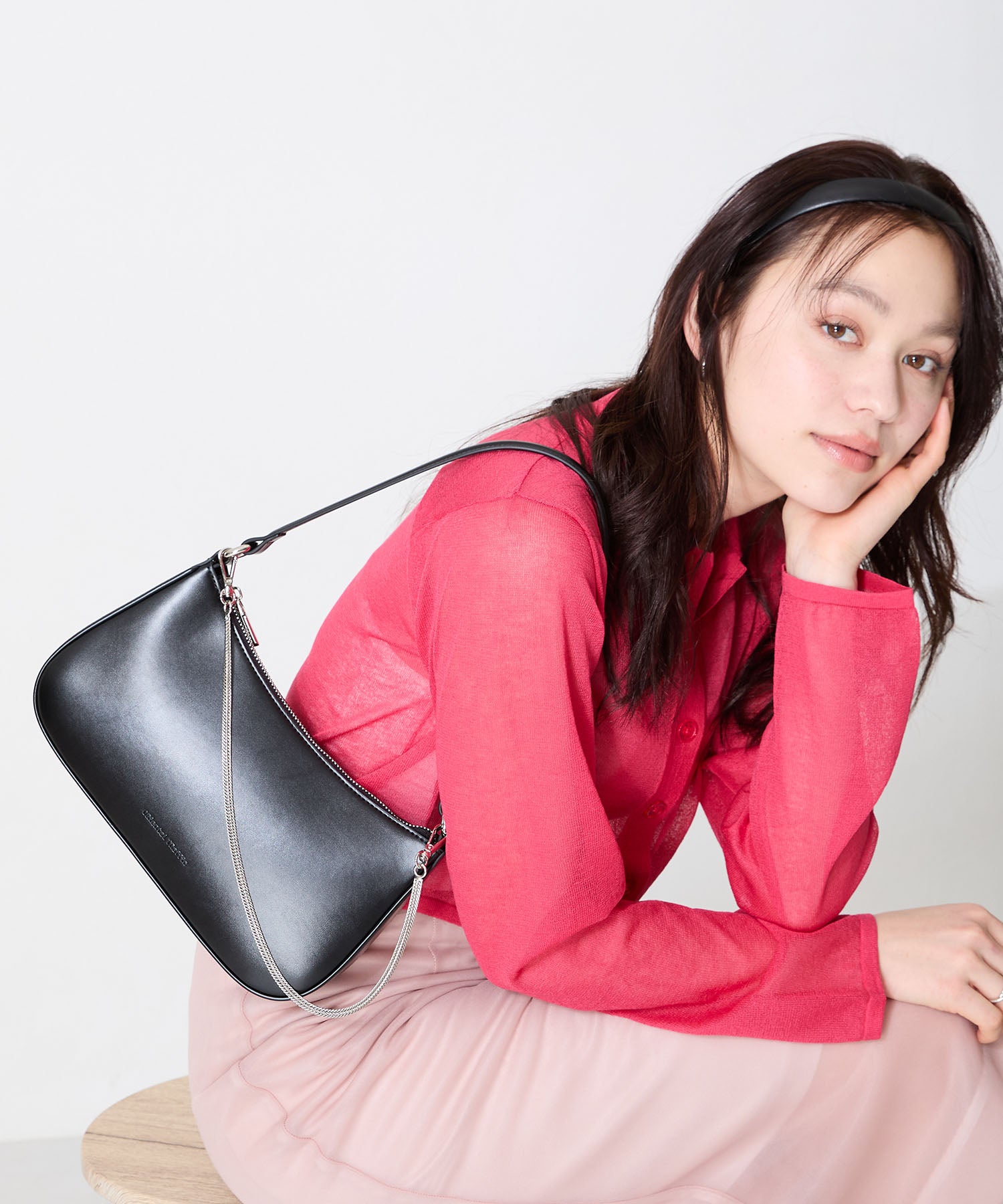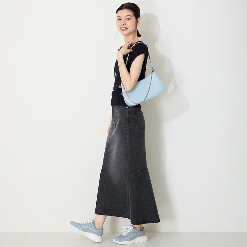 トレンドのハーフムーン型がシンプルながらも目を引くお洒落なバッグ。持ち手のストラップを合皮素材、チェーンと2種類付けているので日によってテイストを変えられるのがポイント。マチが6cmと薄めながらも横向きで500mlのペットボトルが入る収納力。きちんと見えするかっちりとした合皮素材を使用しているのでオケージョンシーンにもぴったり。