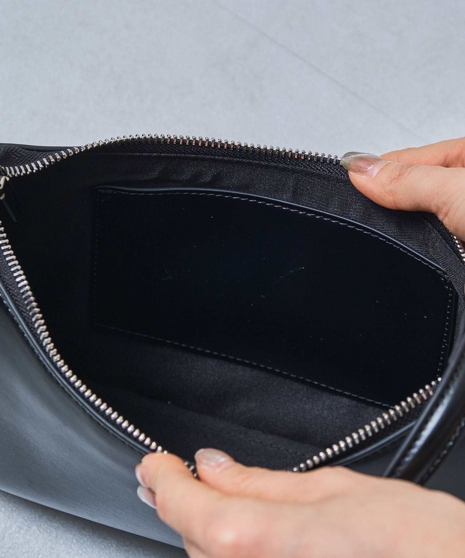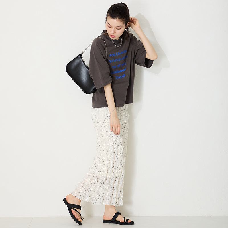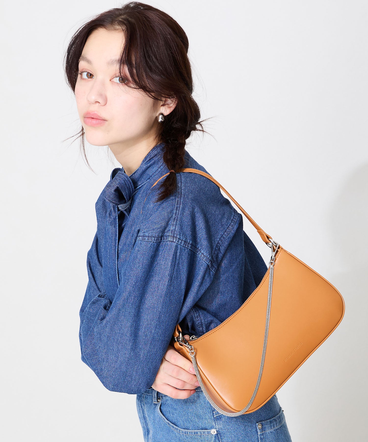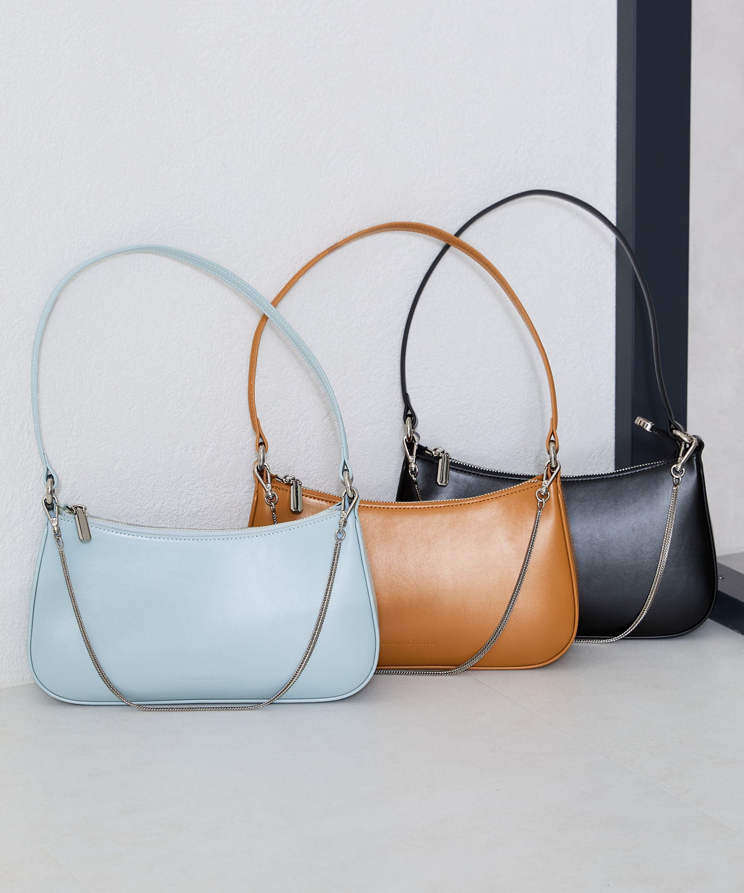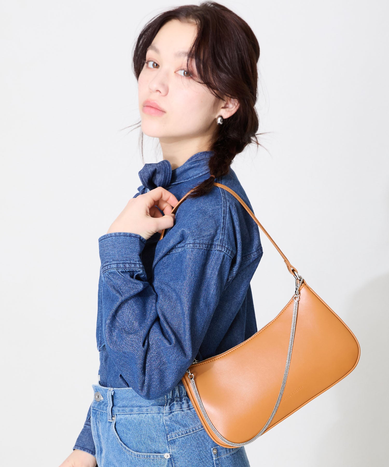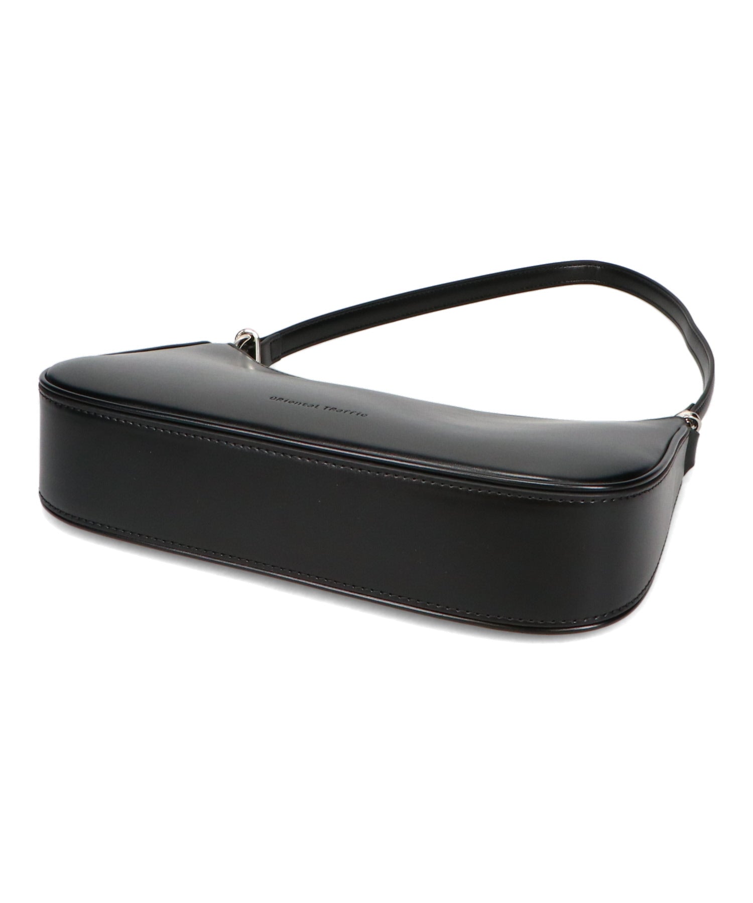 トレンドのハーフムーン型がシンプルながらも目を引くお洒落なバッグ。持ち手のストラップを合皮素材、チェーンと2種類付けているので日によってテイストを変えられるのがポイント。マチが6cmと薄めながらも横向きで500mlのペットボトルが入る収納力。きちんと見えするかっちりとした合皮素材を使用しているのでオケージョンシーンにもぴったり。