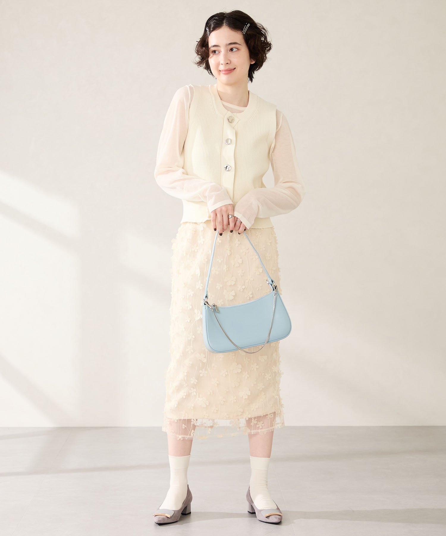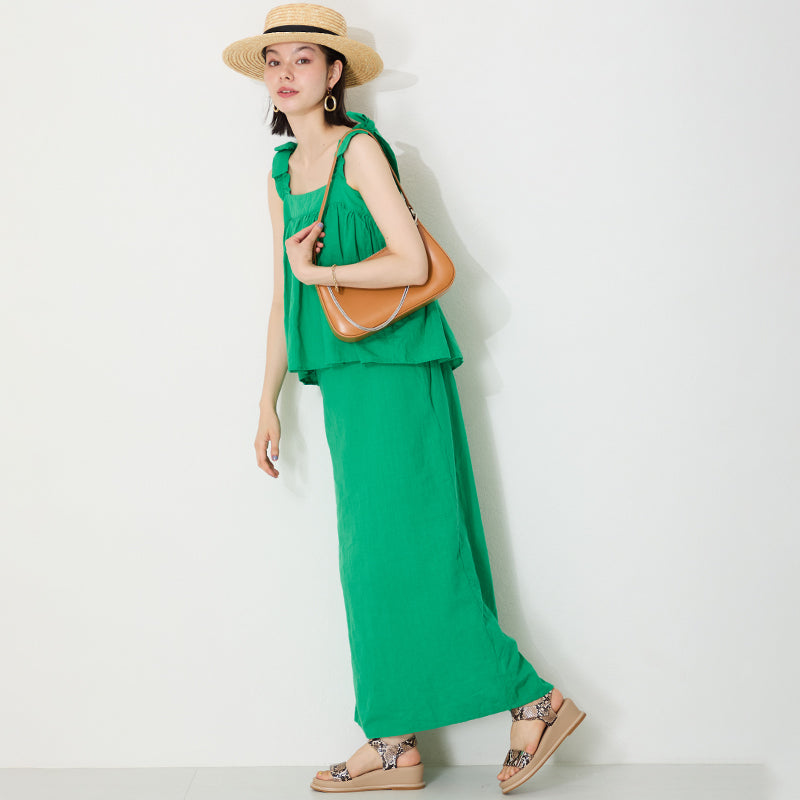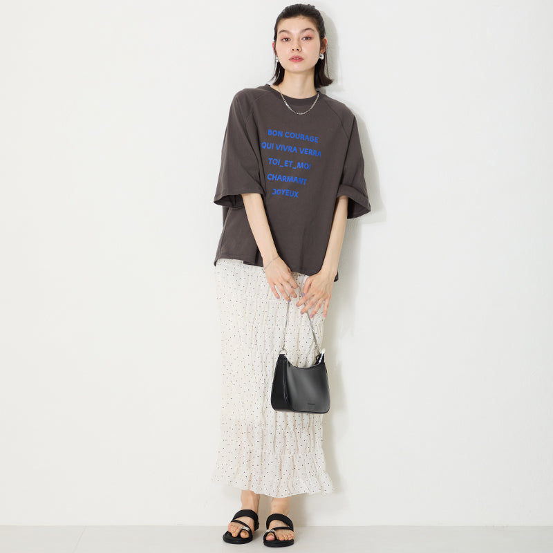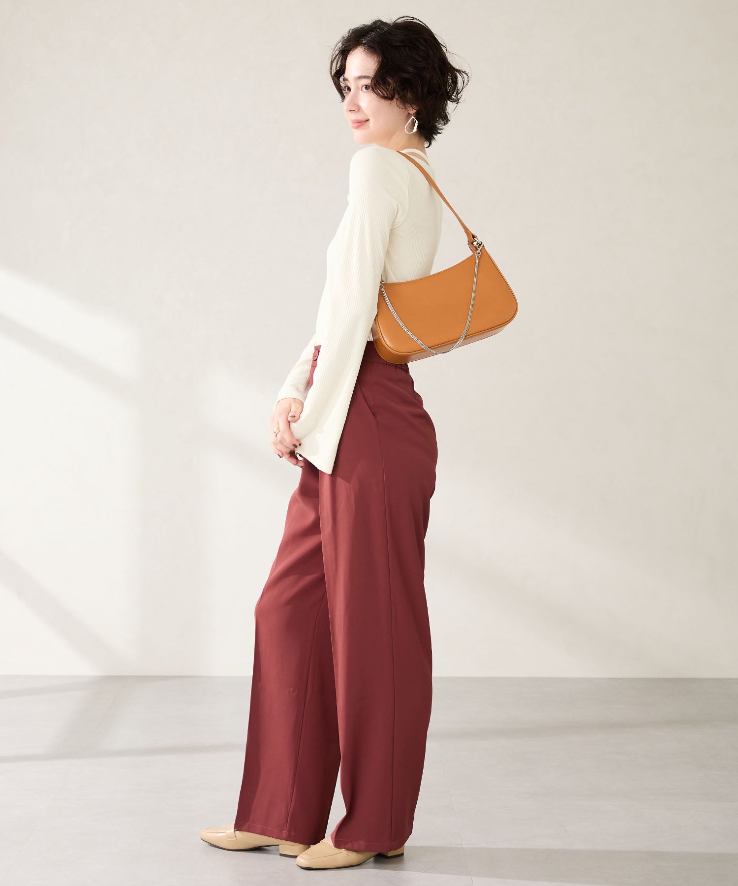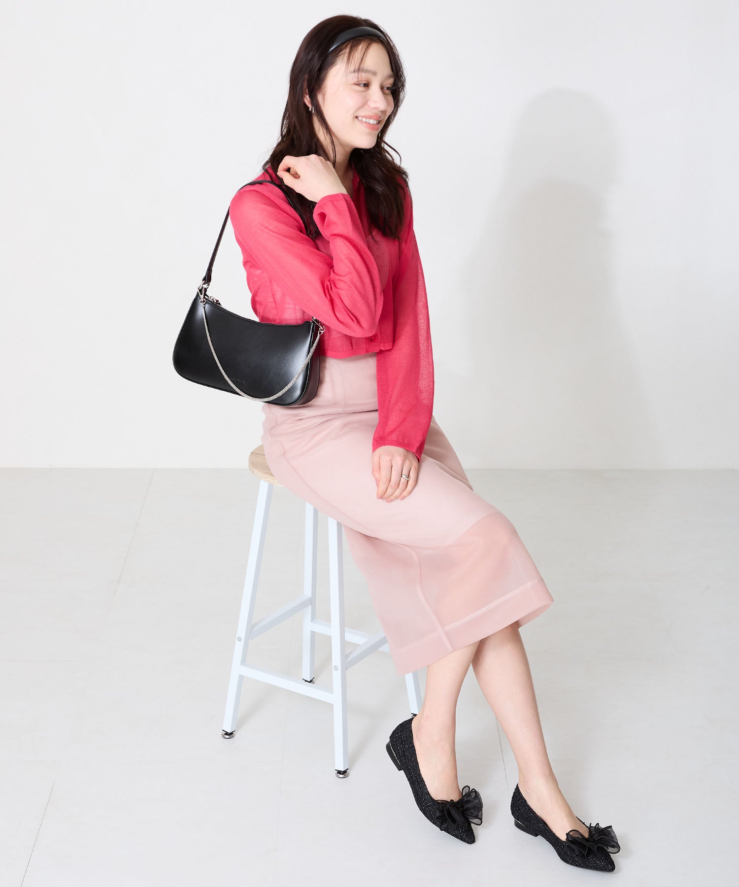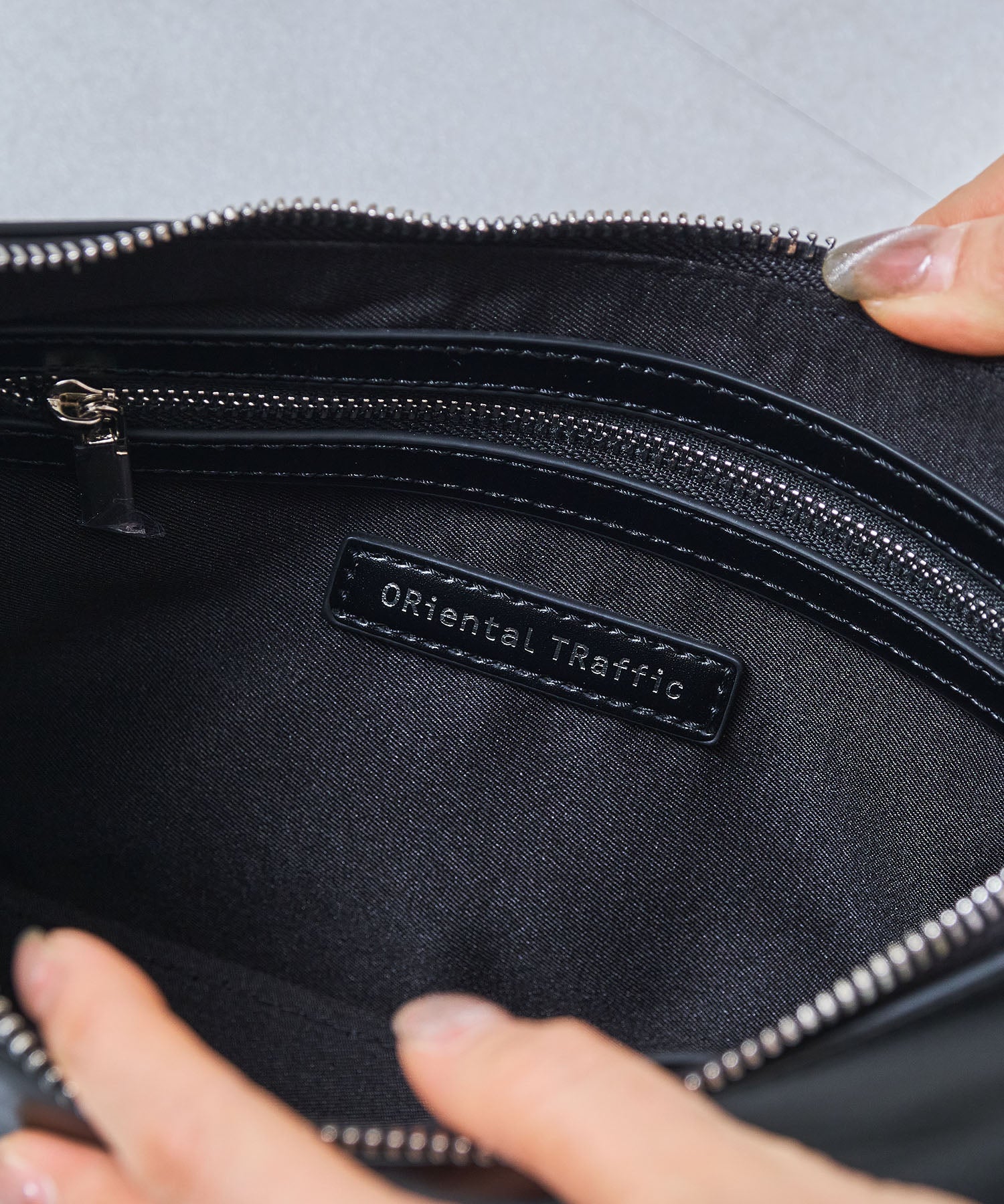 トレンドのハーフムーン型がシンプルながらも目を引くお洒落なバッグ。持ち手のストラップを合皮素材、チェーンと2種類付けているので日によってテイストを変えられるのがポイント。マチが6cmと薄めながらも横向きで500mlのペットボトルが入る収納力。きちんと見えするかっちりとした合皮素材を使用しているのでオケージョンシーンにもぴったり。