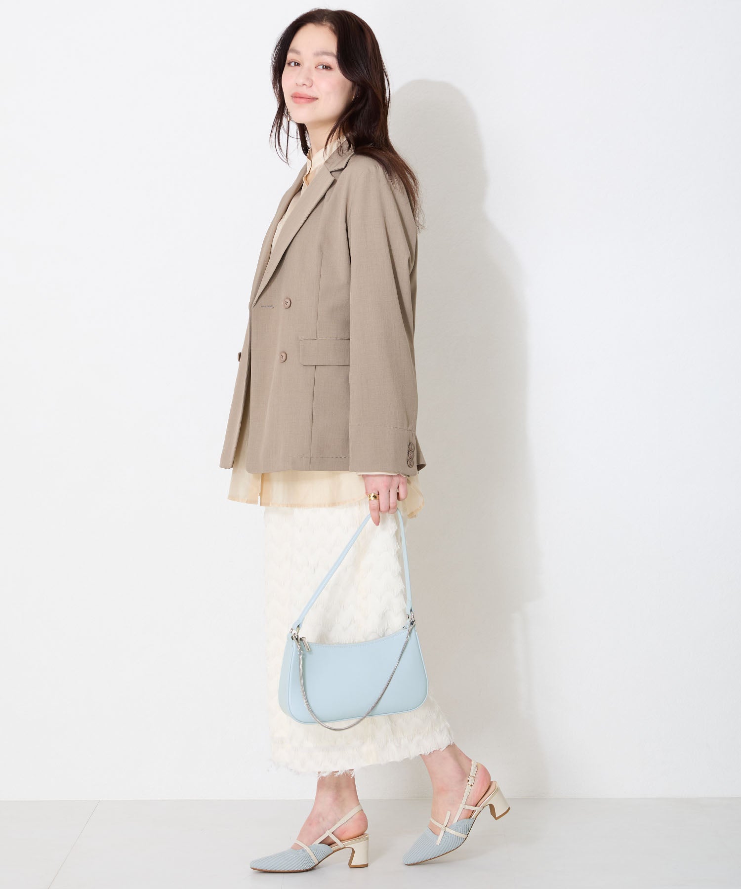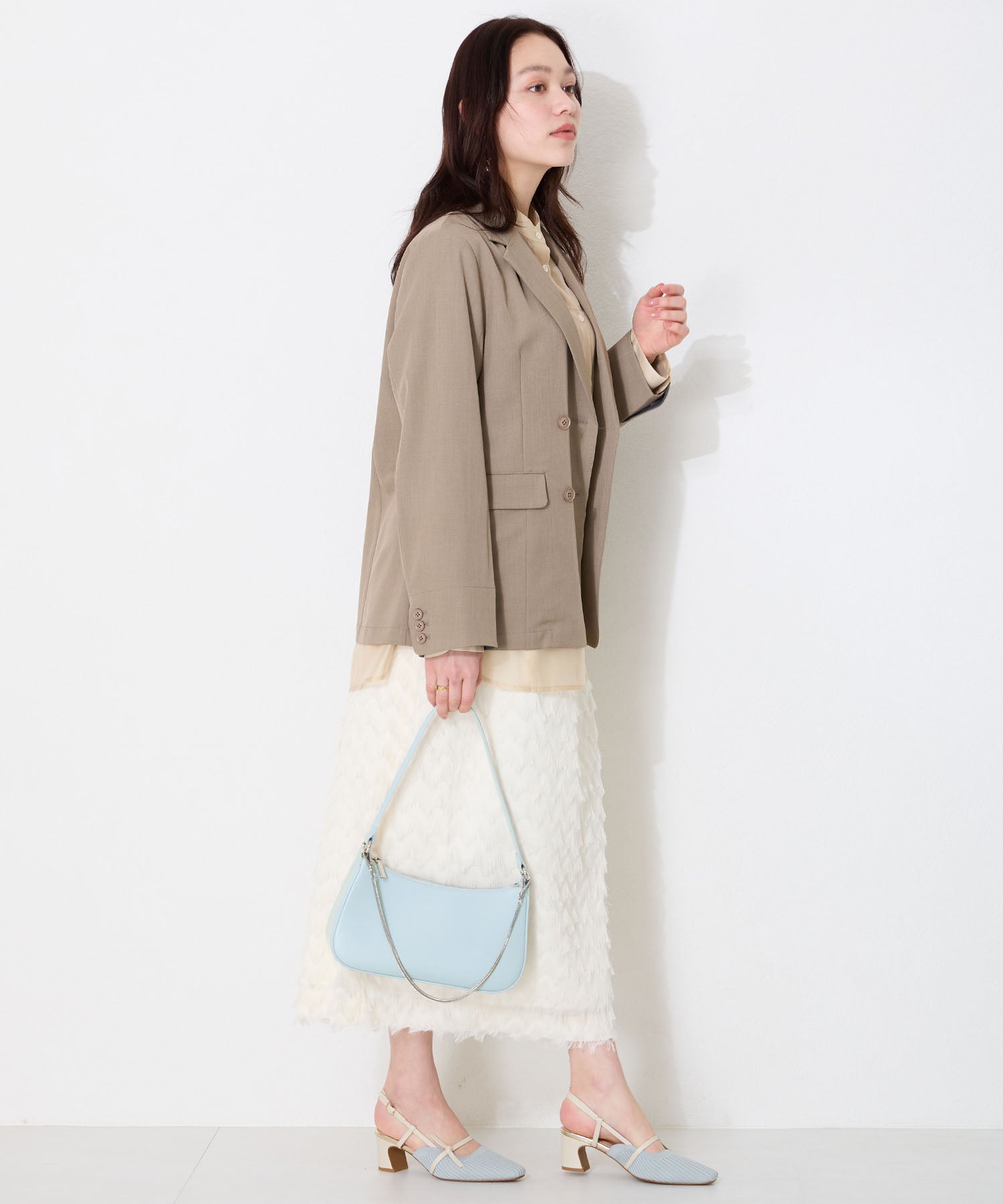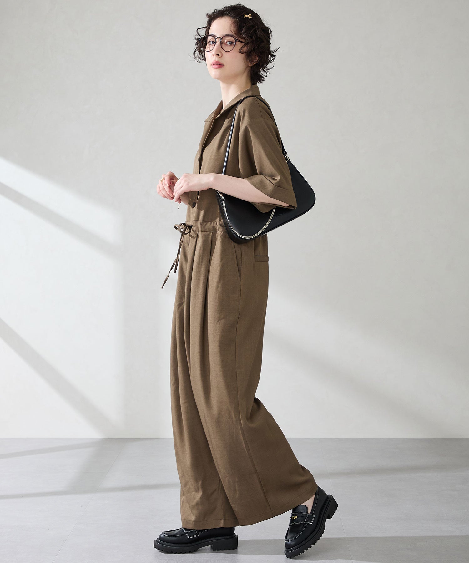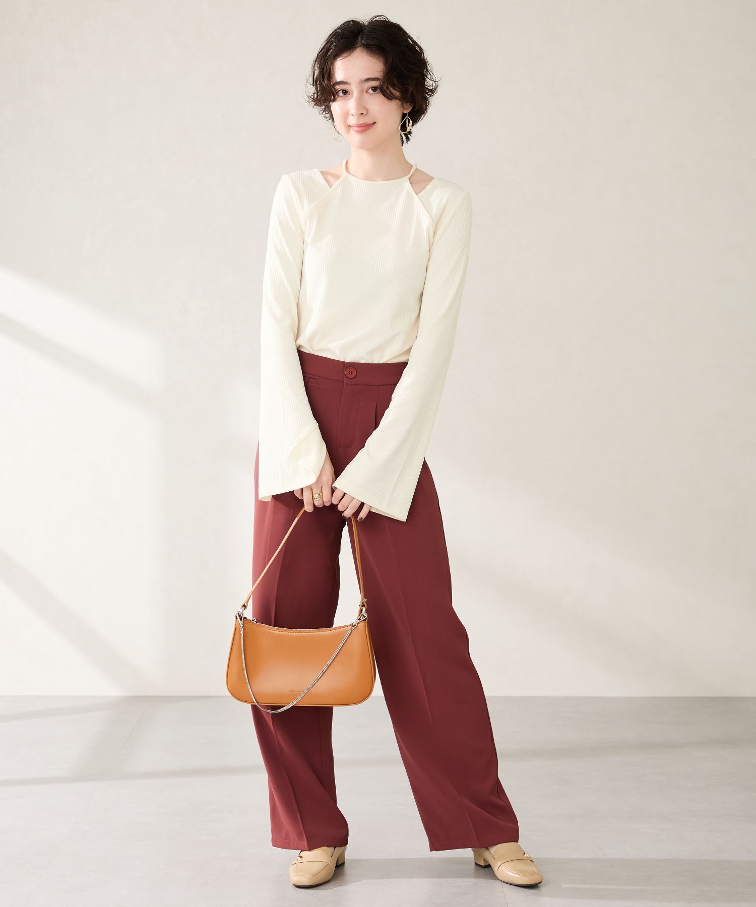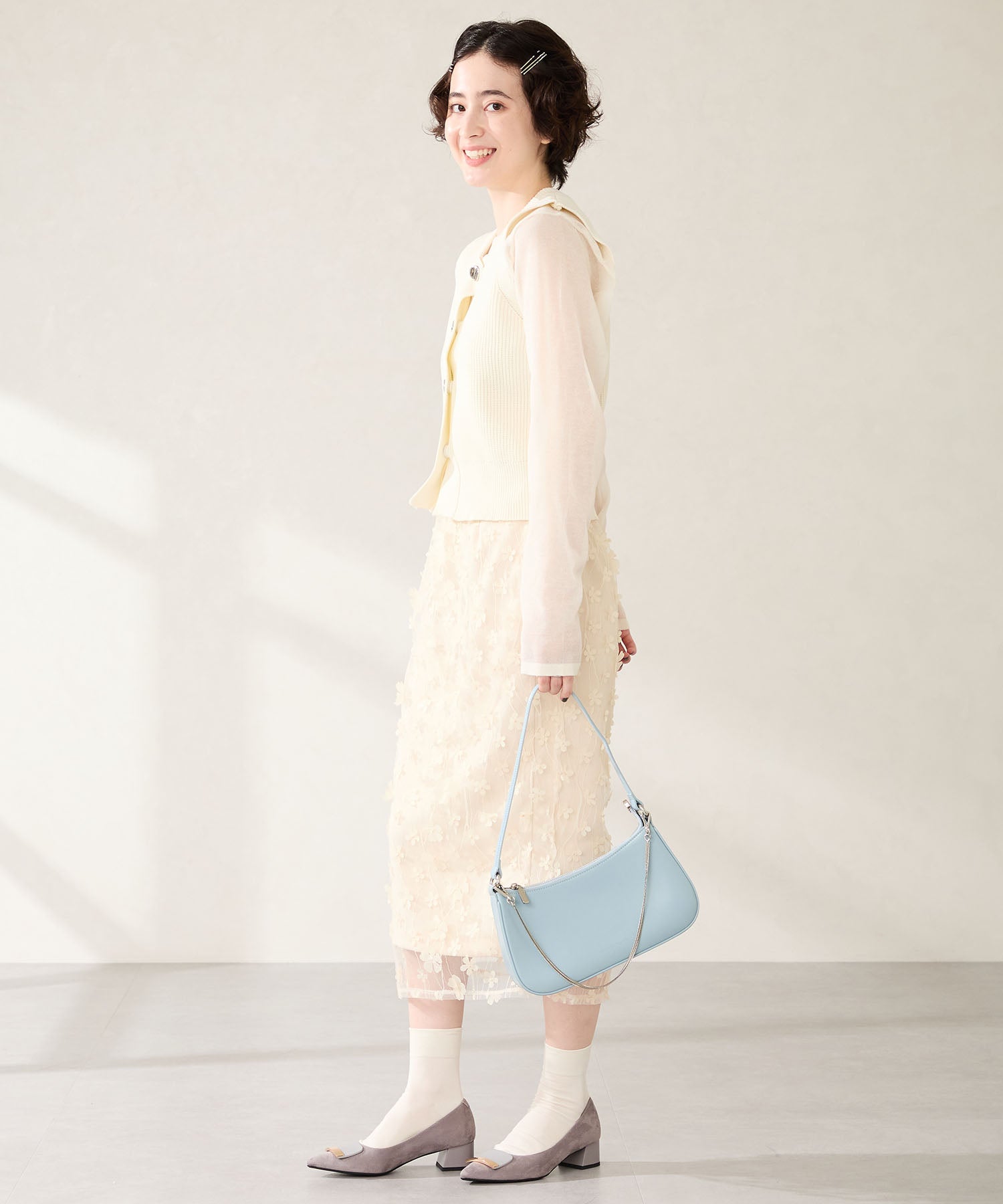 トレンドのハーフムーン型がシンプルながらも目を引くお洒落なバッグ。持ち手のストラップを合皮素材、チェーンと2種類付けているので日によってテイストを変えられるのがポイント。マチが6cmと薄めながらも横向きで500mlのペットボトルが入る収納力。きちんと見えするかっちりとした合皮素材を使用しているのでオケージョンシーンにもぴったり。
