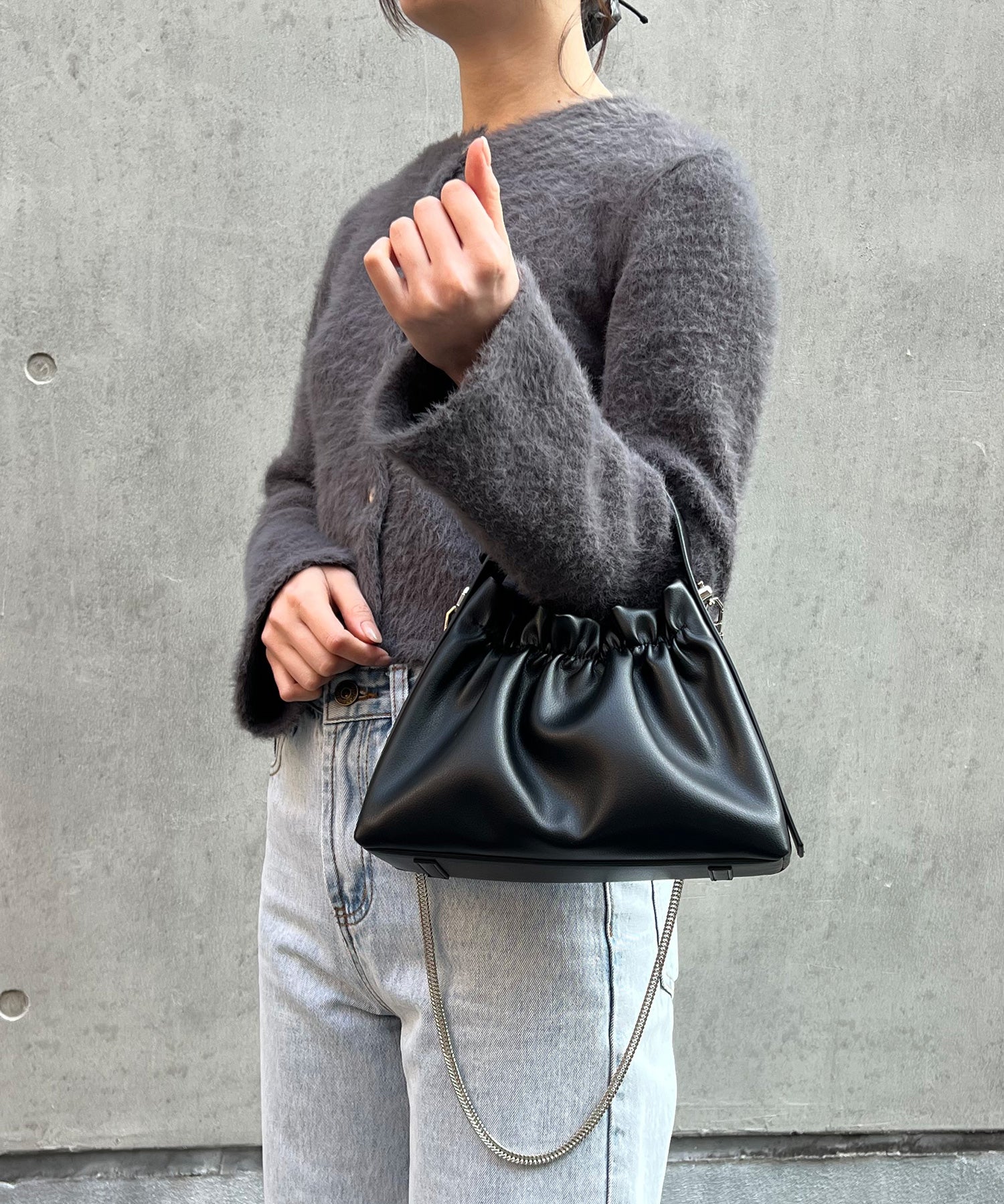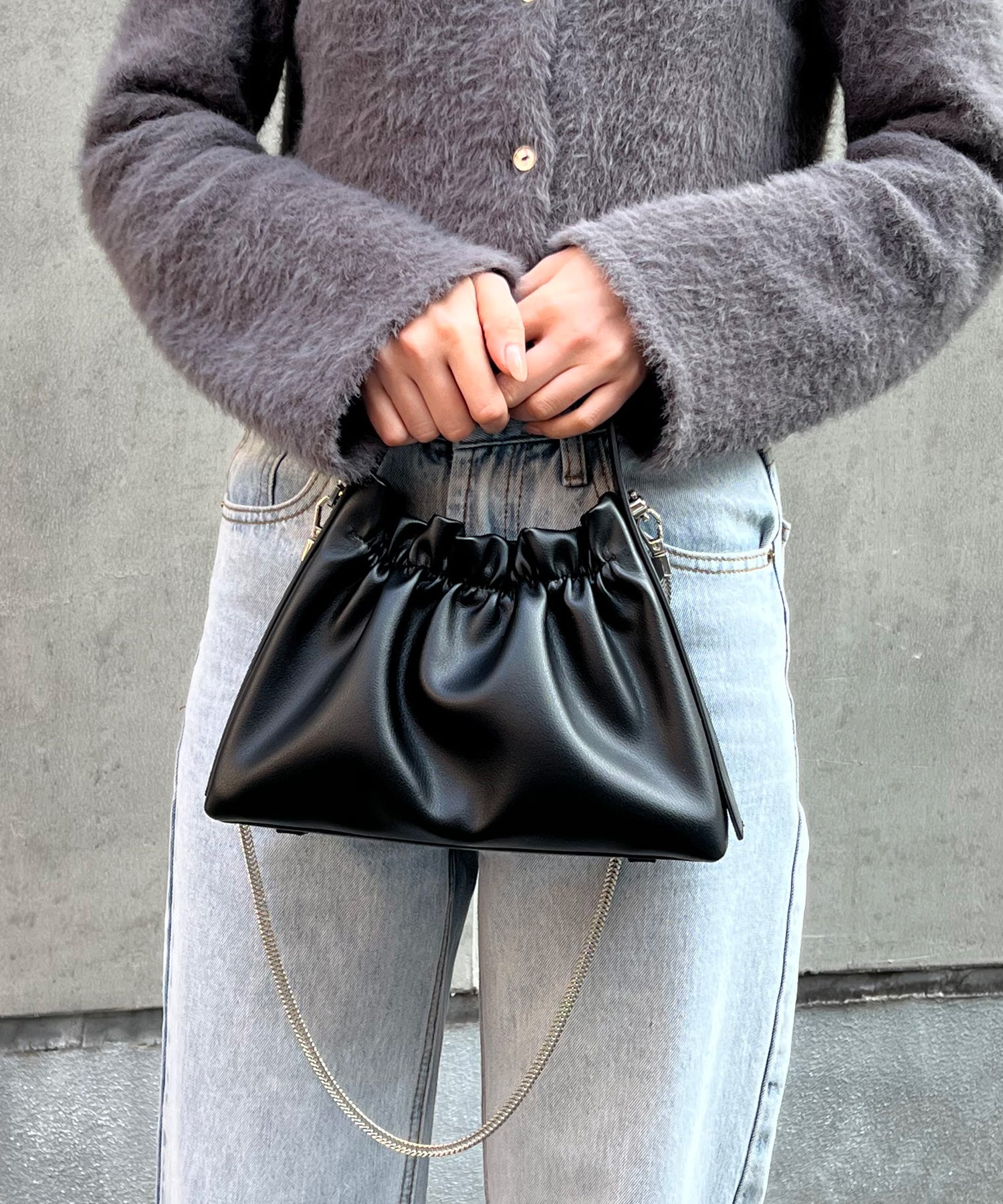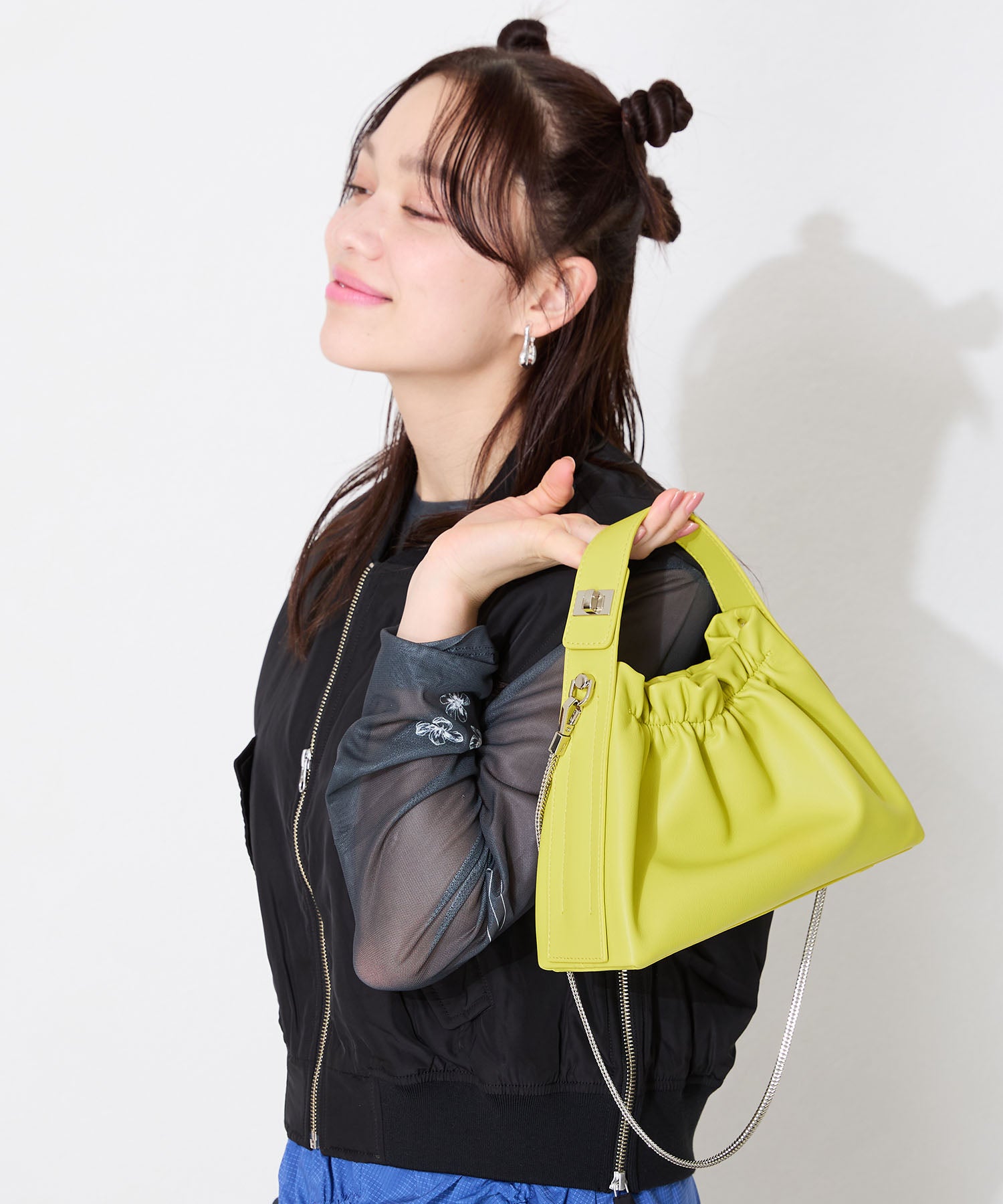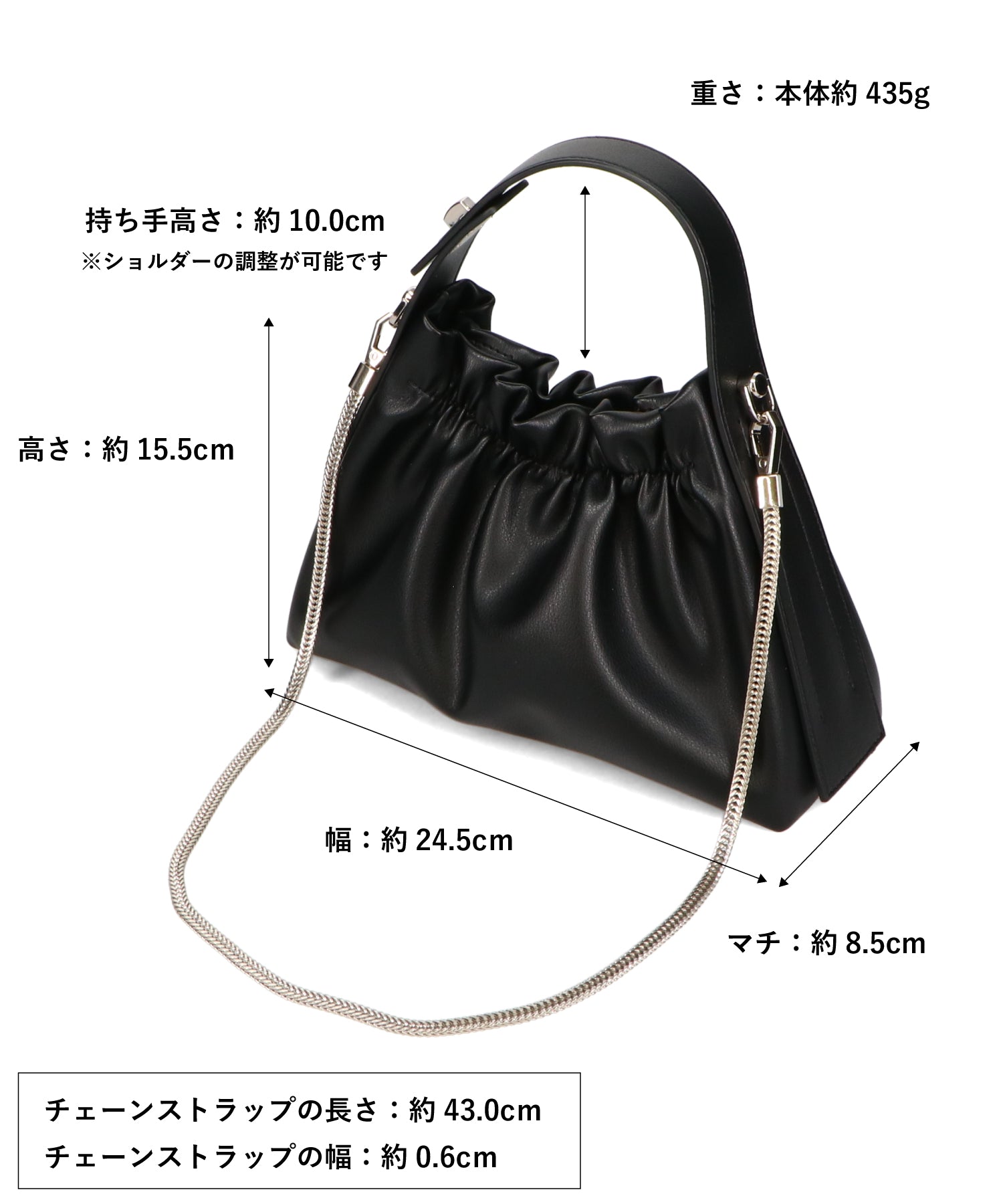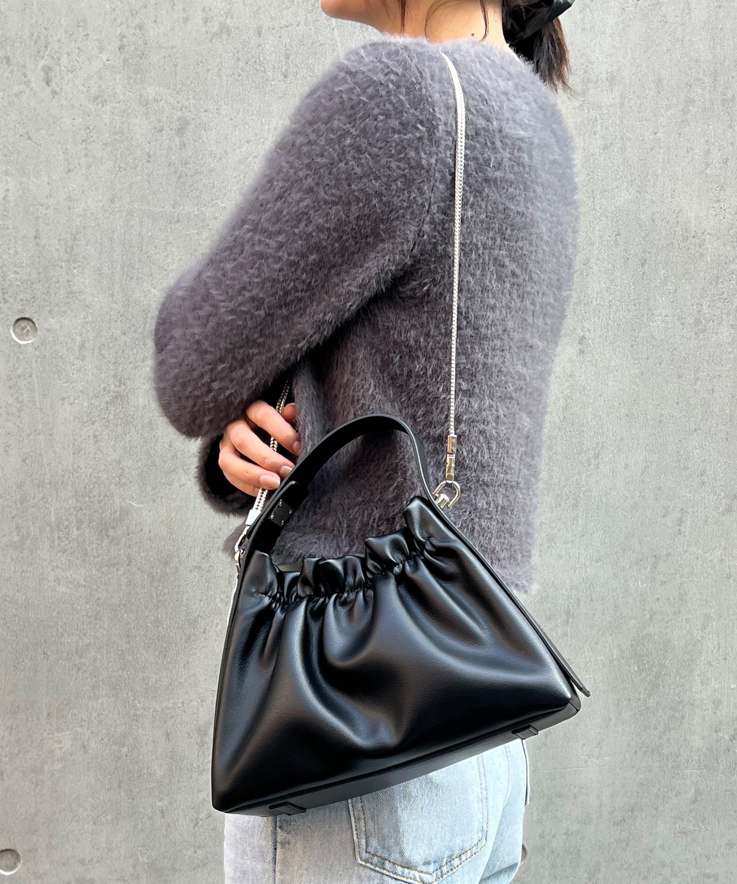 お洒落なトラペーズ型や持ち手部分の金具飾りがお洒落で印象的なハンドバッグは持つだけで主役級のアイテム。間口はギャザーを寄せたデザインで中身が見えにくく、マグネットの留め具を2箇所付けしっかり閉じるように工夫。マチ幅があるので荷物もたくさん入る丁度良い容量感が使い勝手抜群◎。