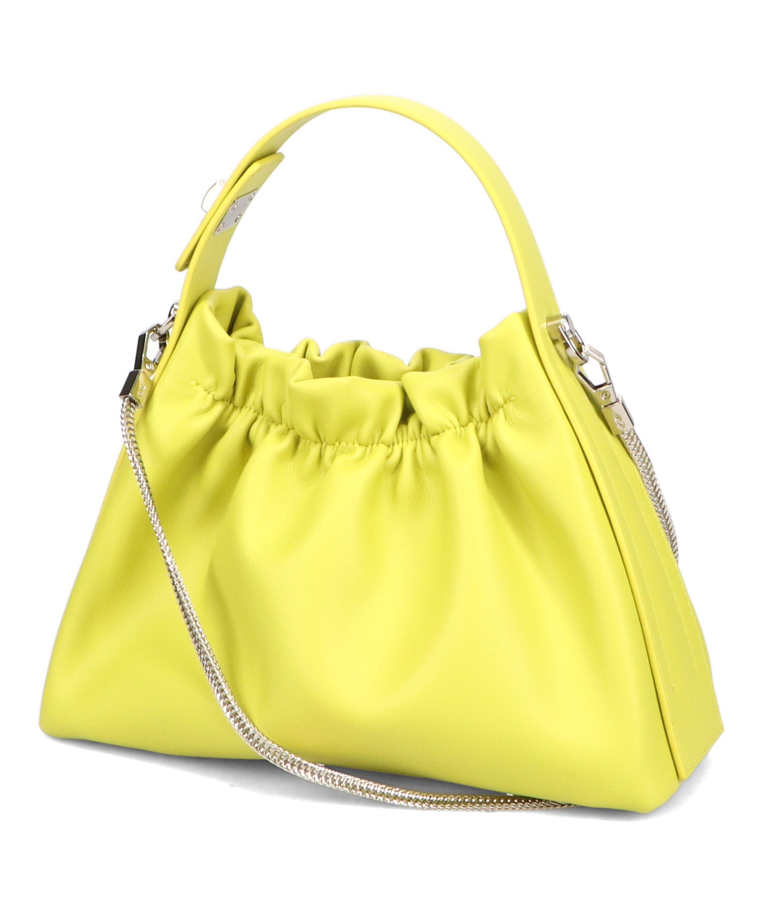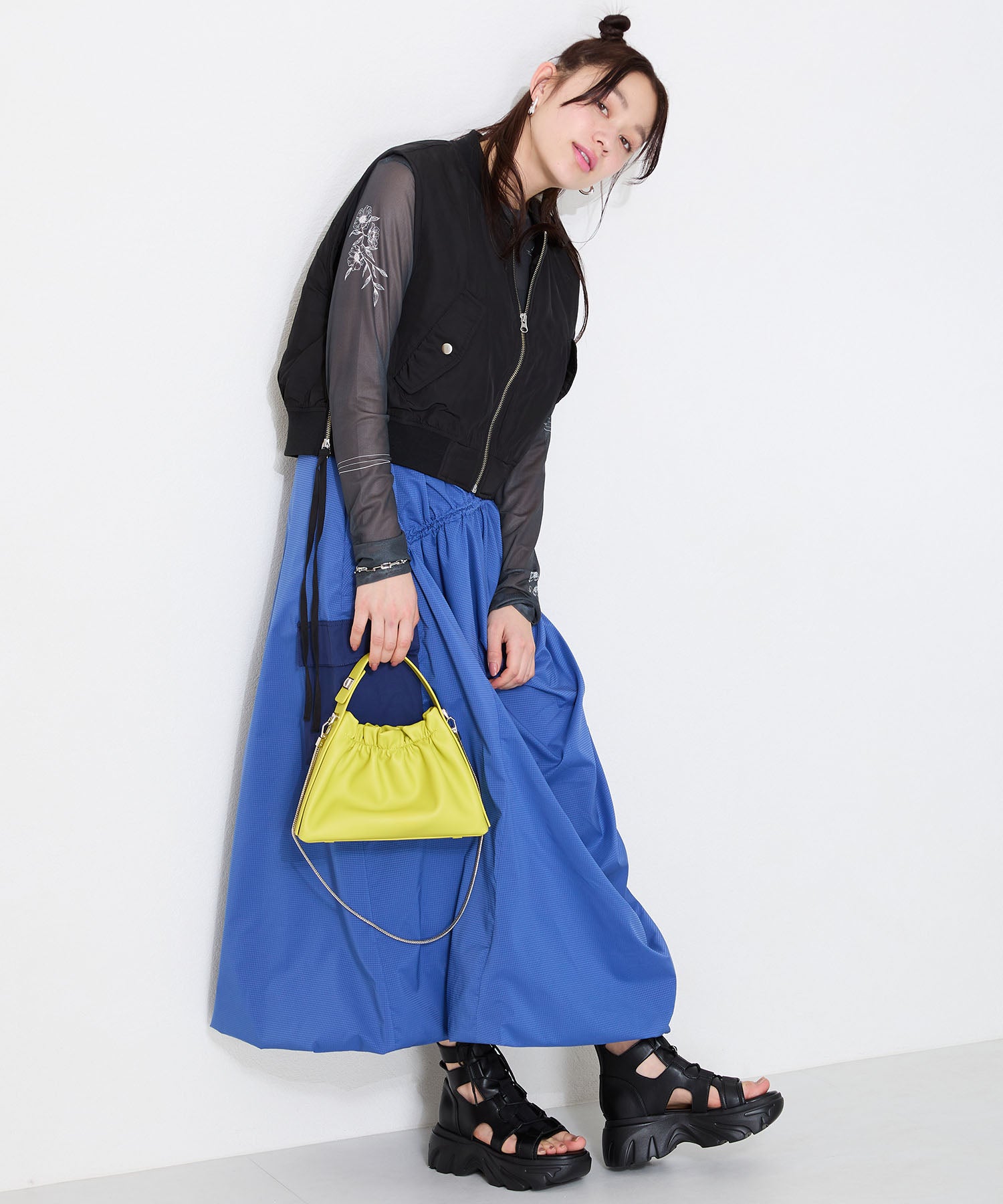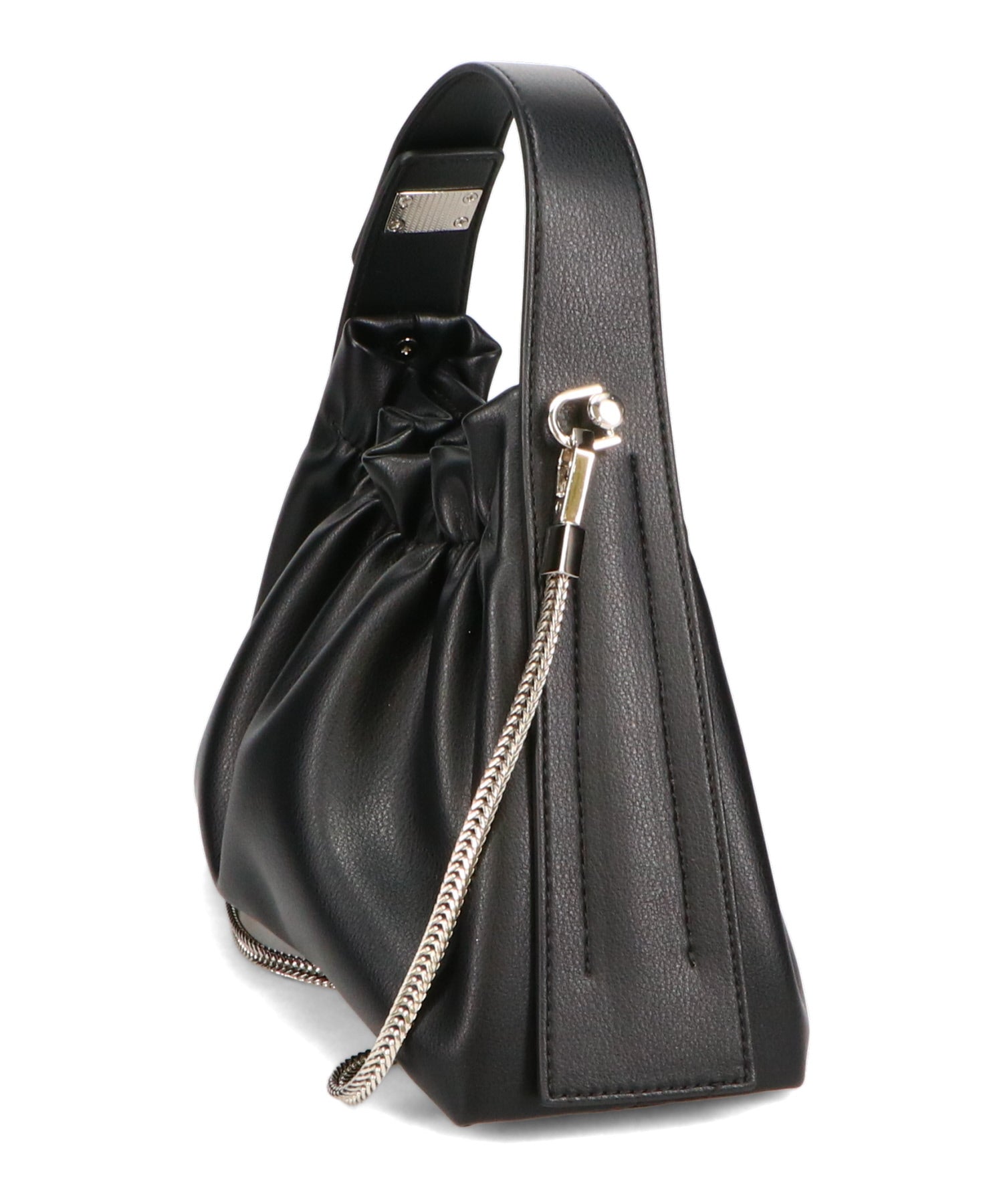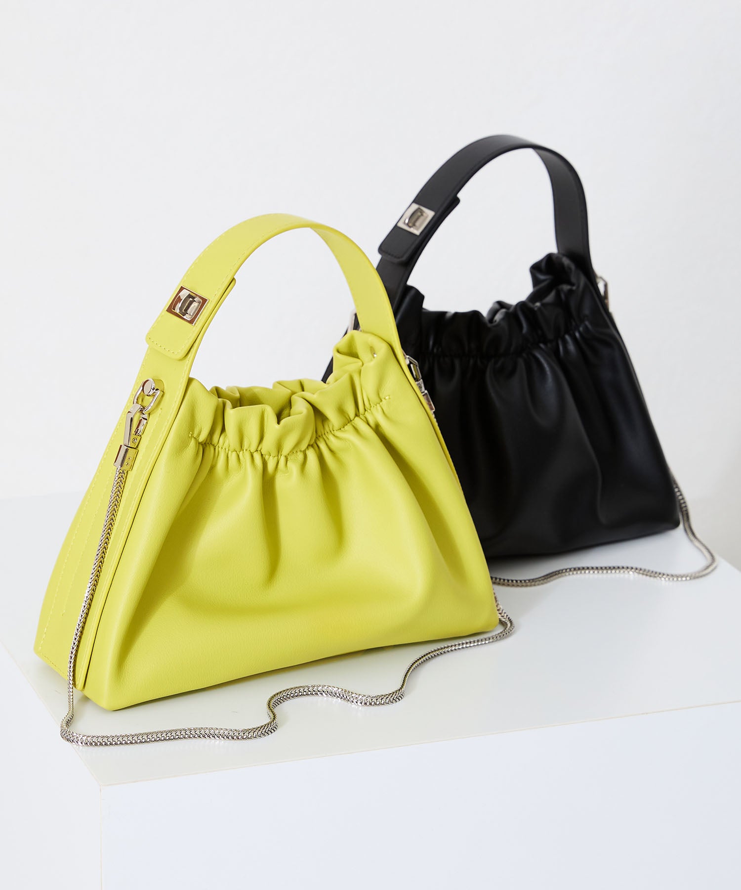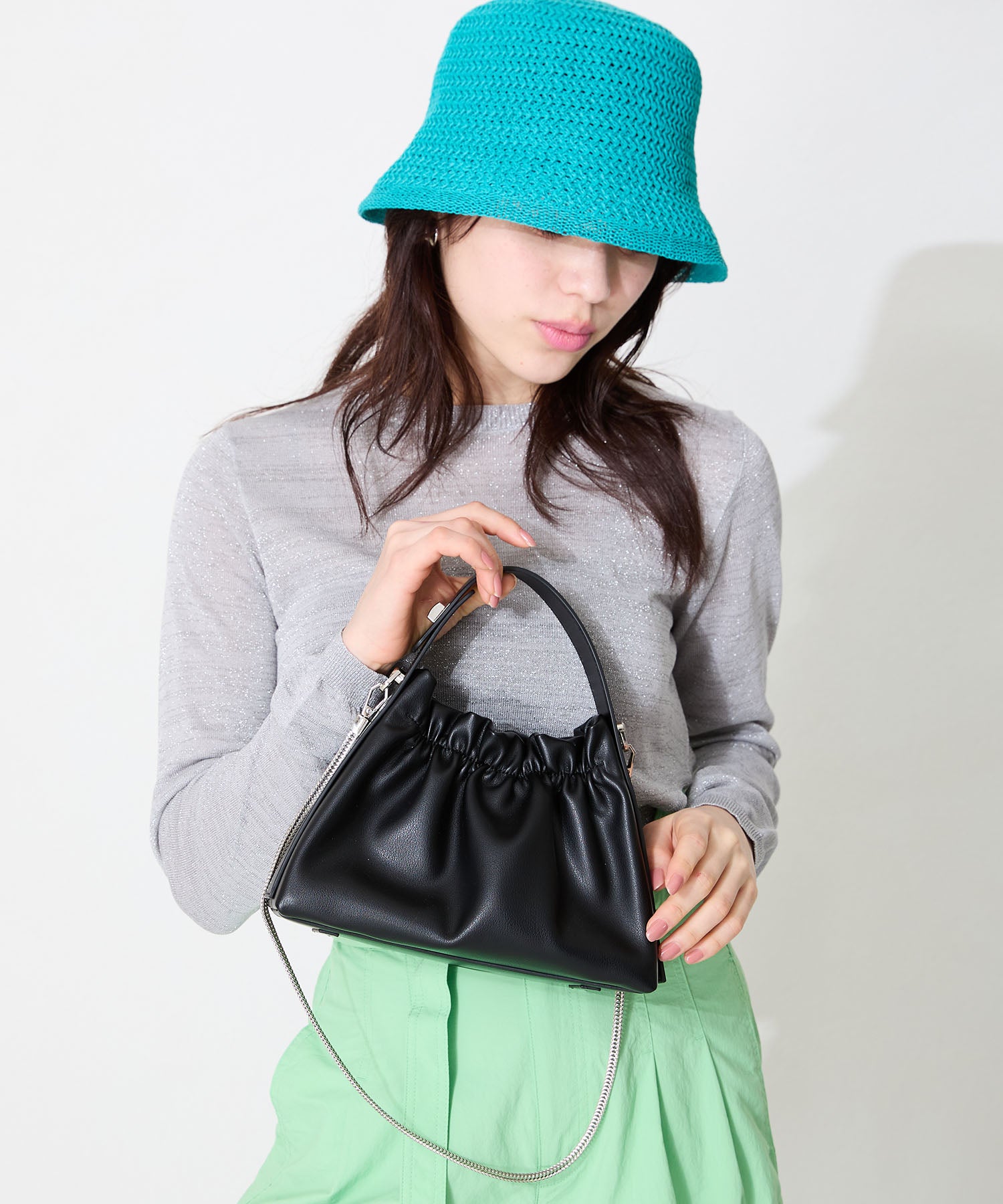 お洒落なトラペーズ型や持ち手部分の金具飾りがお洒落で印象的なハンドバッグは持つだけで主役級のアイテム。間口はギャザーを寄せたデザインで中身が見えにくく、マグネットの留め具を2箇所付けしっかり閉じるように工夫。マチ幅があるので荷物もたくさん入る丁度良い容量感が使い勝手抜群◎。