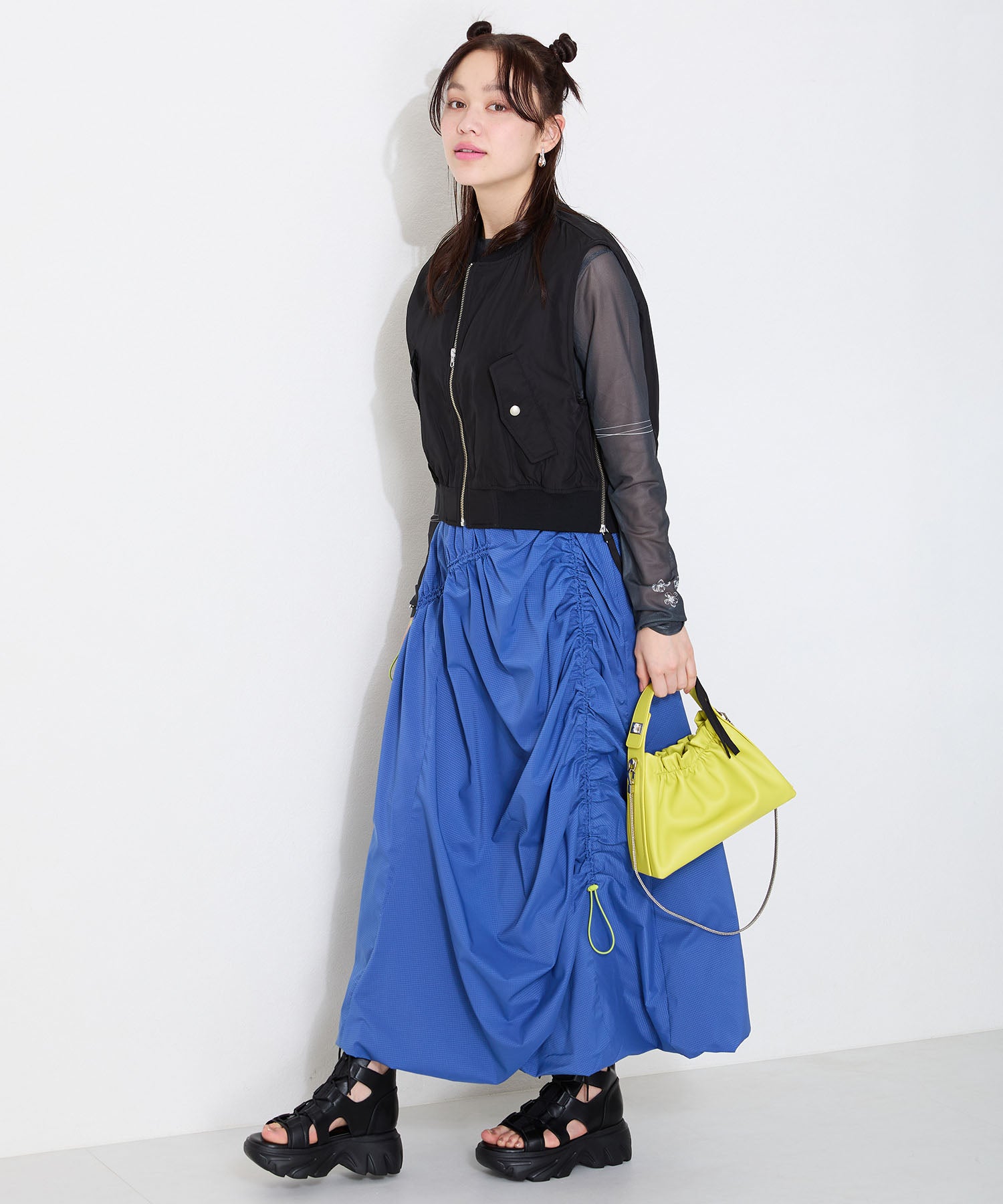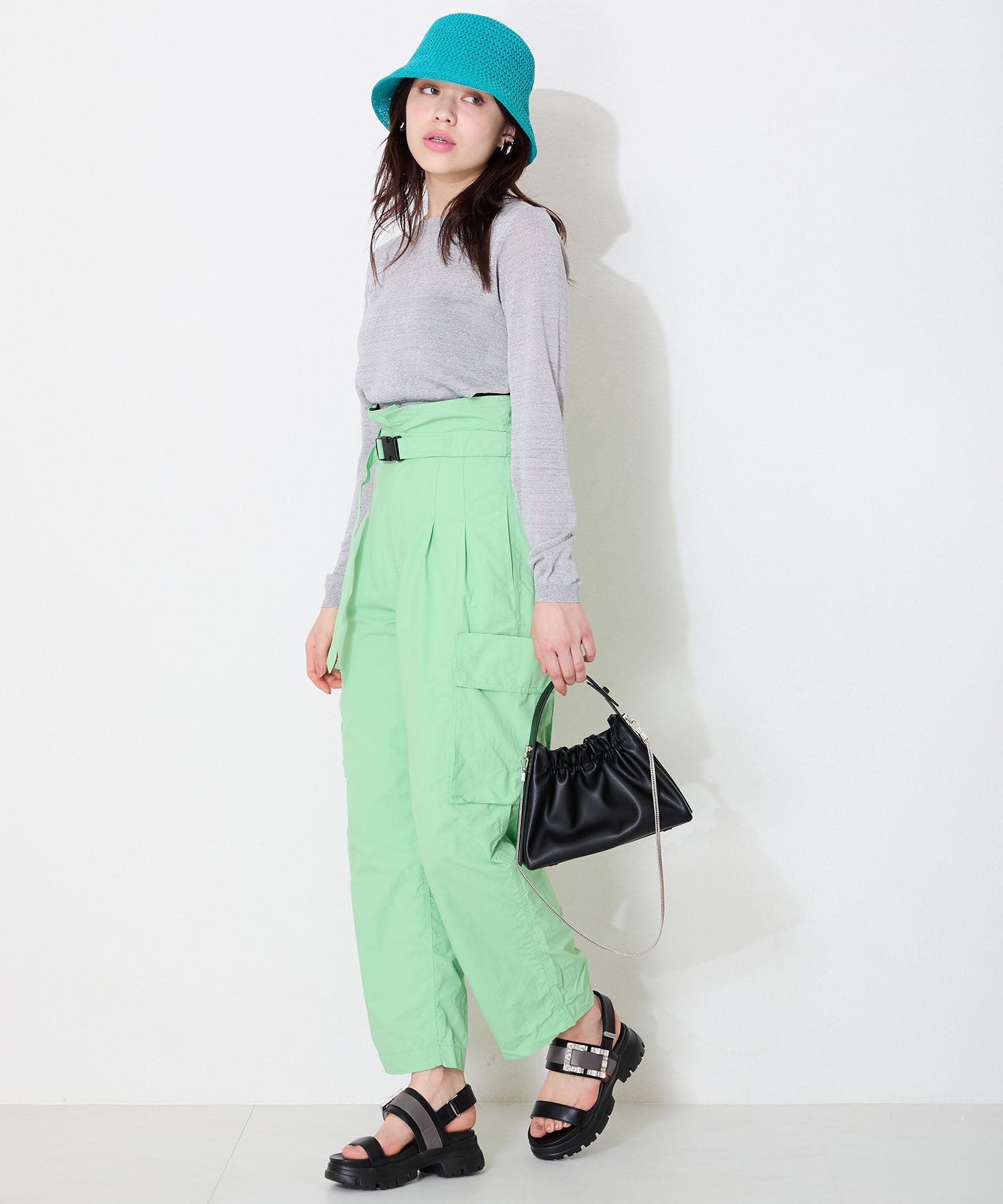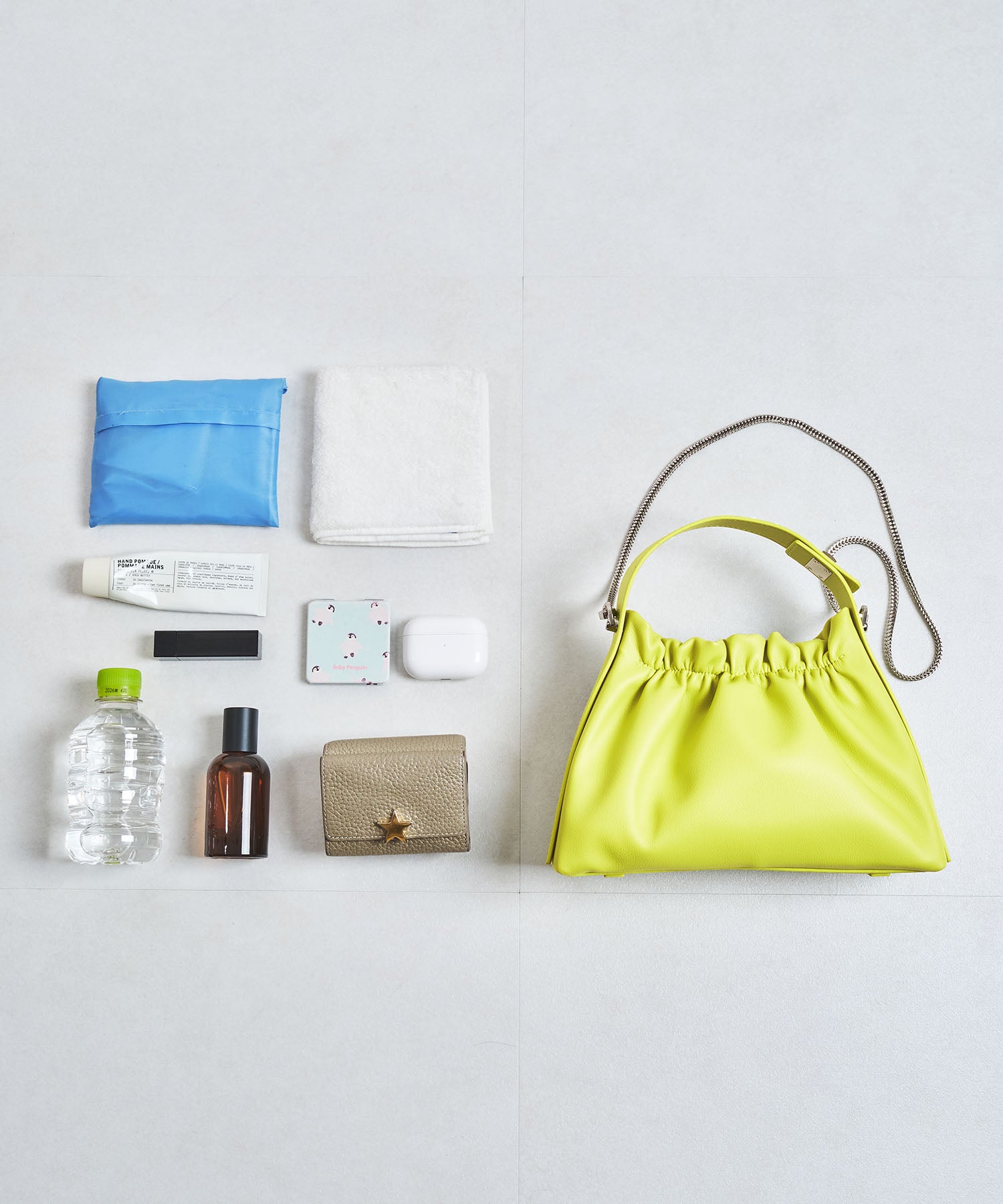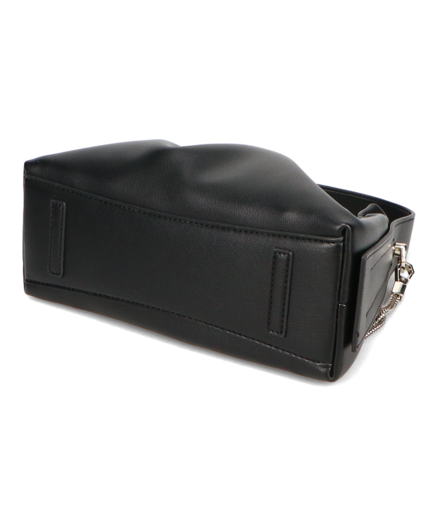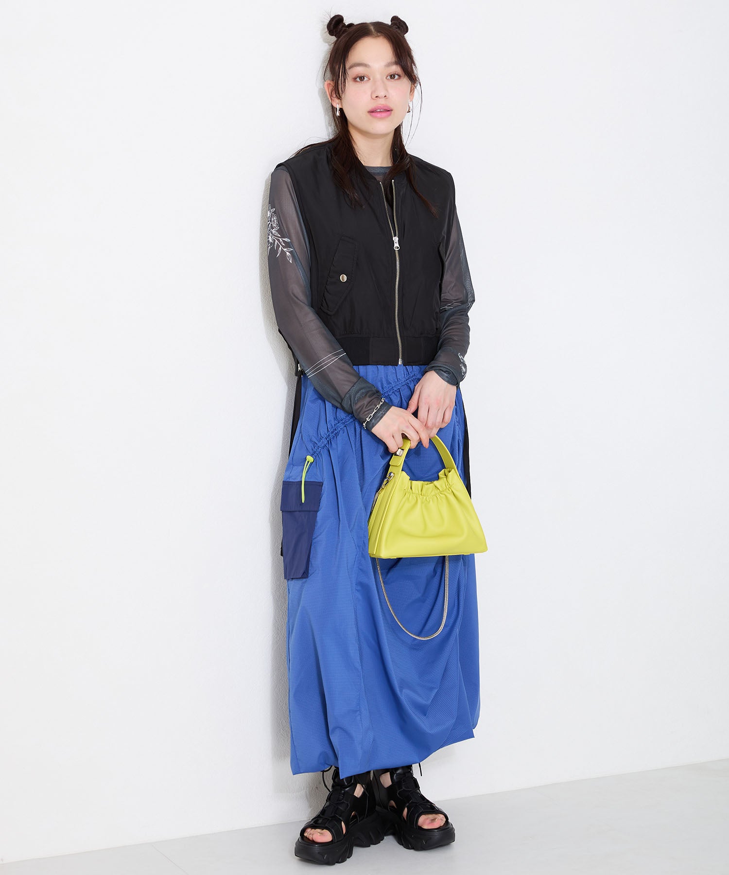お洒落なトラペーズ型や持ち手部分の金具飾りがお洒落で印象的なハンドバッグは持つだけで主役級のアイテム。間口はギャザーを寄せたデザインで中身が見えにくく、マグネットの留め具を2箇所付けしっかり閉じるように工夫。マチ幅があるので荷物もたくさん入る丁度良い容量感が使い勝手抜群◎。