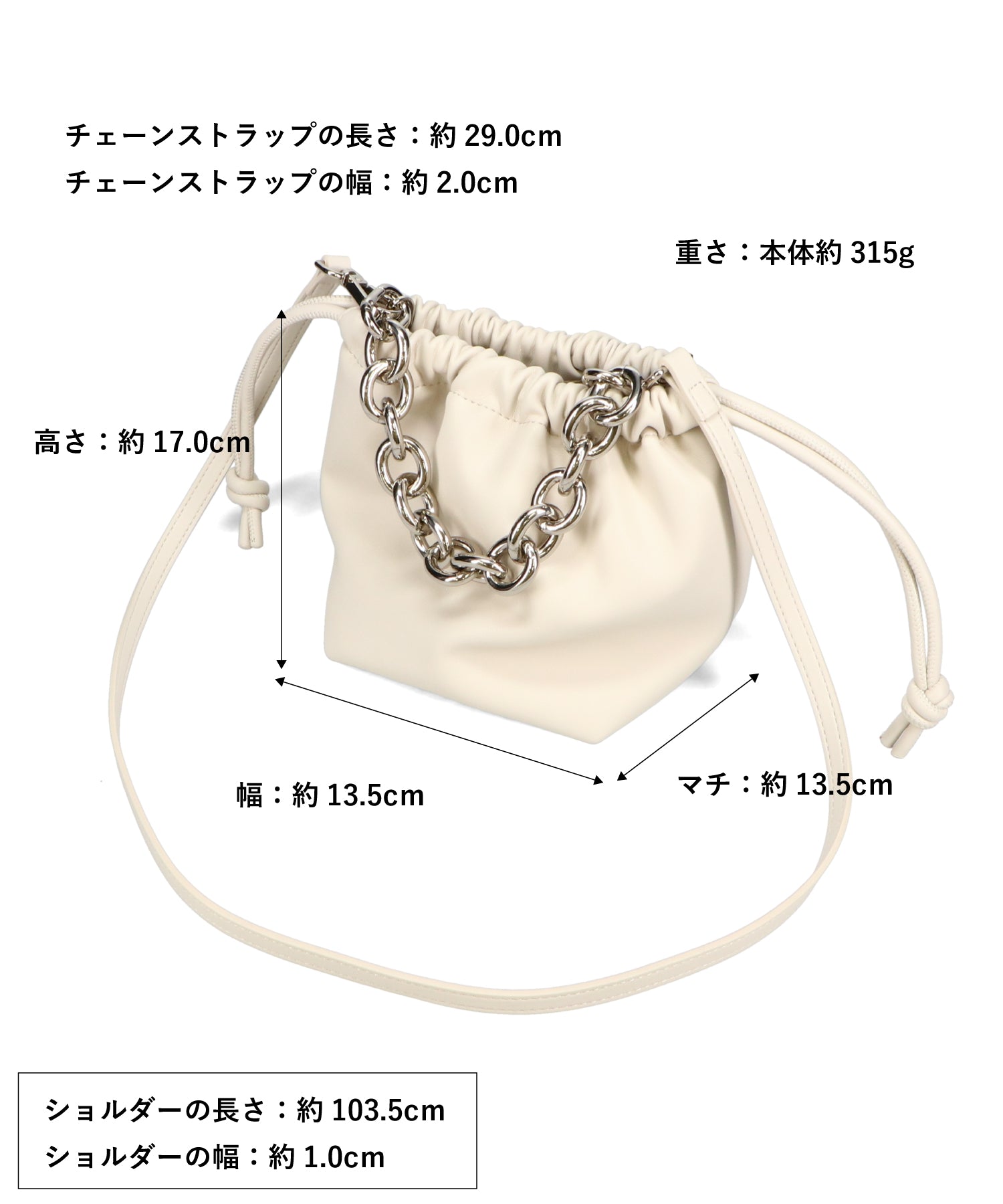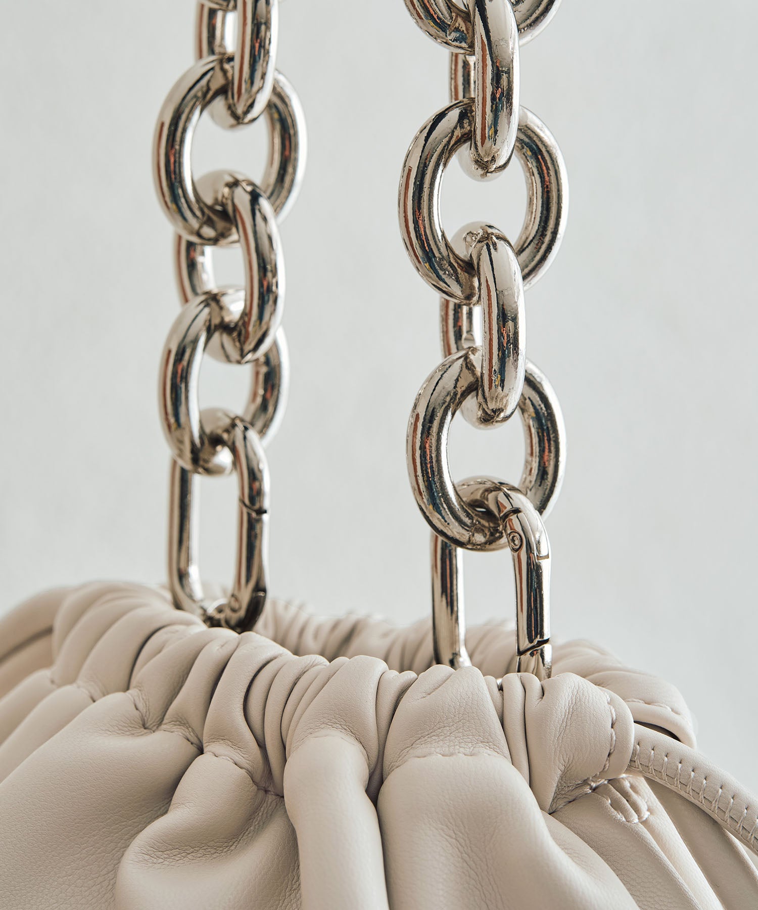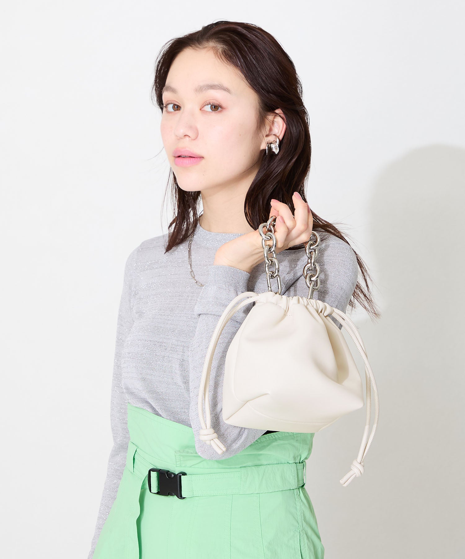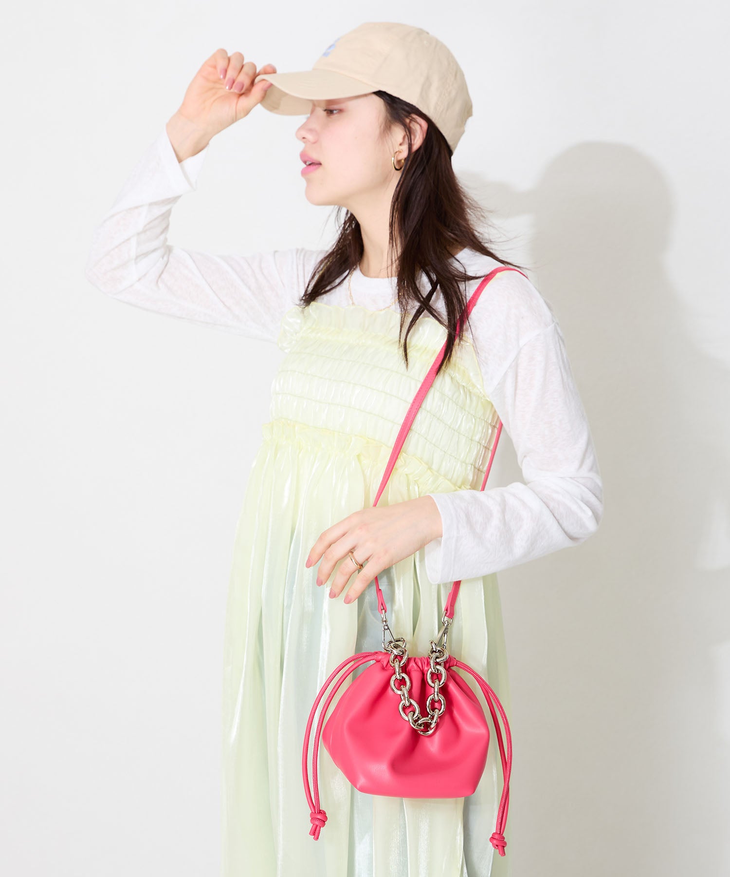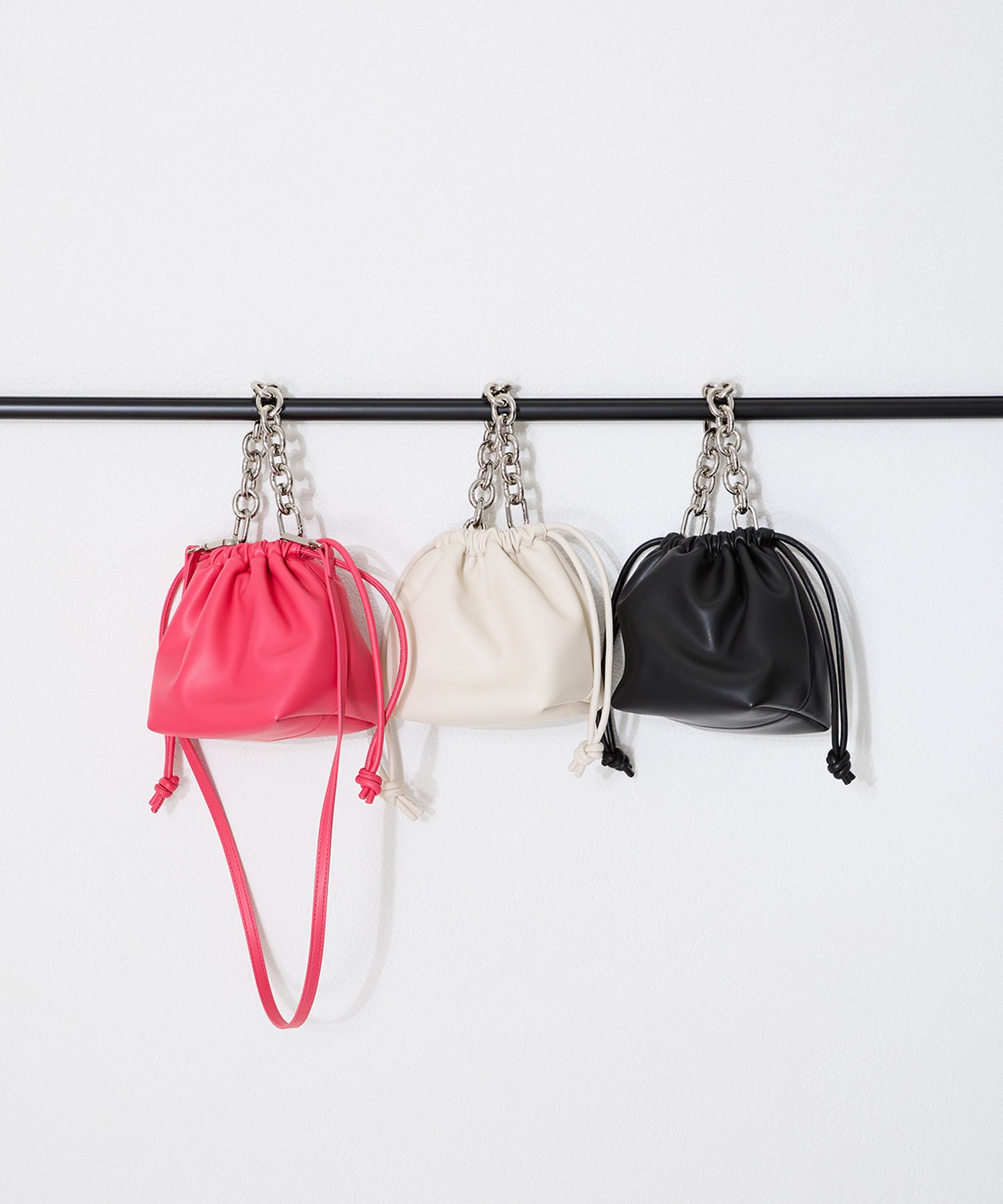 コロンとしたフォルムが可愛い巾着バッグは取り外し可能な太めのチェーンストラップで一気に雰囲気が変わるアイテム。本体と同色のショルダーストラップも付いているのでハンドバッグとしてだけではなく、肩掛けや斜め掛けも出来る優秀さも魅力。シンプルなデザインで季節問わず、どんなスタイルにも合わせやすい。