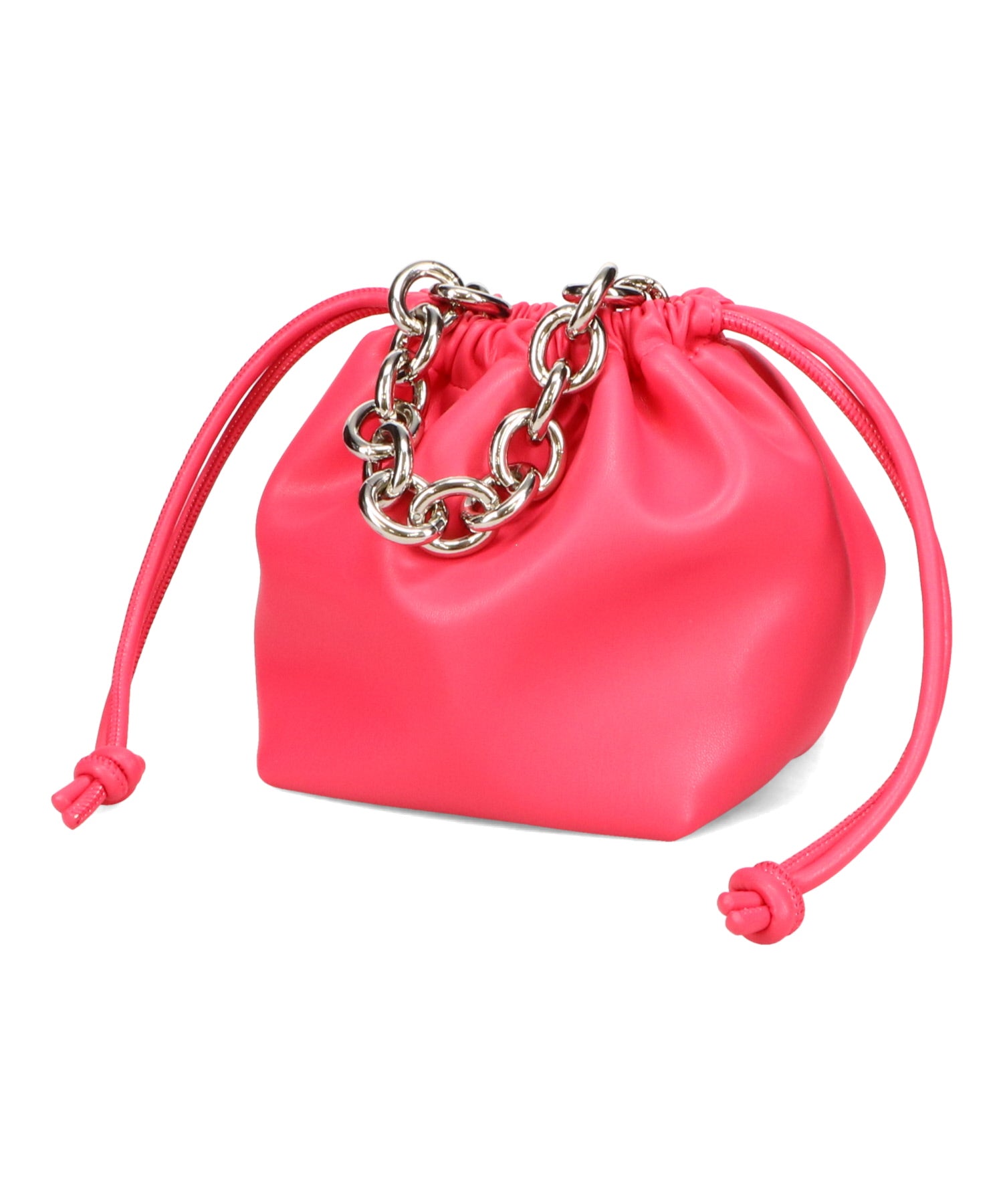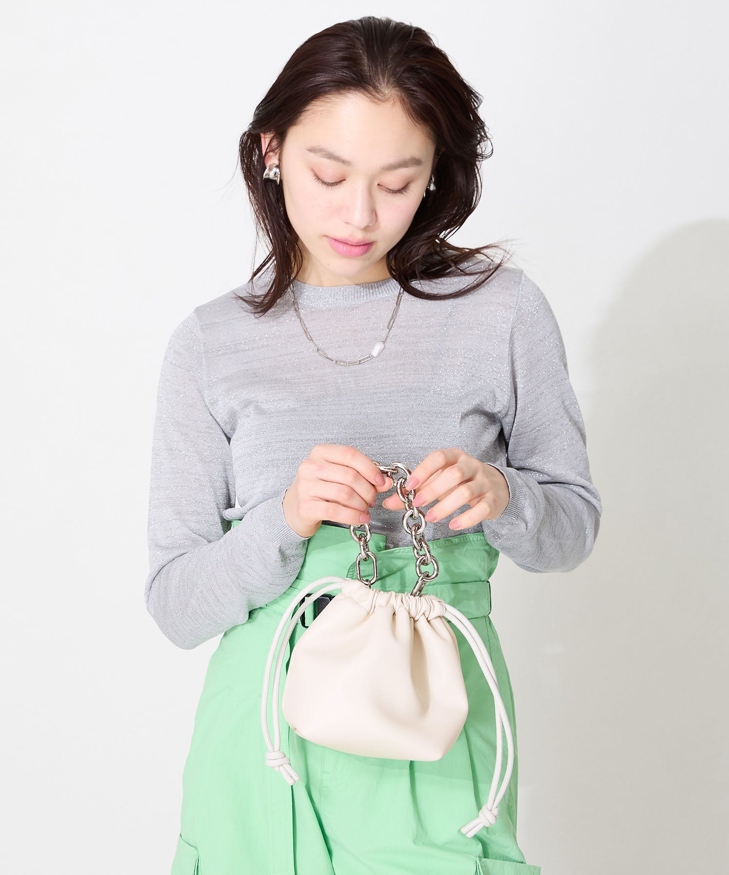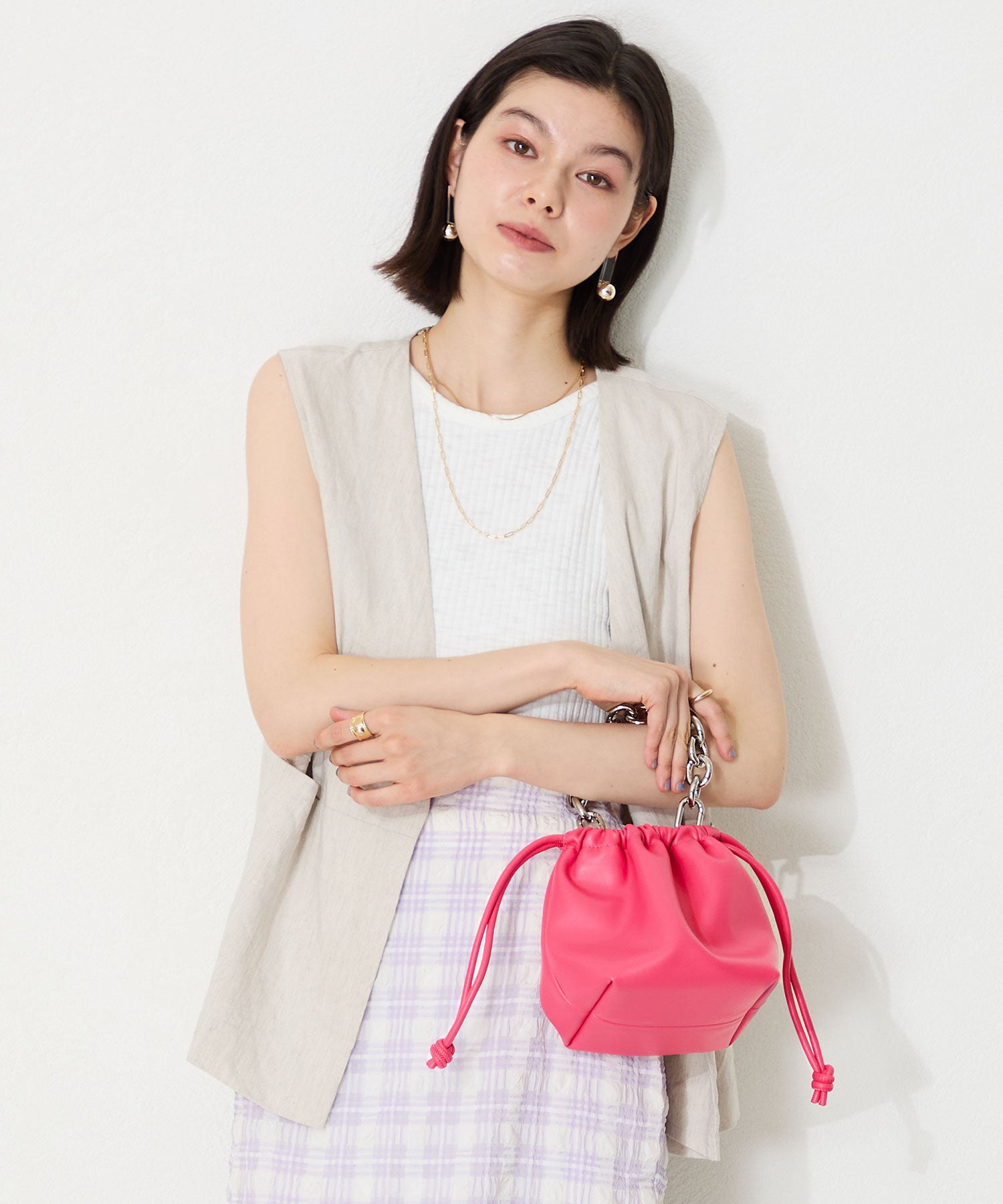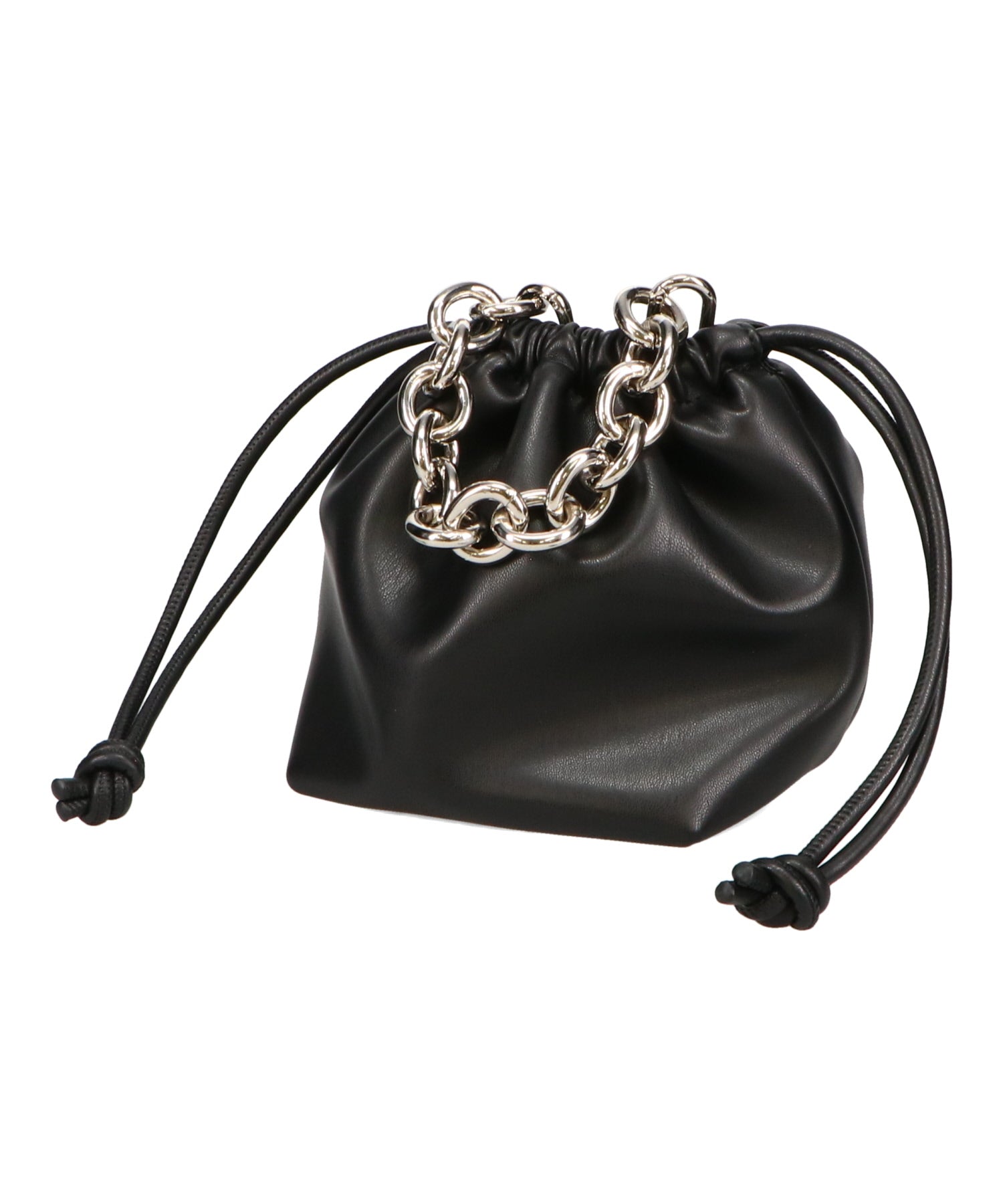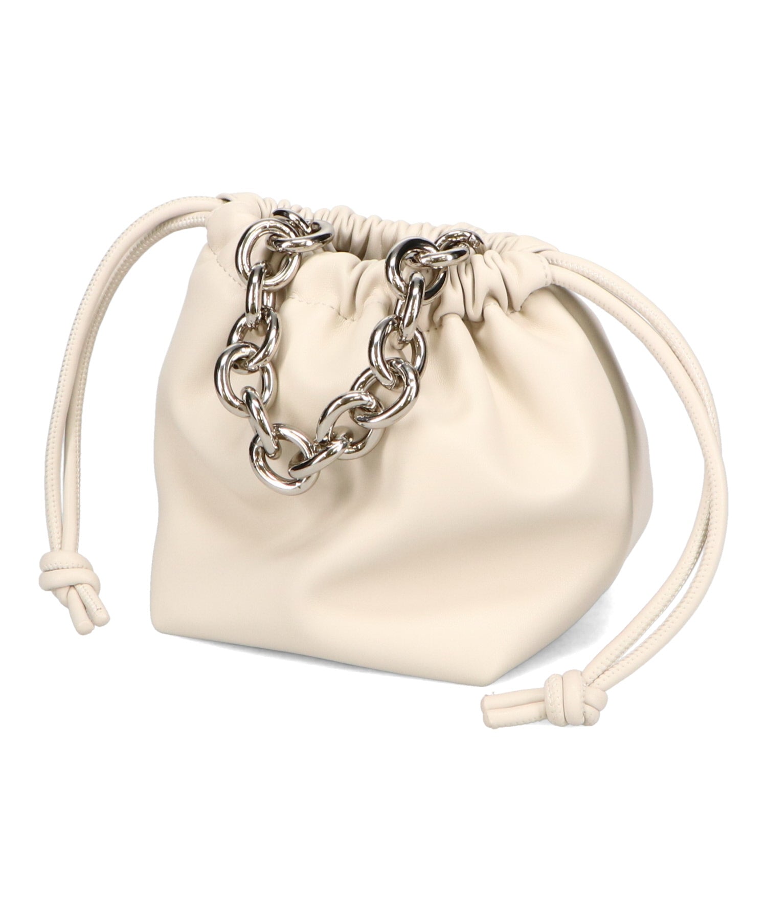 コロンとしたフォルムが可愛い巾着バッグは取り外し可能な太めのチェーンストラップで一気に雰囲気が変わるアイテム。本体と同色のショルダーストラップも付いているのでハンドバッグとしてだけではなく、肩掛けや斜め掛けも出来る優秀さも魅力。シンプルなデザインで季節問わず、どんなスタイルにも合わせやすい。