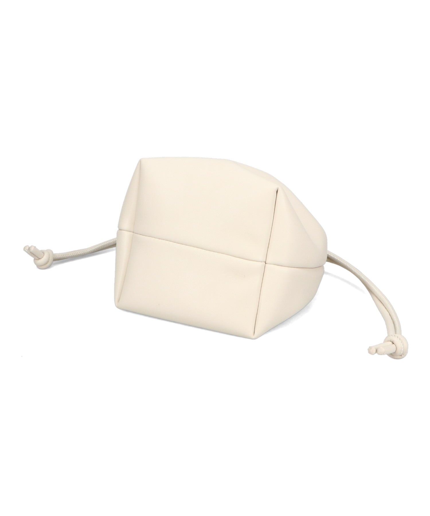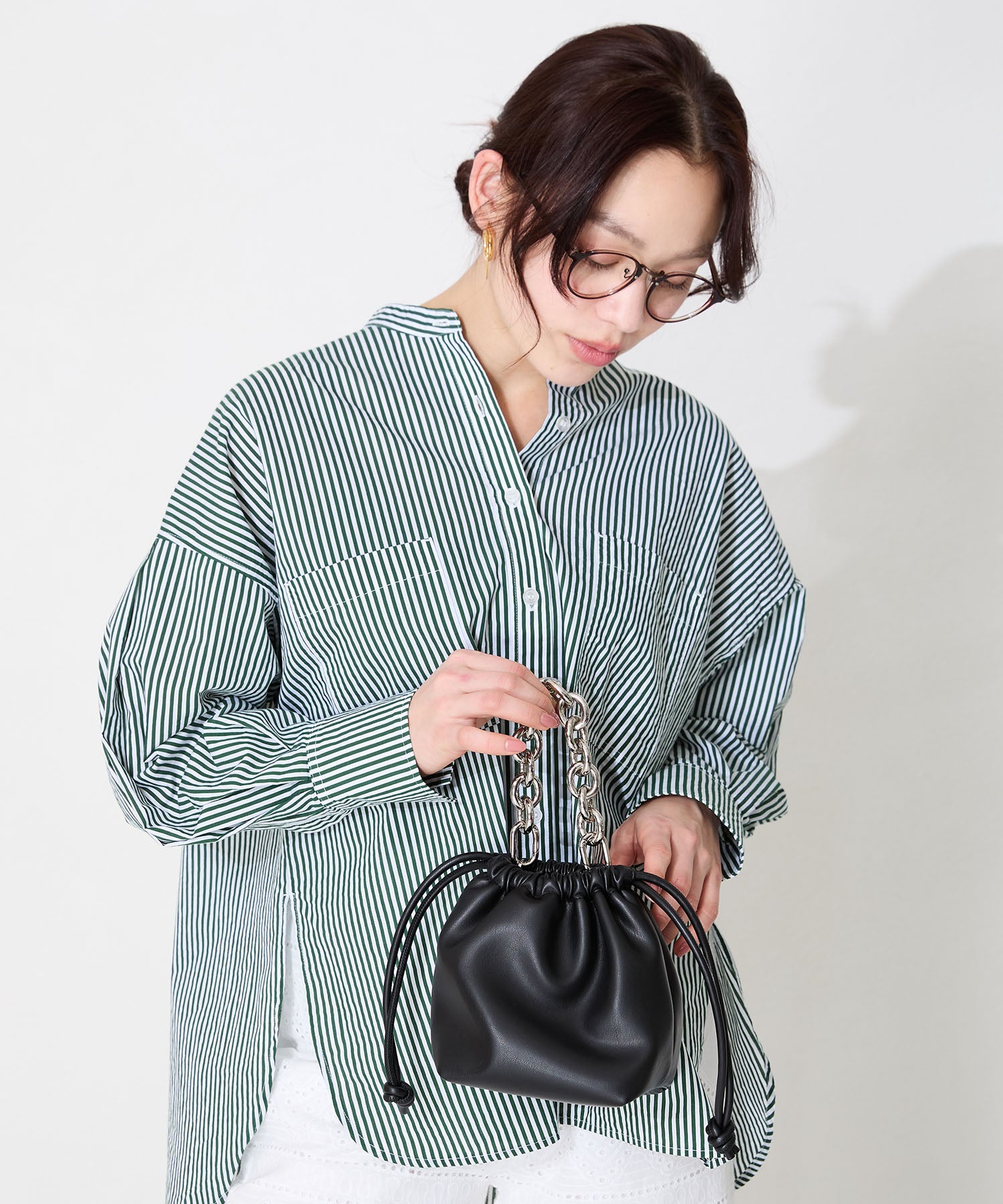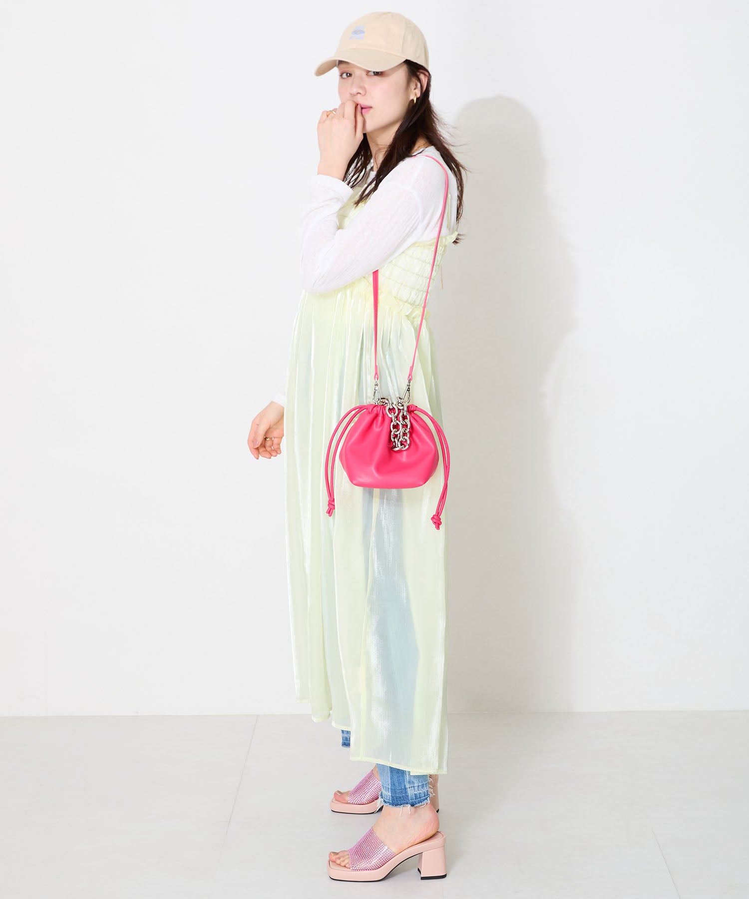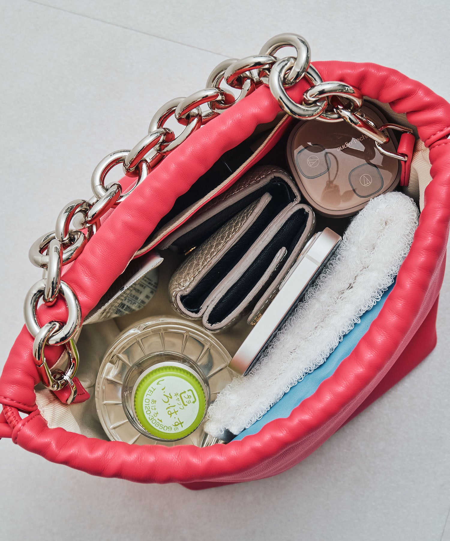 コロンとしたフォルムが可愛い巾着バッグは取り外し可能な太めのチェーンストラップで一気に雰囲気が変わるアイテム。本体と同色のショルダーストラップも付いているのでハンドバッグとしてだけではなく、肩掛けや斜め掛けも出来る優秀さも魅力。シンプルなデザインで季節問わず、どんなスタイルにも合わせやすい。