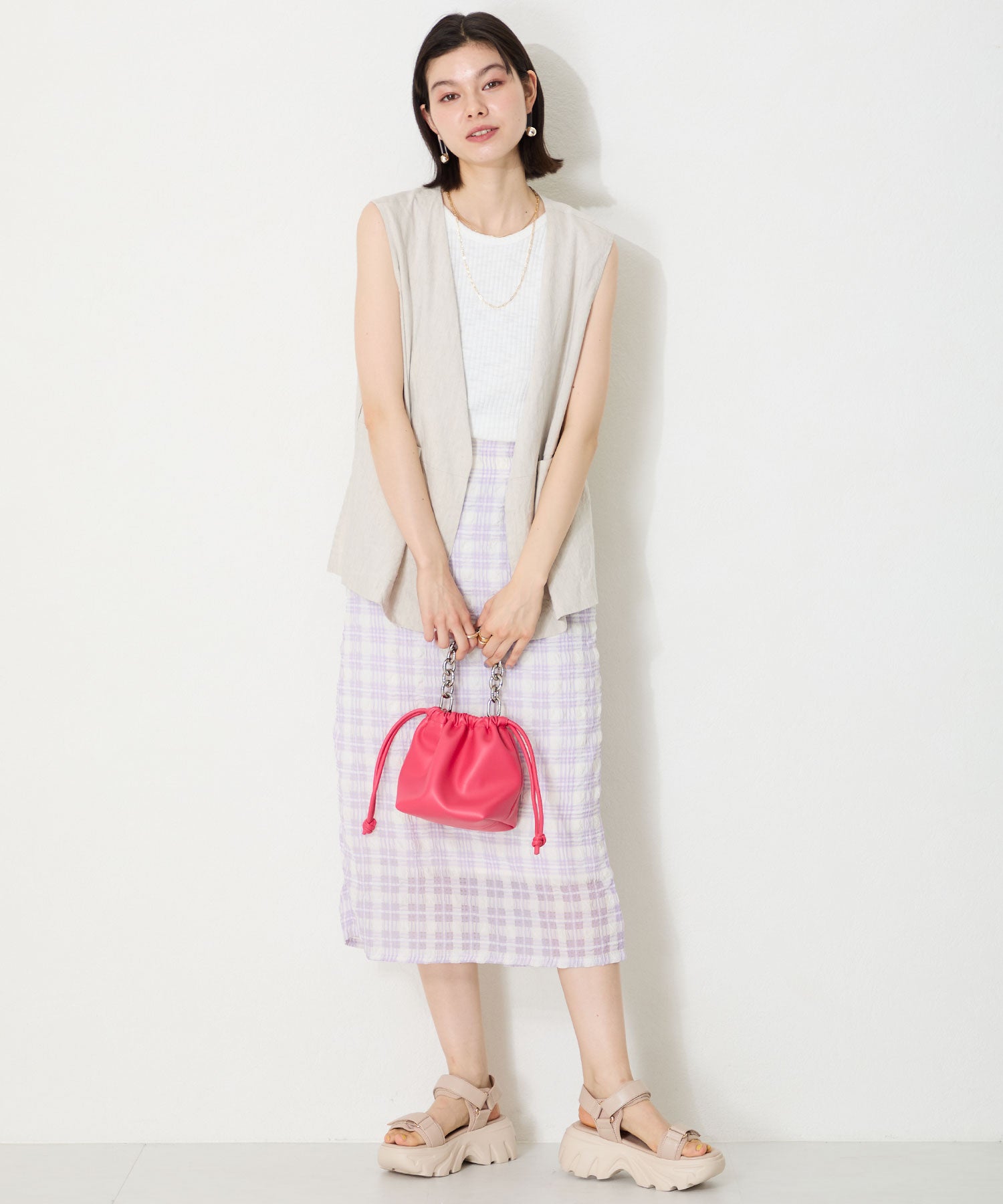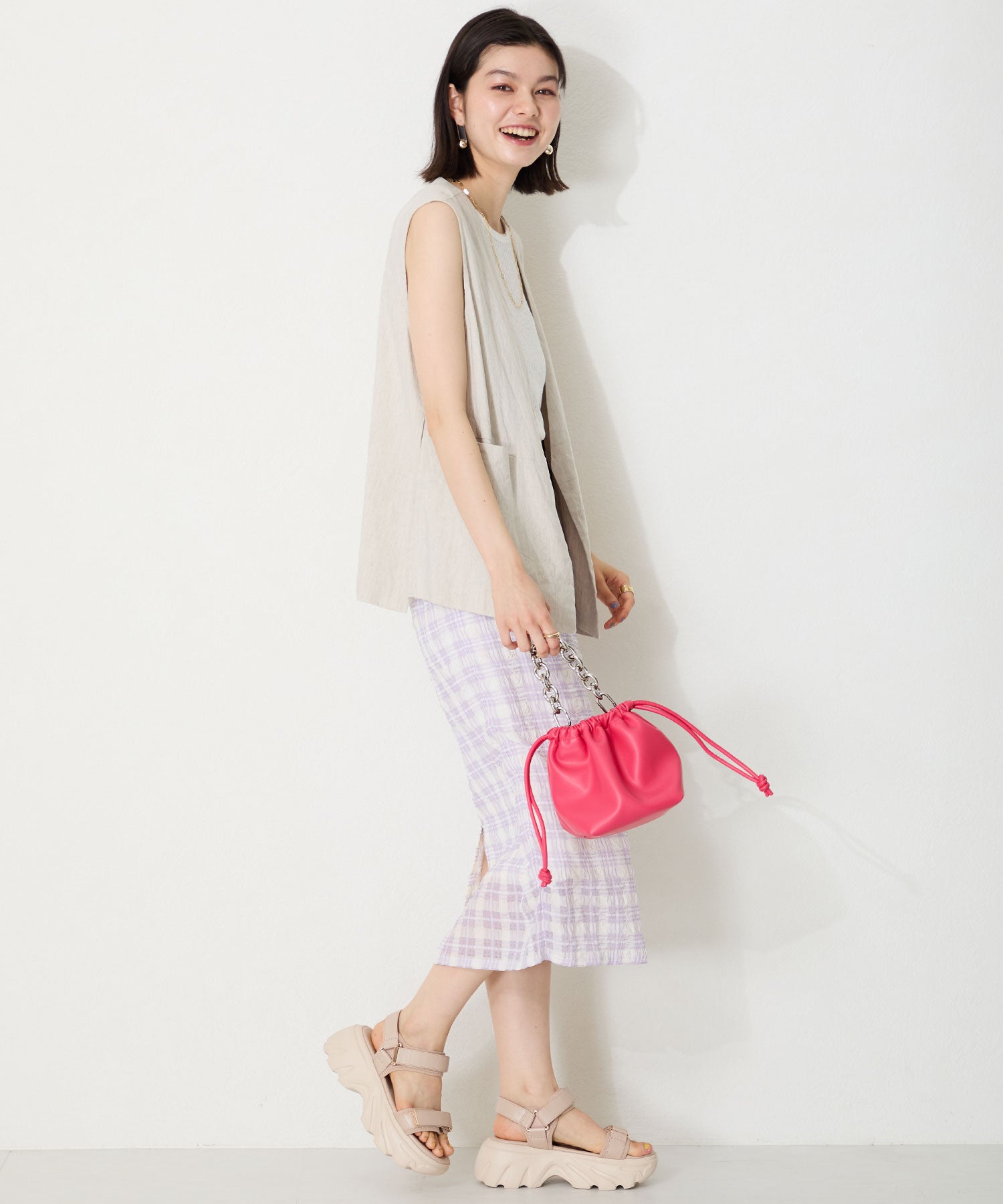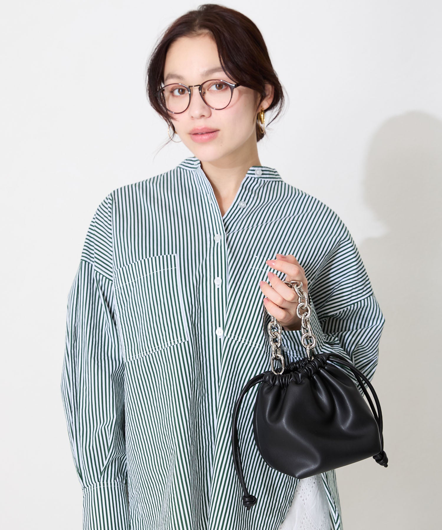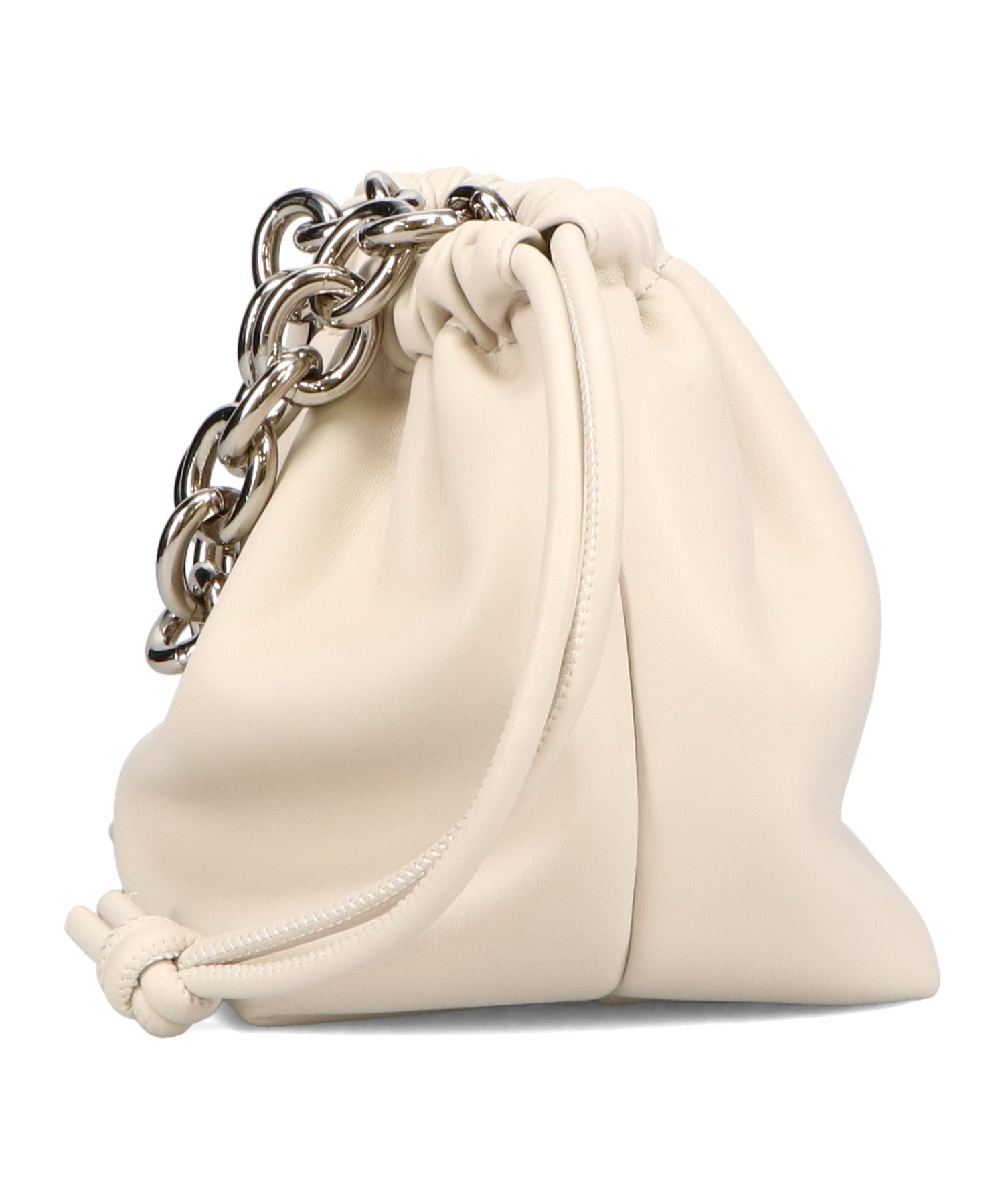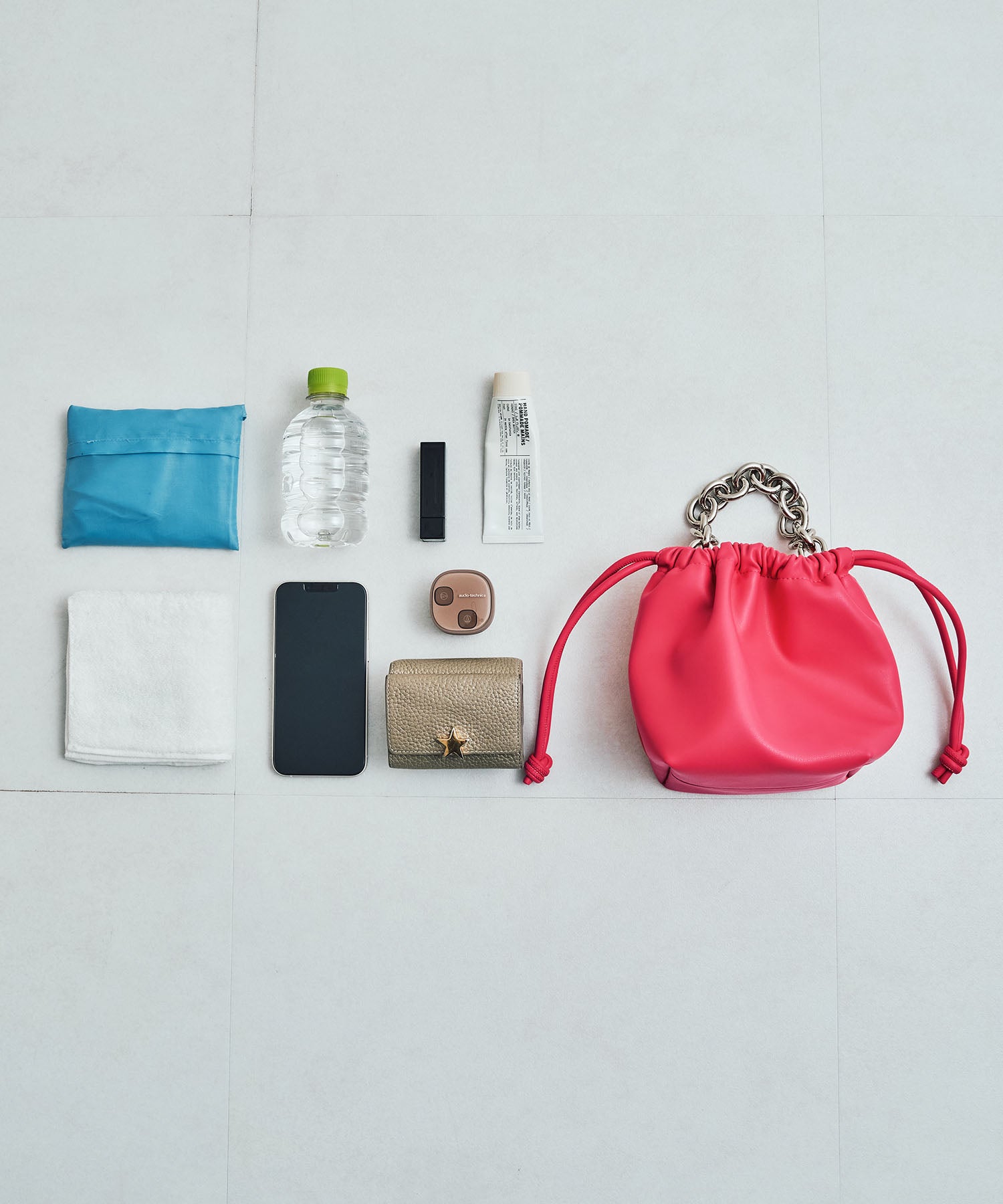 コロンとしたフォルムが可愛い巾着バッグは取り外し可能な太めのチェーンストラップで一気に雰囲気が変わるアイテム。本体と同色のショルダーストラップも付いているのでハンドバッグとしてだけではなく、肩掛けや斜め掛けも出来る優秀さも魅力。シンプルなデザインで季節問わず、どんなスタイルにも合わせやすい。