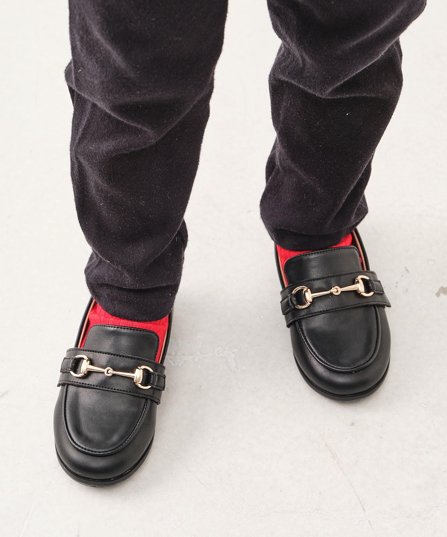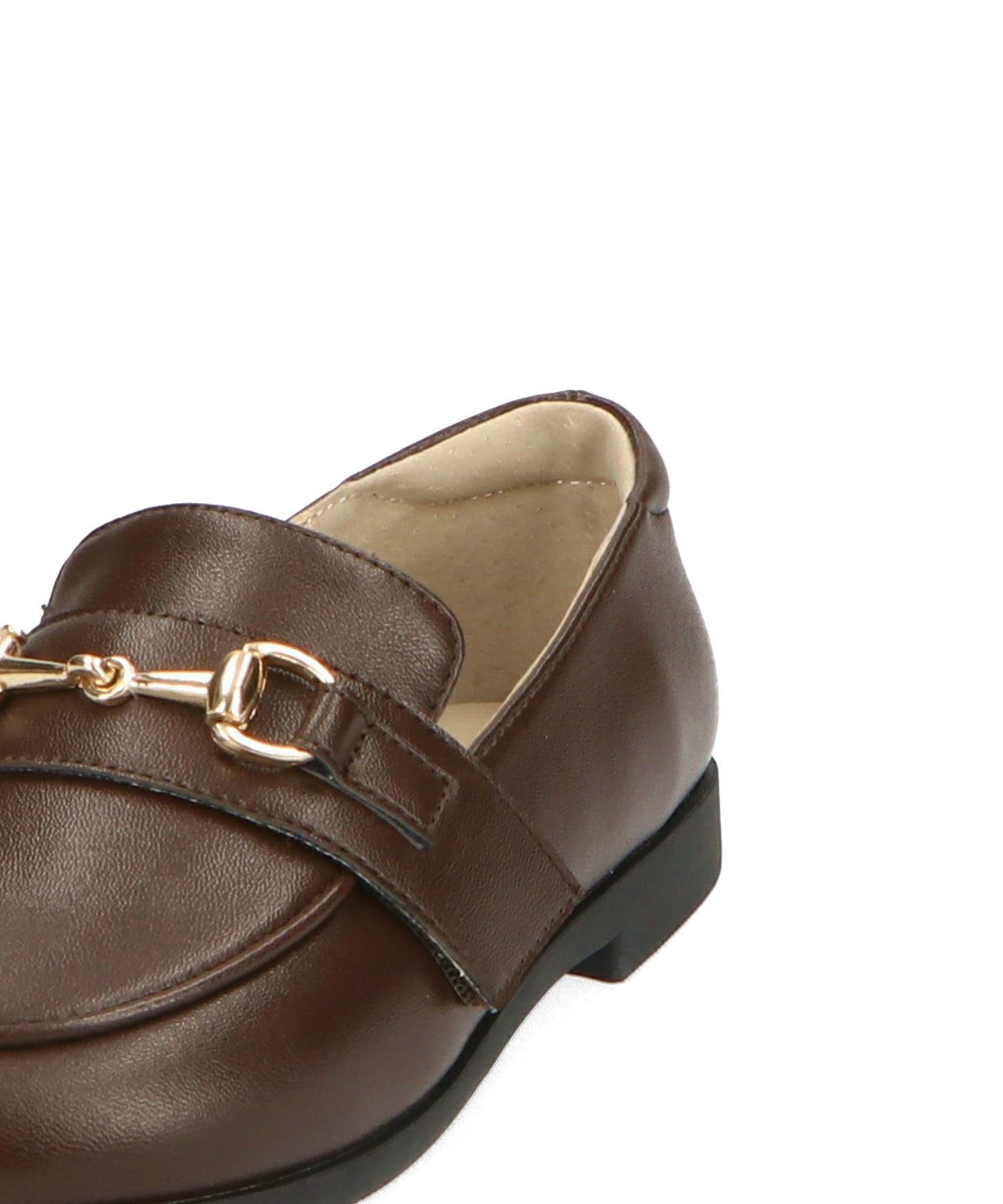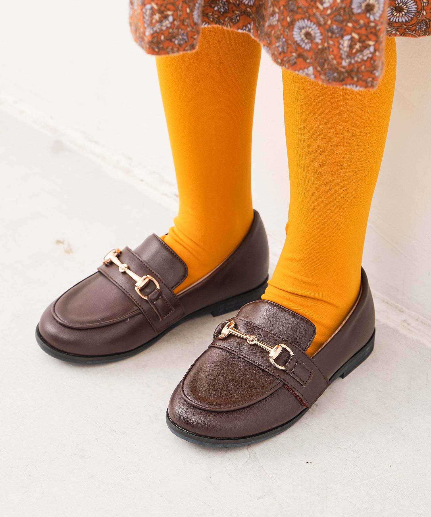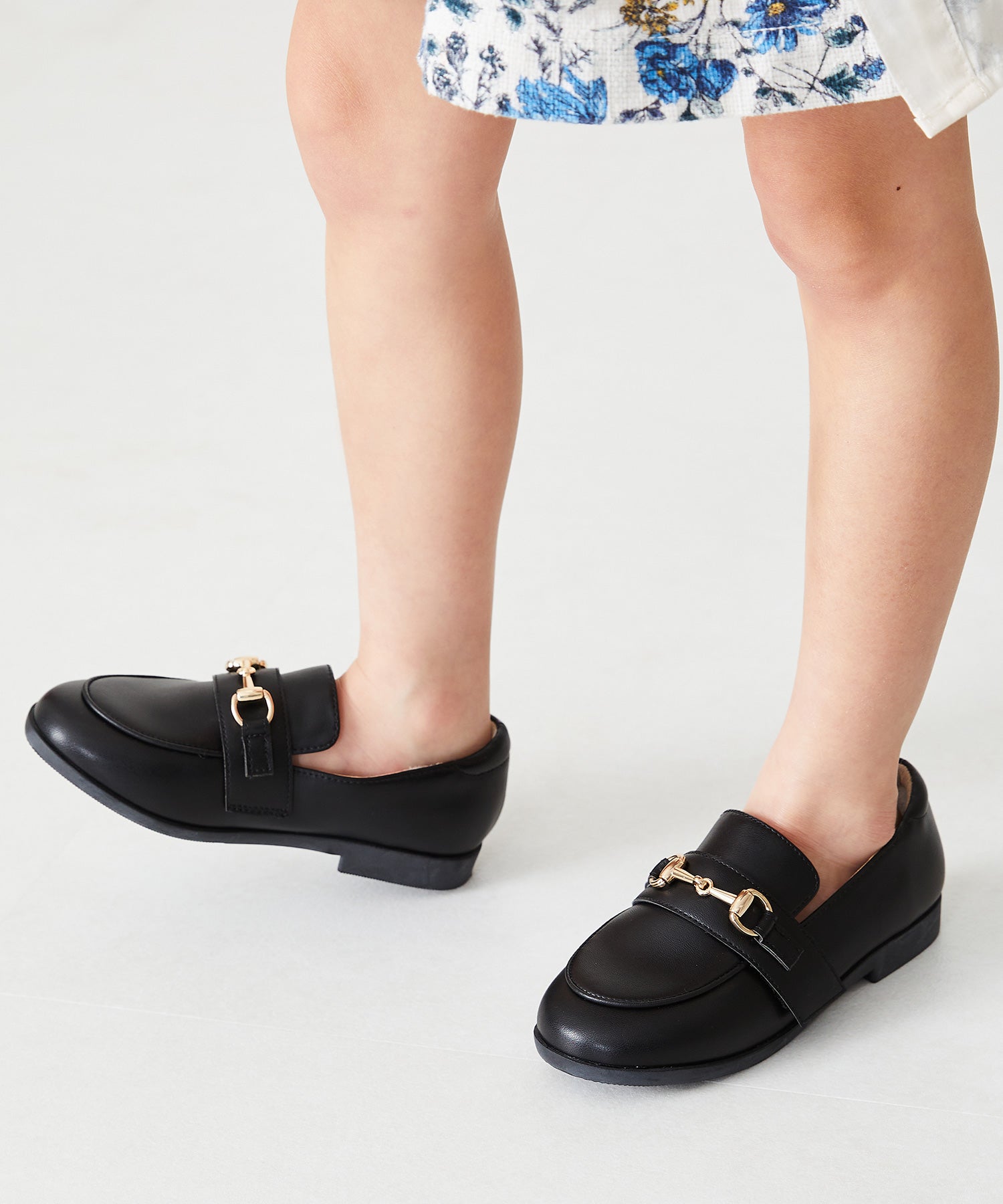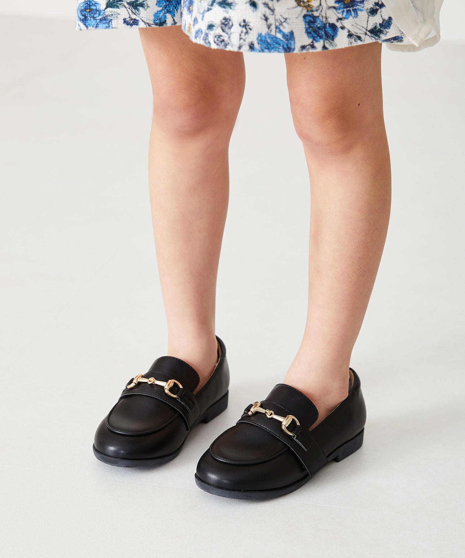 ゴールドのビットモチーフが高級感たっぷりなローファーは、マットな質感のスムース素材を使用し、カジュアルでもオケージョンでも使いやすく仕上げた1足。甲部分はマジックテープで着脱ができ、クッション入りで履き心地も抜群。靴下やタイツ合わせもおすすめ。