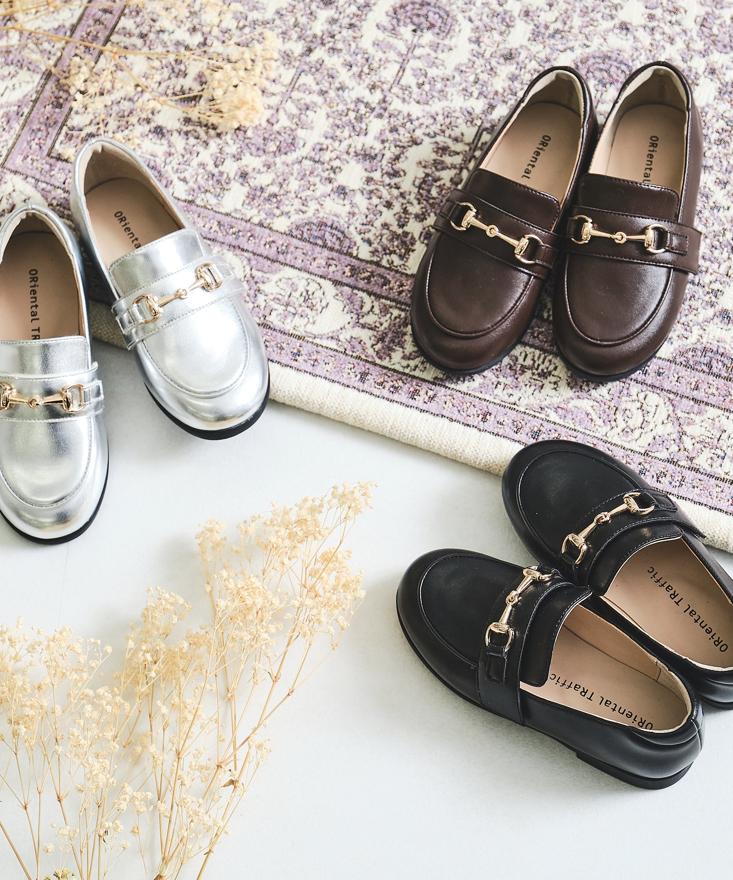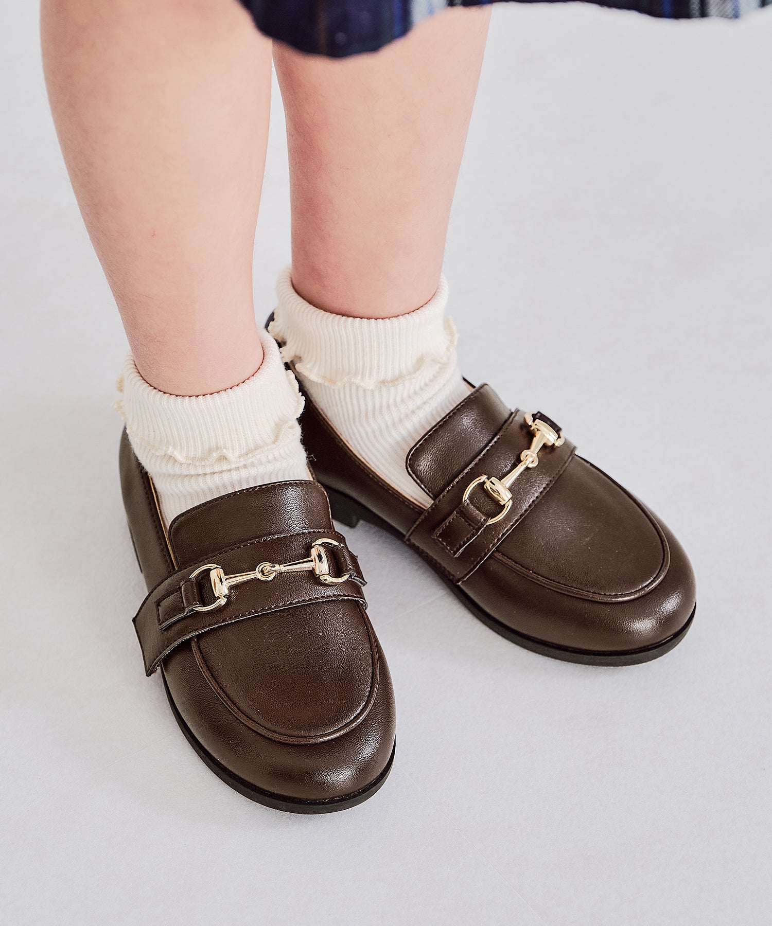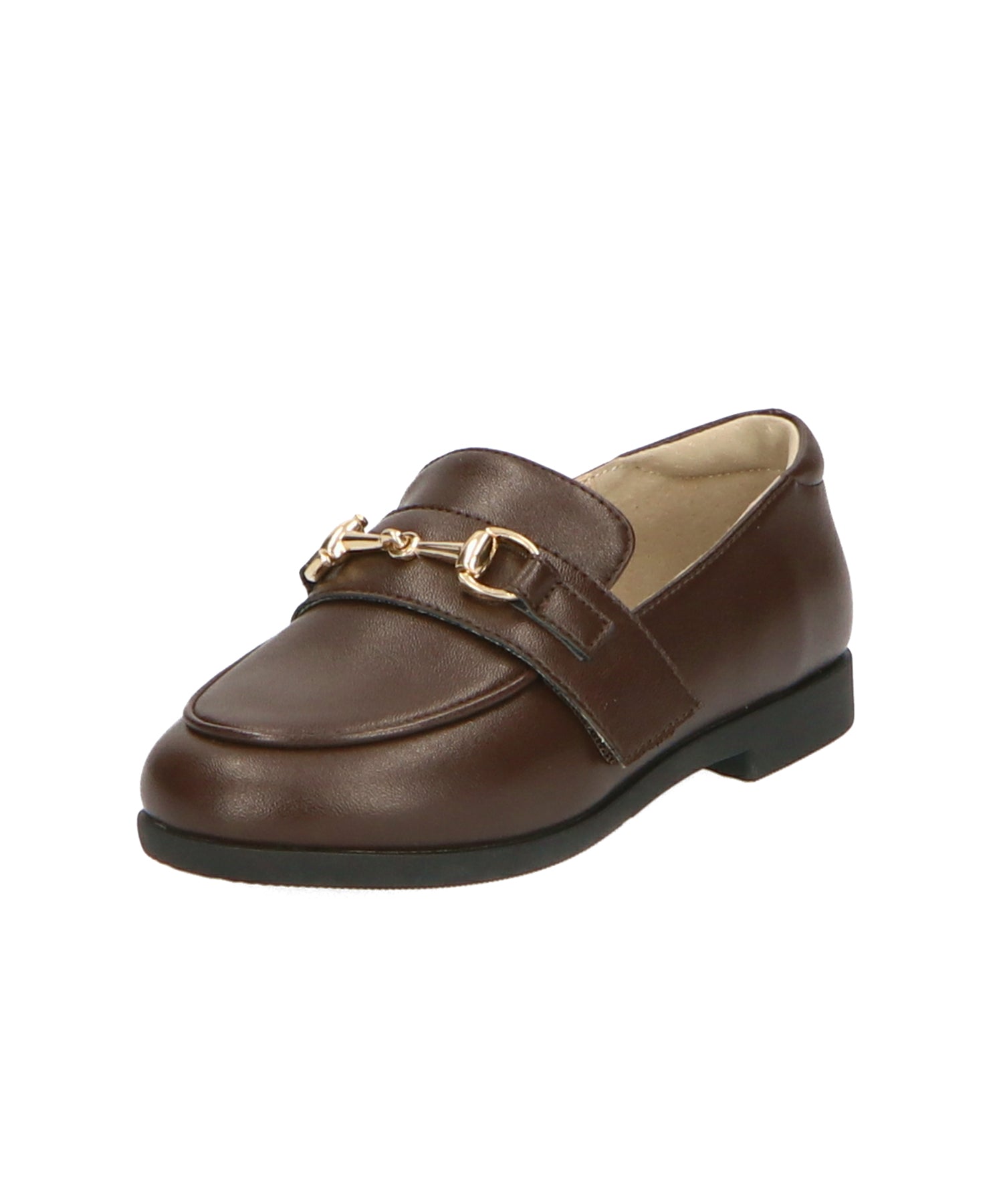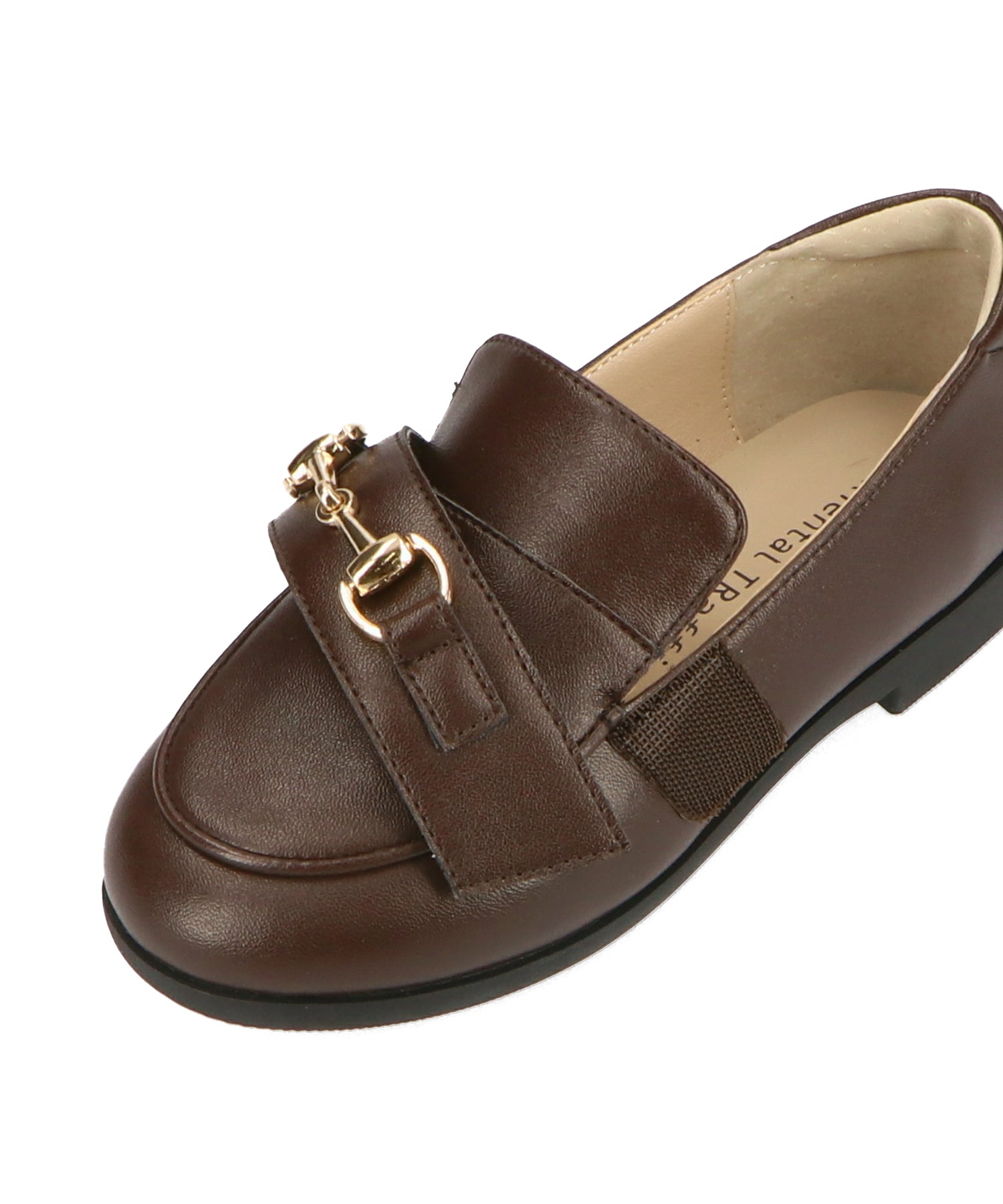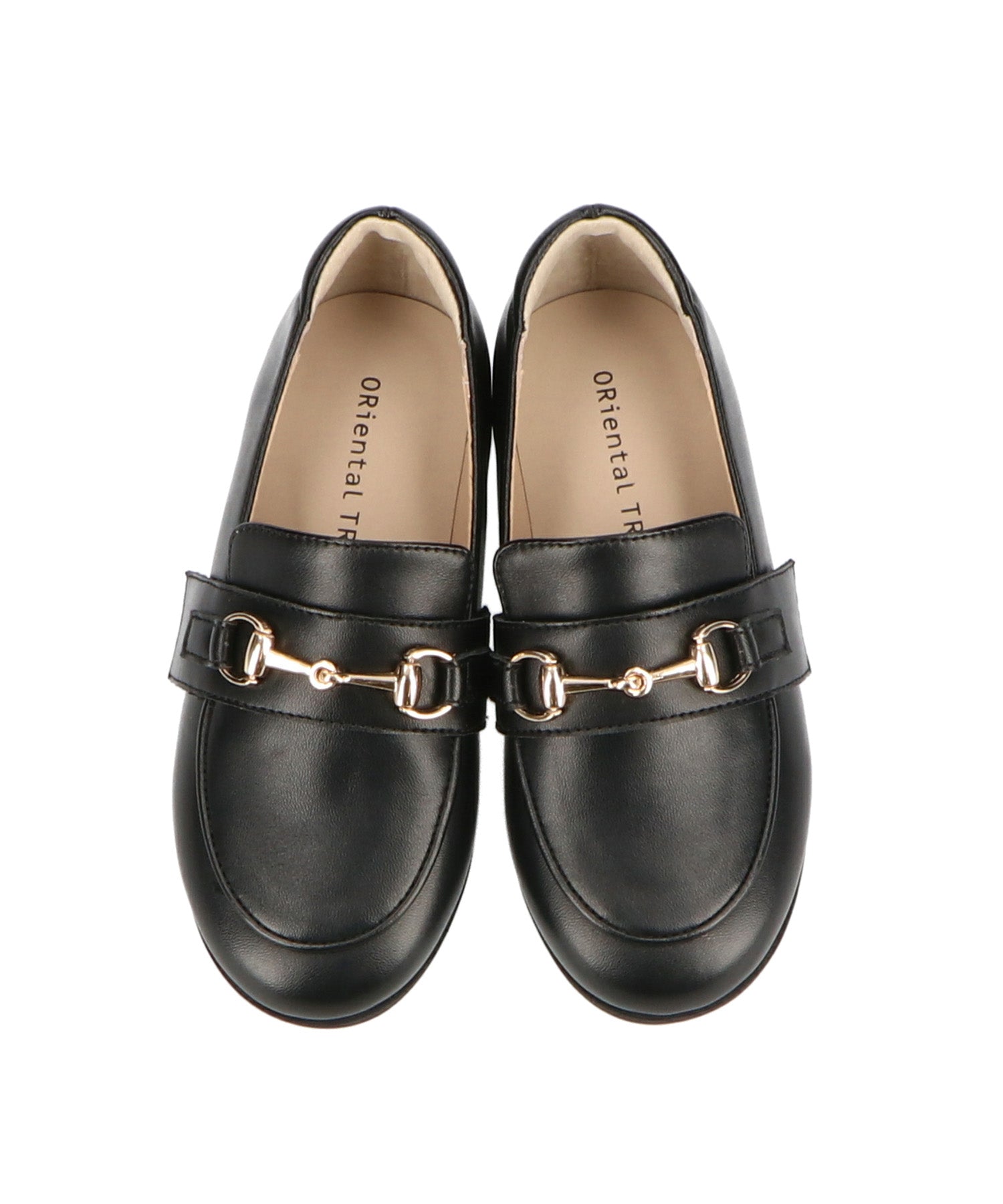 ゴールドのビットモチーフが高級感たっぷりなローファーは、マットな質感のスムース素材を使用し、カジュアルでもオケージョンでも使いやすく仕上げた1足。甲部分はマジックテープで着脱ができ、クッション入りで履き心地も抜群。靴下やタイツ合わせもおすすめ。