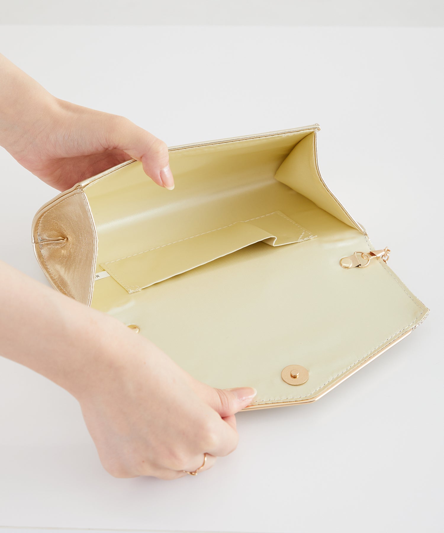 フラップ部分に使用した大粒のグリッターと同色のメタリックコンビで、ワンカラーでも華やかな印象に。ショルダータイプのチェーンは取り外し可能な2way仕様で、結婚式や二次会、お呼ばれのどんなシーンにも活躍してくれる。
