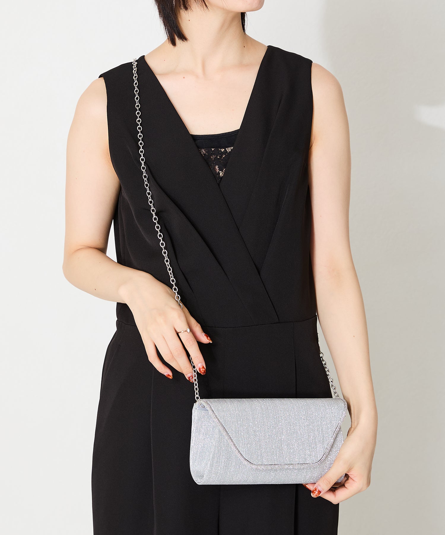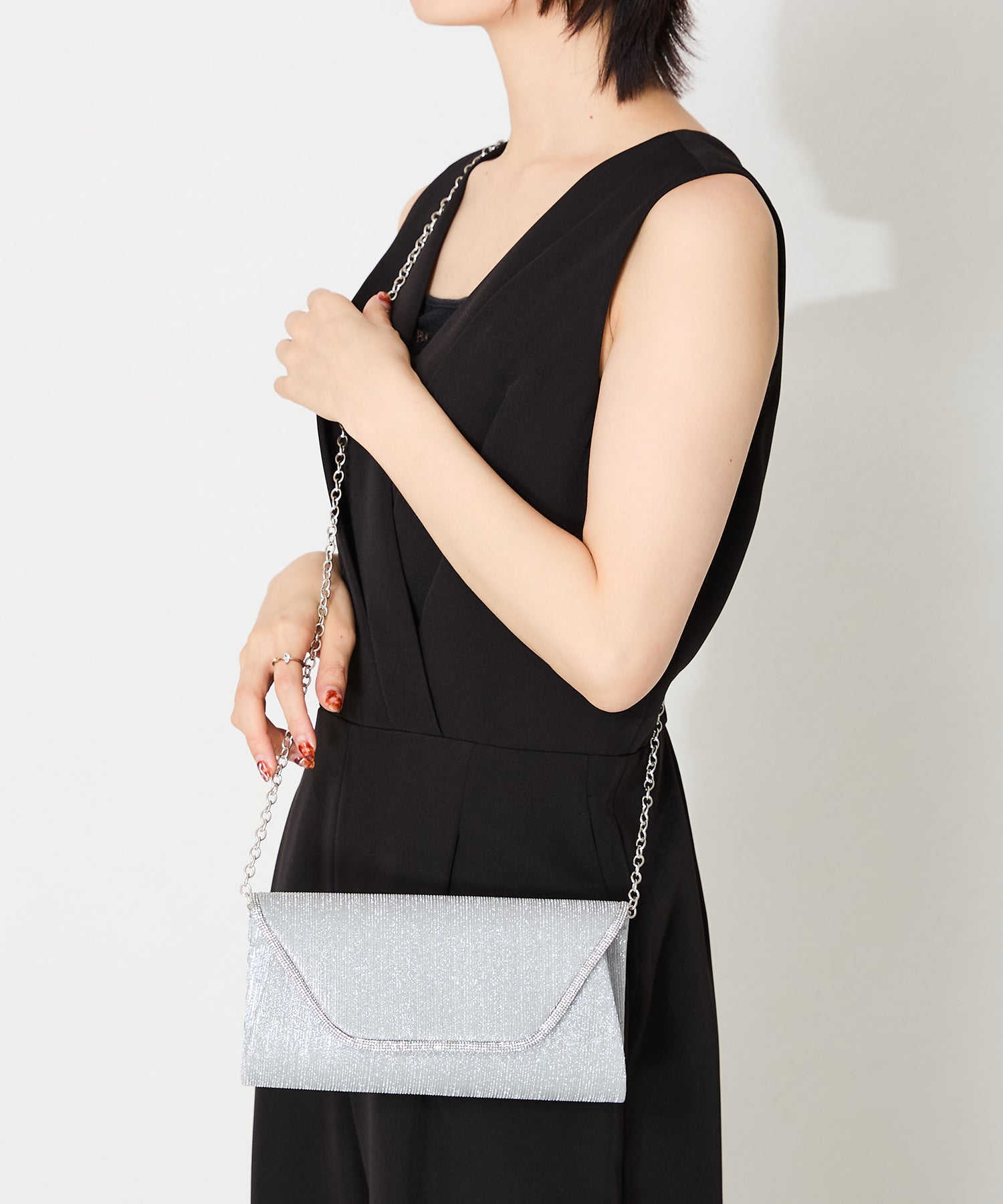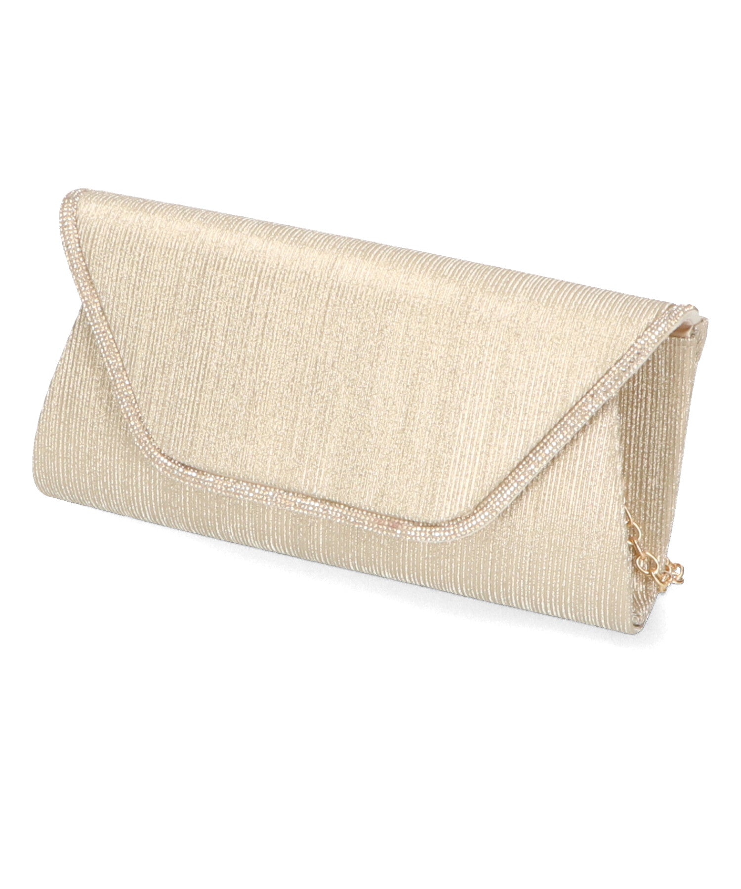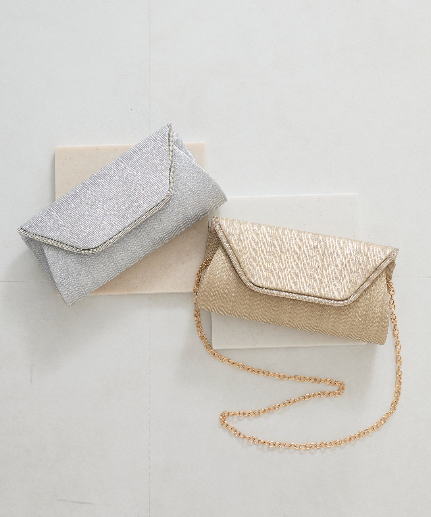 手元をすっきりと上品な印象を与えてくれるクラッチバッグは、取り外し可能なチェーンストラップ付きの2way仕様。鮮やかなサテンプリーツ×ラインストーンのパイピングデザインで高級感があり、華やかなパーティーシーンにぴったり。ゴールドとシルバーの2色展開なのでどんなテイストのドレスとも合わせやすい。