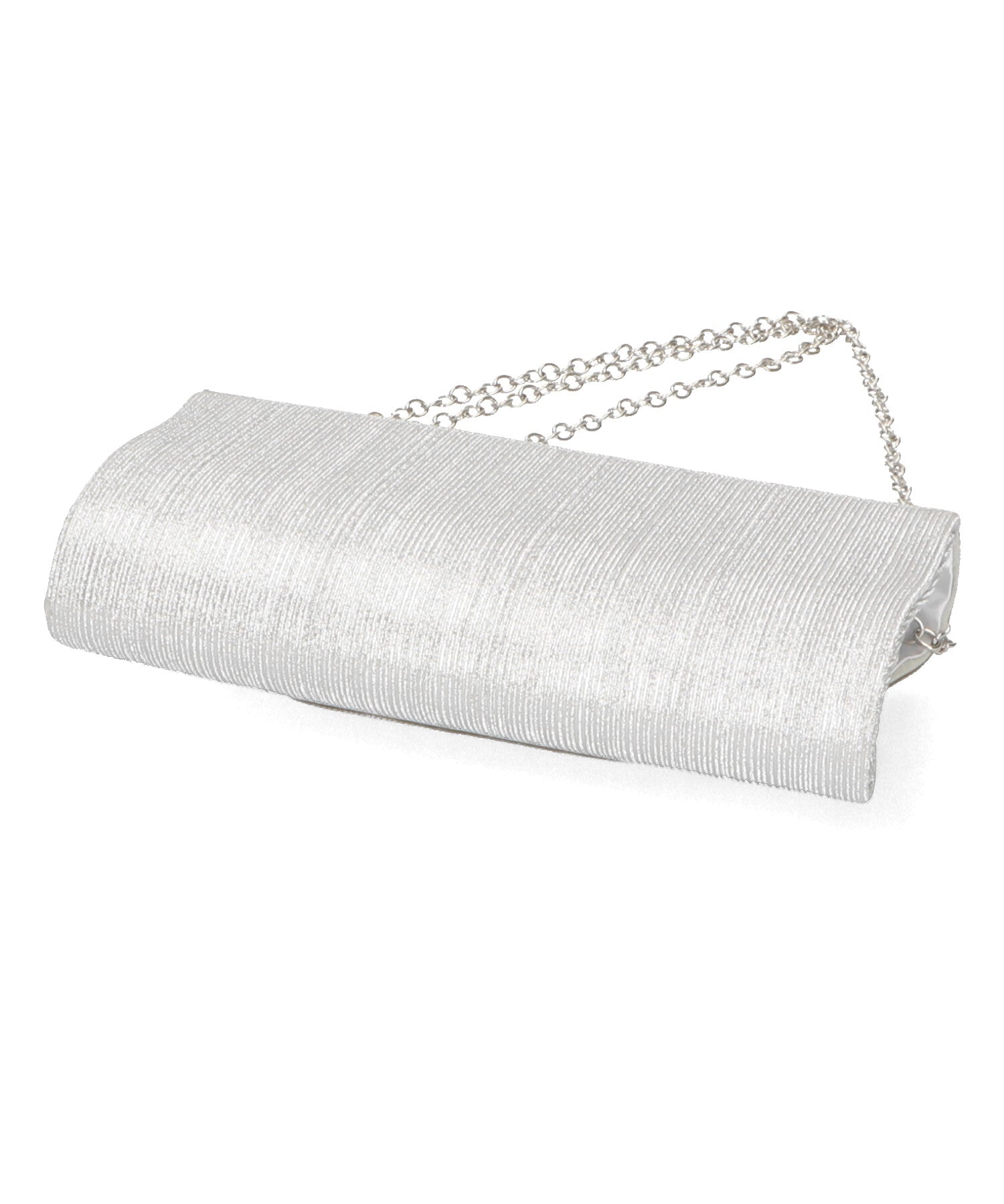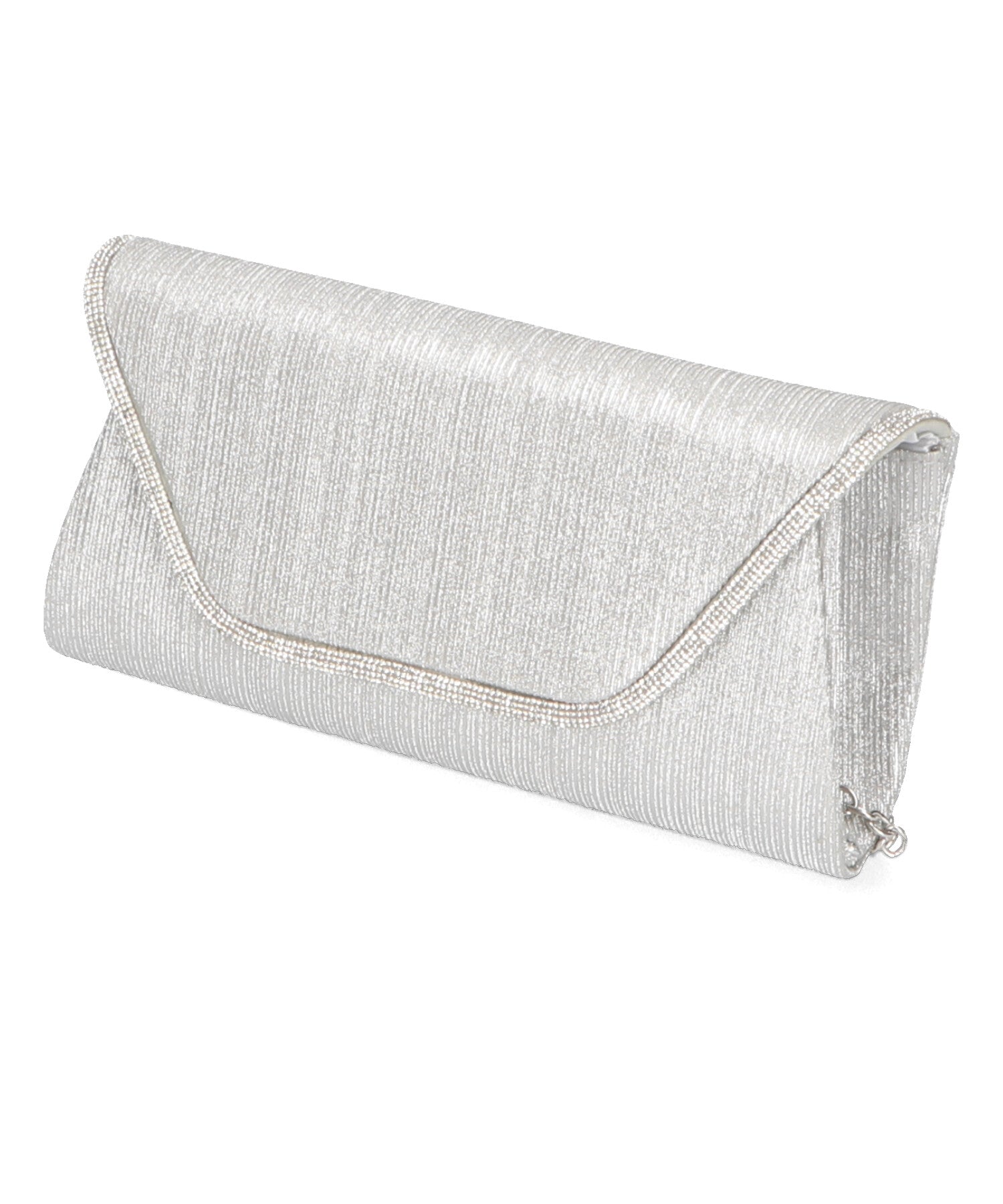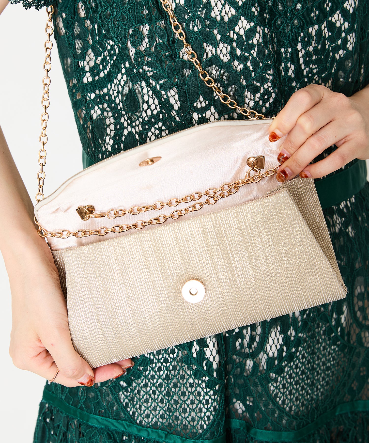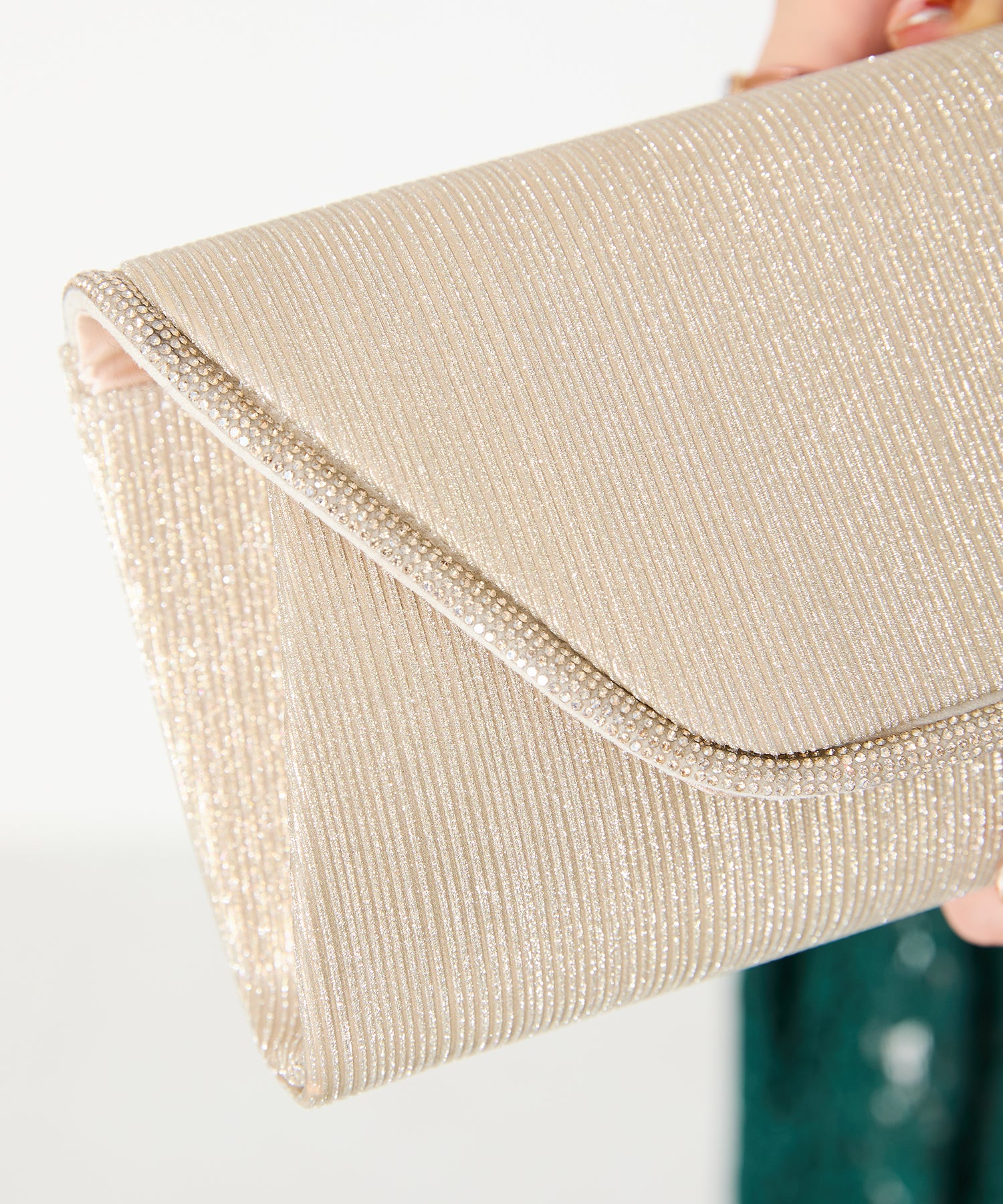 手元をすっきりと上品な印象を与えてくれるクラッチバッグは、取り外し可能なチェーンストラップ付きの2way仕様。鮮やかなサテンプリーツ×ラインストーンのパイピングデザインで高級感があり、華やかなパーティーシーンにぴったり。ゴールドとシルバーの2色展開なのでどんなテイストのドレスとも合わせやすい。