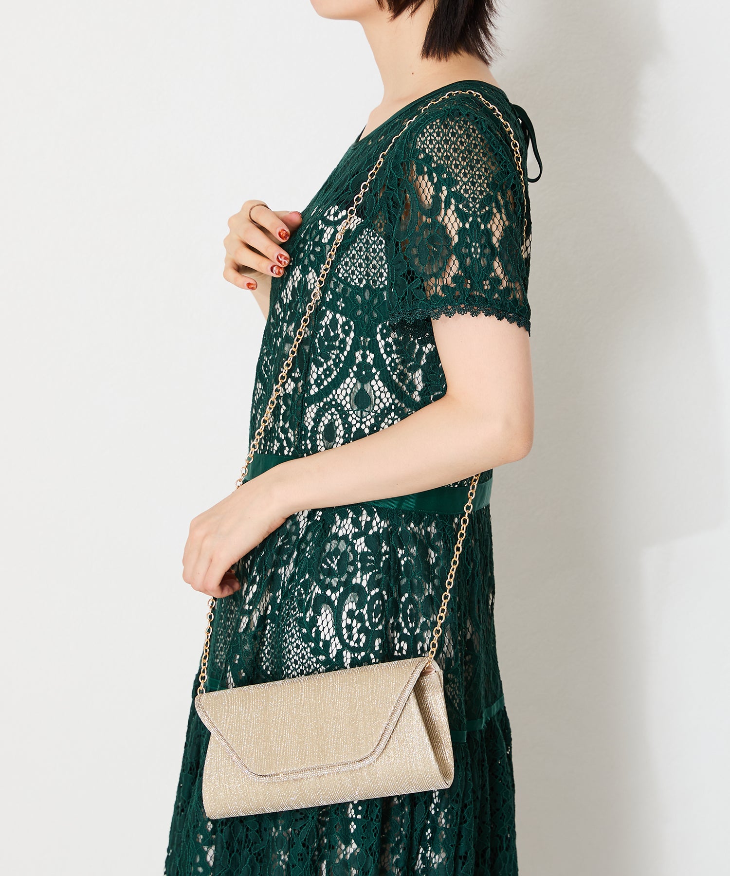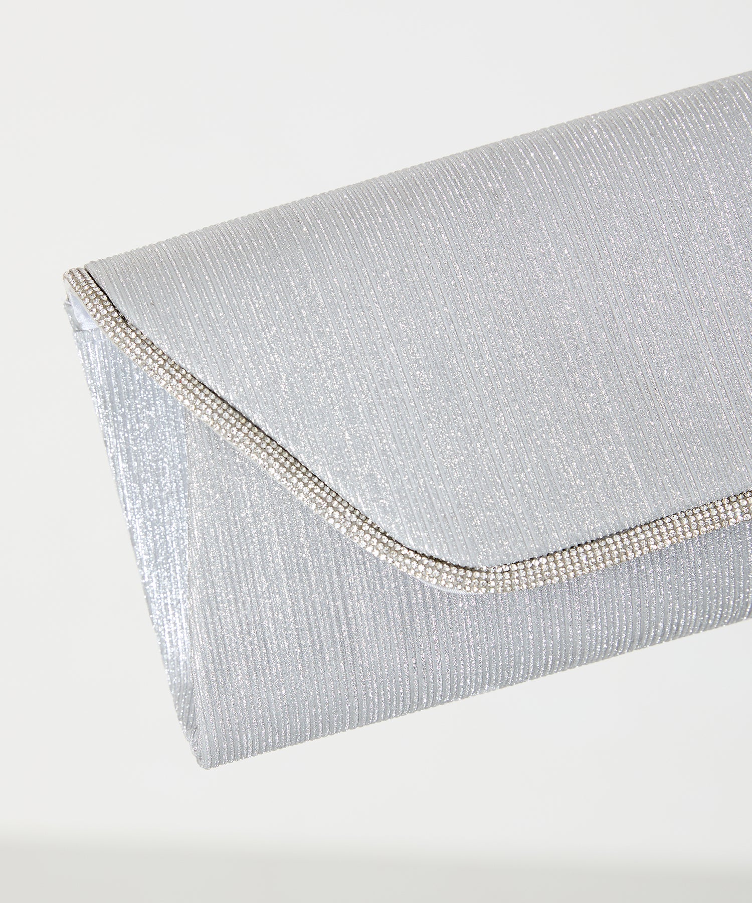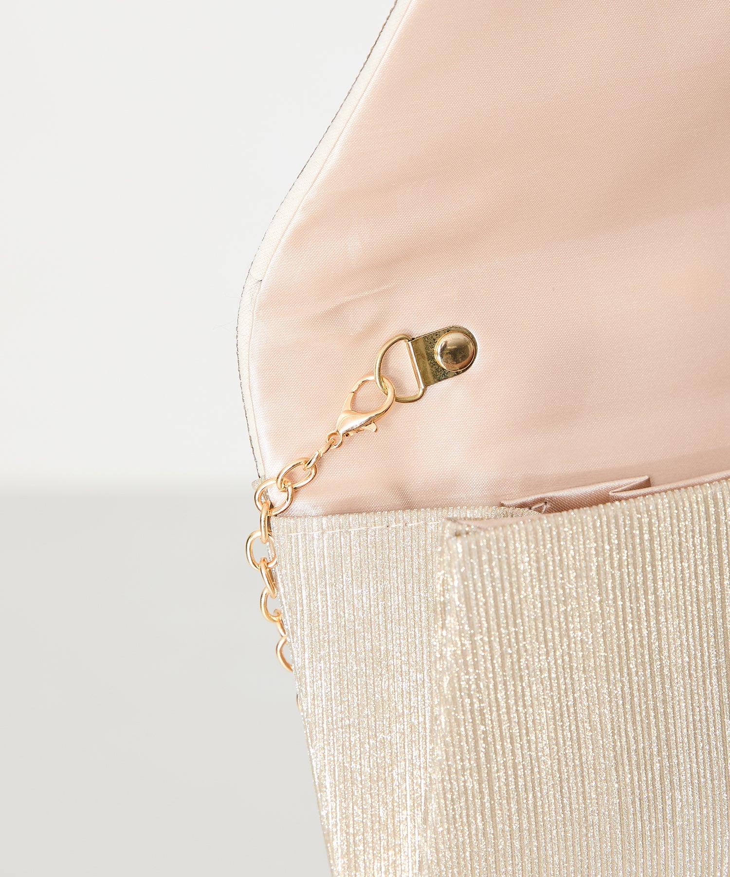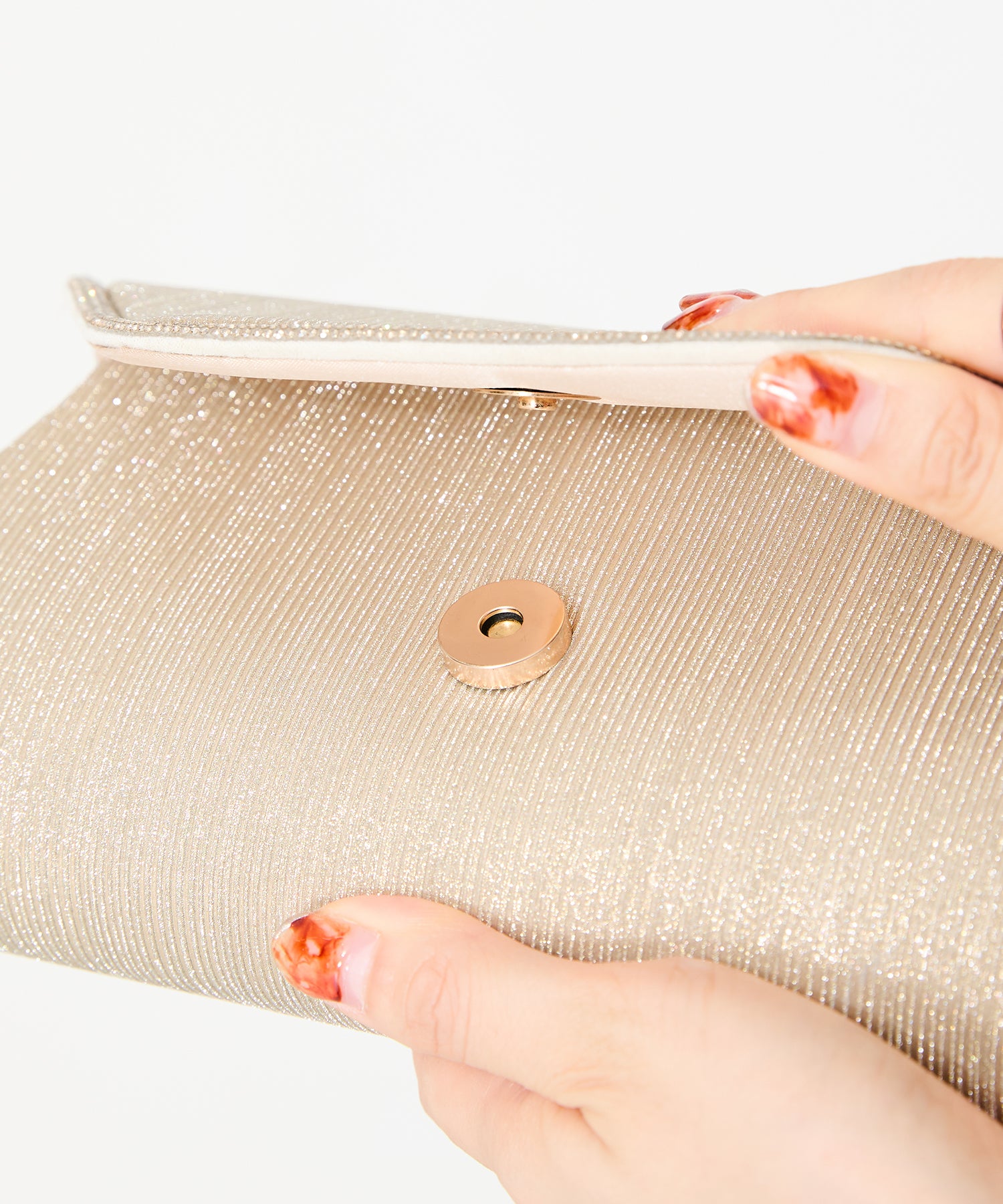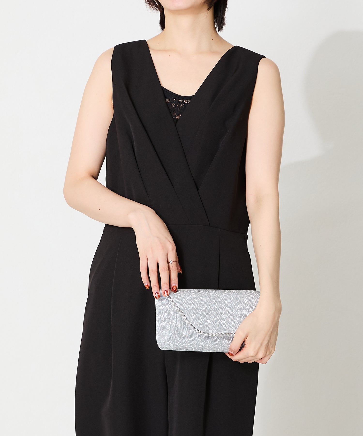 手元をすっきりと上品な印象を与えてくれるクラッチバッグは、取り外し可能なチェーンストラップ付きの2way仕様。鮮やかなサテンプリーツ×ラインストーンのパイピングデザインで高級感があり、華やかなパーティーシーンにぴったり。ゴールドとシルバーの2色展開なのでどんなテイストのドレスとも合わせやすい。