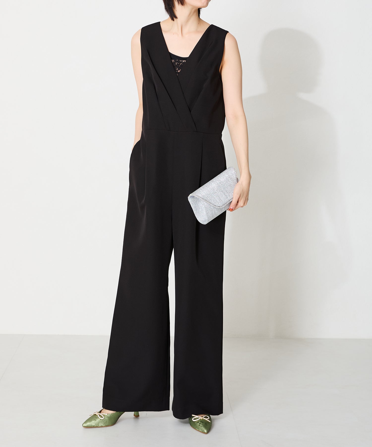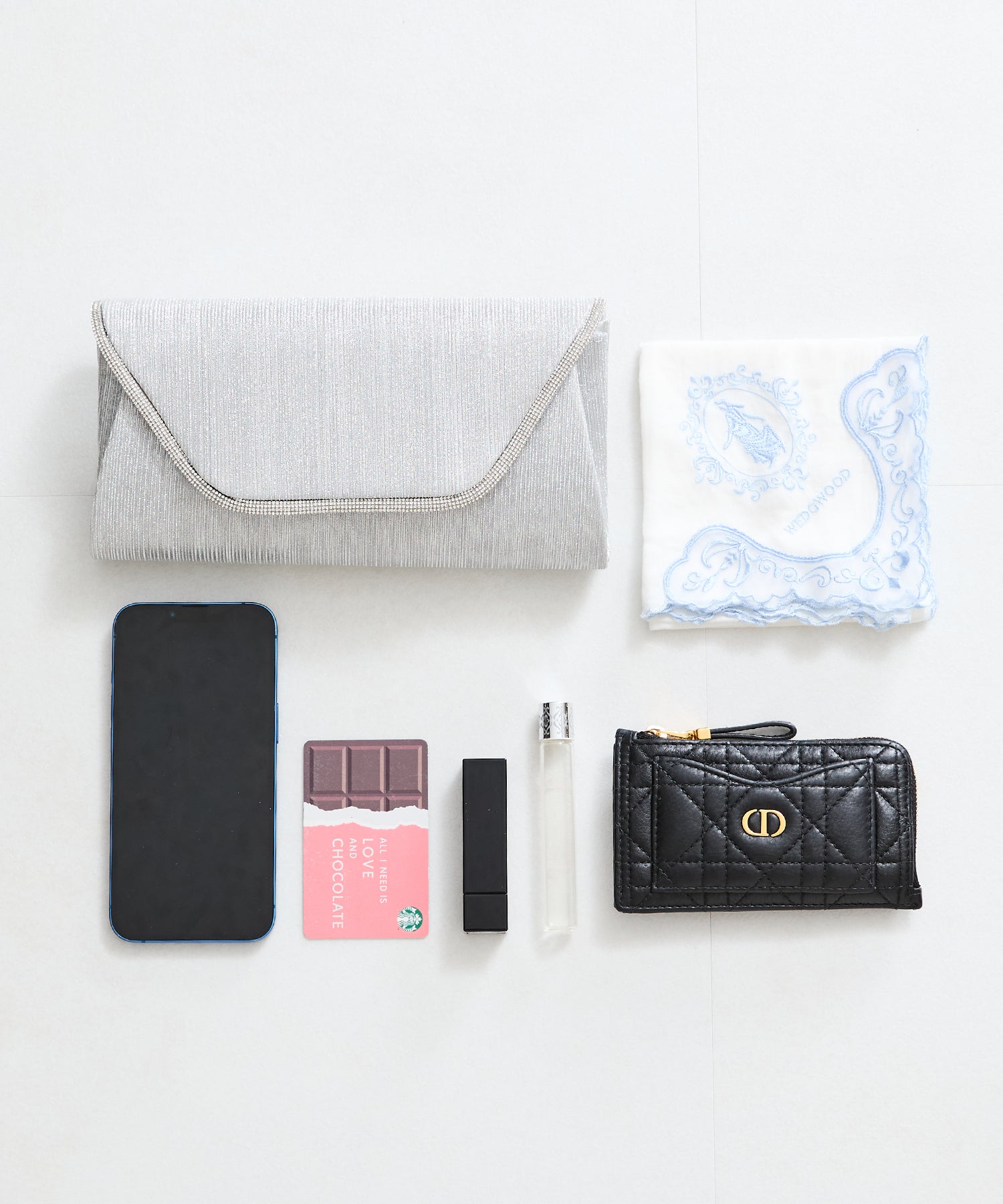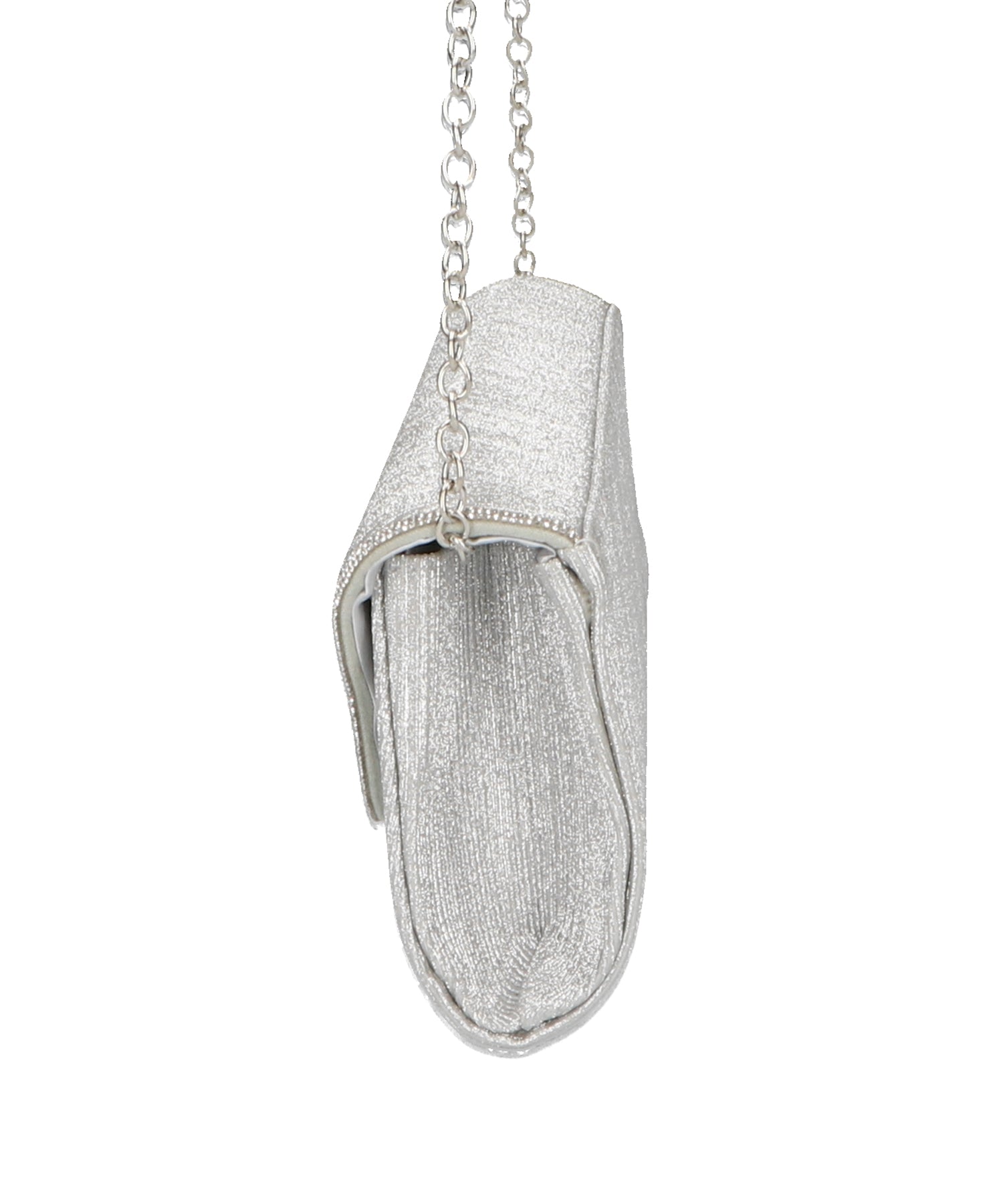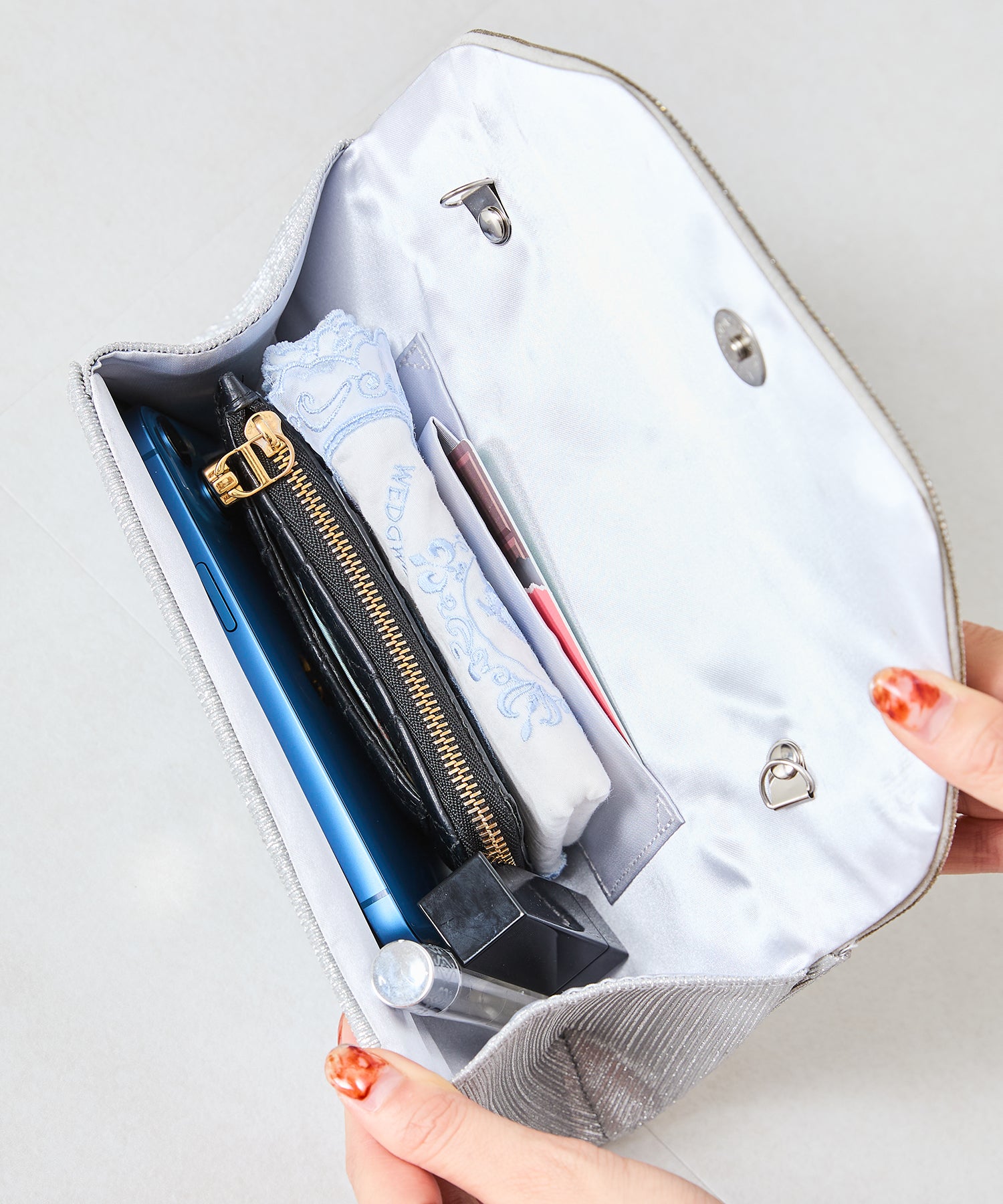 手元をすっきりと上品な印象を与えてくれるクラッチバッグは、取り外し可能なチェーンストラップ付きの2way仕様。鮮やかなサテンプリーツ×ラインストーンのパイピングデザインで高級感があり、華やかなパーティーシーンにぴったり。ゴールドとシルバーの2色展開なのでどんなテイストのドレスとも合わせやすい。
