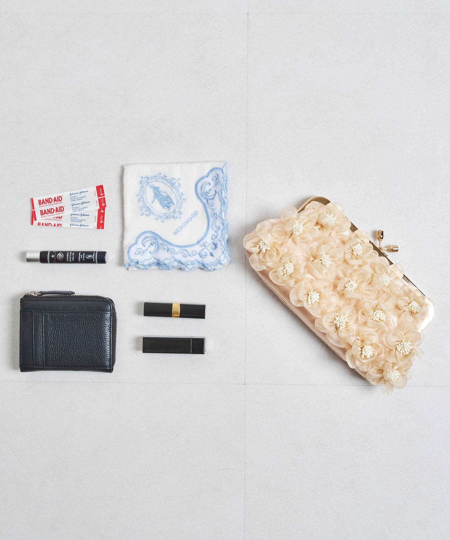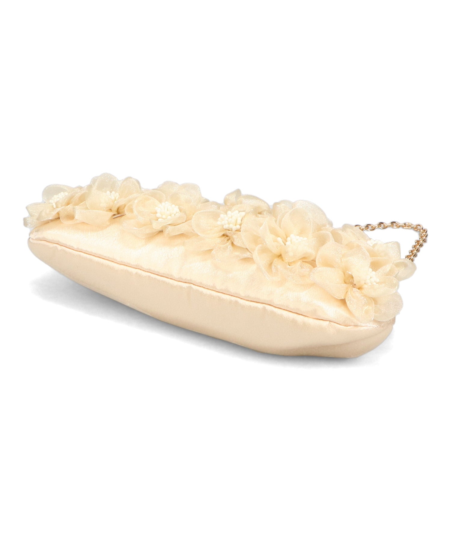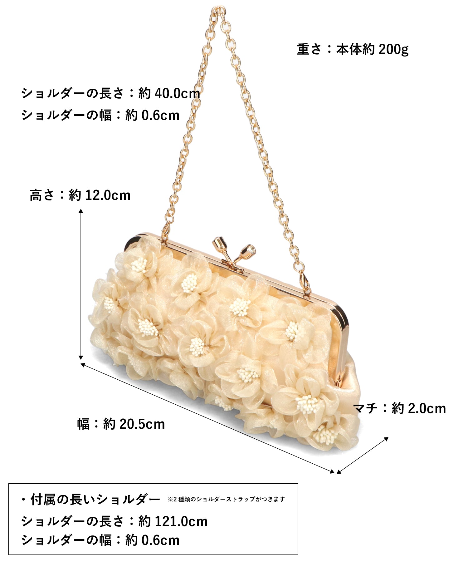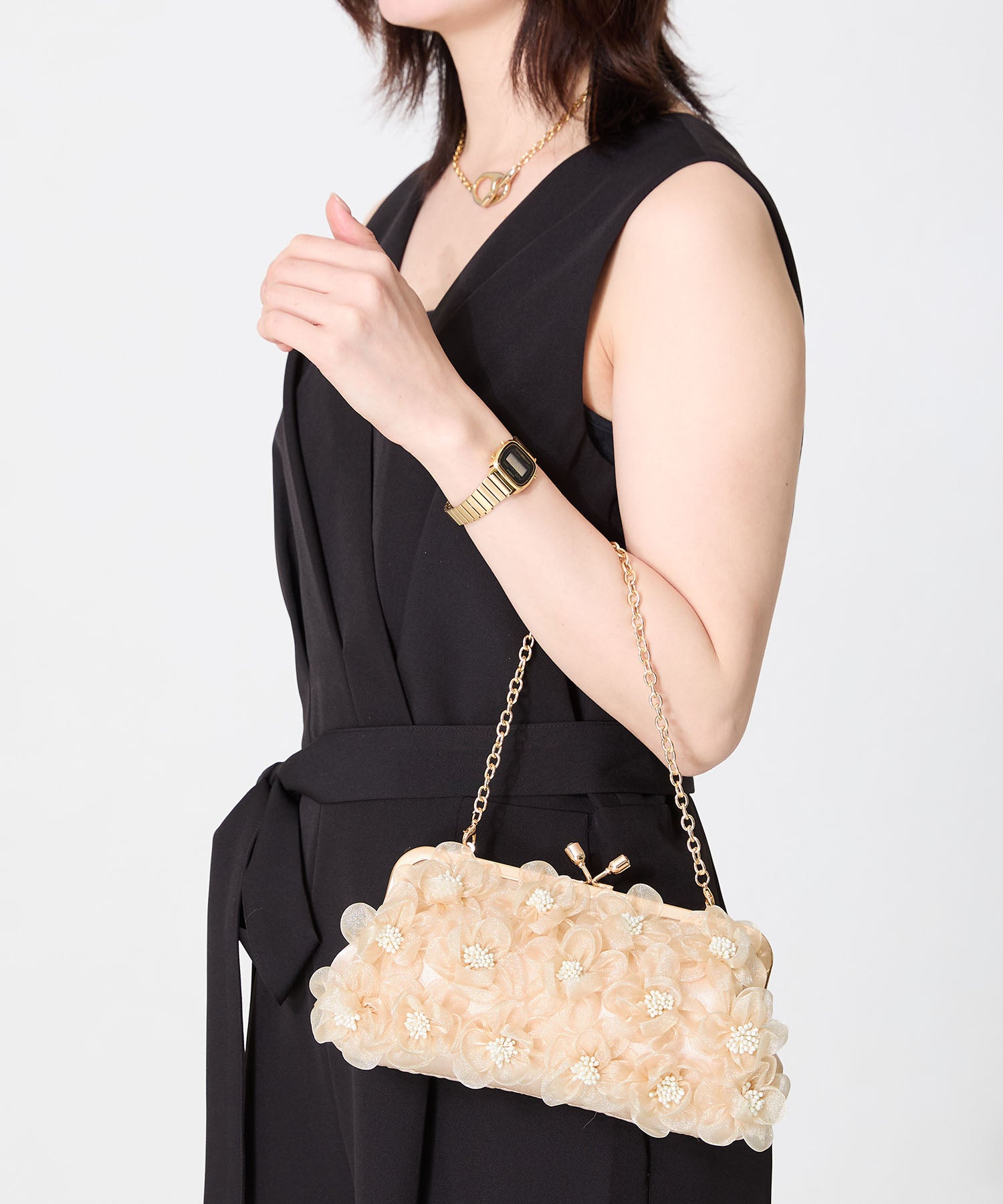 持つだけで一気に華やかなドレスコーデに決まるフラワーモチーフが目を引くバッグ。本体にも内側にもサテン素材を使用することでとことんフェミニンな印象になり、ワンピースにはもちろん、パンツスタイルの外しとして使えば上級者コーデに。長さの違うチェーンストラップが2本付いているのでアウターのある季節でも問題なく持つことが出来る。