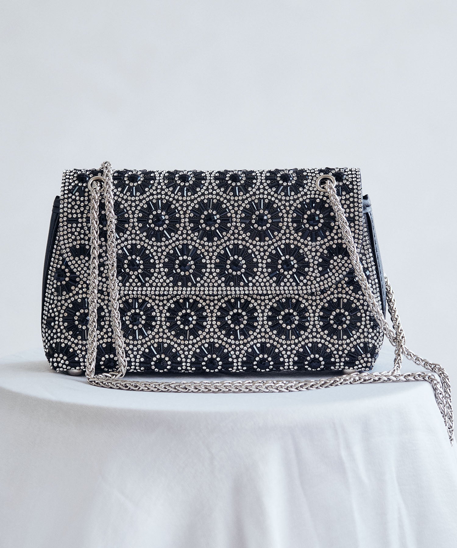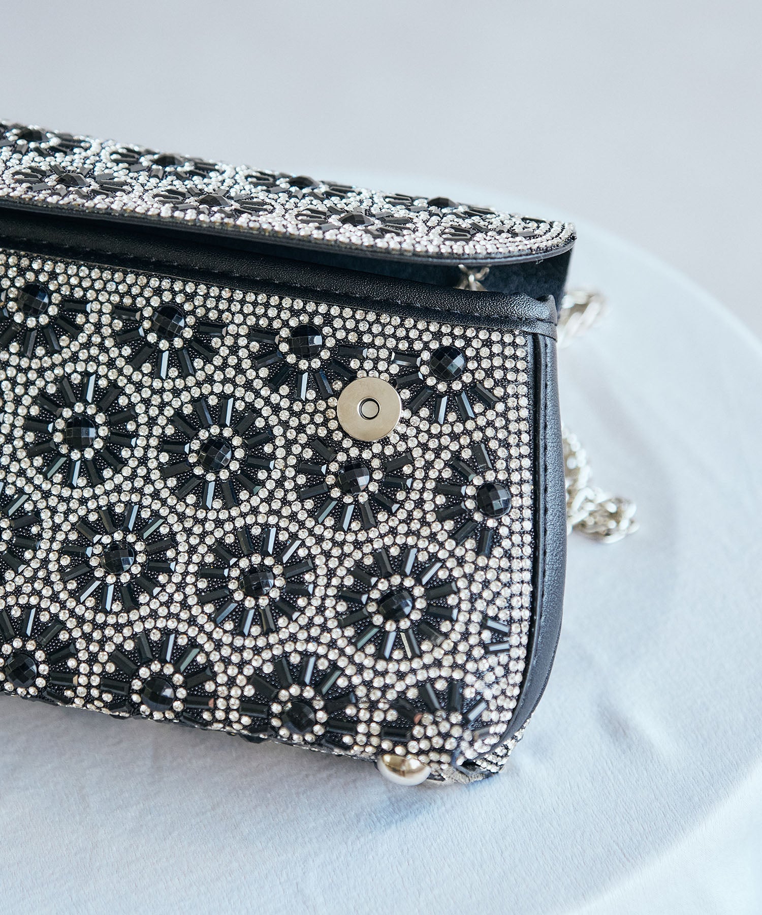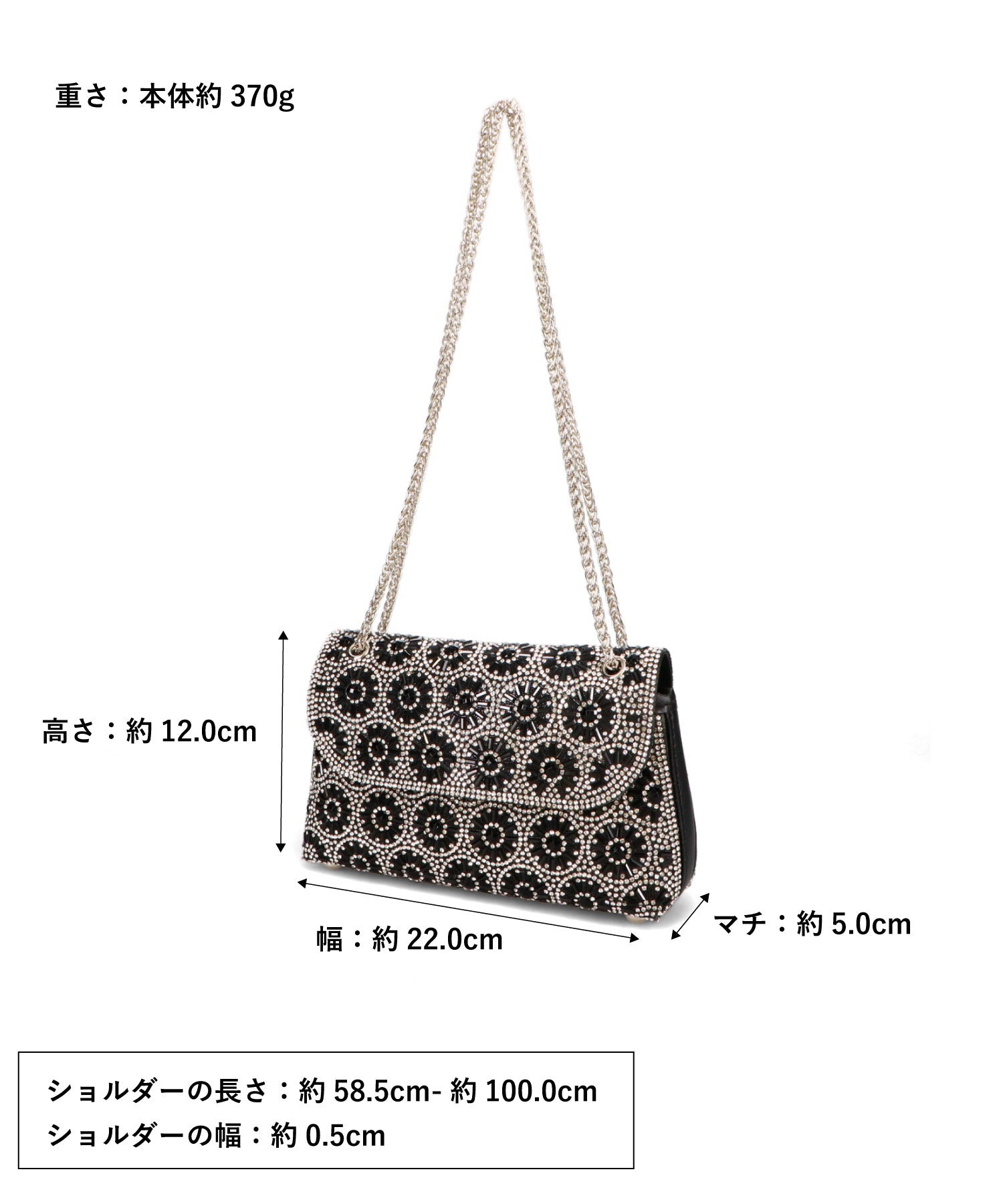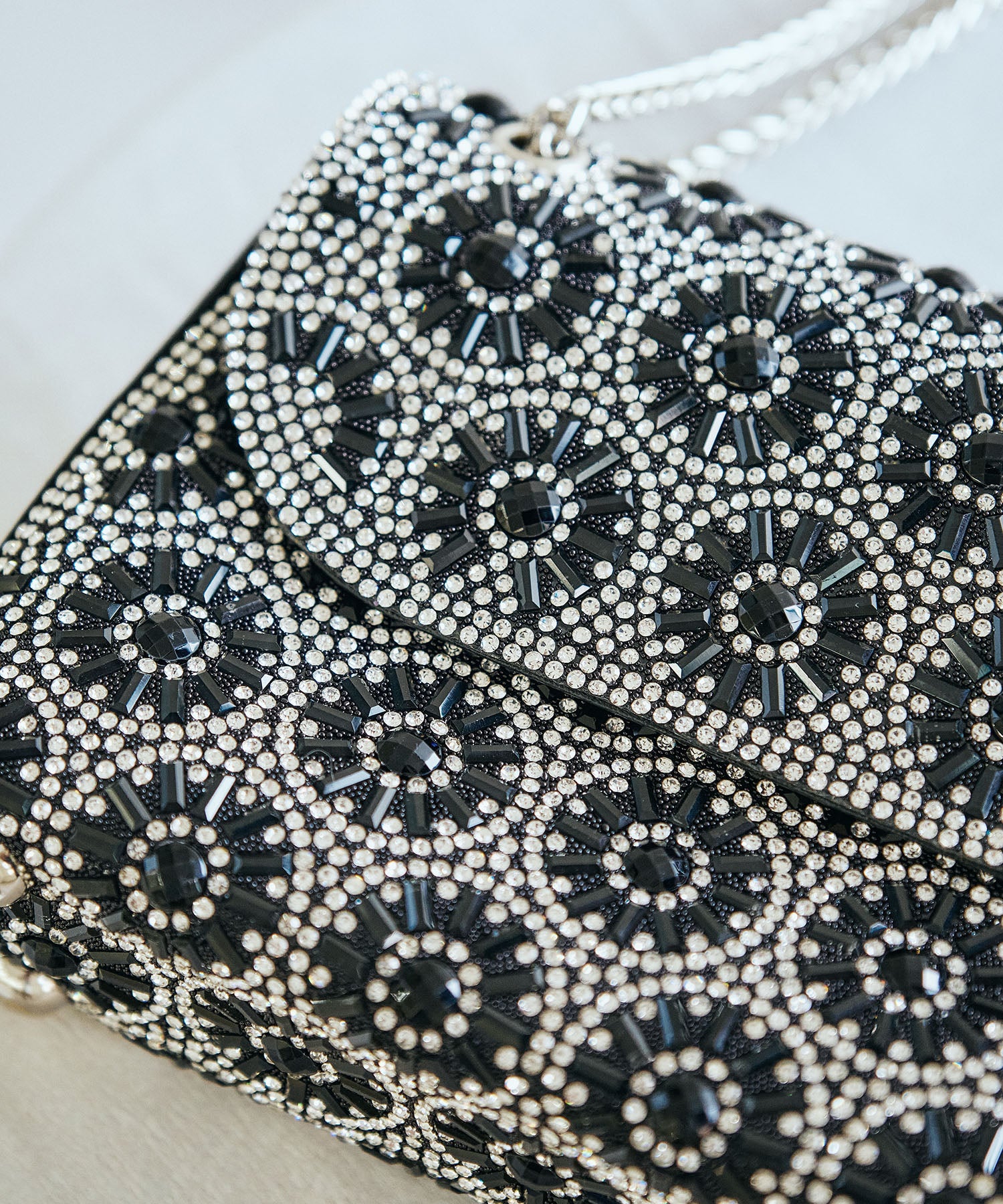ビジューのフラワーデザインを全面にあしらったレディライクなバッグは、持つだけでワンランク上のドレスコーデに決まるアイテム。マチがしっかりあるので、小ぶりな見た目ながらも収納力もばっちり。持ち手のチェーンは短くしてハンドバッグ、片方を伸ばしてショルダーとして使うことも可能。