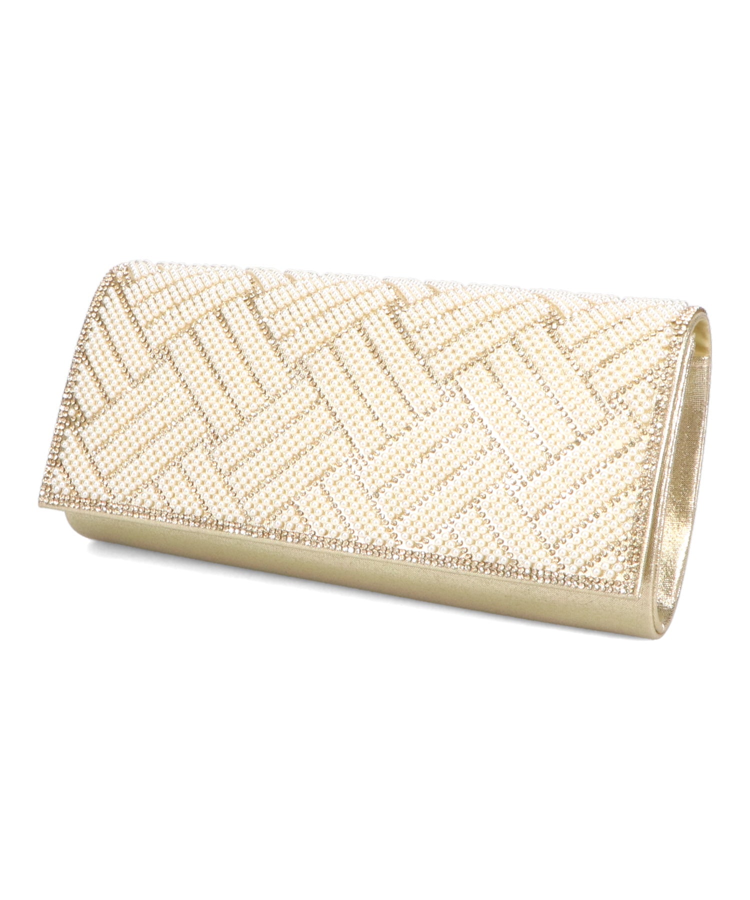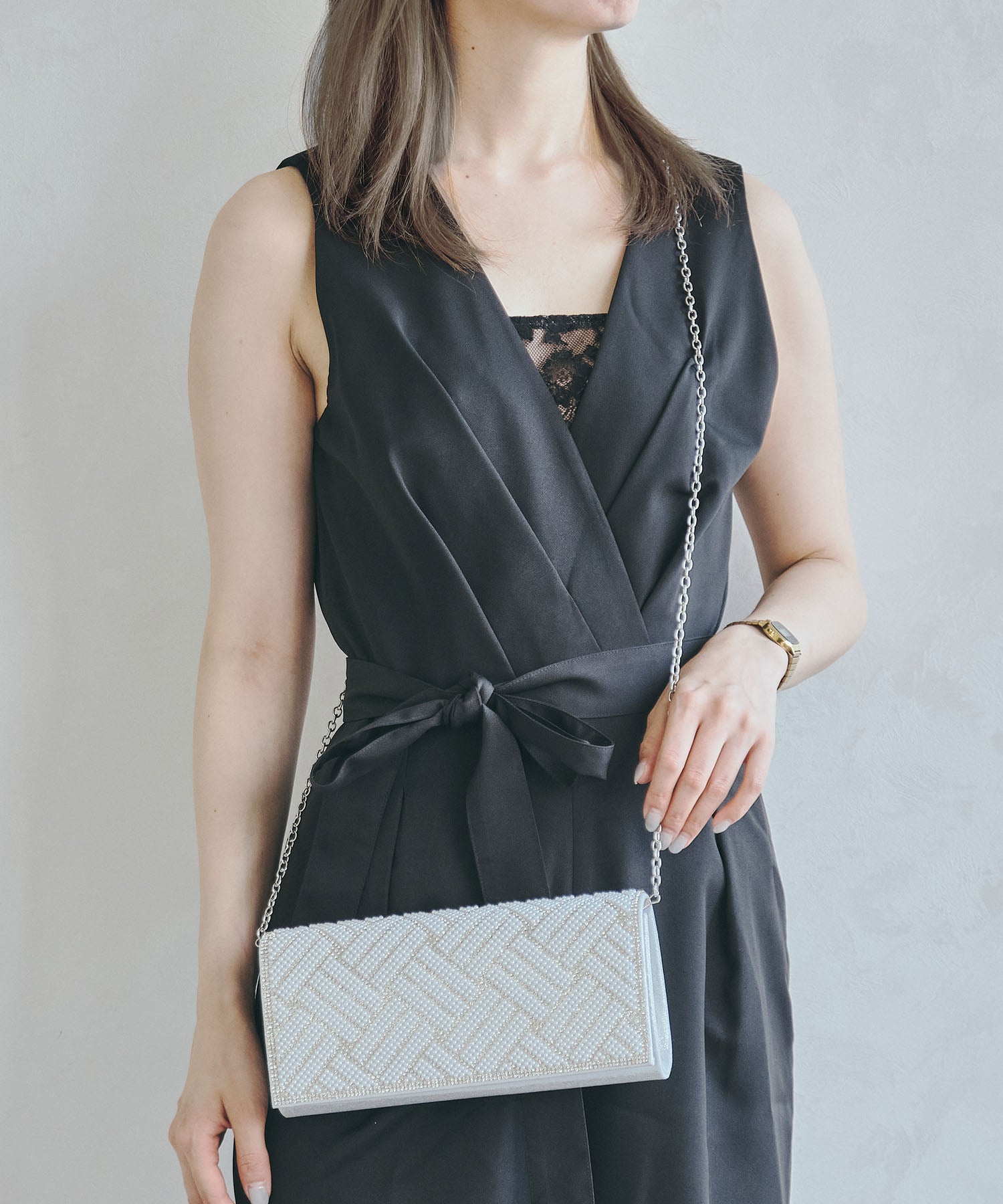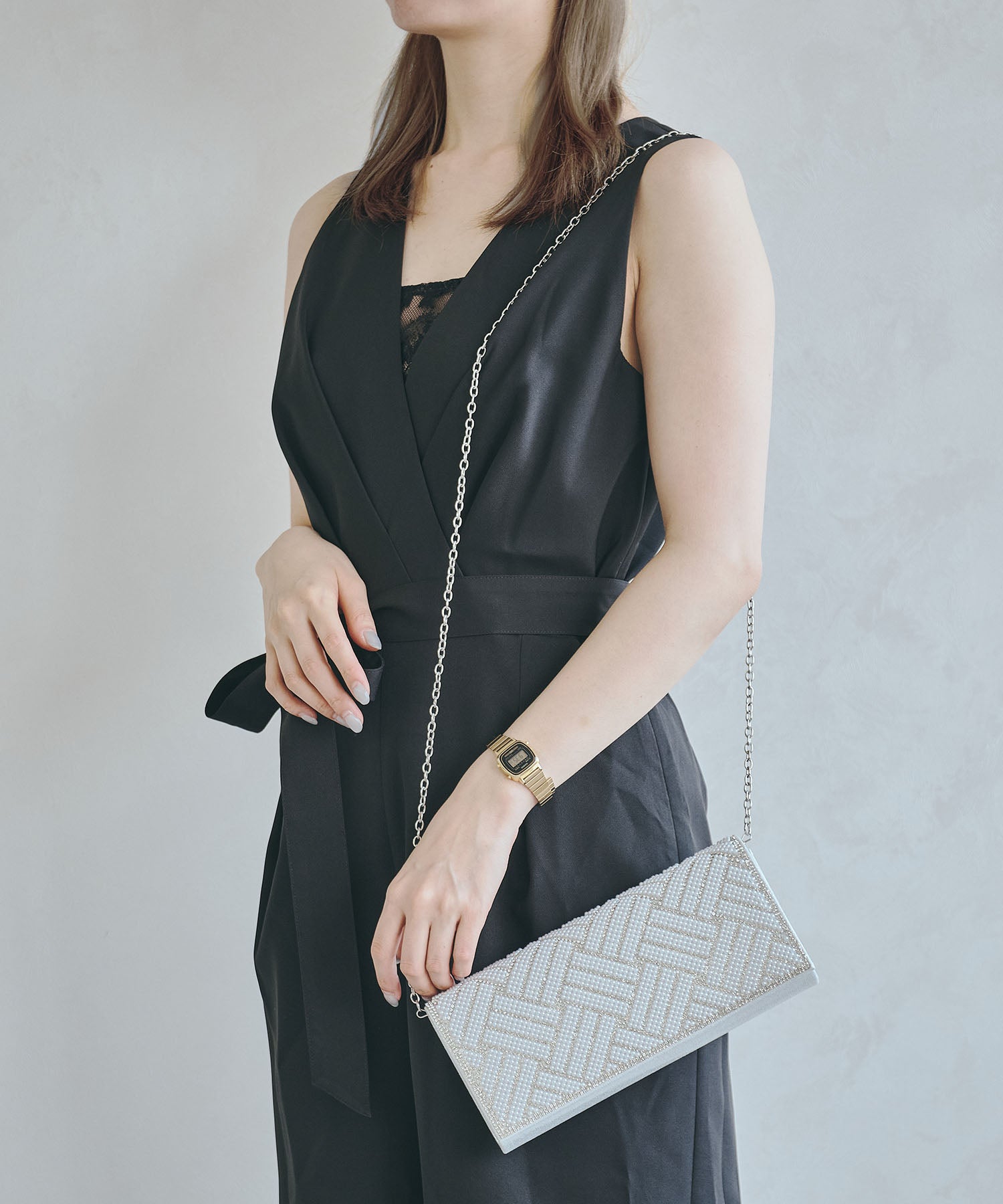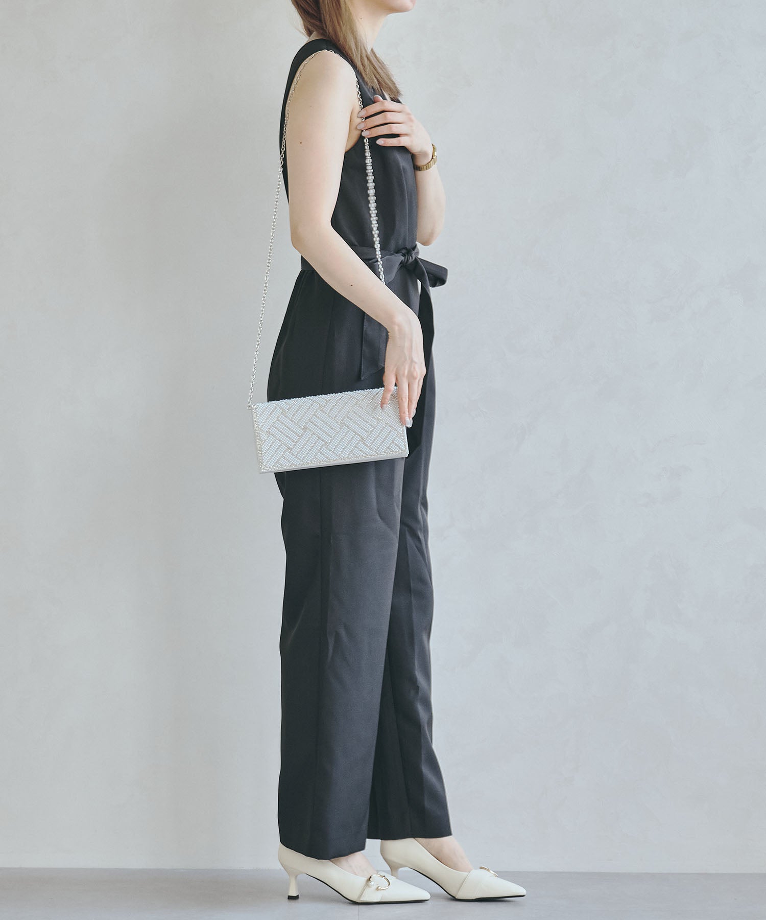 小粒のパールを格子状に配置したバッグはすっきりとした横長シルエットできちんと感のある印象にしてくれる。ベースの生地にはラメを折り込んだものを使用しているのでさりげなく華やかさもプラス。フラップタイプで間口が大きく開くので荷物の出し入れがしやすく、付属のチェーンストラップを付けて肩掛けもできる2way仕様。