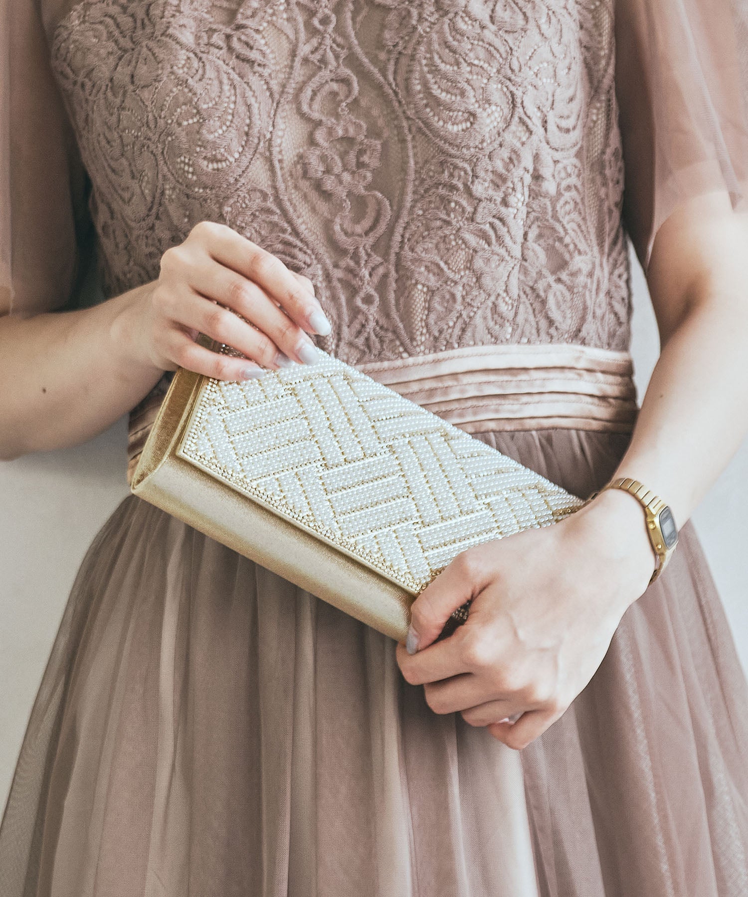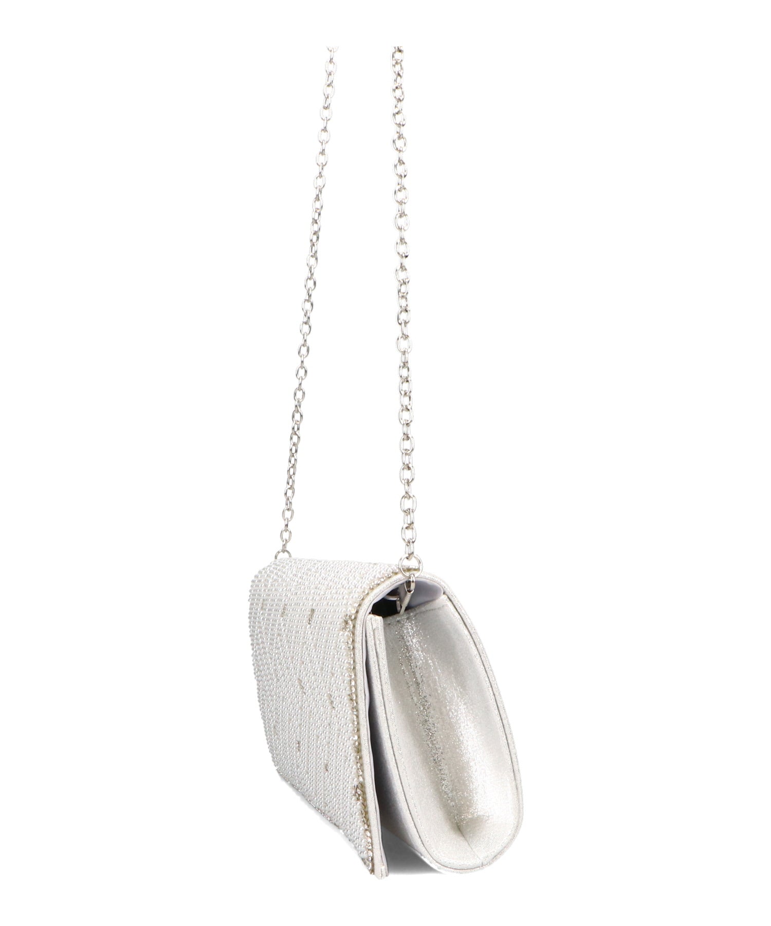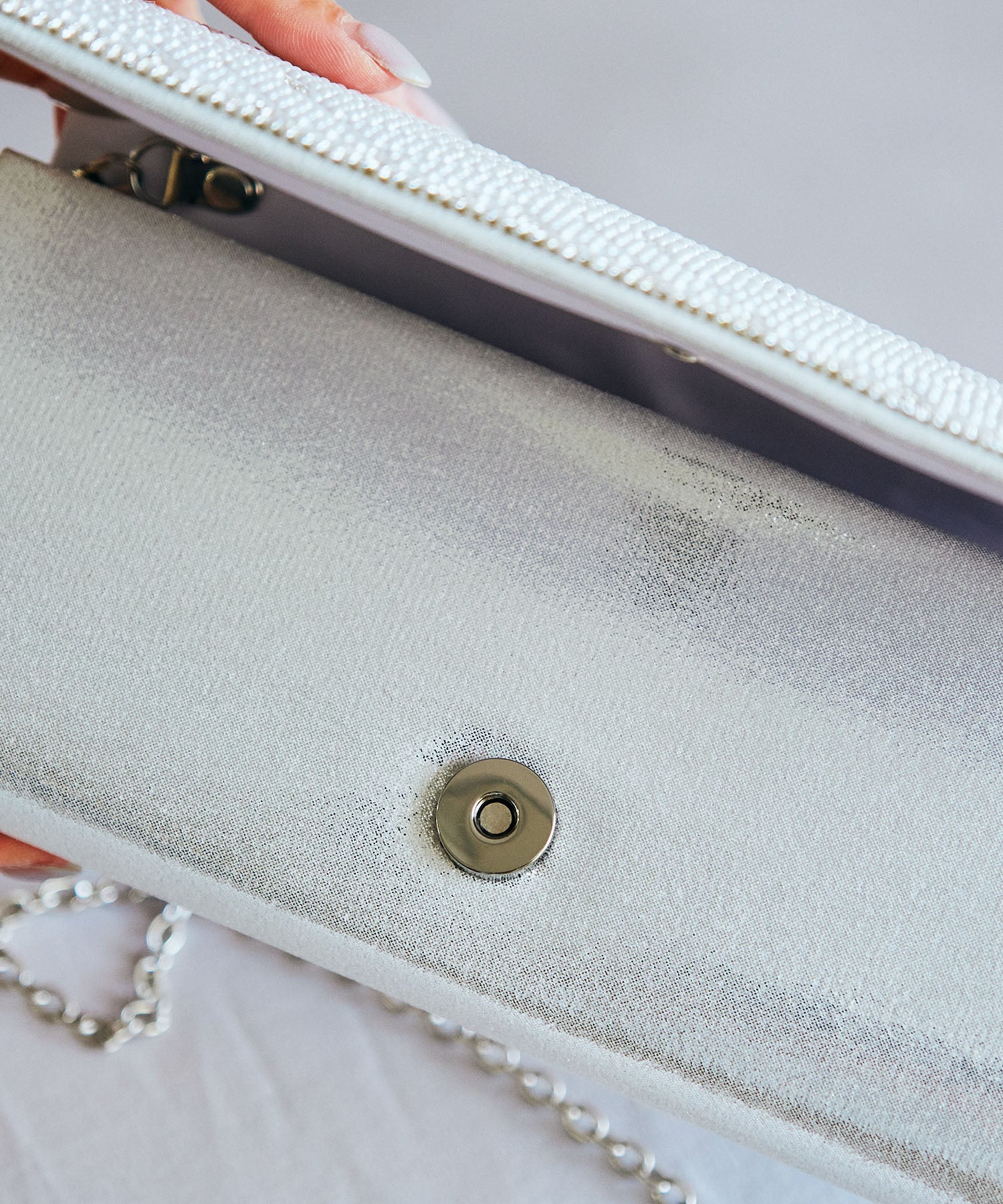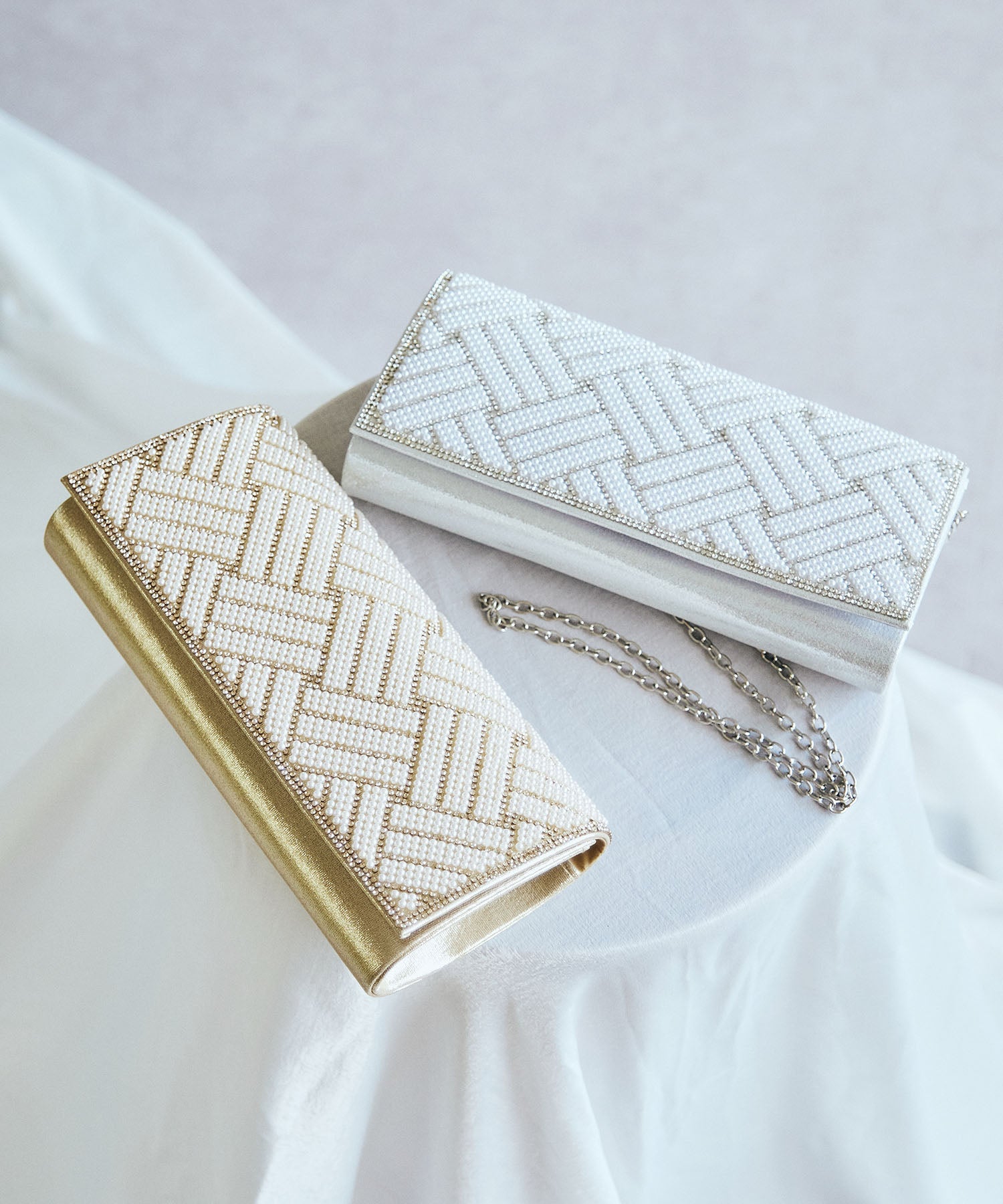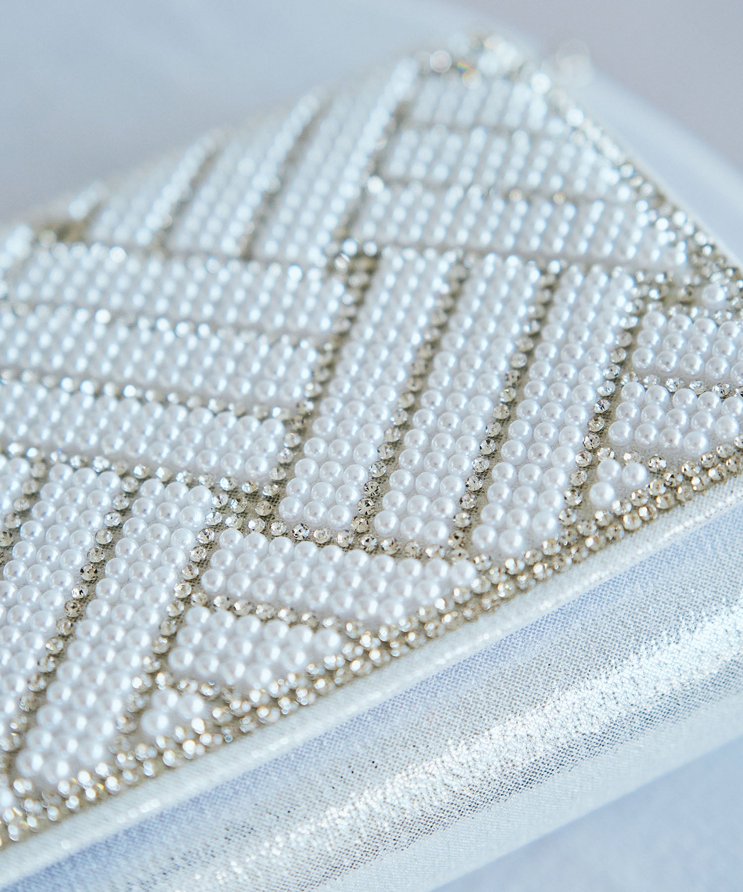 小粒のパールを格子状に配置したバッグはすっきりとした横長シルエットできちんと感のある印象にしてくれる。ベースの生地にはラメを折り込んだものを使用しているのでさりげなく華やかさもプラス。フラップタイプで間口が大きく開くので荷物の出し入れがしやすく、付属のチェーンストラップを付けて肩掛けもできる2way仕様。