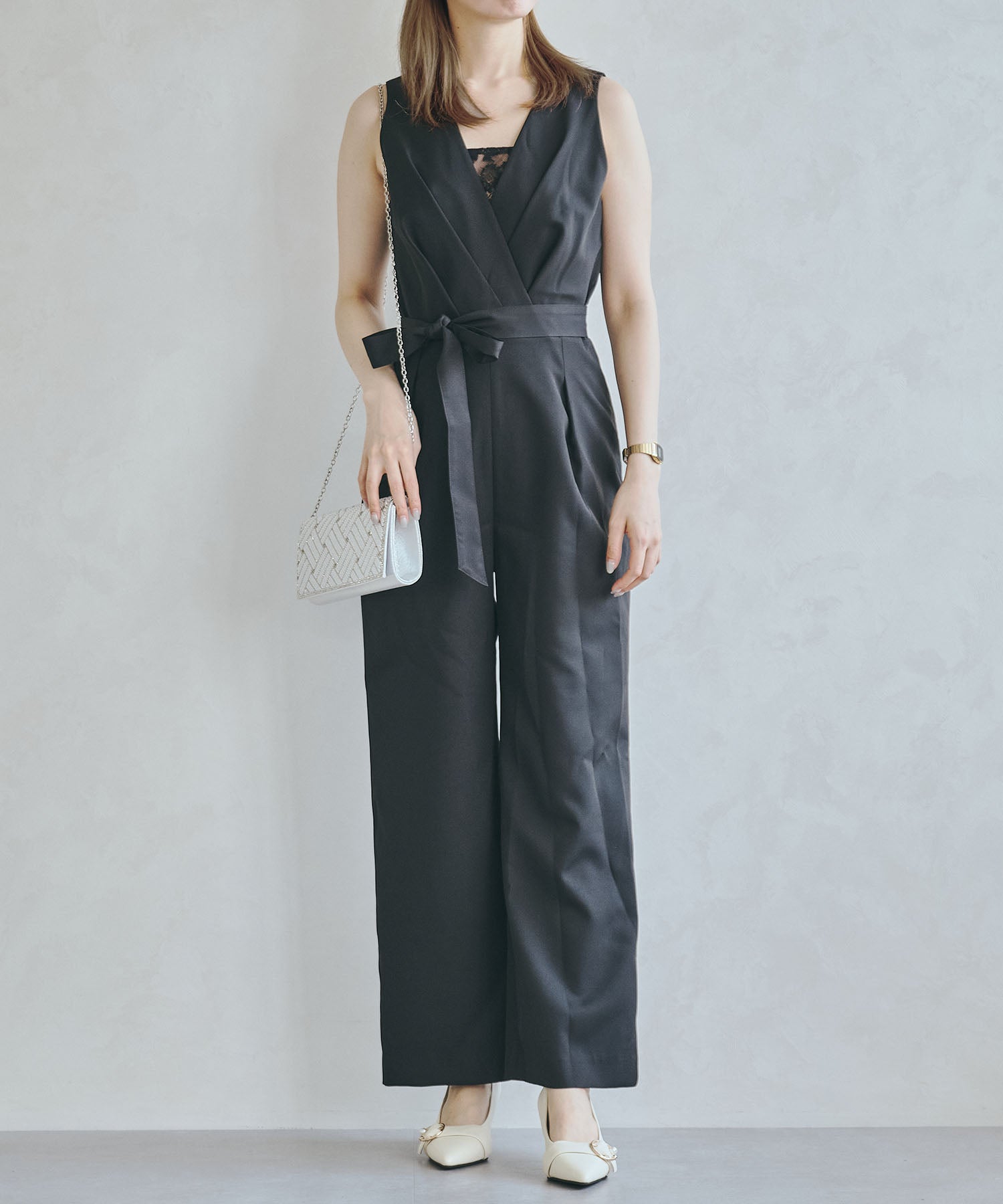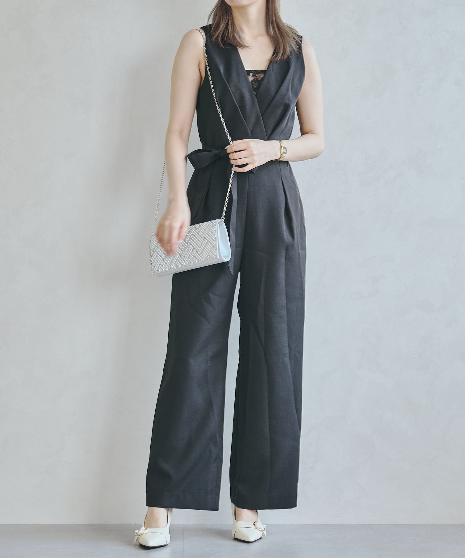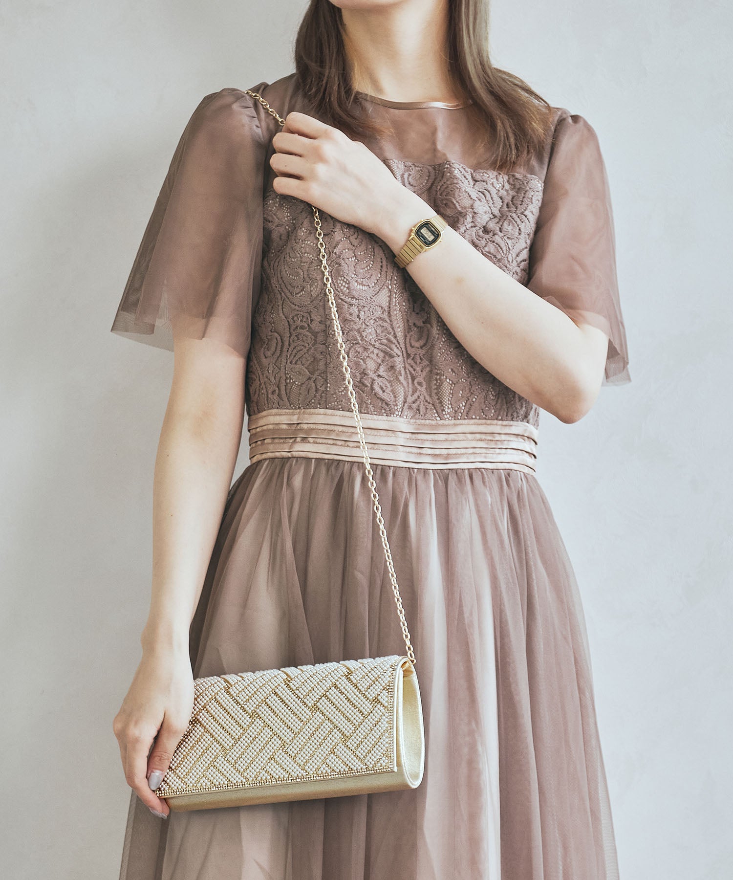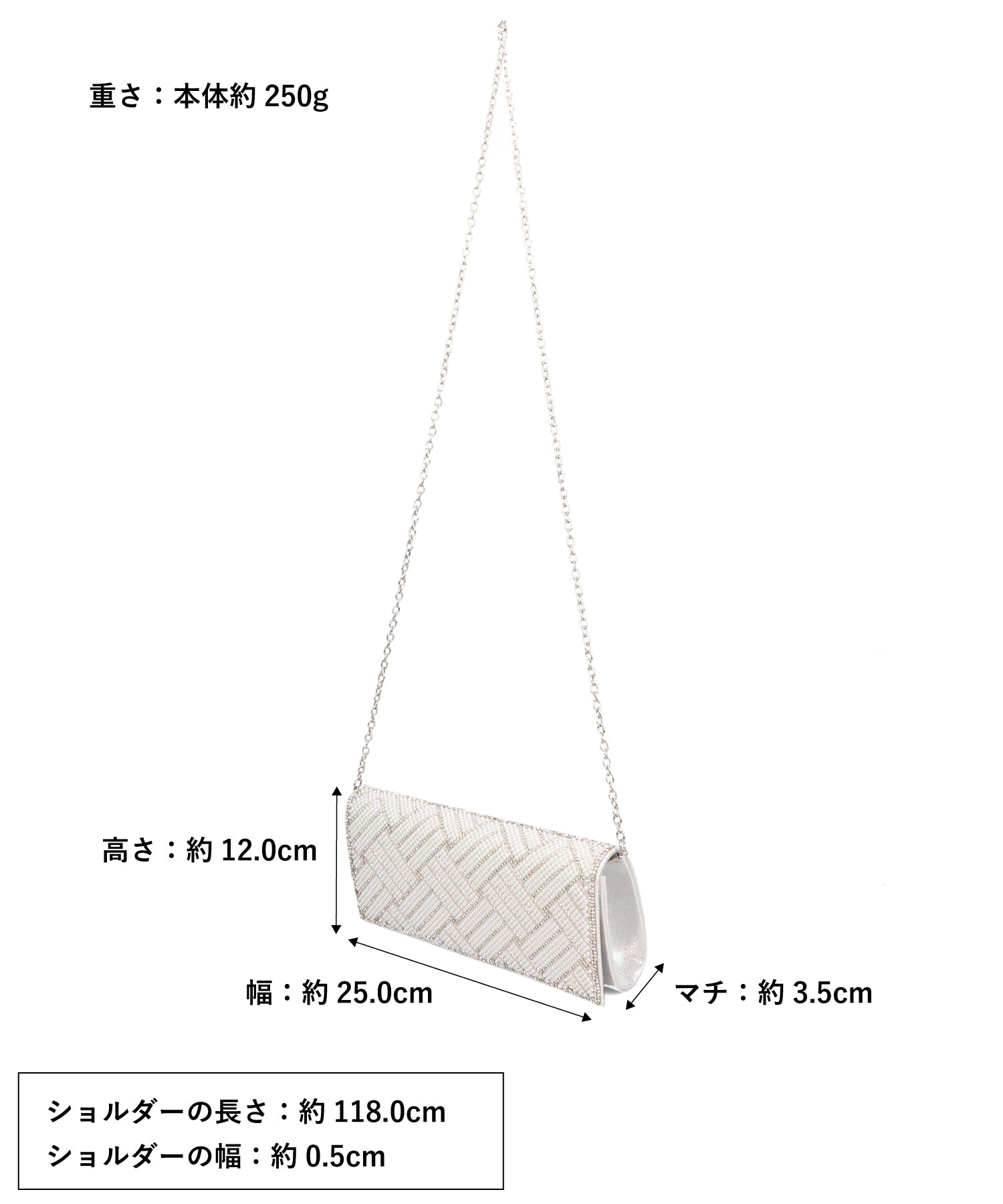 小粒のパールを格子状に配置したバッグはすっきりとした横長シルエットできちんと感のある印象にしてくれる。ベースの生地にはラメを折り込んだものを使用しているのでさりげなく華やかさもプラス。フラップタイプで間口が大きく開くので荷物の出し入れがしやすく、付属のチェーンストラップを付けて肩掛けもできる2way仕様。