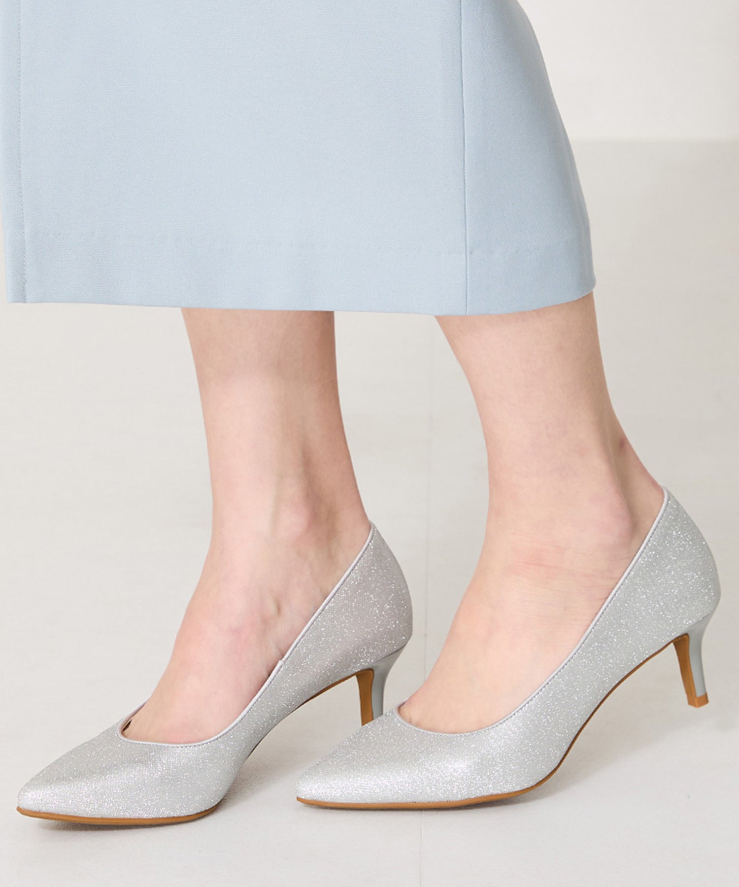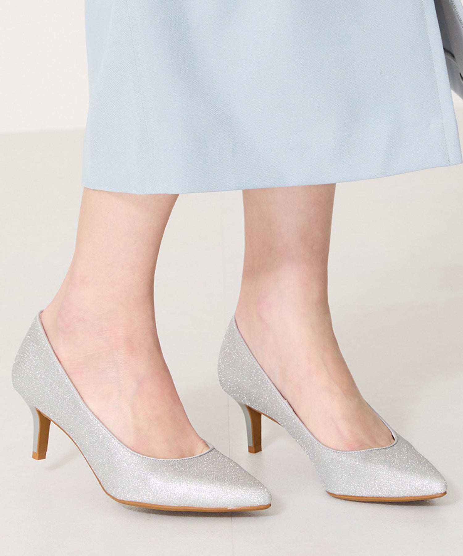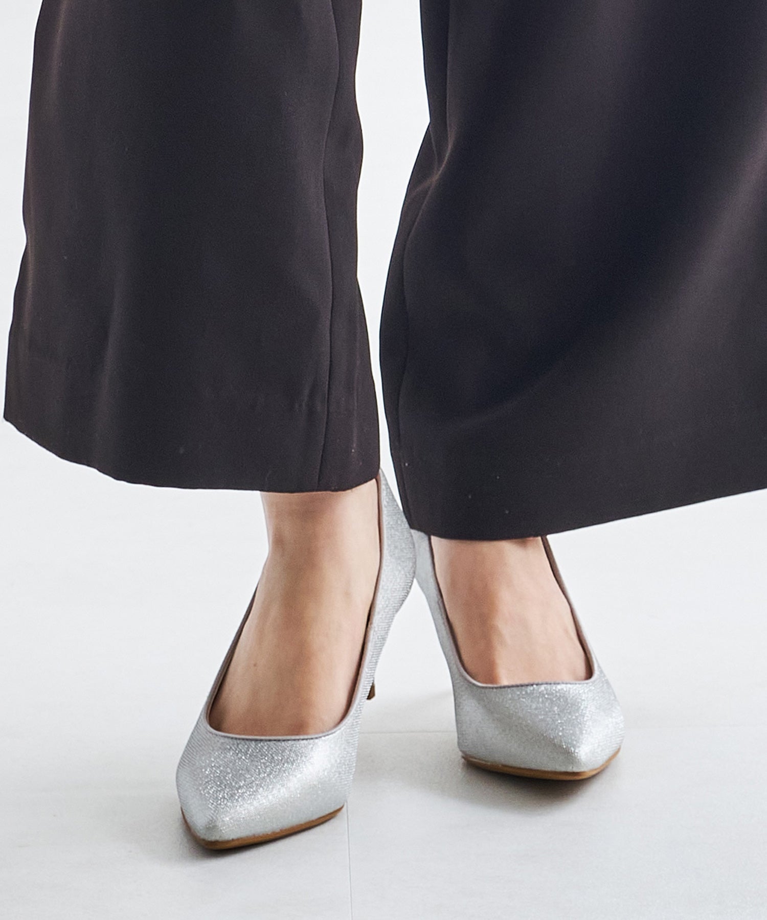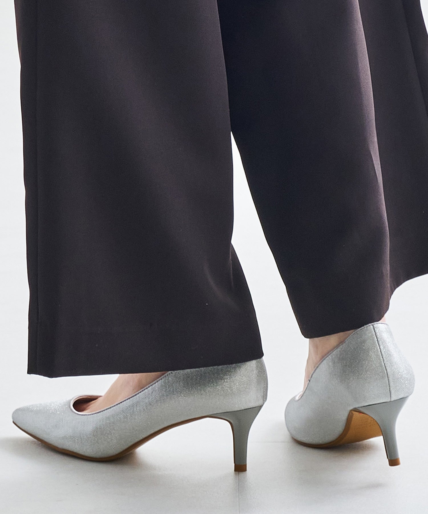 シンプルなデザインながらも、スマートなシルエットと繊細なラメ感が女性らしさあふれるエレガントな雰囲気を演出してくれる、オケージョンシーンにぴったりなパンプス。シャープなポインテッドトゥと程良い高さの華奢なヒールが美脚見えするので、履くだけで洗練されたスタイルに格上げしてくれる。特別な日に着たいドレッシーなスタイリングに馴染む1足。
