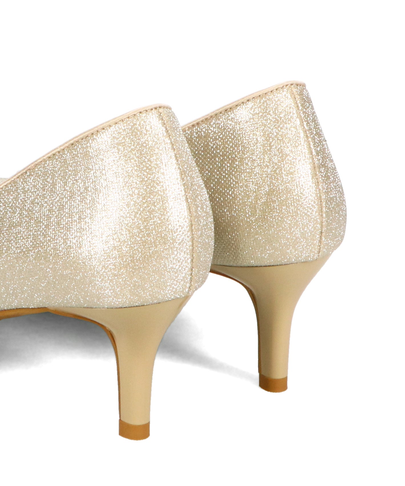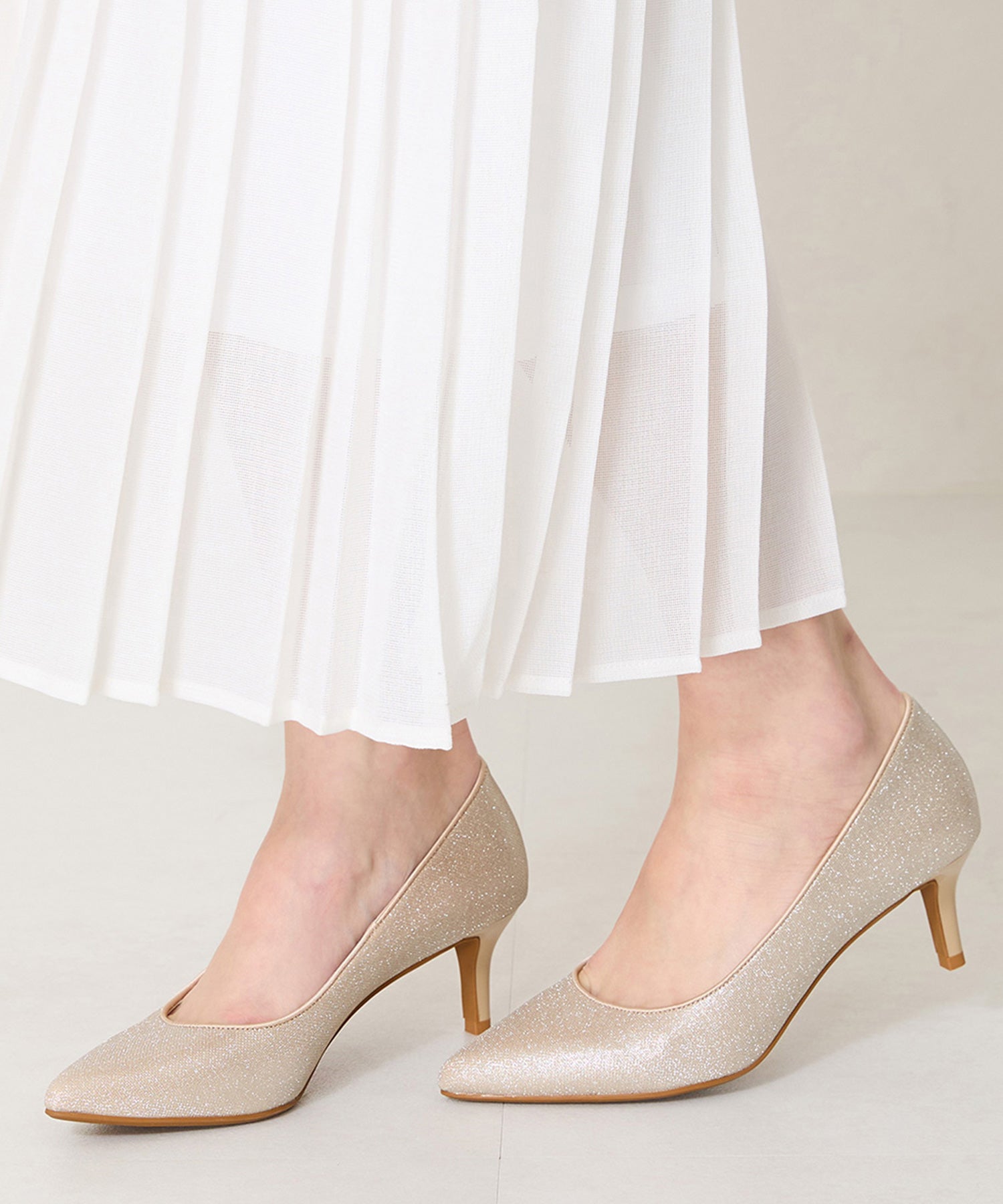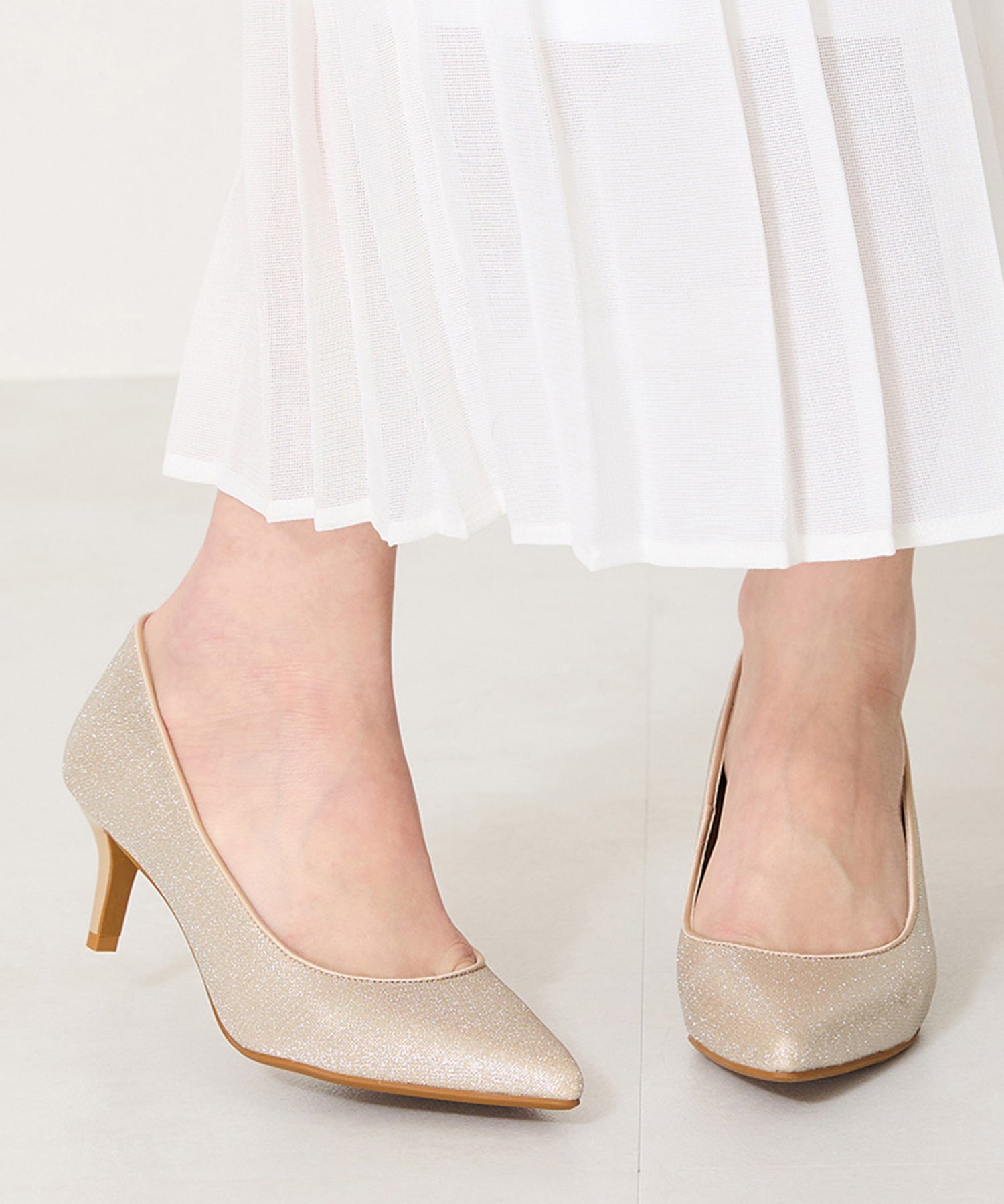 シンプルなデザインながらも、スマートなシルエットと繊細なラメ感が女性らしさあふれるエレガントな雰囲気を演出してくれる、オケージョンシーンにぴったりなパンプス。シャープなポインテッドトゥと程良い高さの華奢なヒールが美脚見えするので、履くだけで洗練されたスタイルに格上げしてくれる。特別な日に着たいドレッシーなスタイリングに馴染む1足。