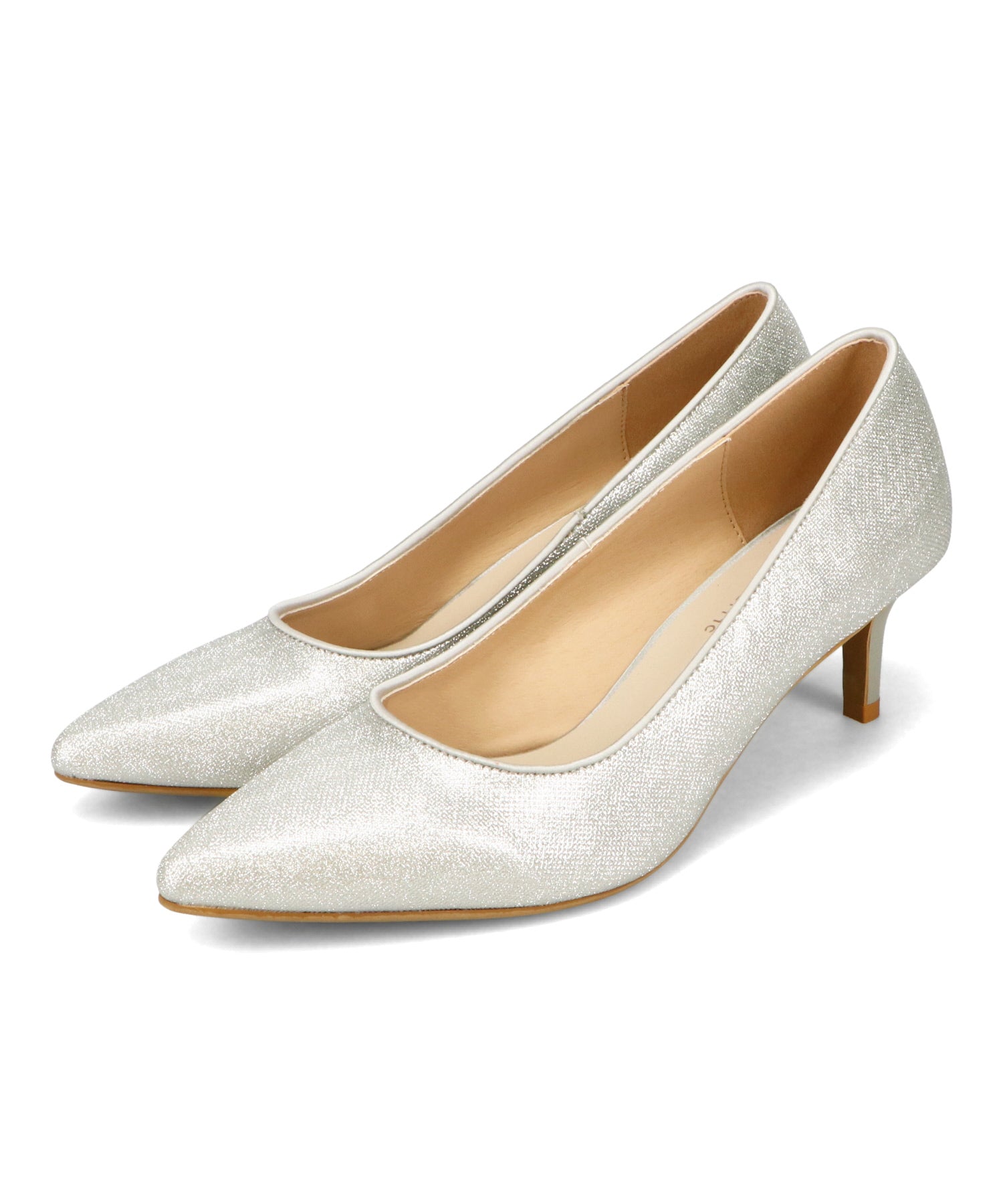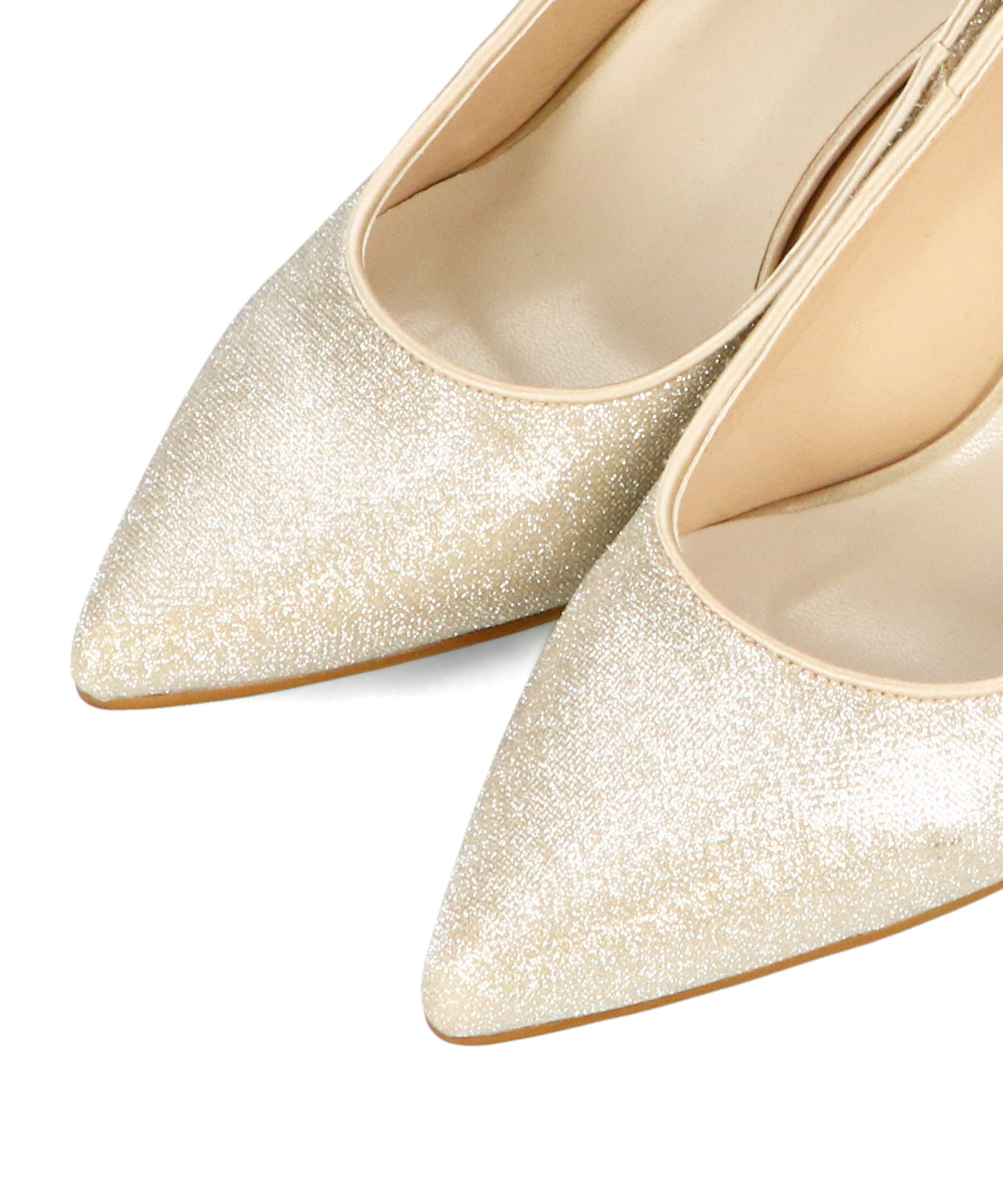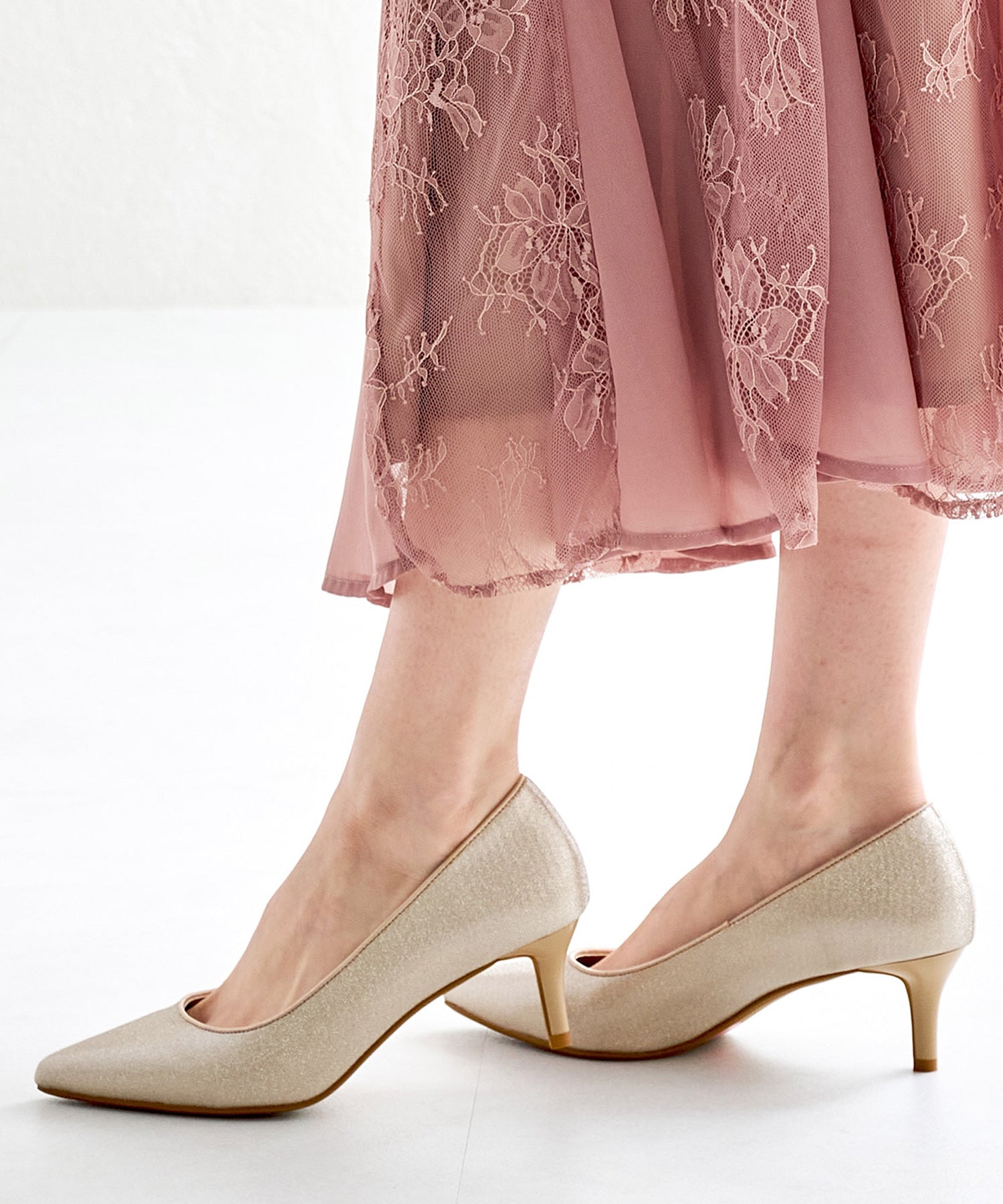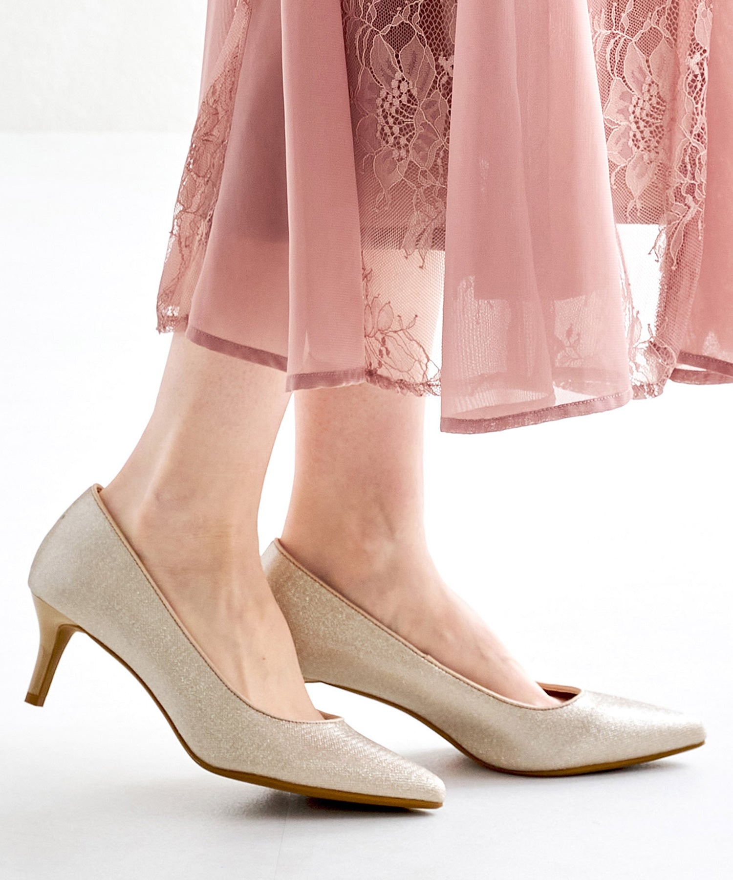 シンプルなデザインながらも、スマートなシルエットと繊細なラメ感が女性らしさあふれるエレガントな雰囲気を演出してくれる、オケージョンシーンにぴったりなパンプス。シャープなポインテッドトゥと程良い高さの華奢なヒールが美脚見えするので、履くだけで洗練されたスタイルに格上げしてくれる。特別な日に着たいドレッシーなスタイリングに馴染む1足。