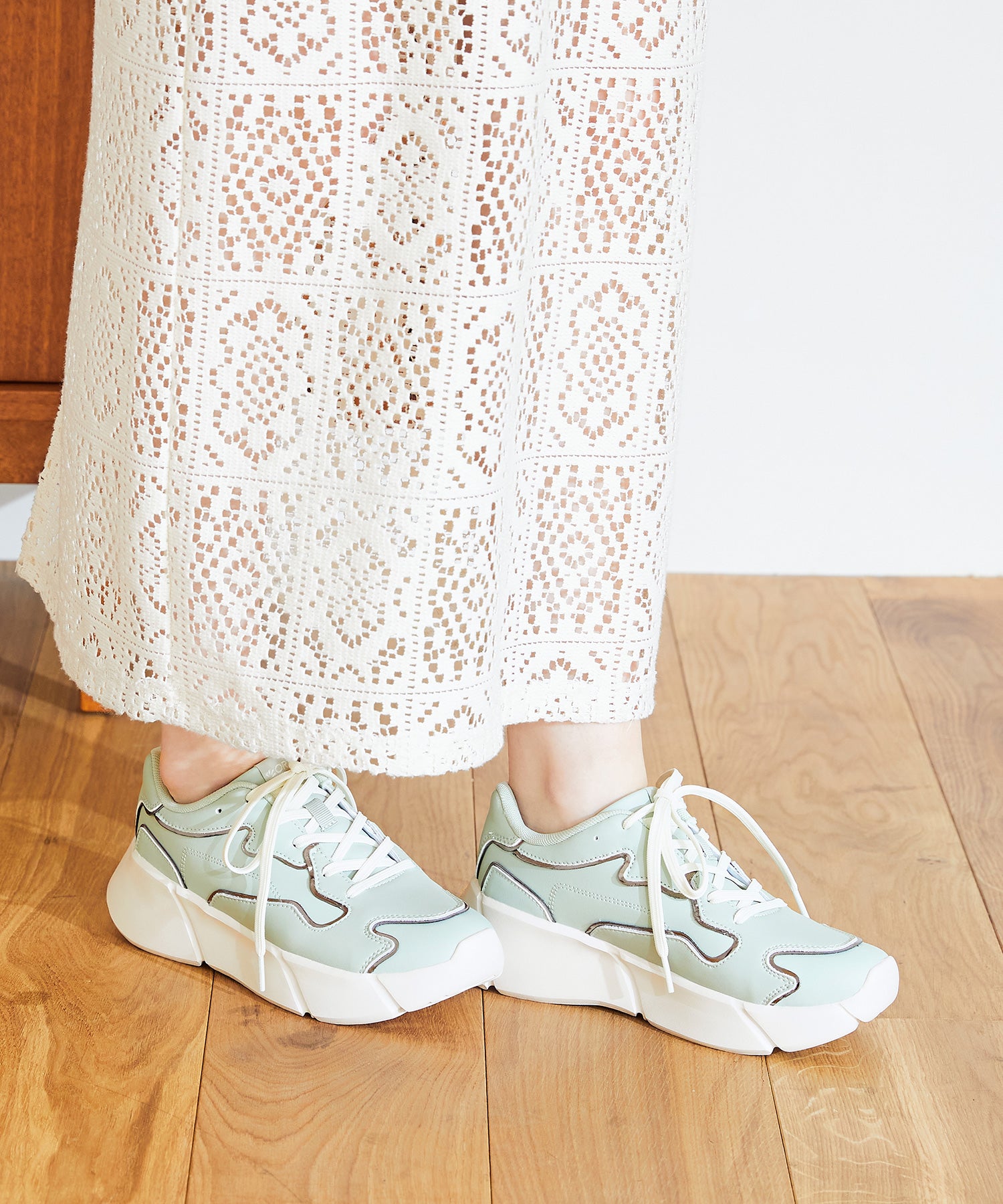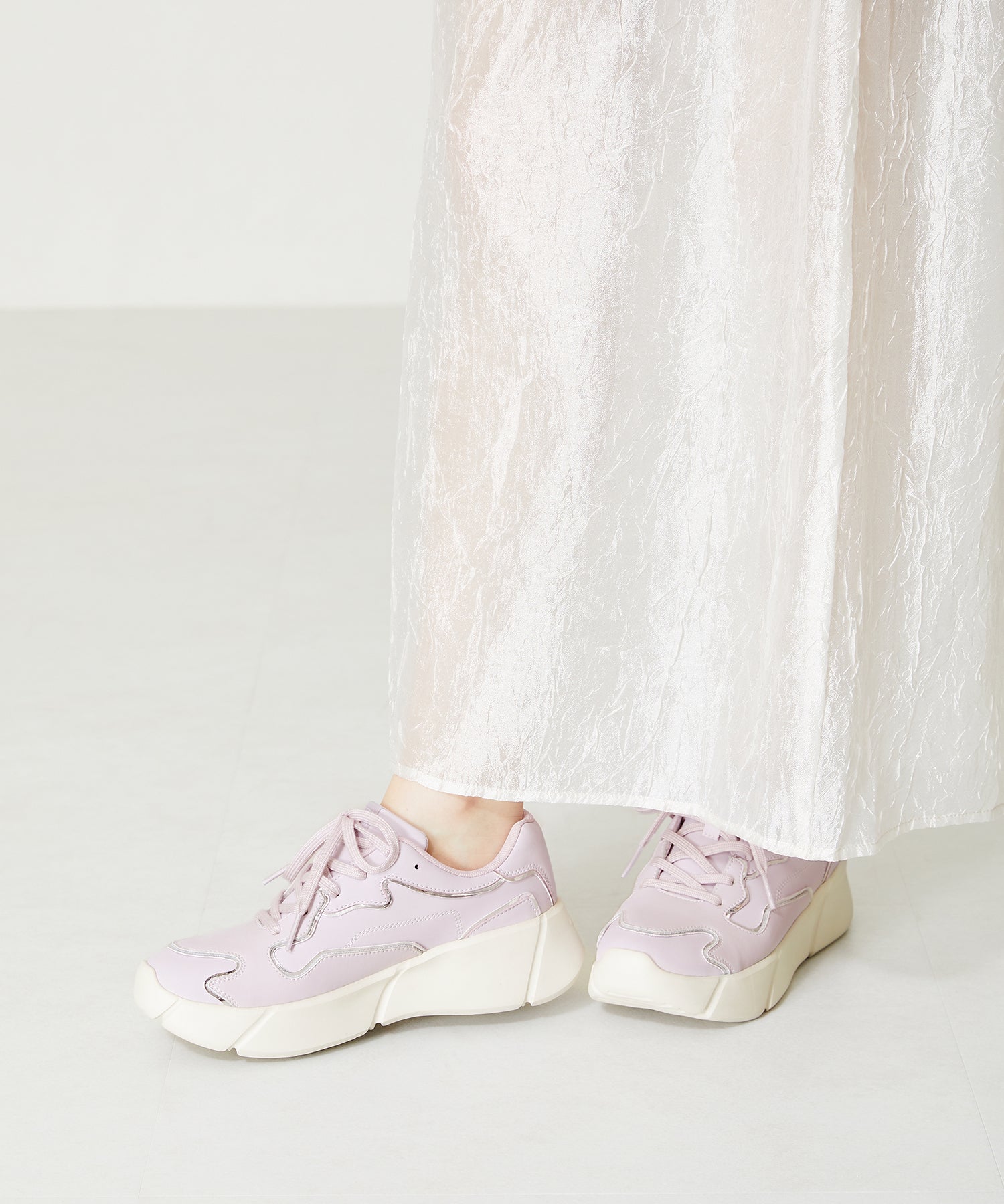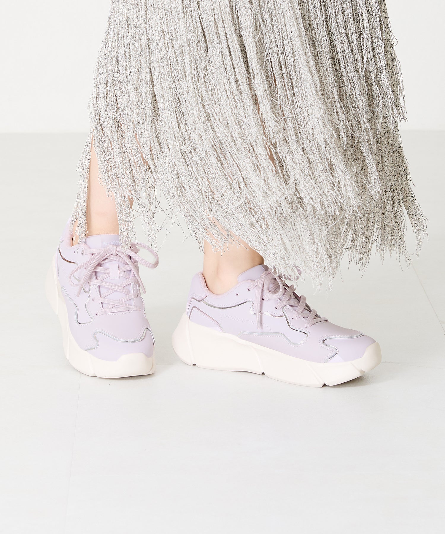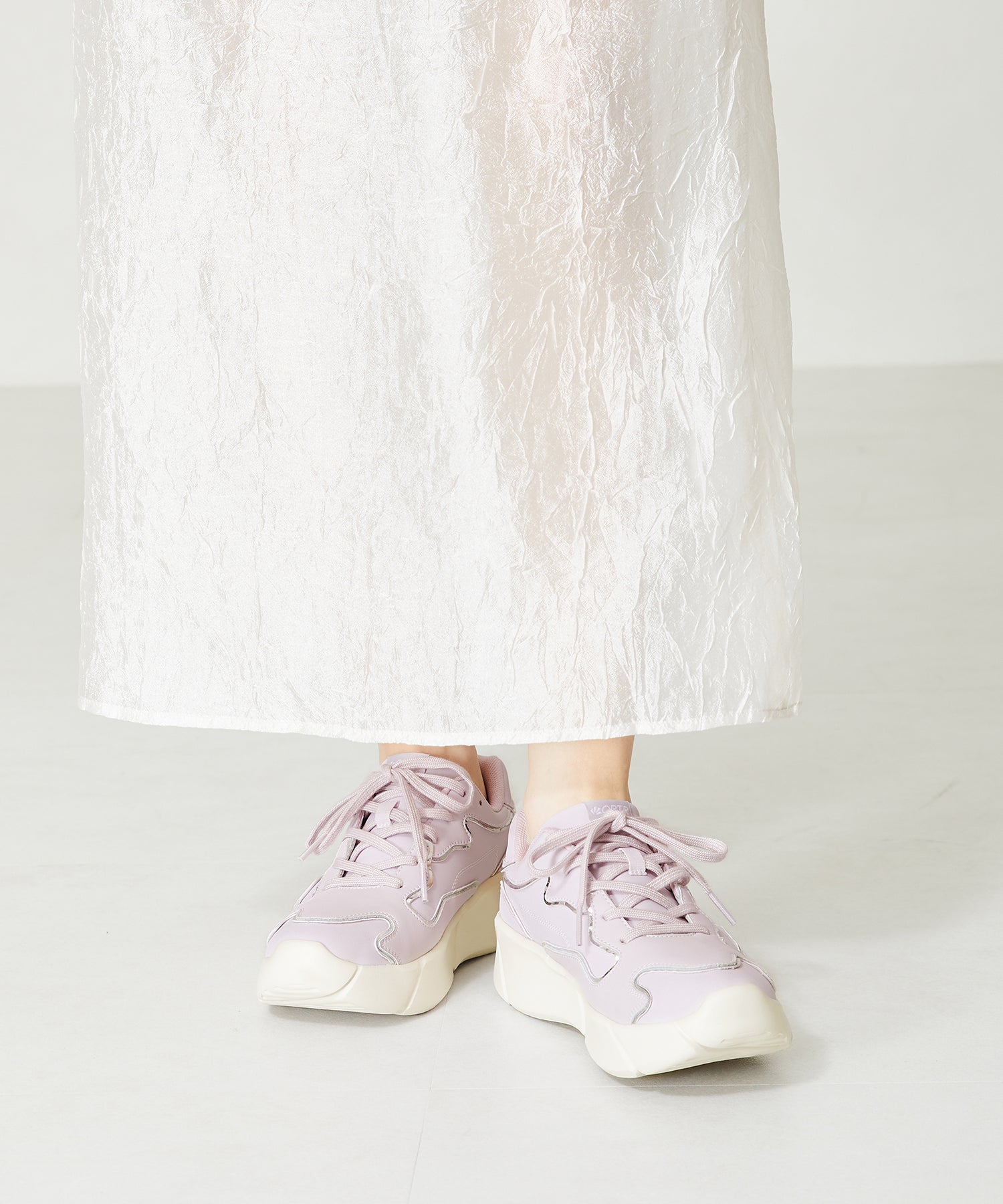 アッパーにメタリックラインを施すことで足元を華やかにしてくれるスニーカーは、コロンとしたフォルムでフェミニン派の方でも取り入れやすい。使いやすいホワイトとブラックに加え、淡いトーンのピンクとグリーンにパープルが仲間入り。パステルカラーが女性らしく、ソールはベージュにすることで甘くなりすぎずカジュアルからフェミニンまで幅広いコーディネートにマッチしてくれる。
