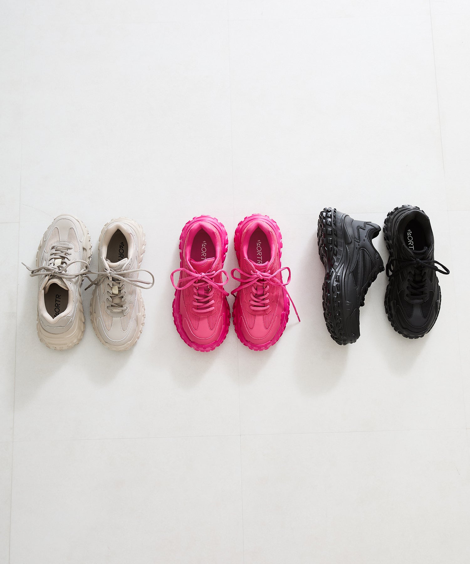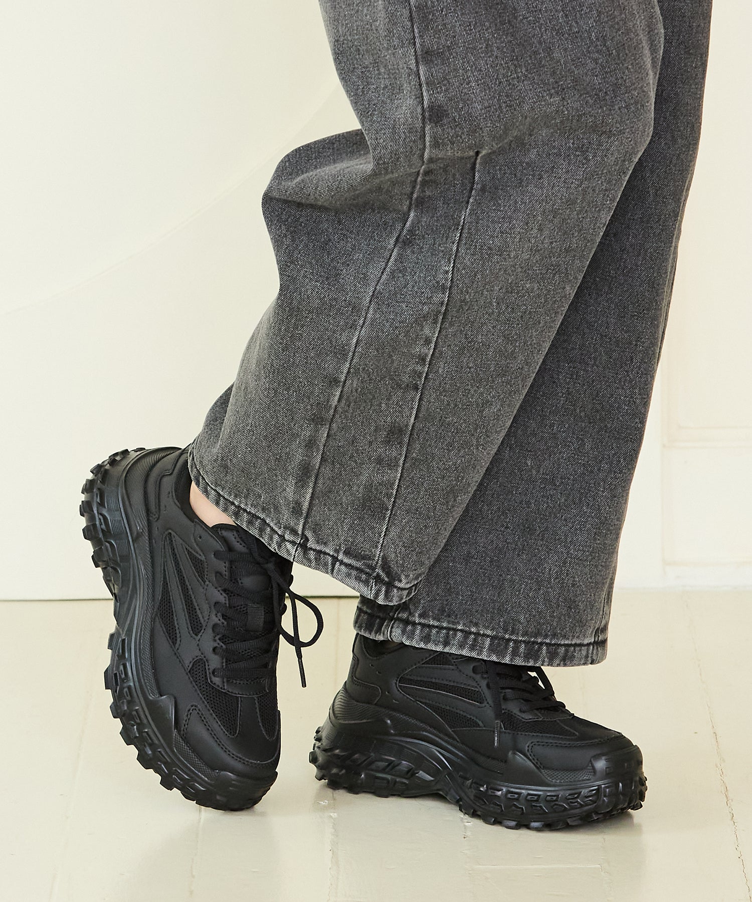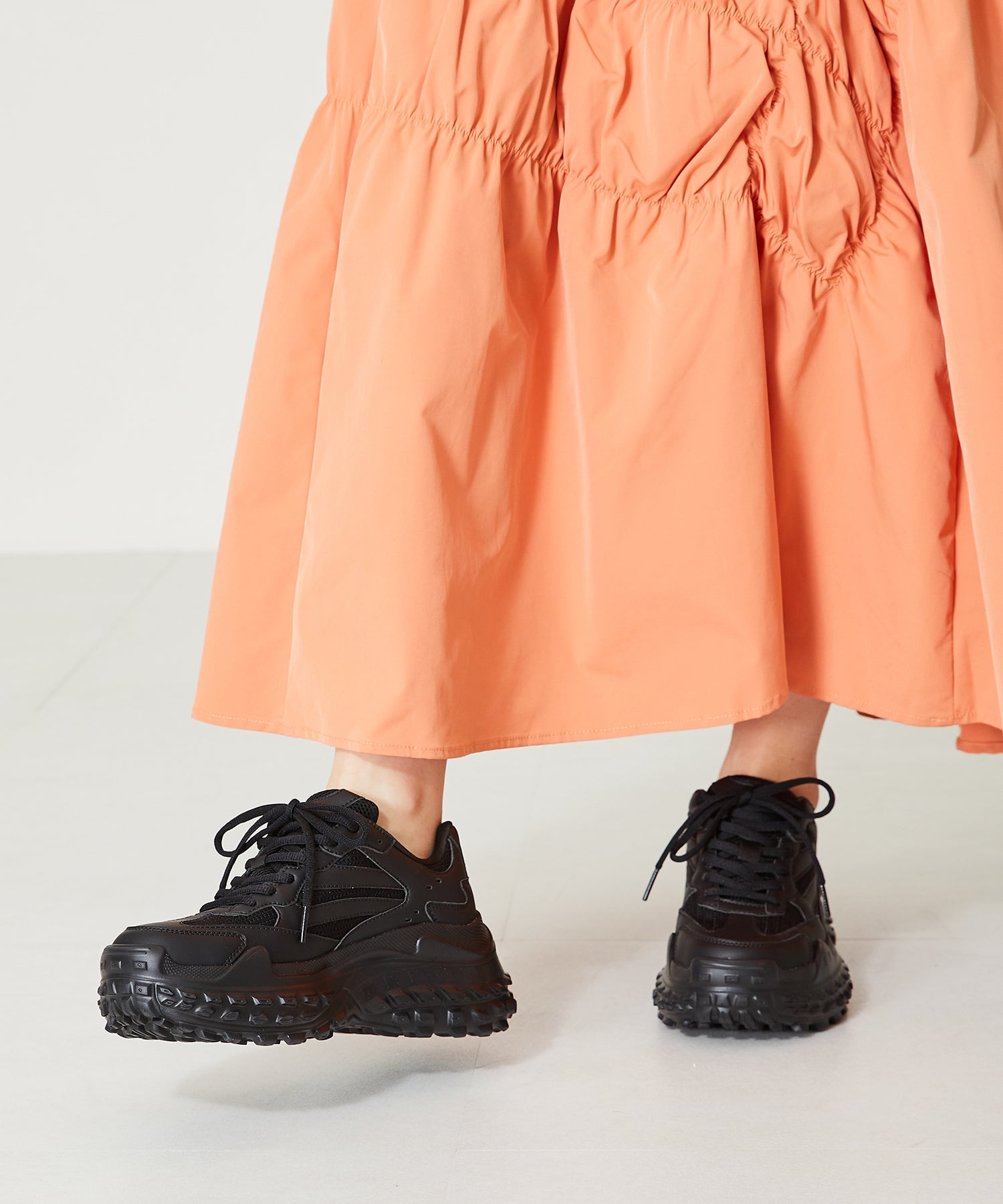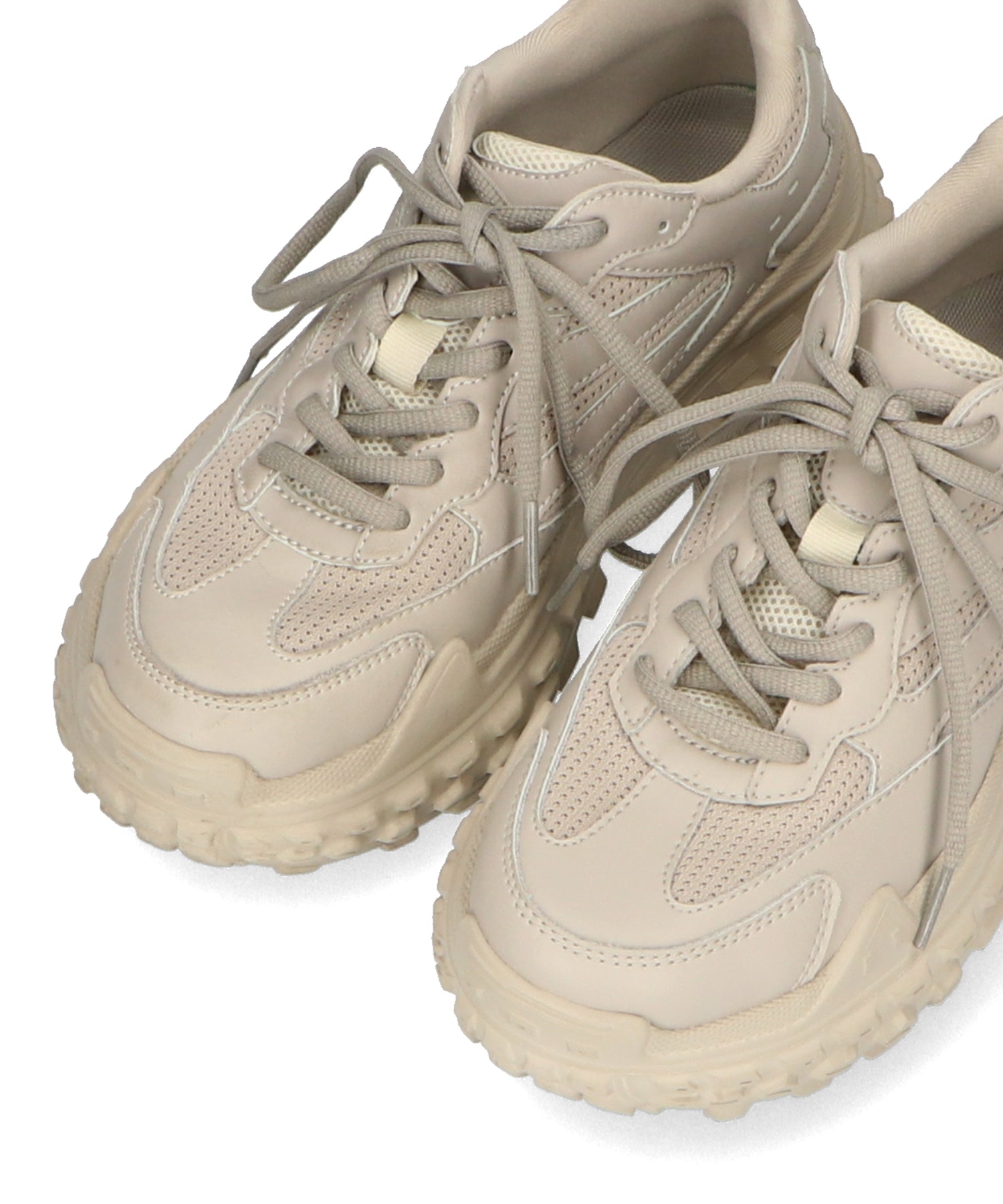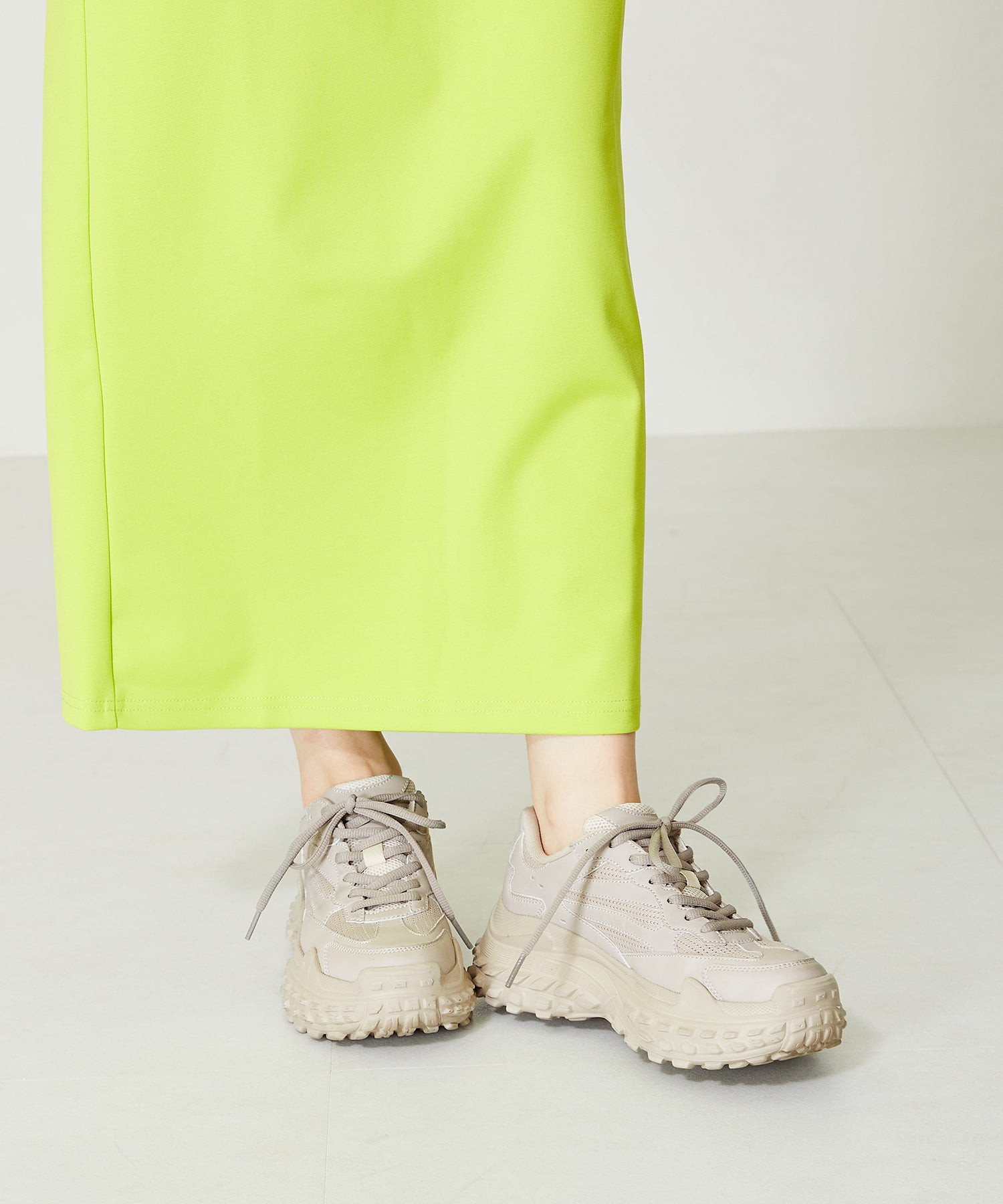 ごつごつとしたソールが新鮮なスニーカーは足元に取り入れるだけで旬なコーディネートに。全体を丸いシルエットにすることでメンズっぽくなりすぎず履けるのが嬉しい。ソールからアッパーまで同色でまとめることで形のユニークさもありながら、コーディネートとの馴染みの良さも両立。メッシュ素材を取り入れ通気性が良く軽量でラクチンな履き心地。
