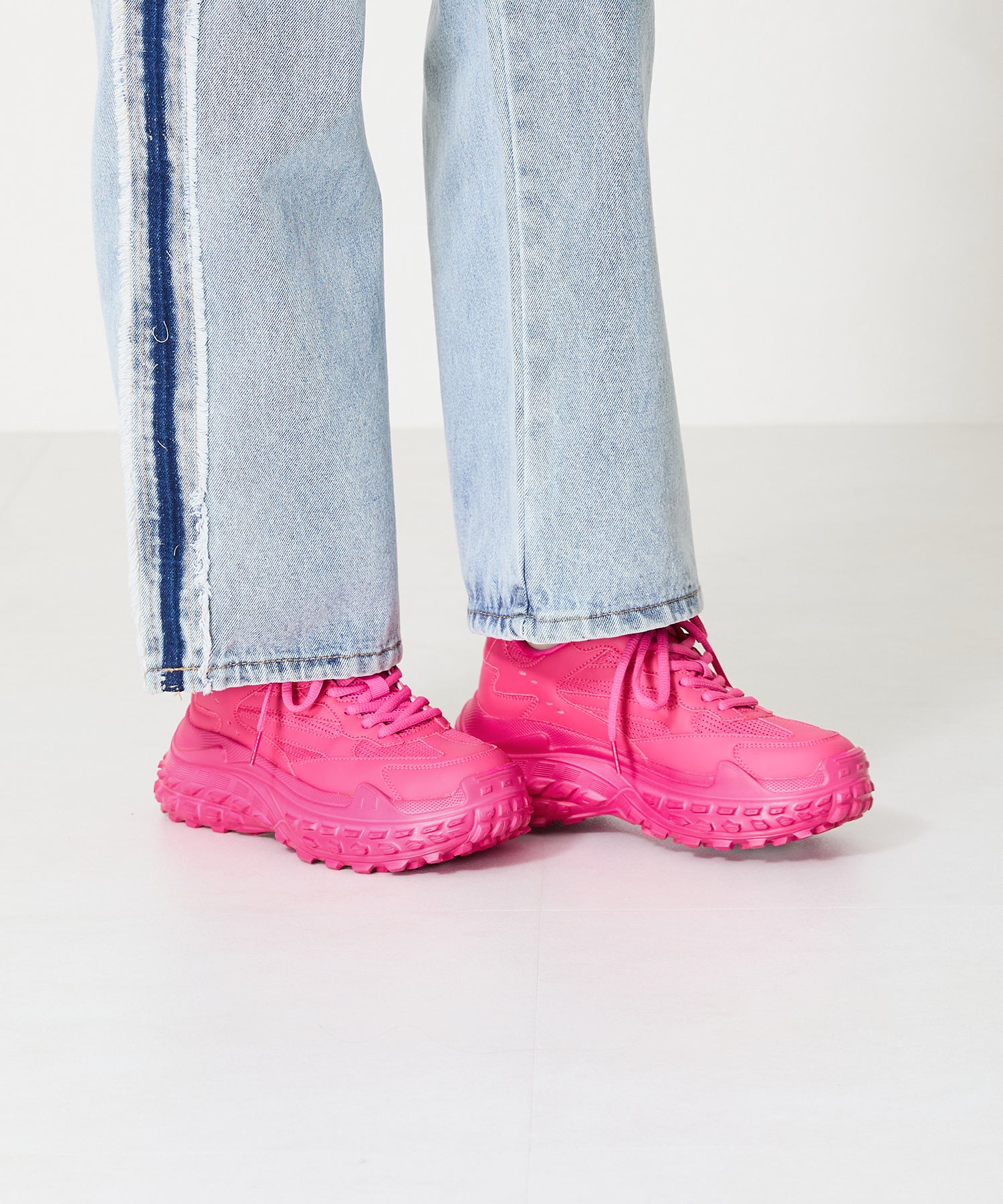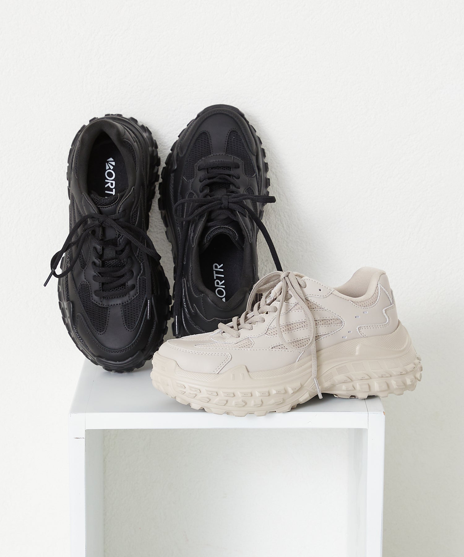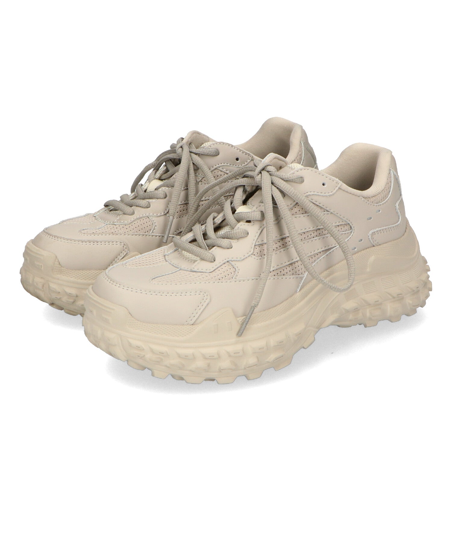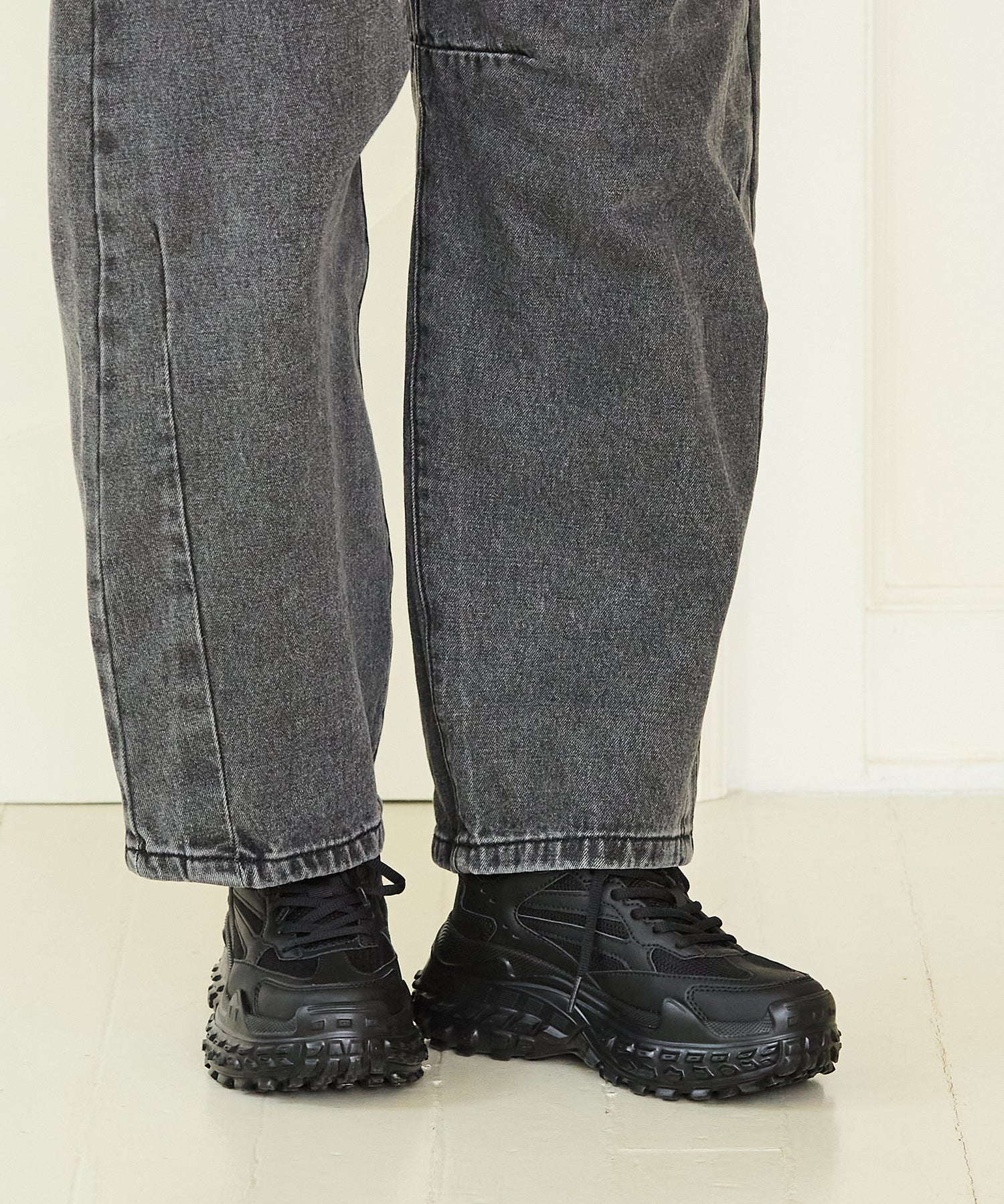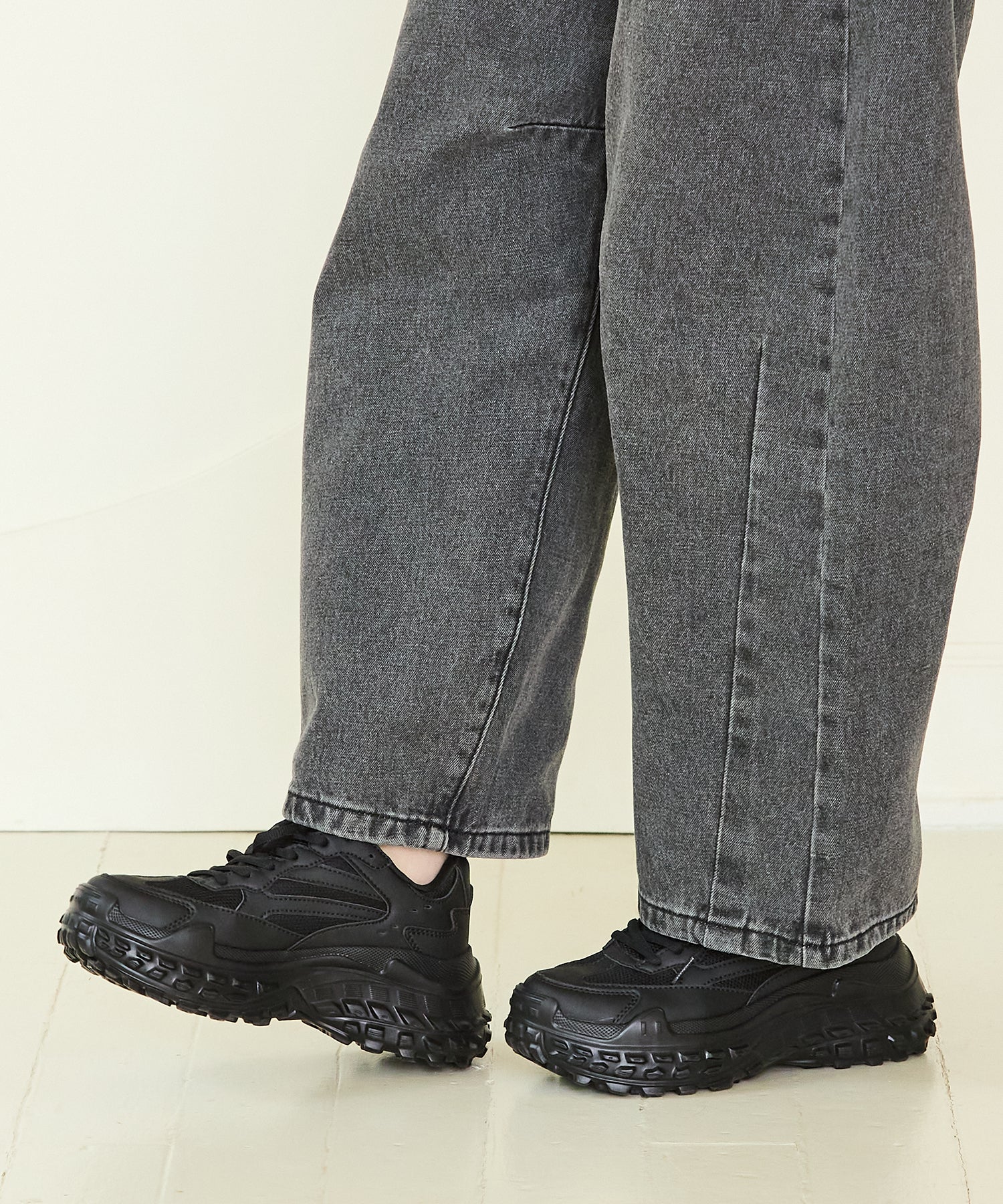 ごつごつとしたソールが新鮮なスニーカーは足元に取り入れるだけで旬なコーディネートに。全体を丸いシルエットにすることでメンズっぽくなりすぎず履けるのが嬉しい。ソールからアッパーまで同色でまとめることで形のユニークさもありながら、コーディネートとの馴染みの良さも両立。メッシュ素材を取り入れ通気性が良く軽量でラクチンな履き心地。